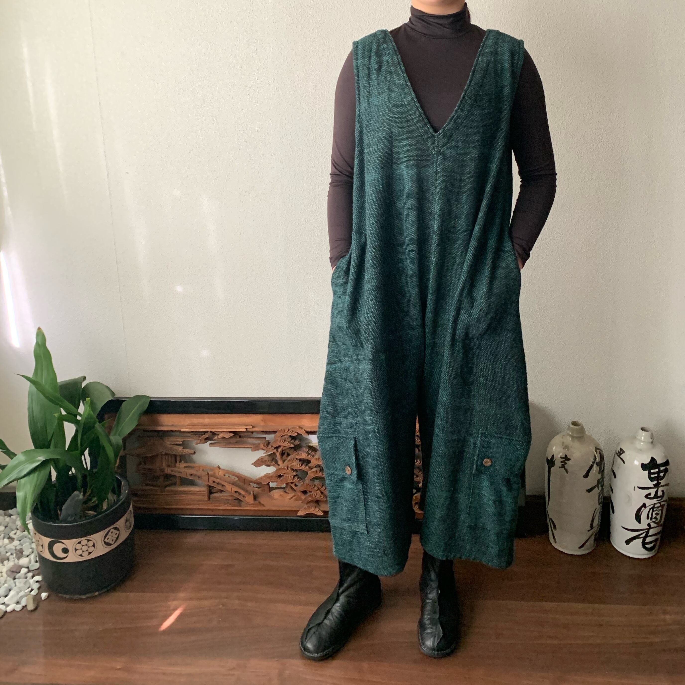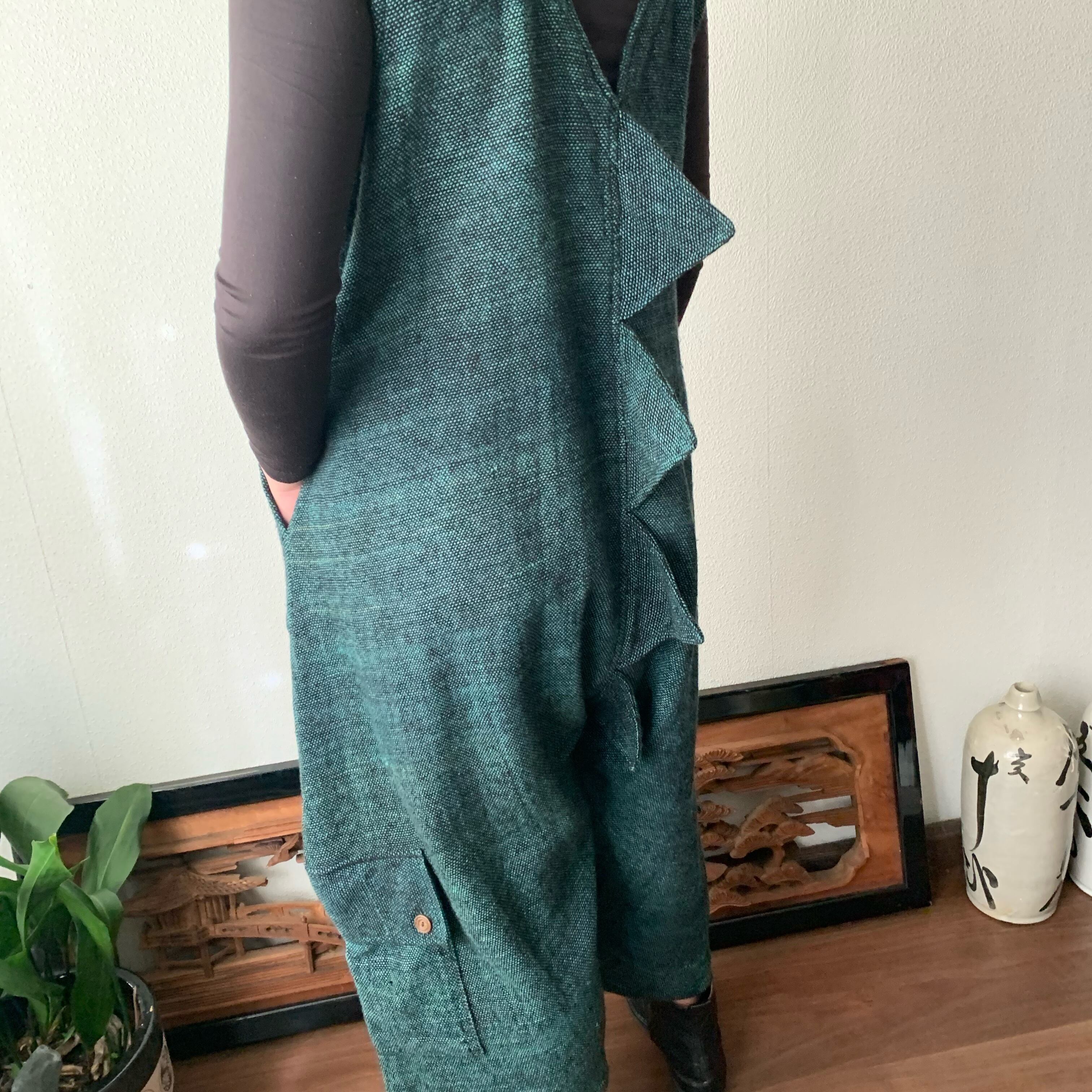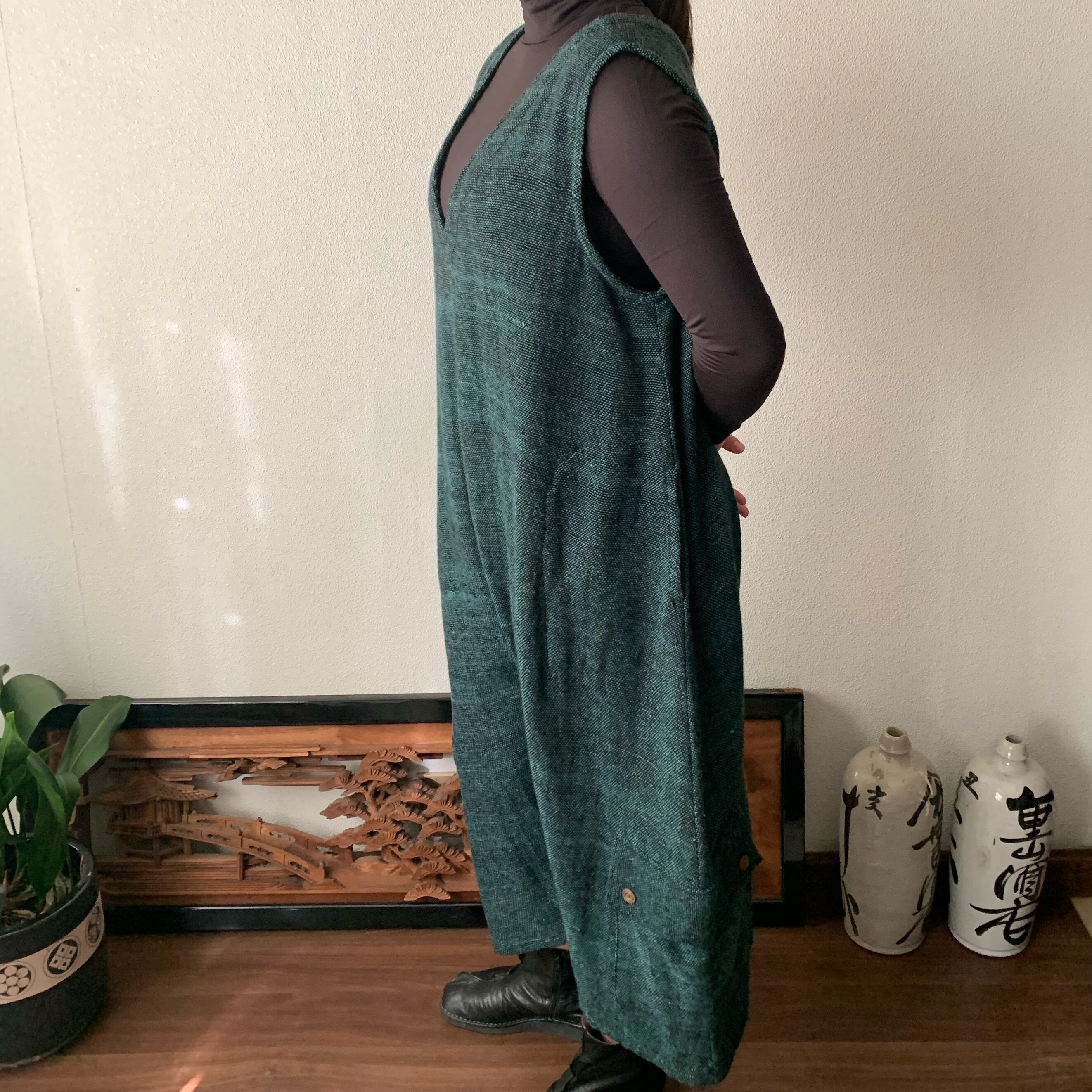 えっ。?ゆったり手織り綿サロペットだけどバックに恐竜の背びれ? 遊び心たっぷりで思わず後ろを向きたくなる 深緑絣