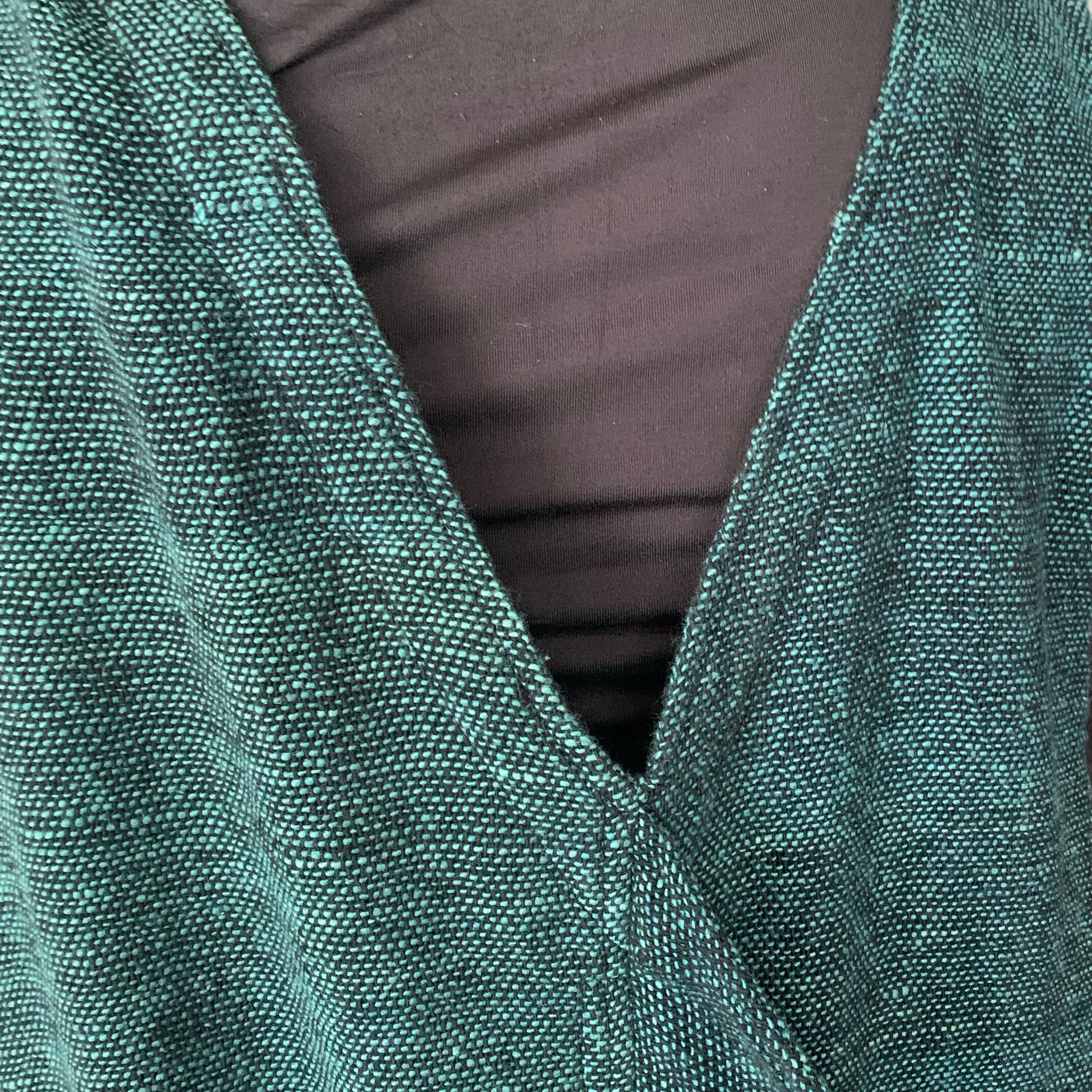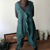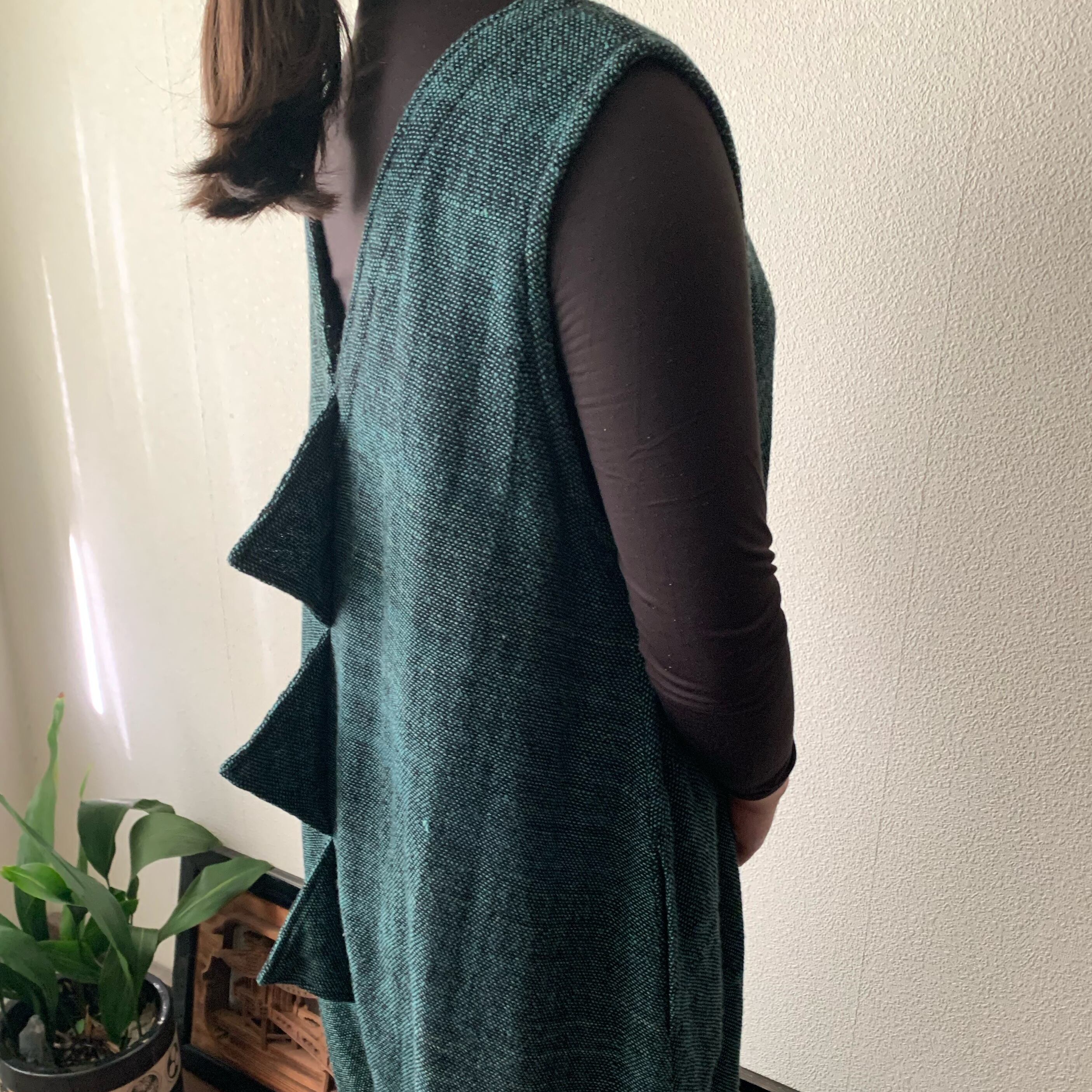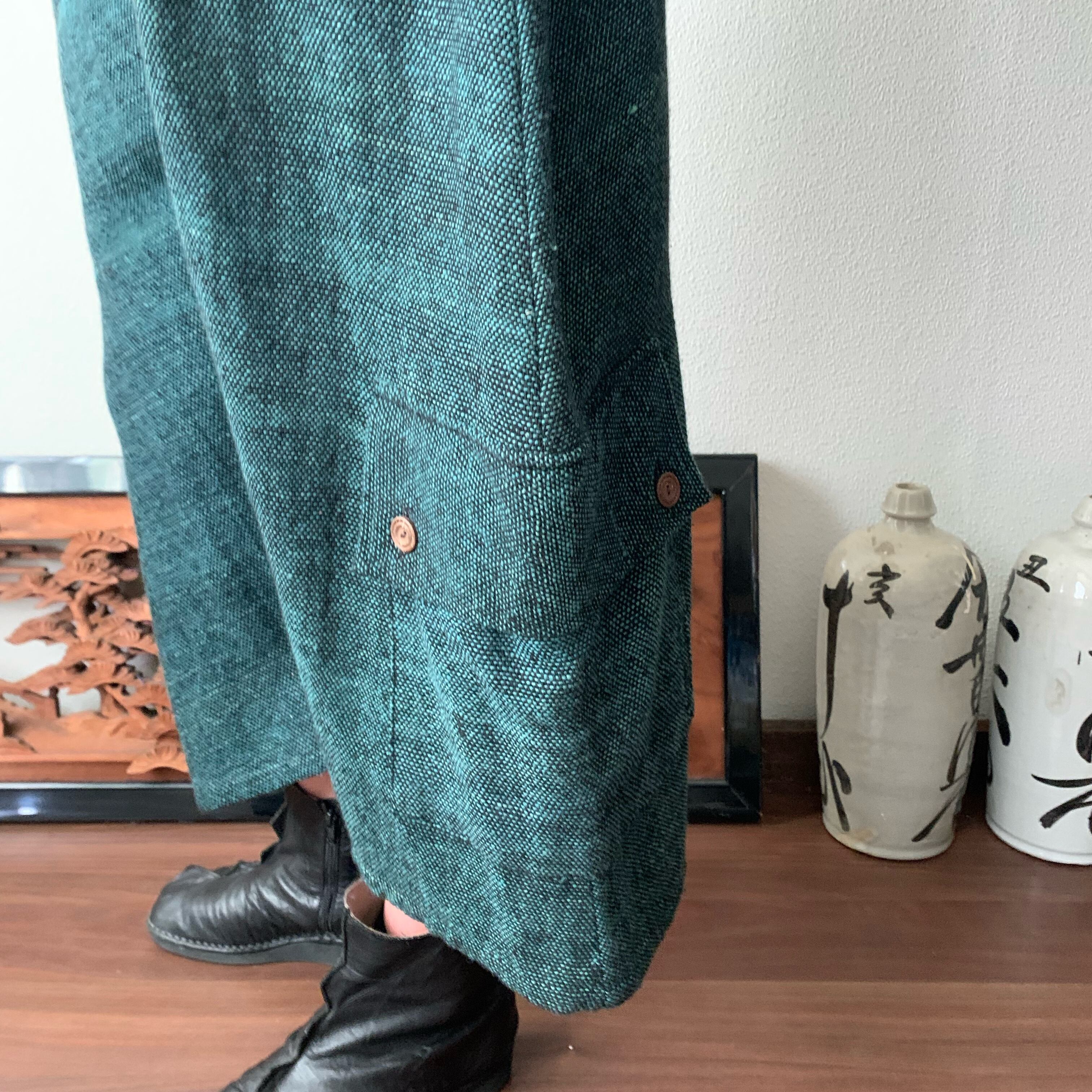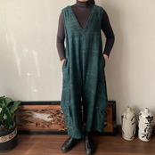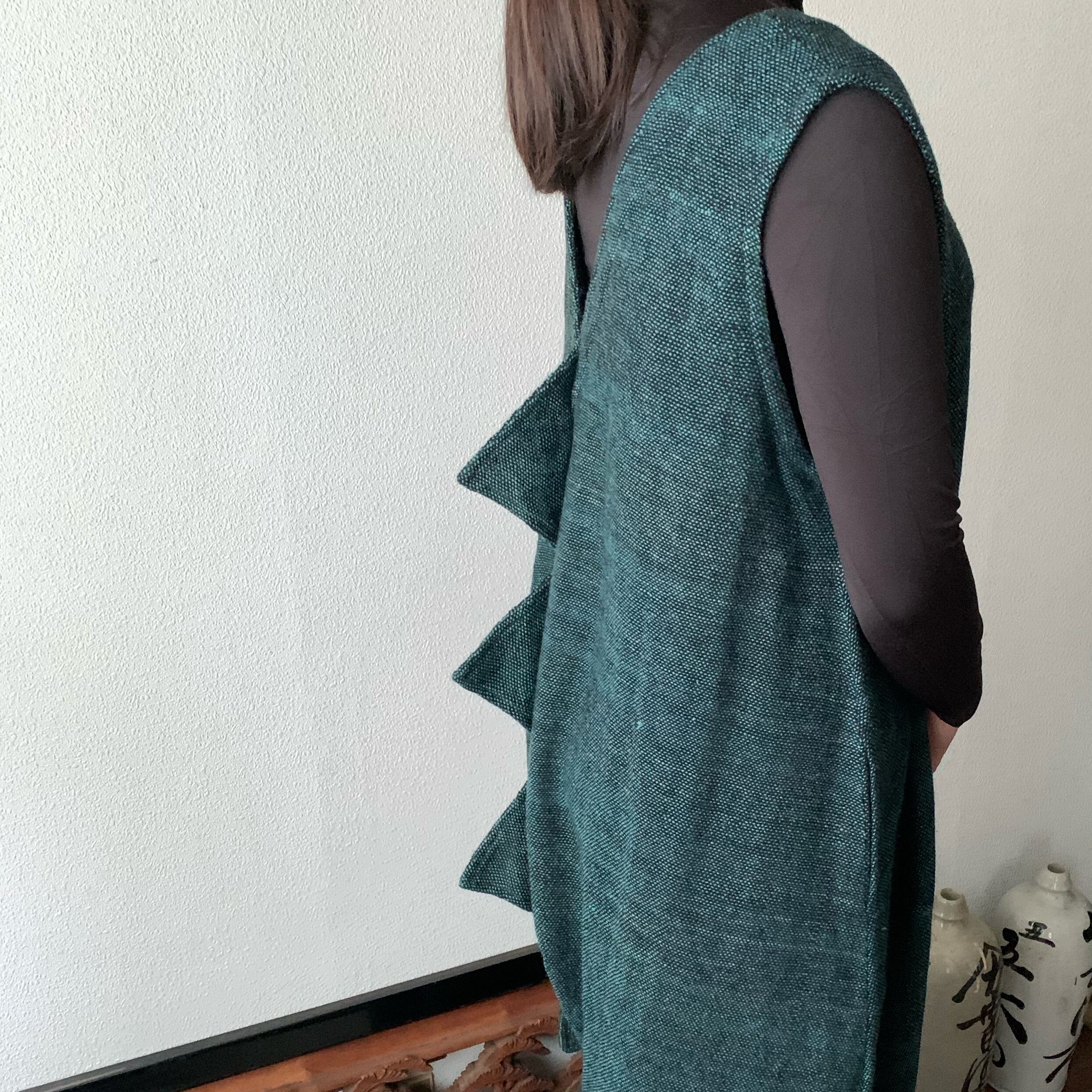 えっ。?ゆったり手織り綿サロペットだけどバックに恐竜の背びれ? 遊び心たっぷりで思わず後ろを向きたくなる 深緑絣