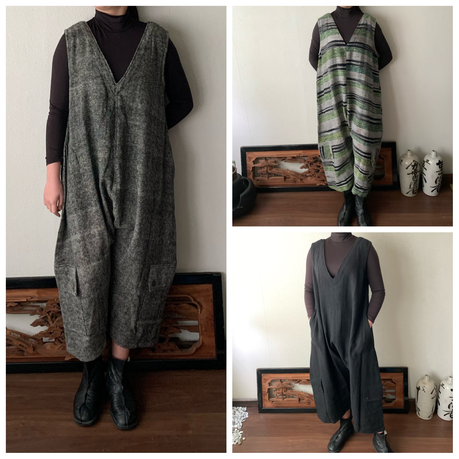 ゆったりと長めの丈ですっきり着こなせる手織り綿のサロペットです。