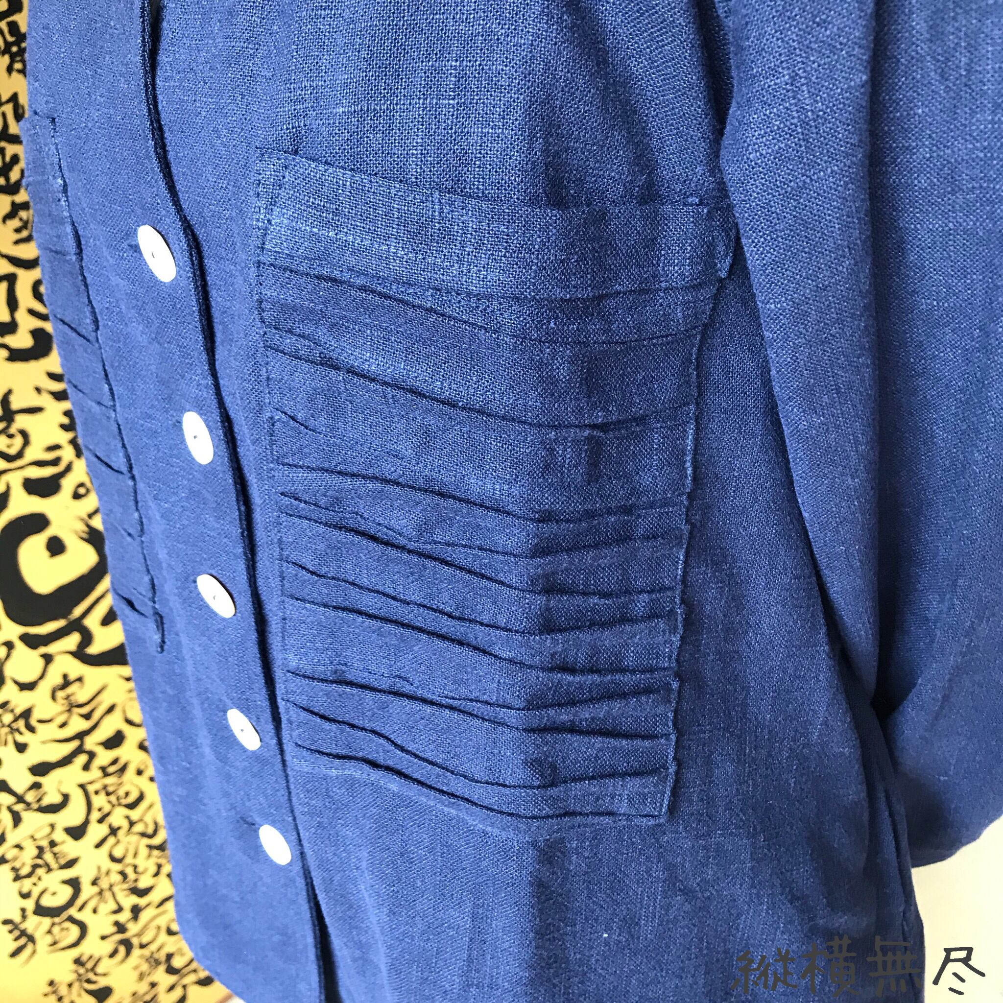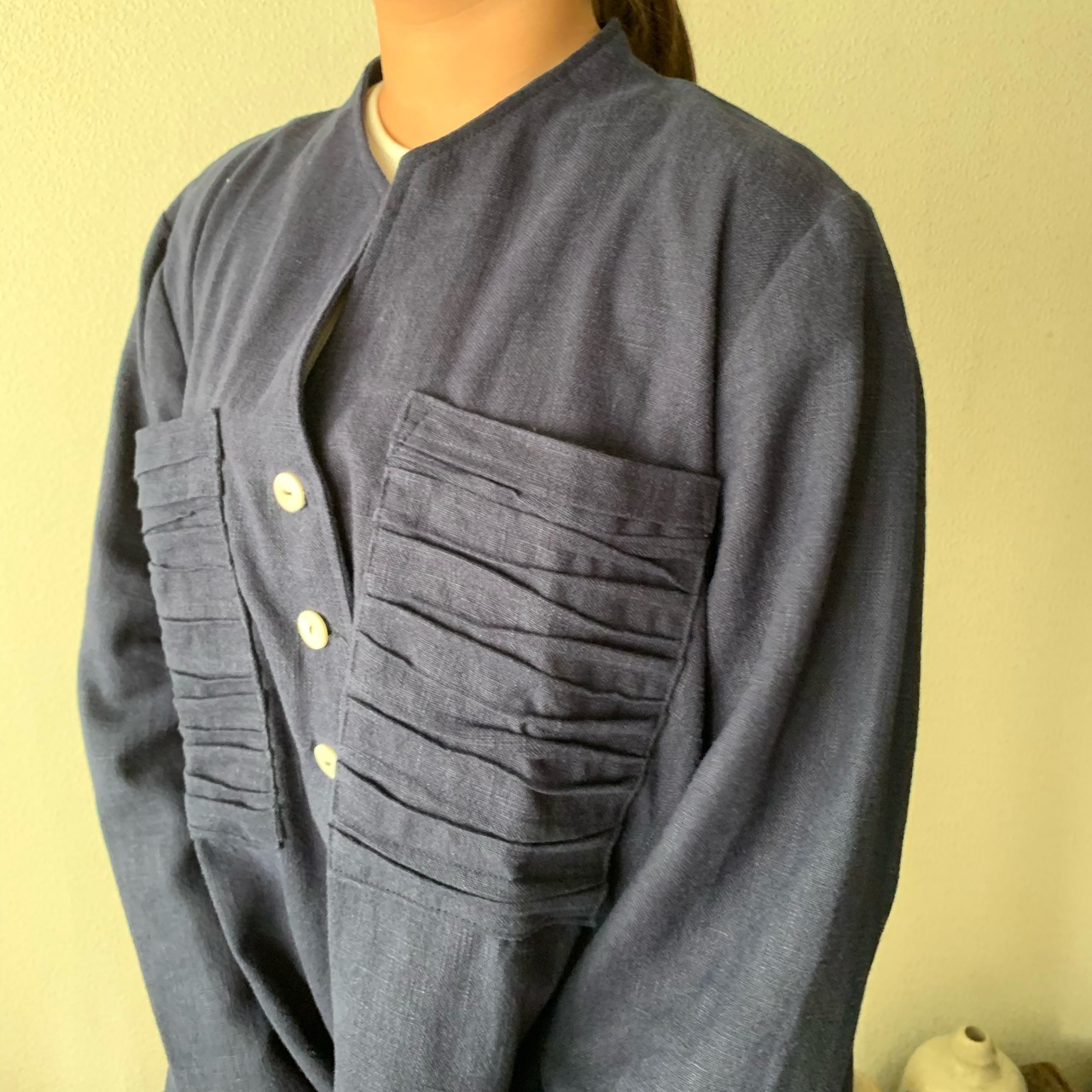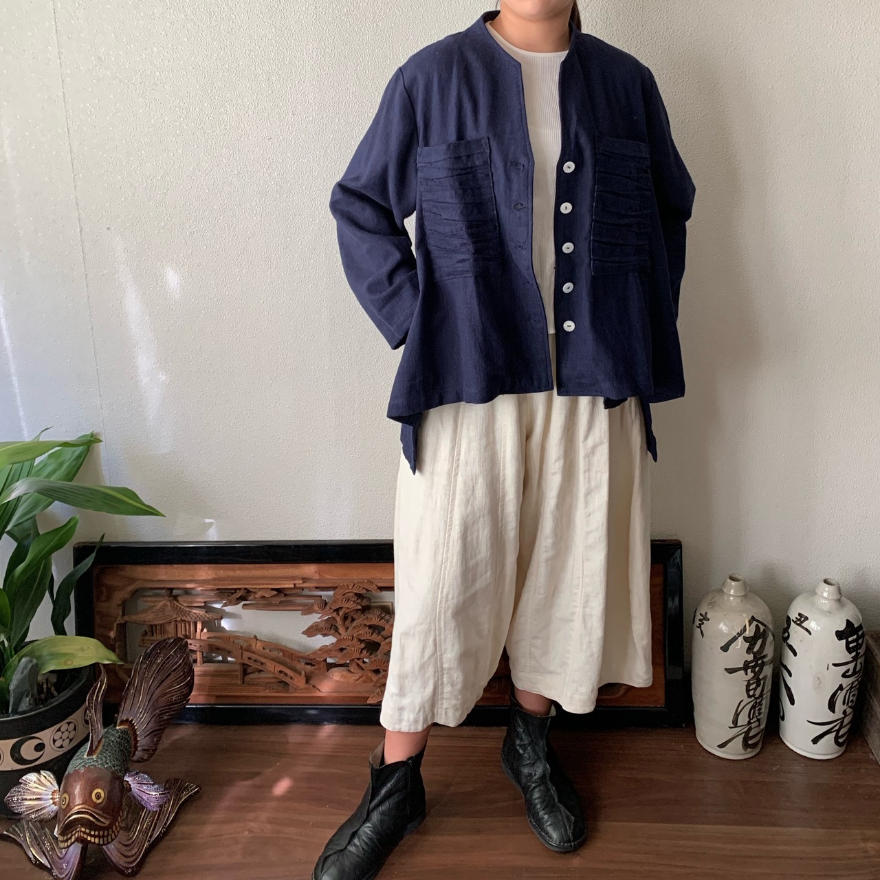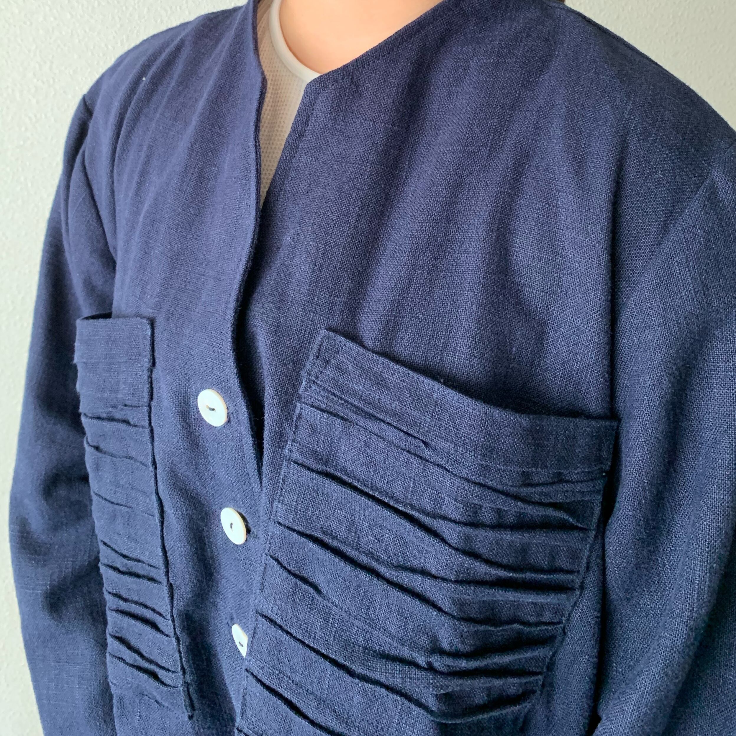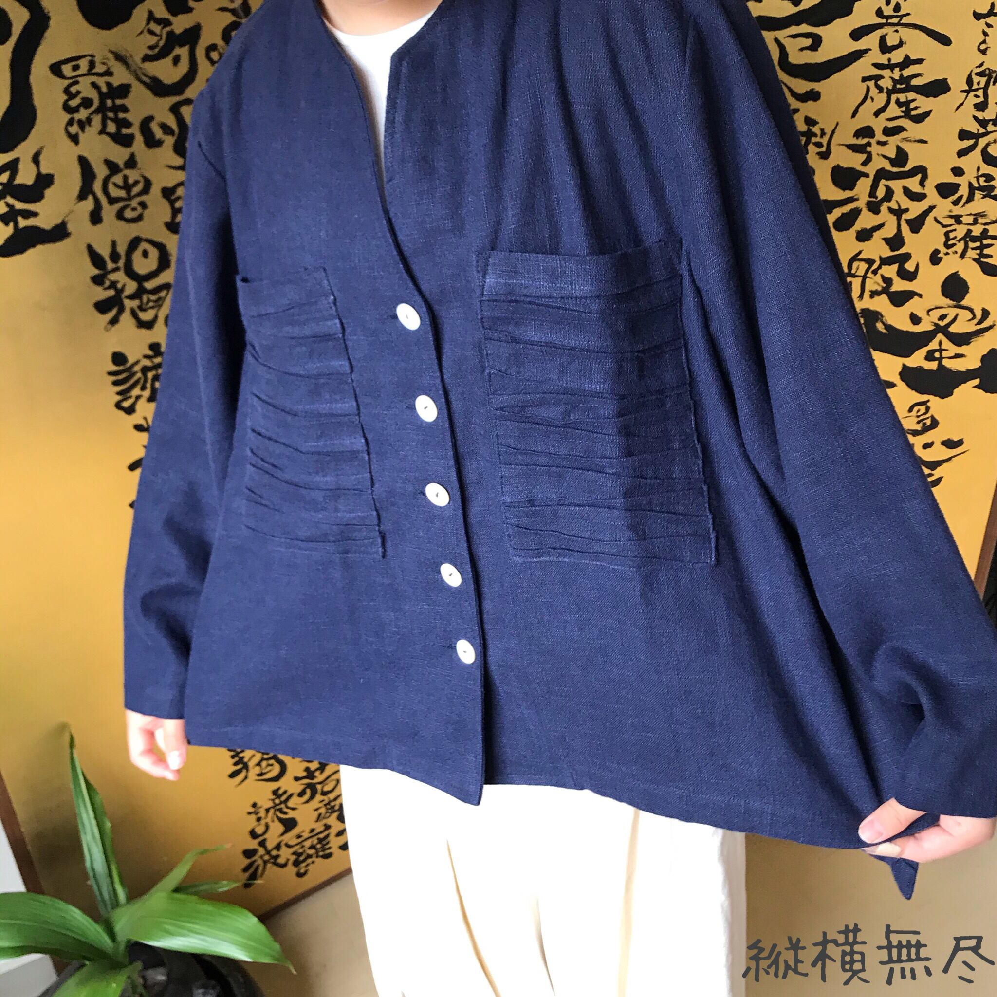 ピンタックのBIGポケットでバストラインすっきりが嬉しい貝ボタンの前開きヘンプジャケット 紺色