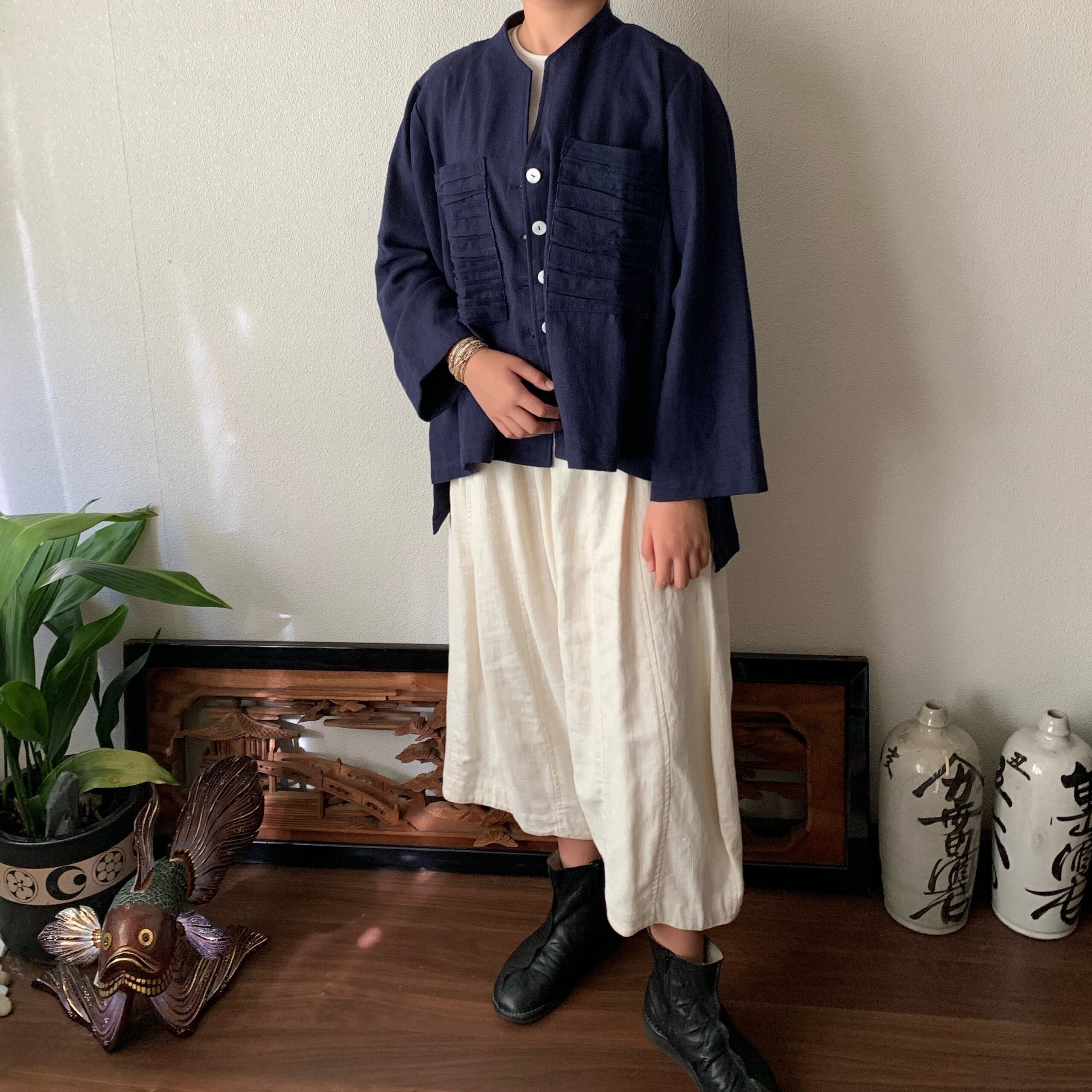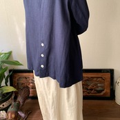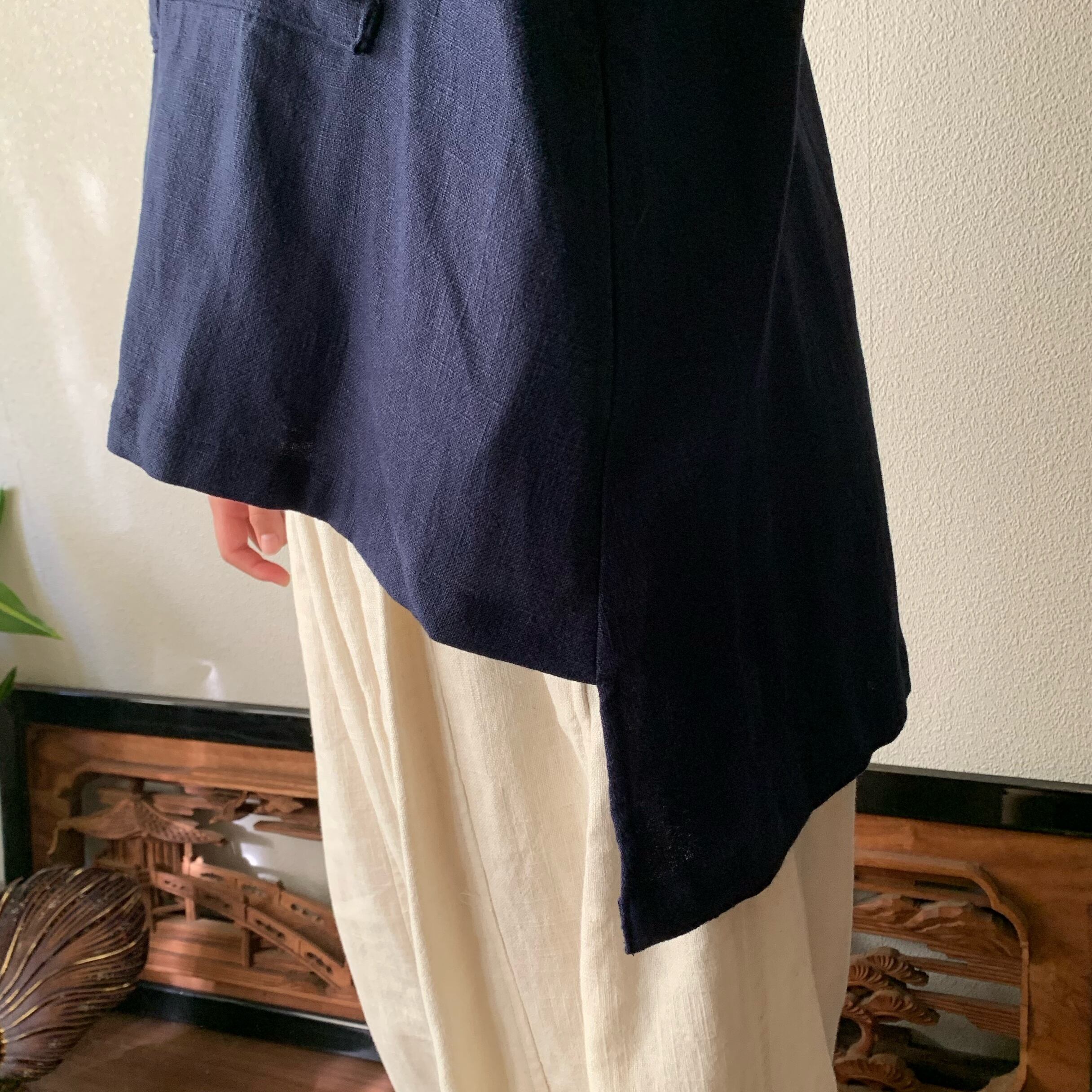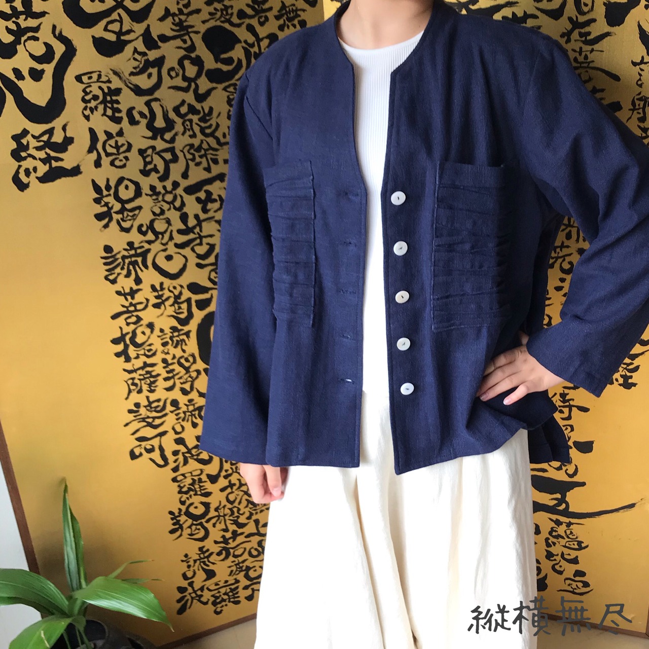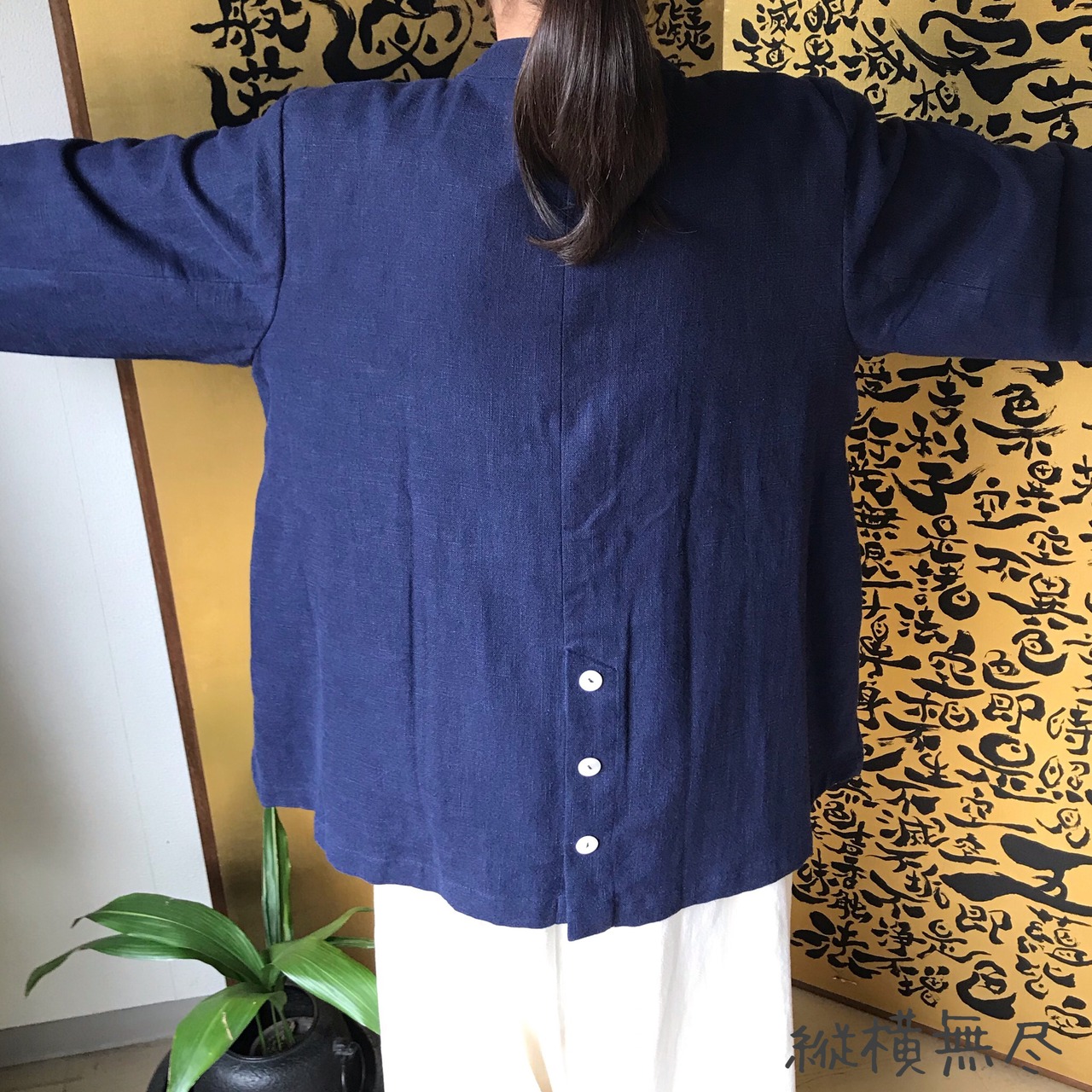 ピンタックのBIGポケットでバストラインすっきりが嬉しい貝ボタンの前開きヘンプジャケット 紺色