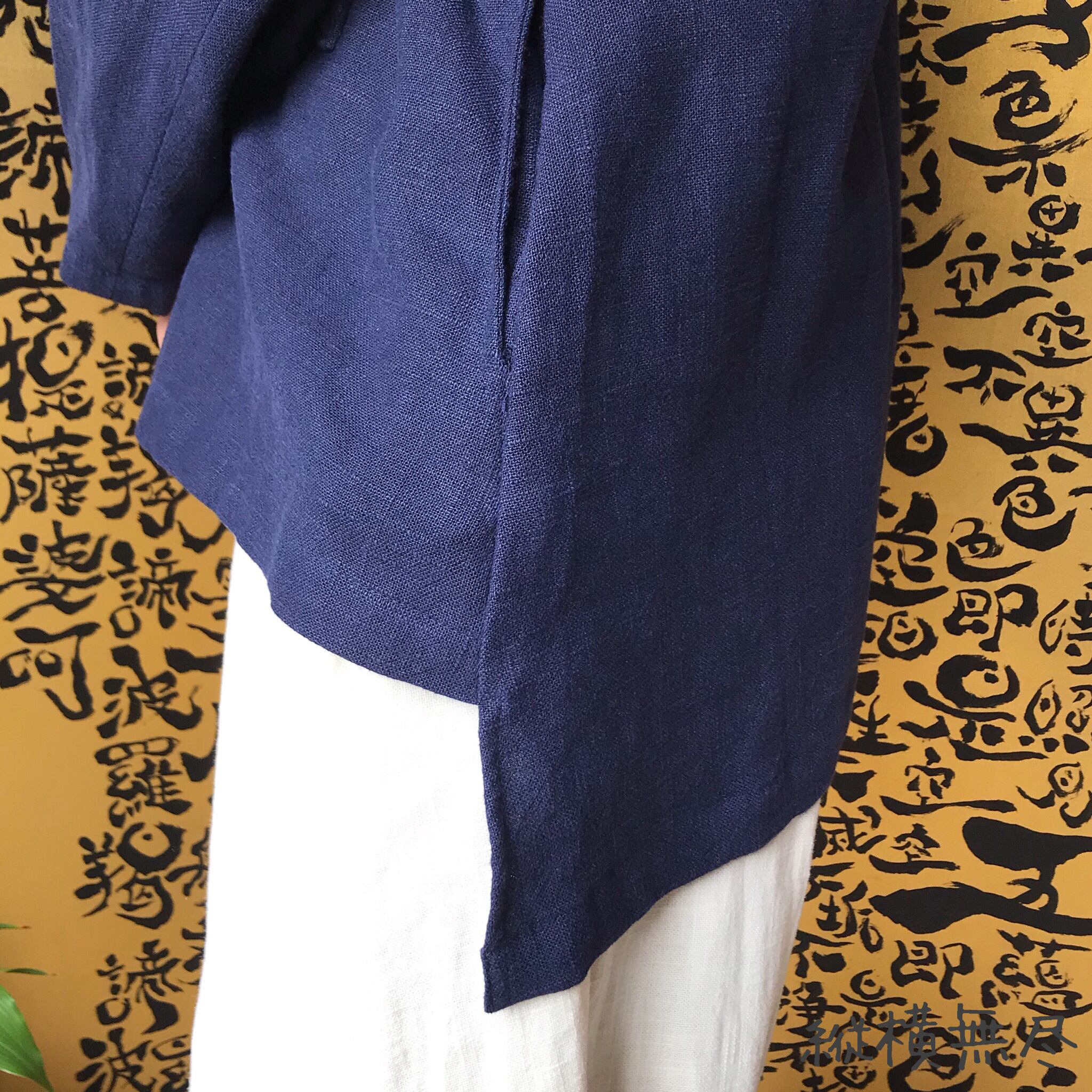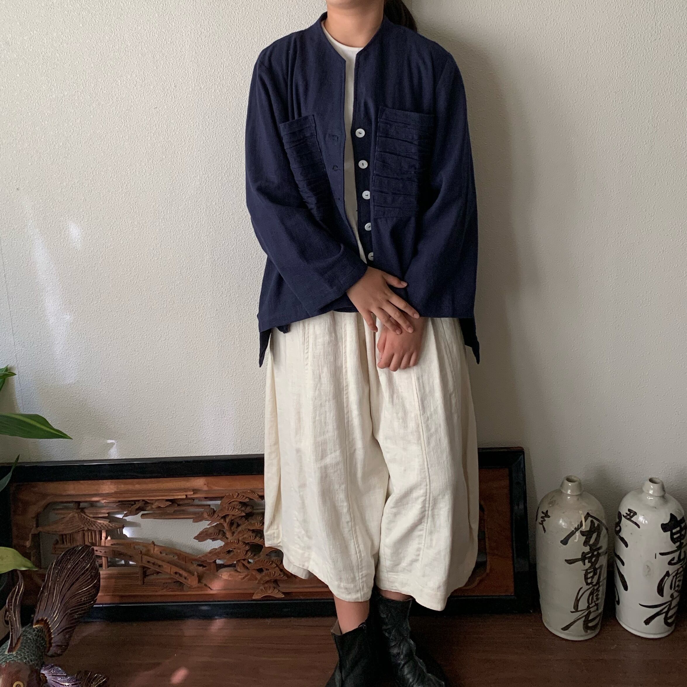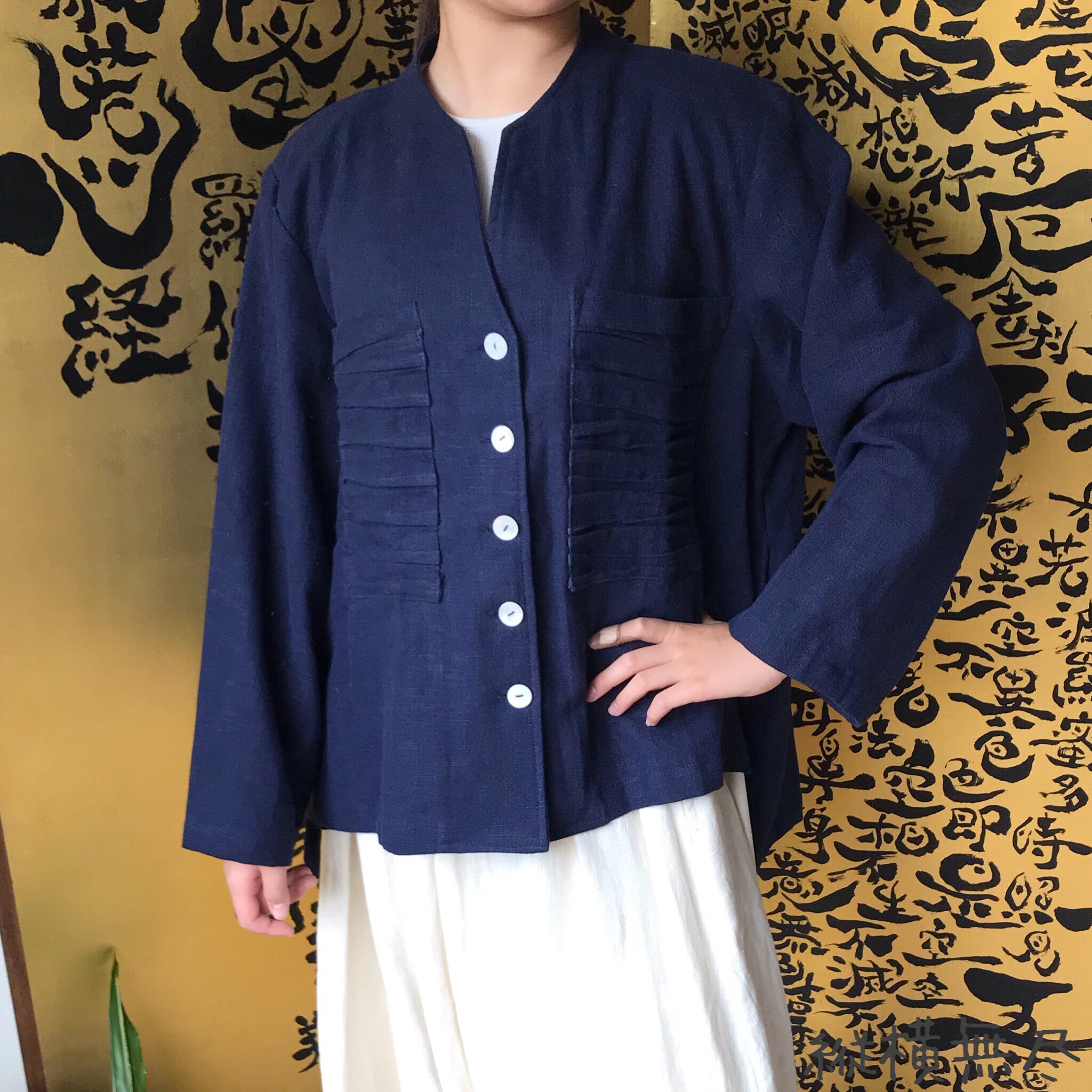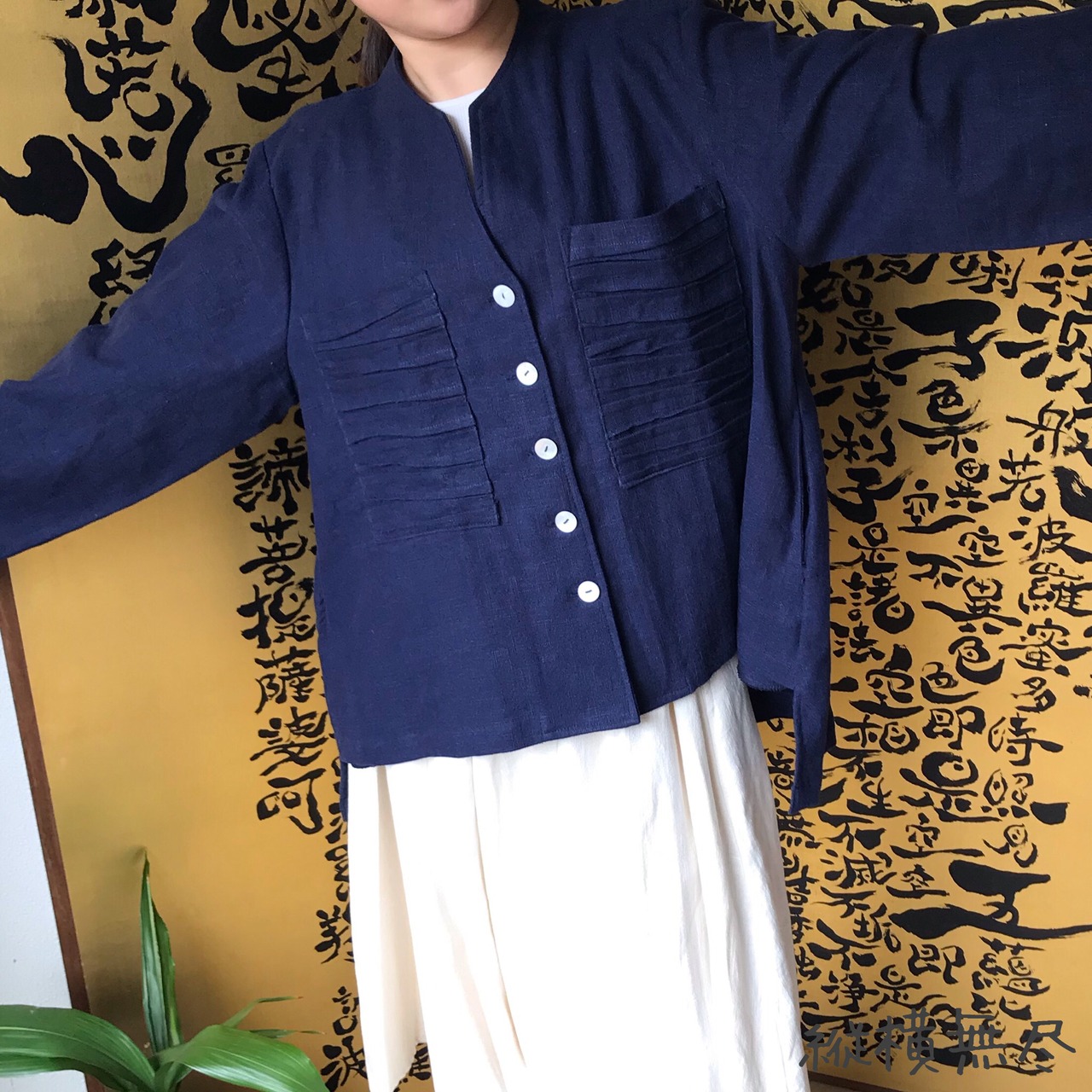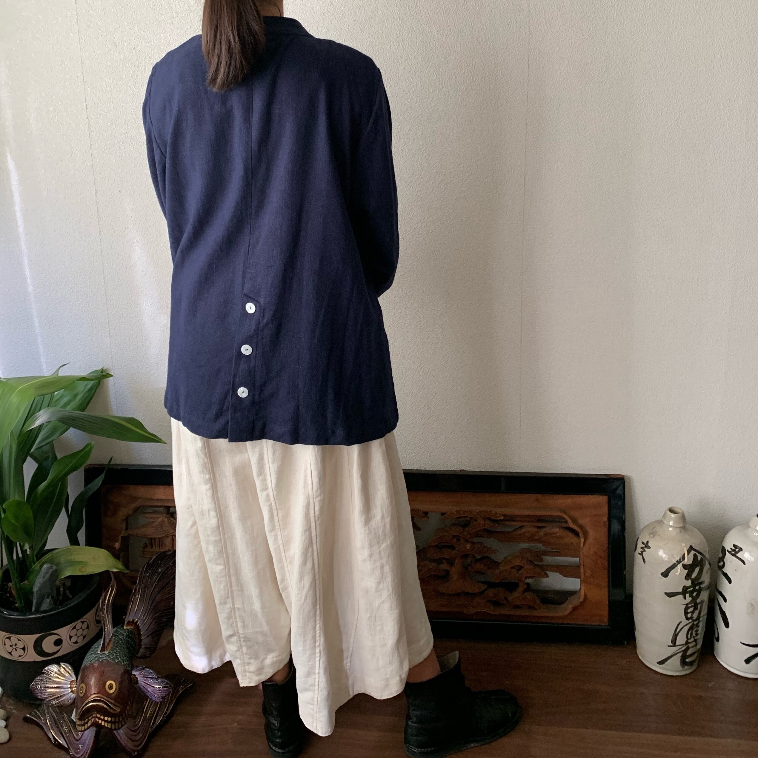 ピンタックのBIGポケットでバストラインすっきりが嬉しい貝ボタンの前開きヘンプジャケット 紺色