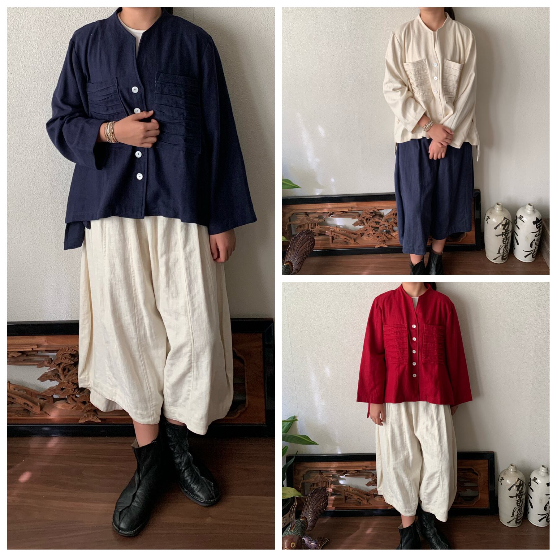 『ピンタックのBIGポケットでバストラインすっきりが嬉しい貝ボタンの前開きヘンプジャケット』