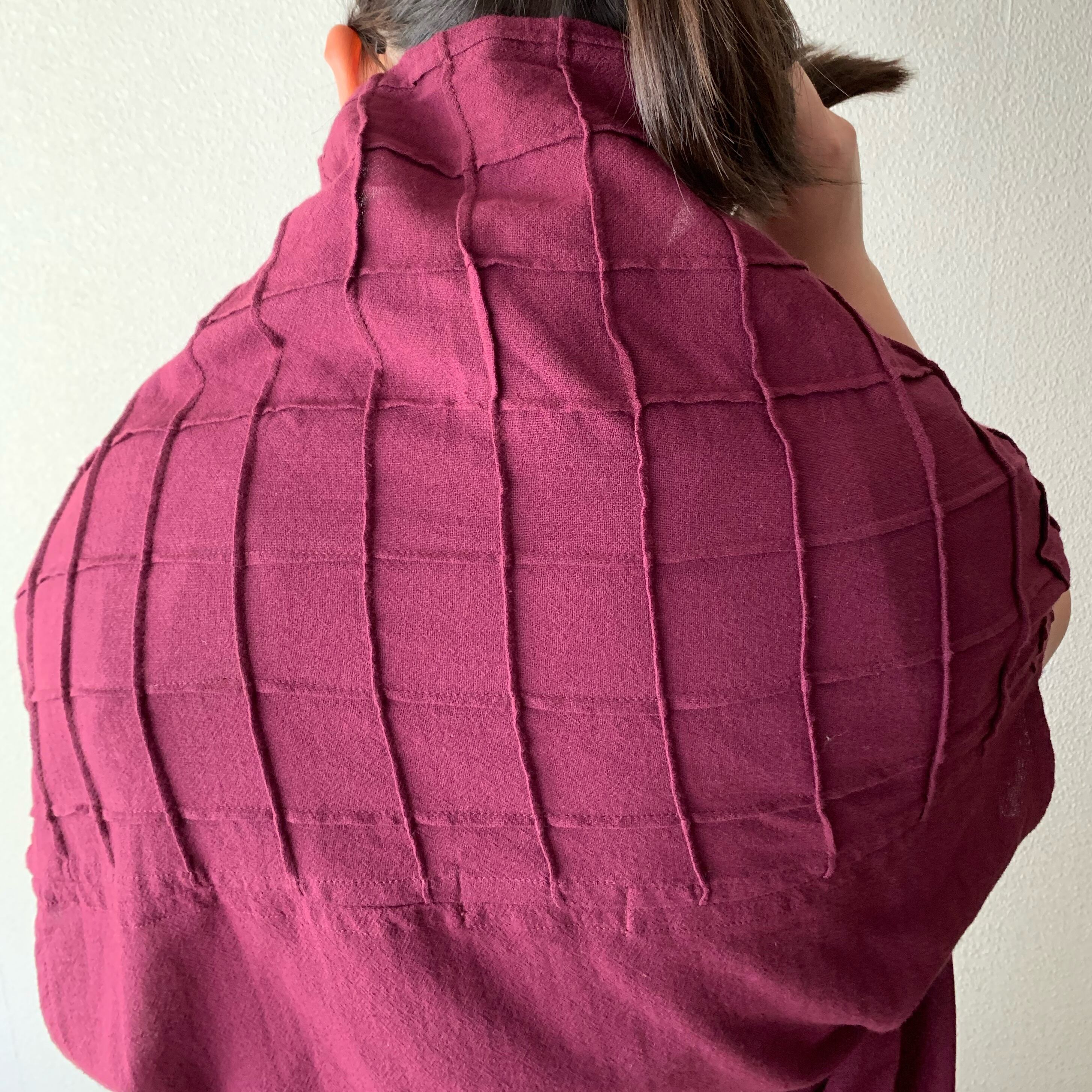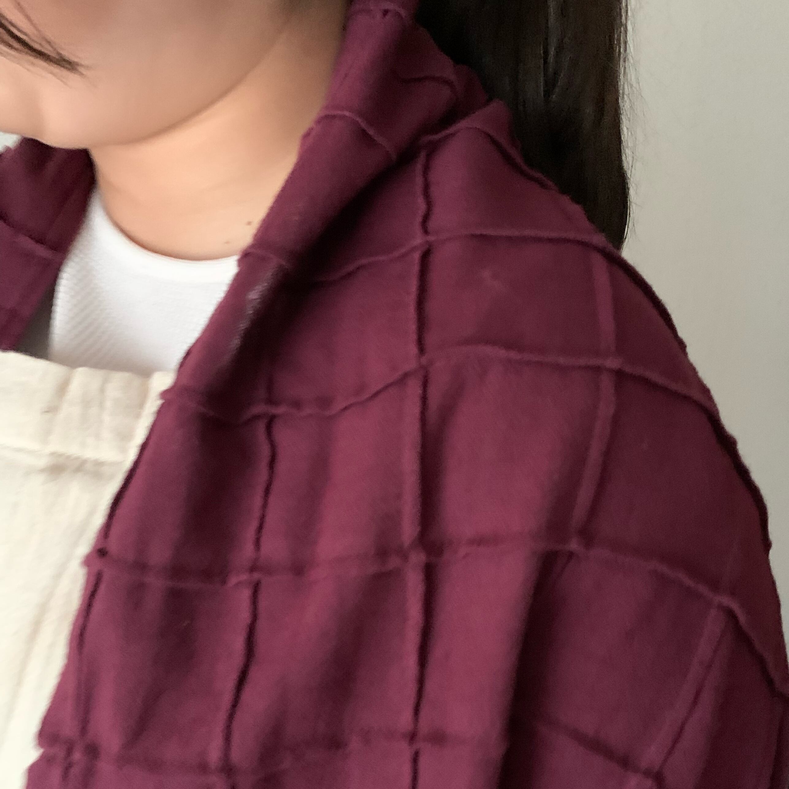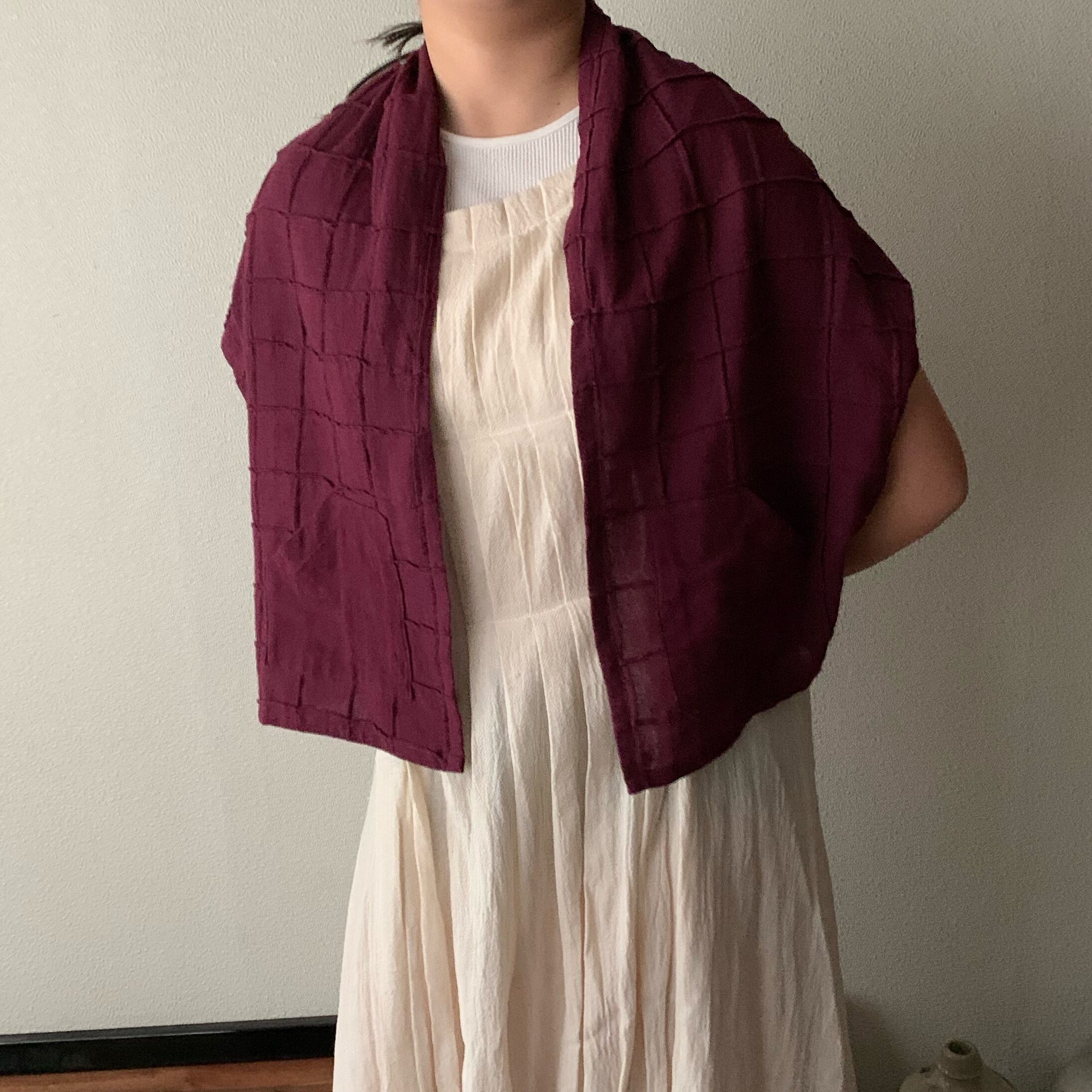 上下どちらでも着ることのできる2wayボレロで、首元をすっきり着るには格子のない方を上に着て、シンプルな洋服に羽織るなら格子のある方を上に着るとアクセントになります。