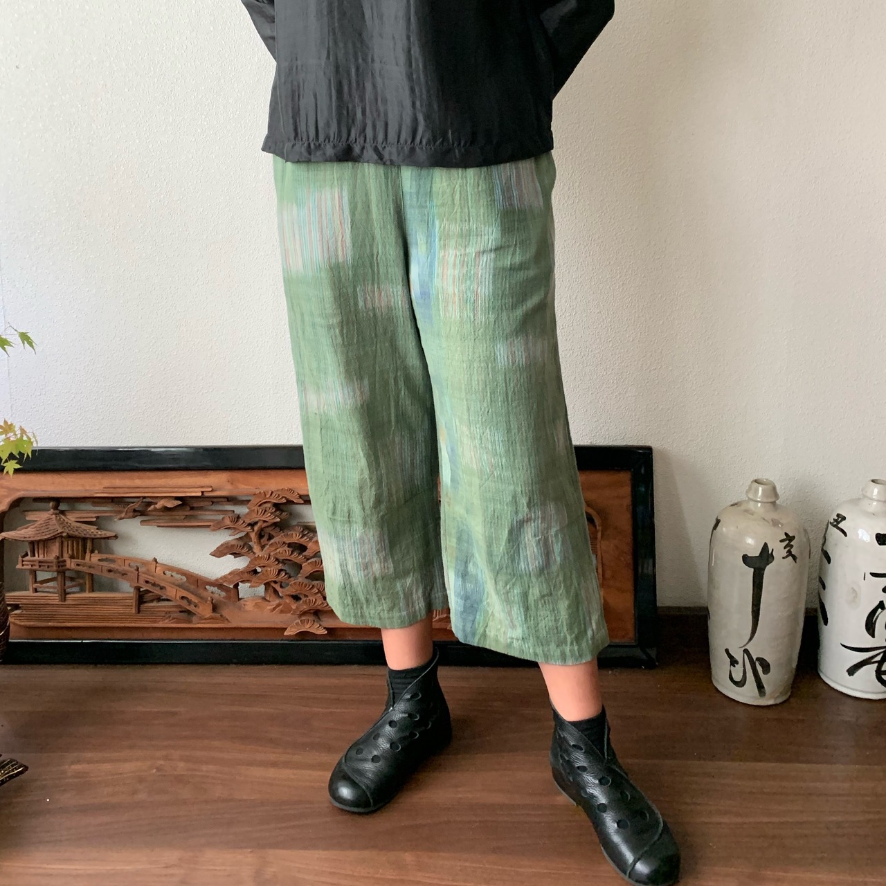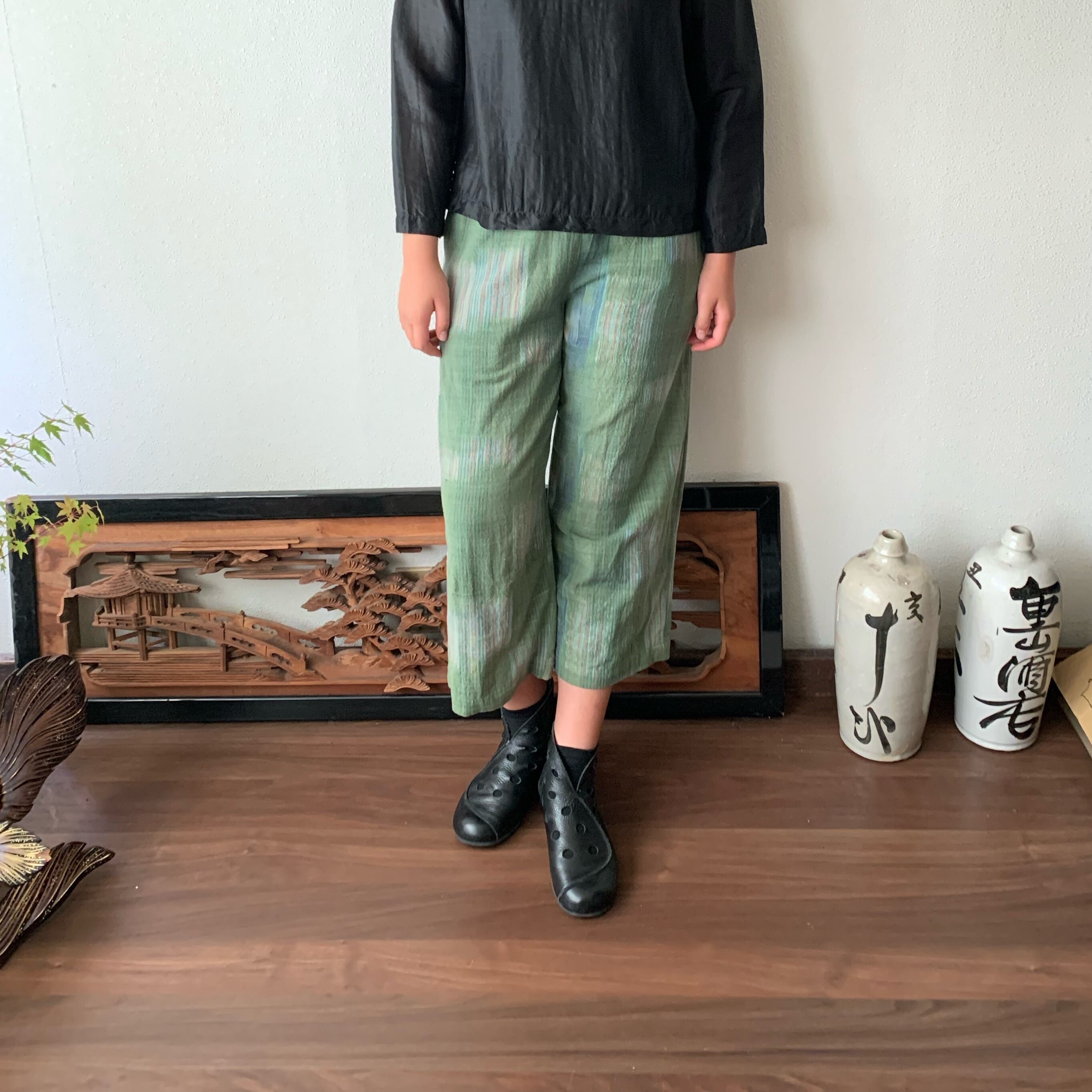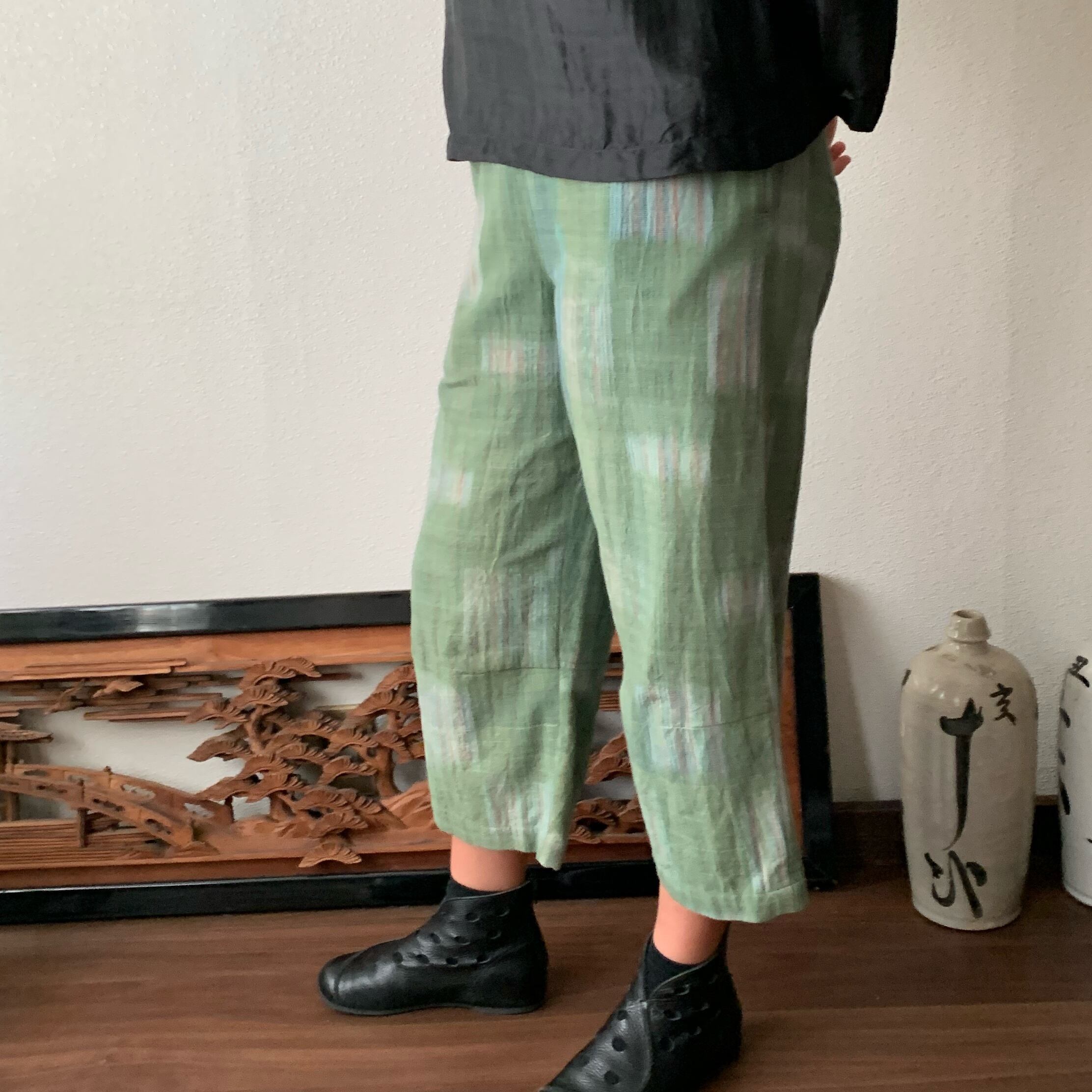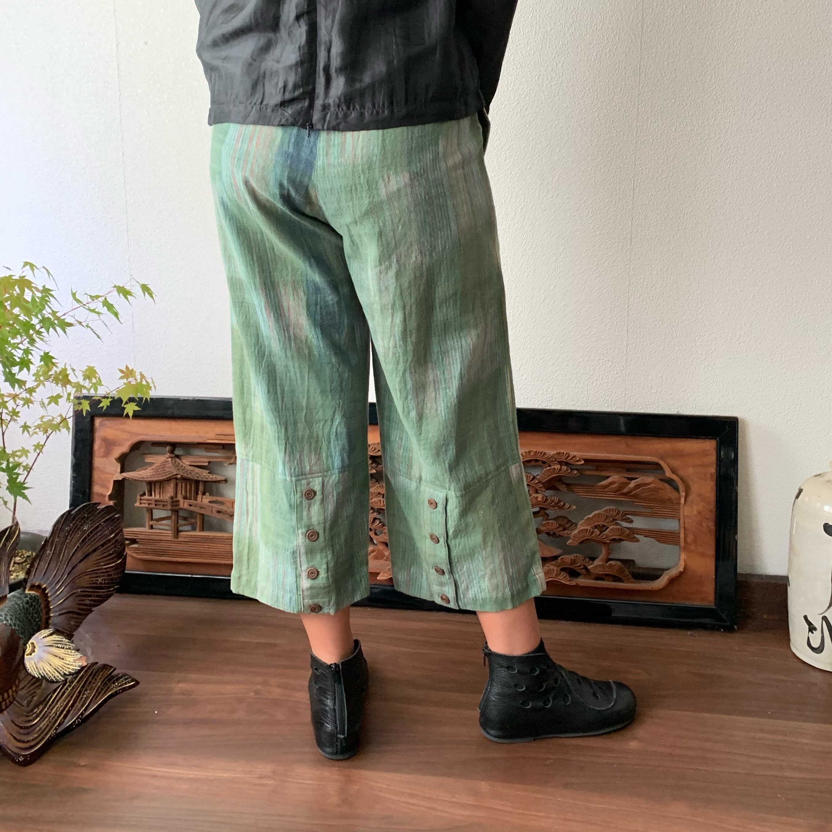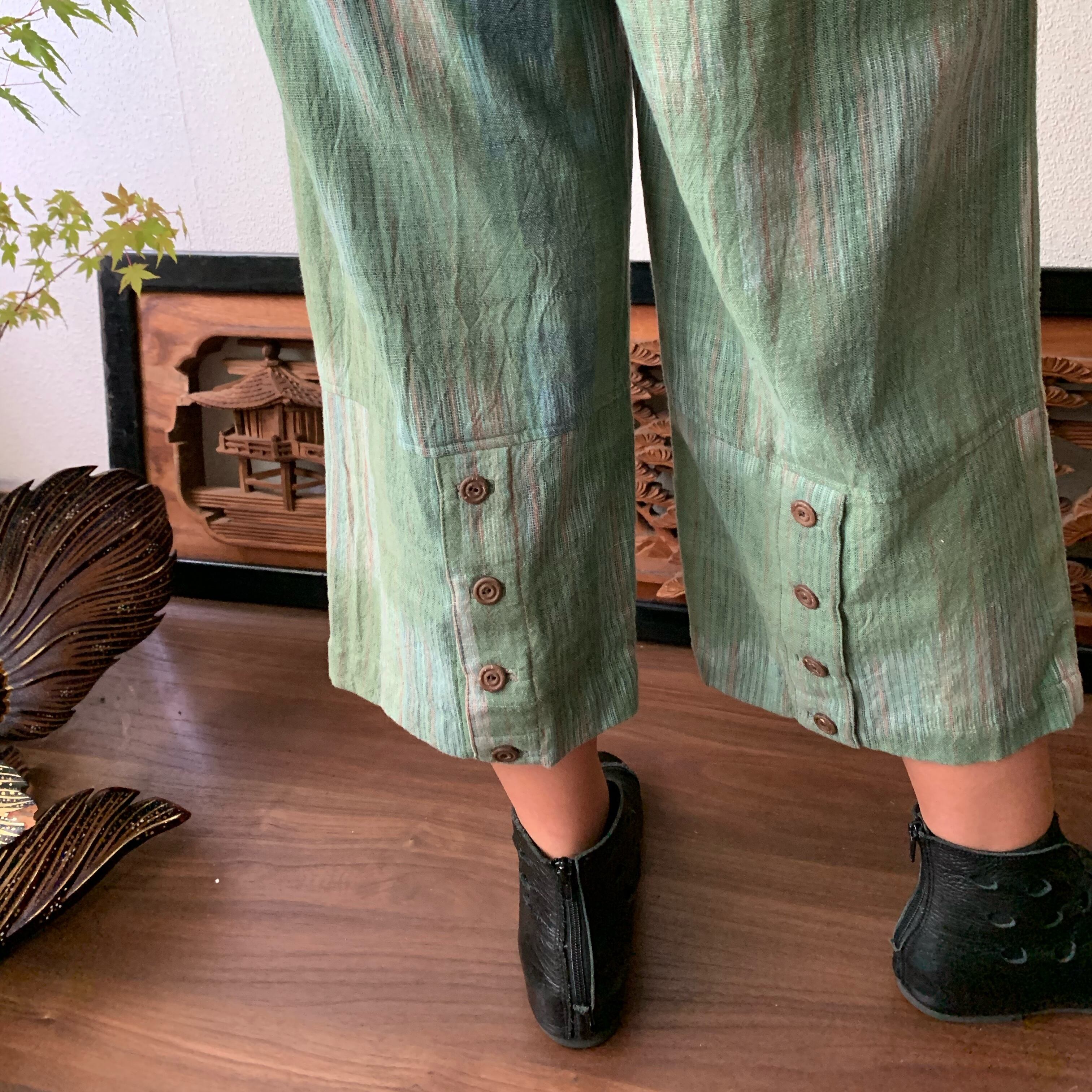 手織り綿ガウチョパンツ シンプルにはけるけど裾切り返しと後ろボタンが楽しい 緑絣