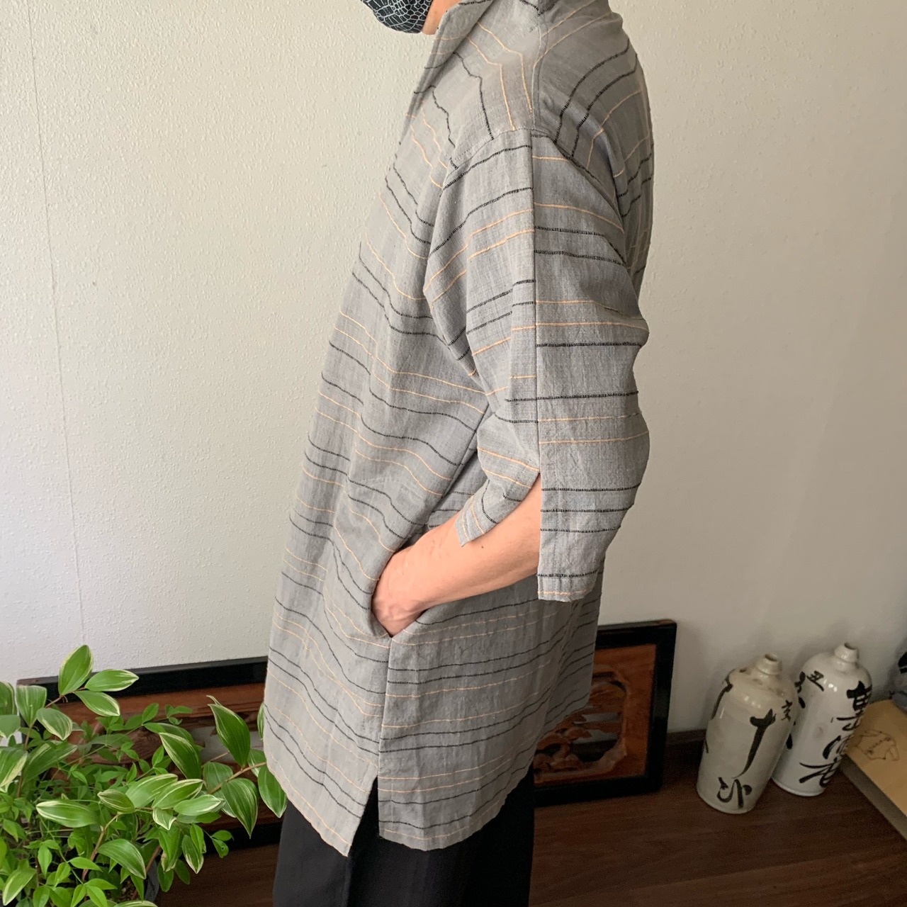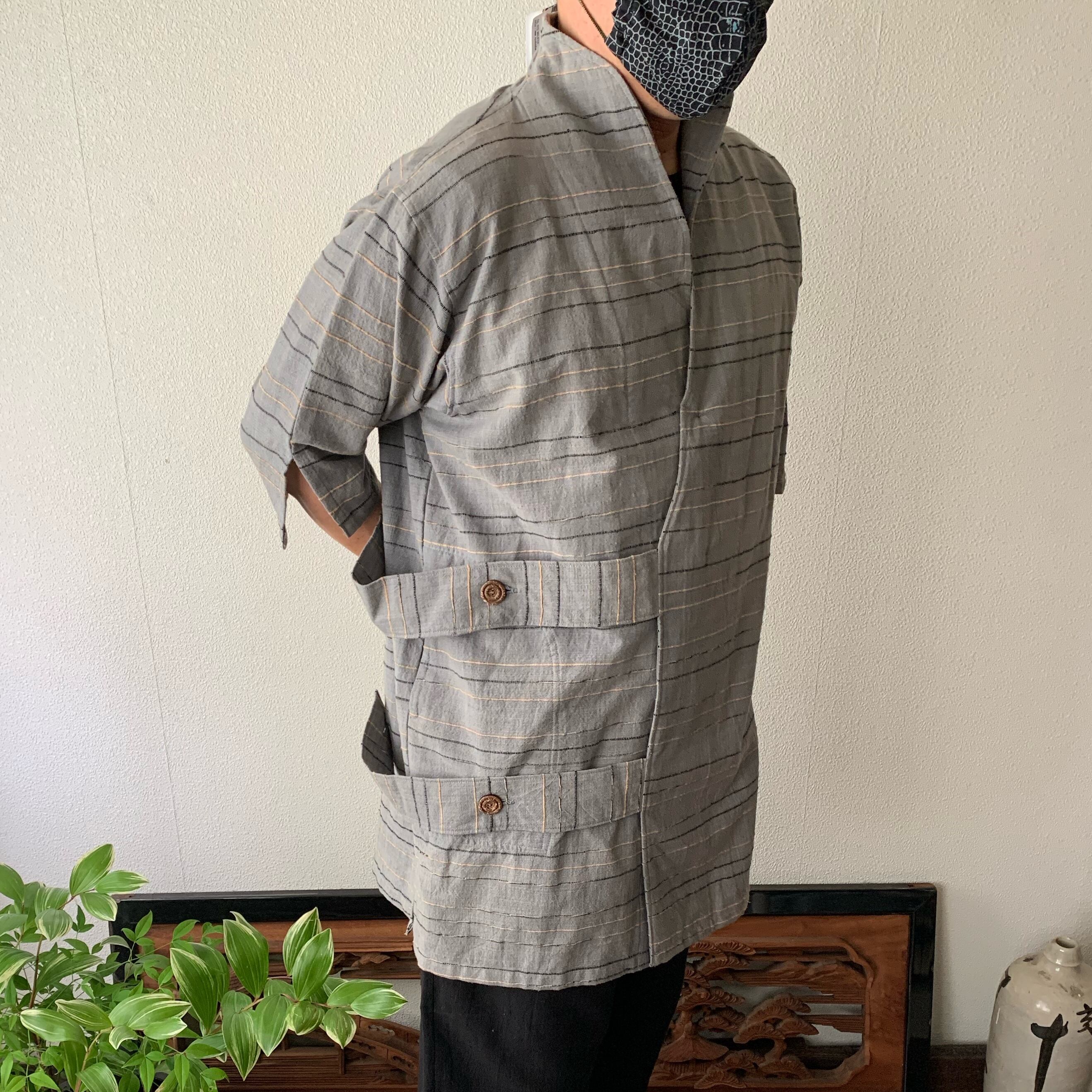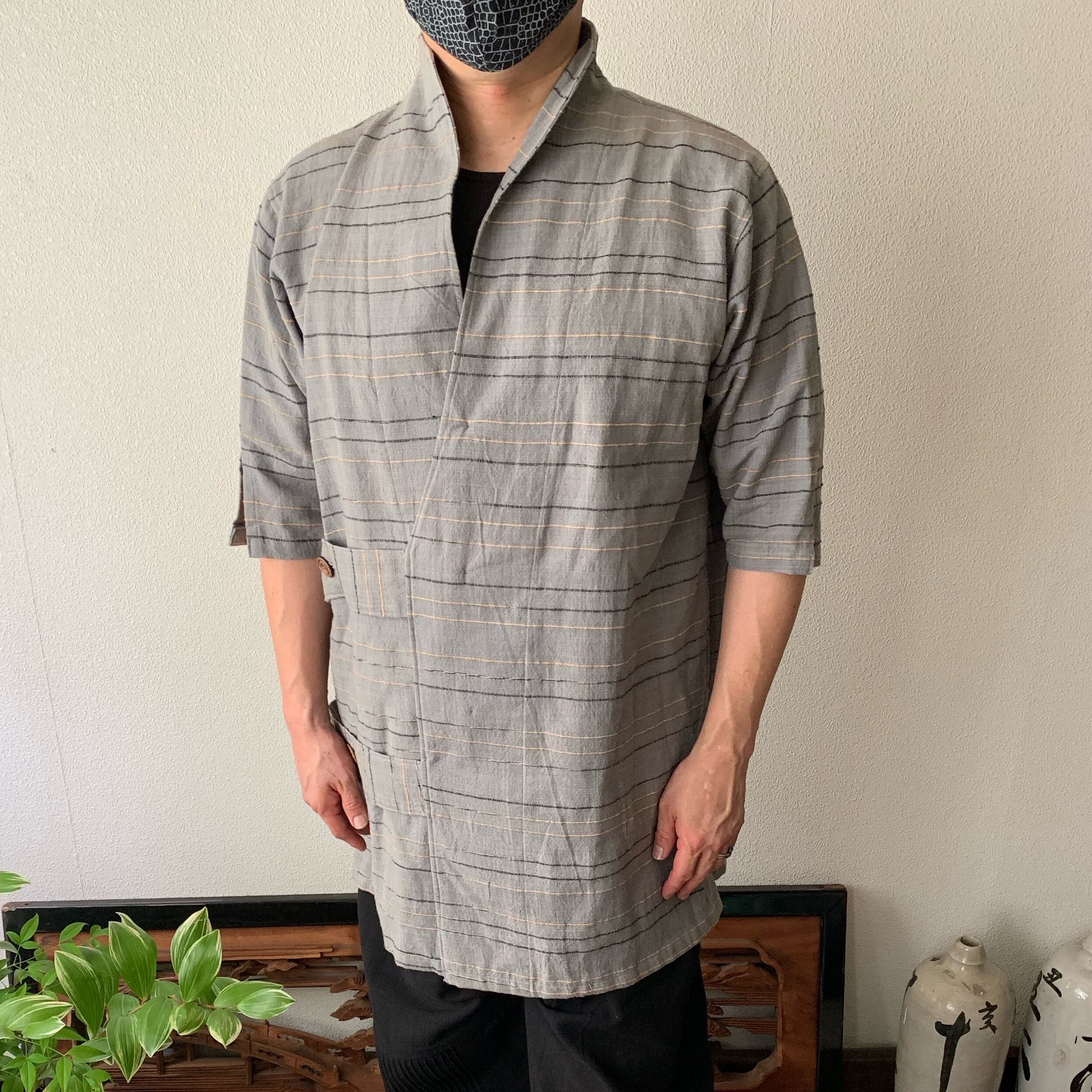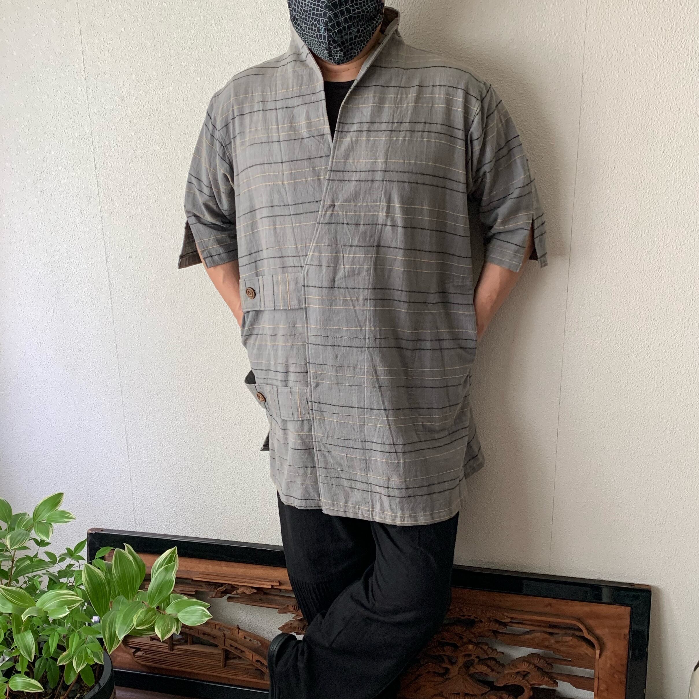 着物風手織り綿メンズブラウス半袖 ダブルベルトと着物風合わせで粋に着こなす グレイ絣