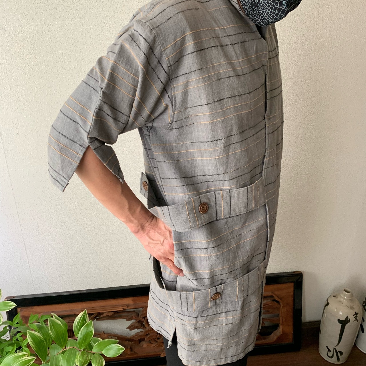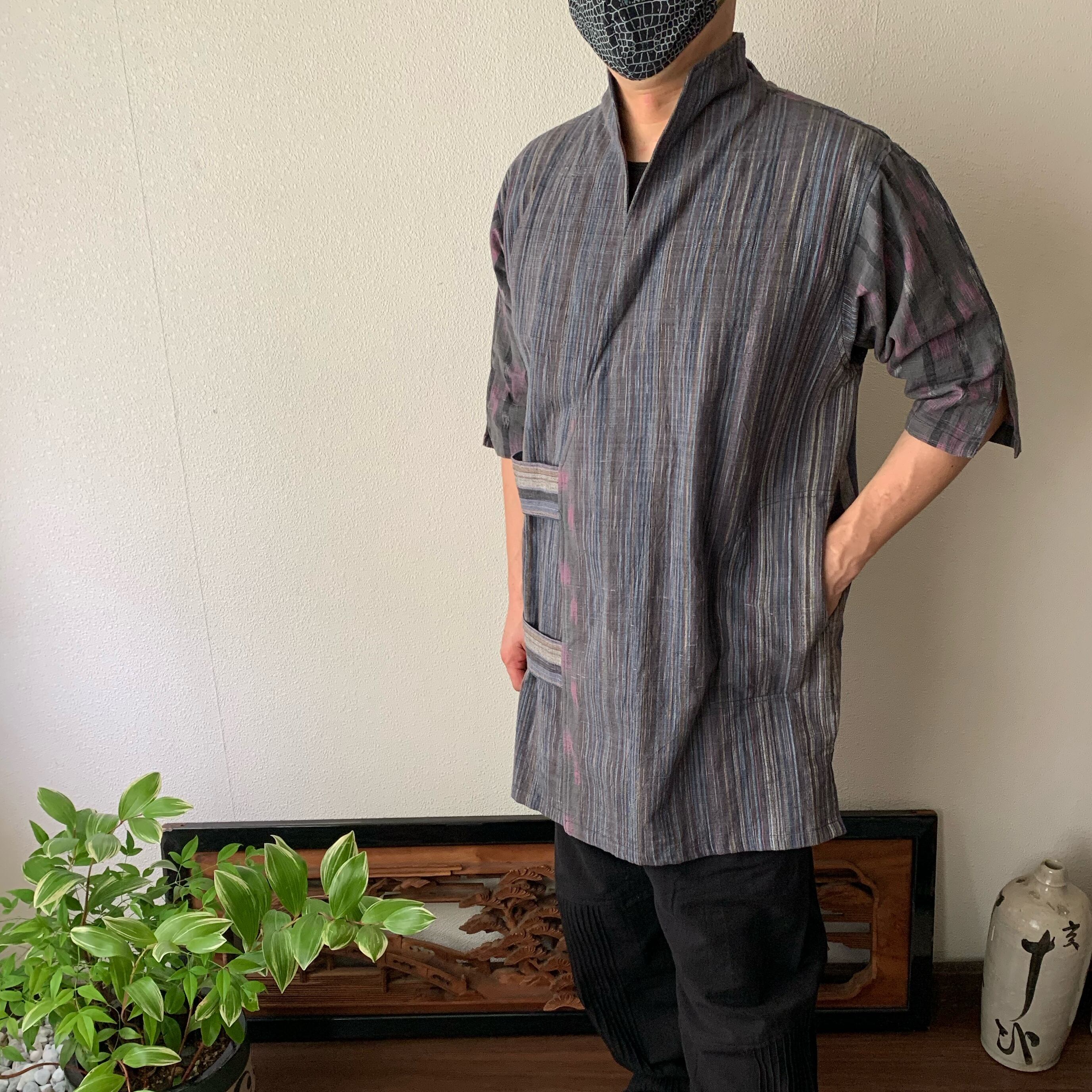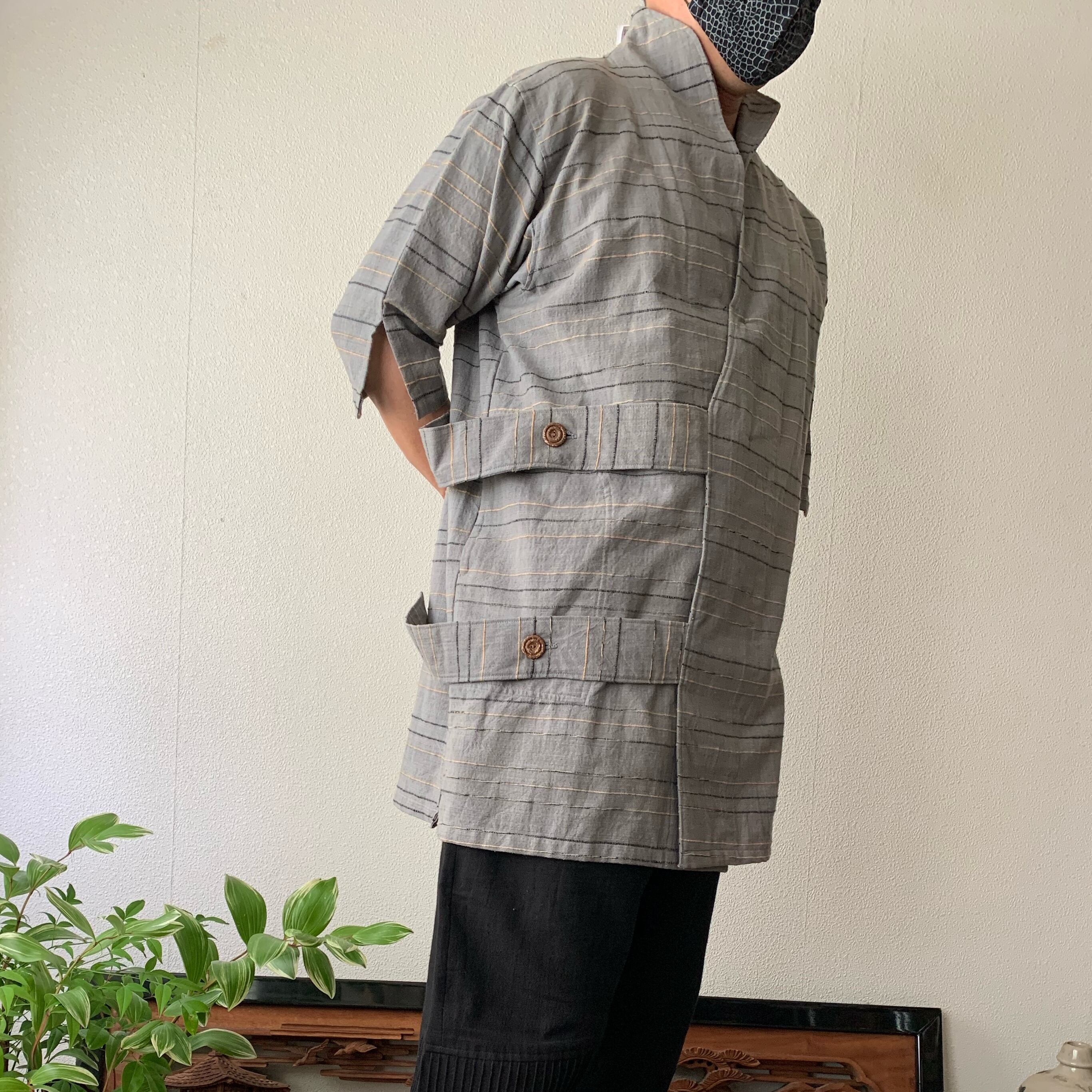 着物風手織り綿メンズブラウス半袖 ダブルベルトと着物風合わせで粋に着こなす グレイ絣