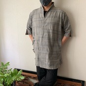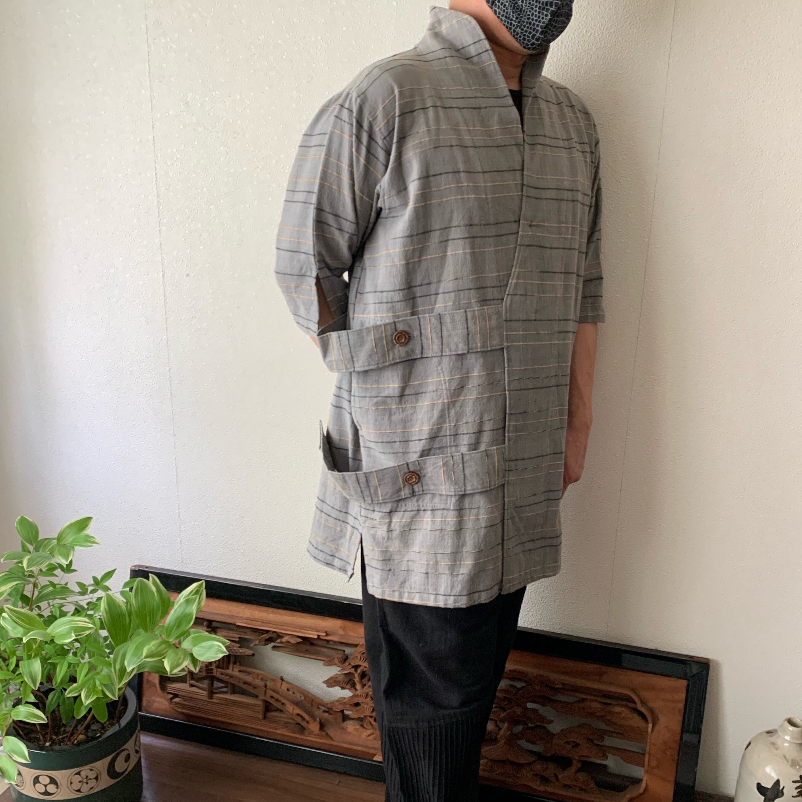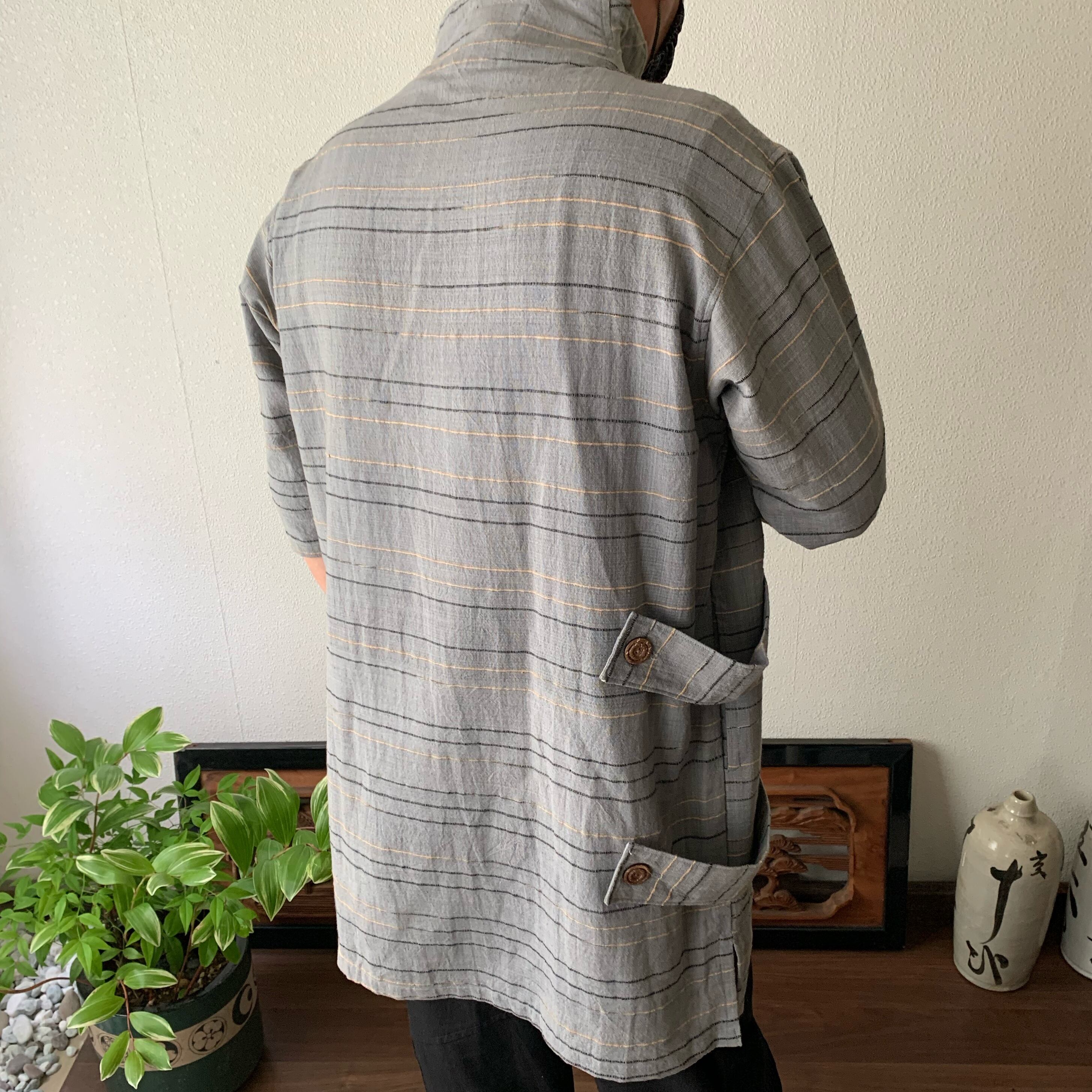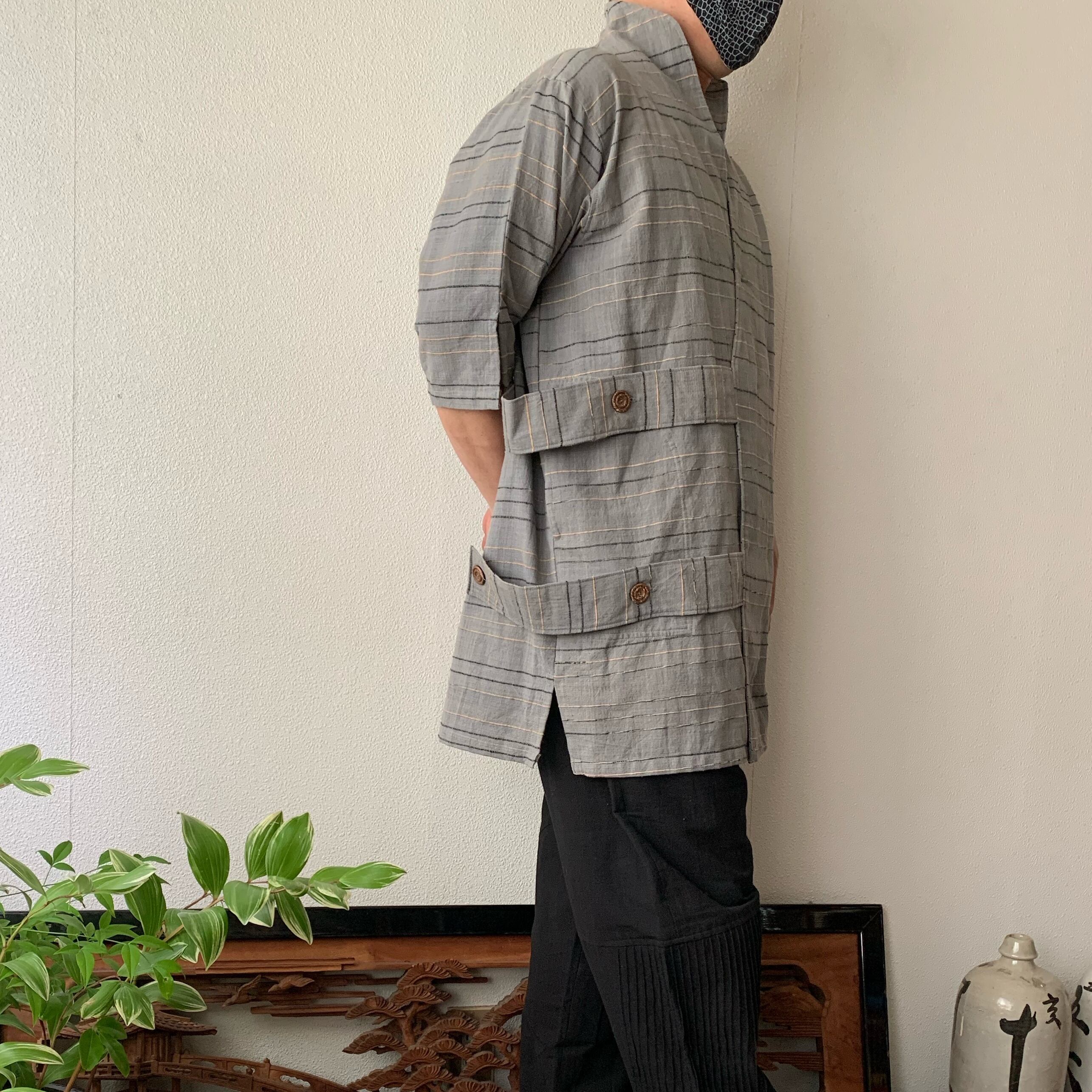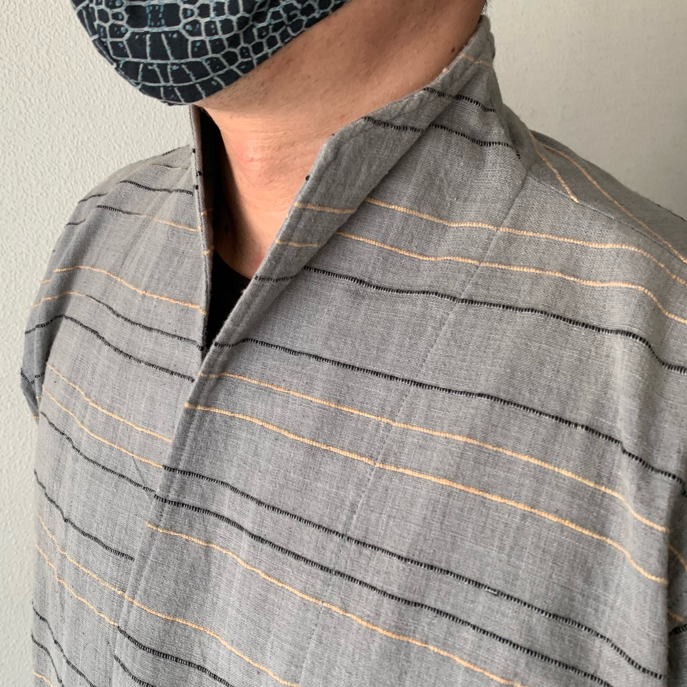 着物風手織り綿メンズブラウス半袖 ダブルベルトと着物風合わせで粋に着こなす グレイ絣