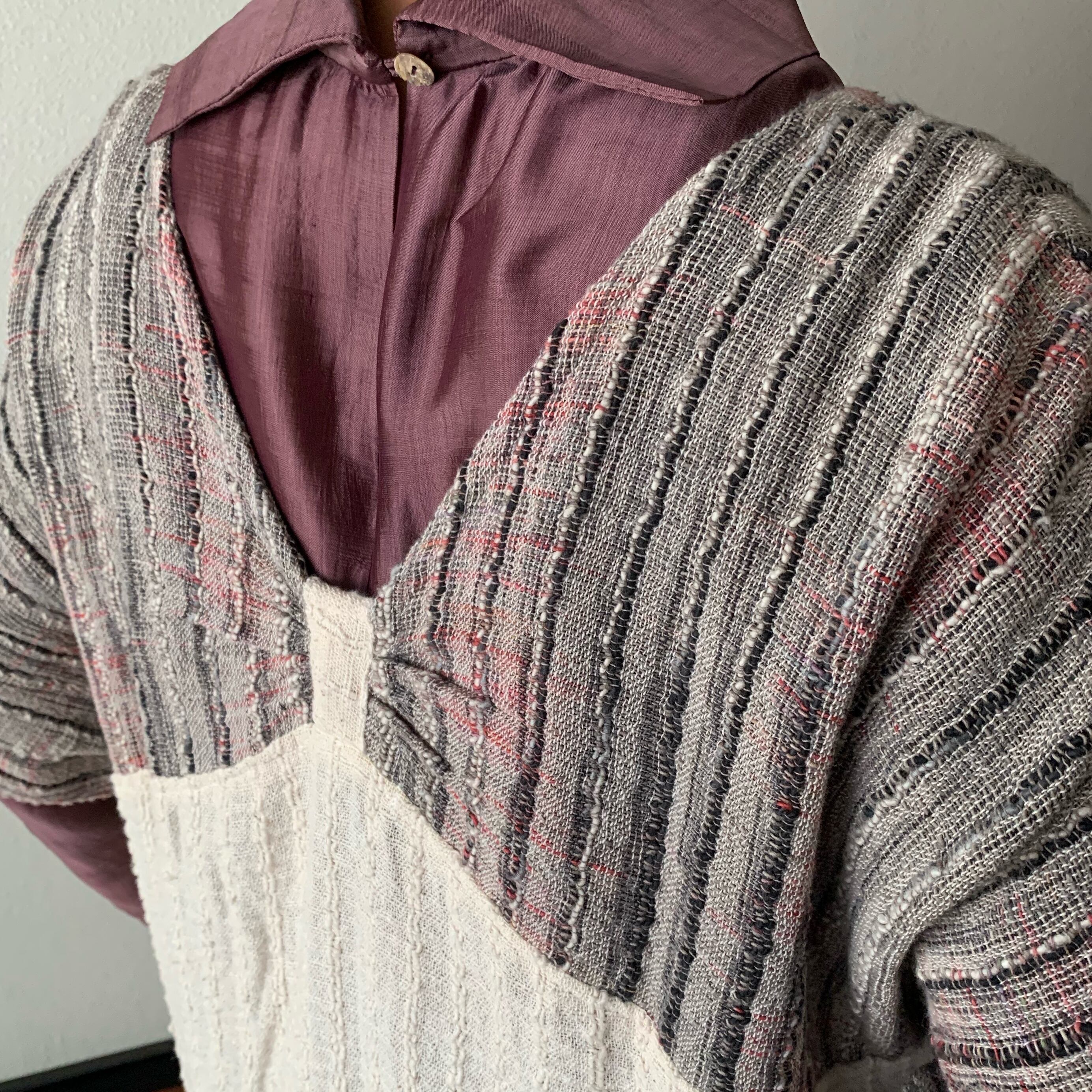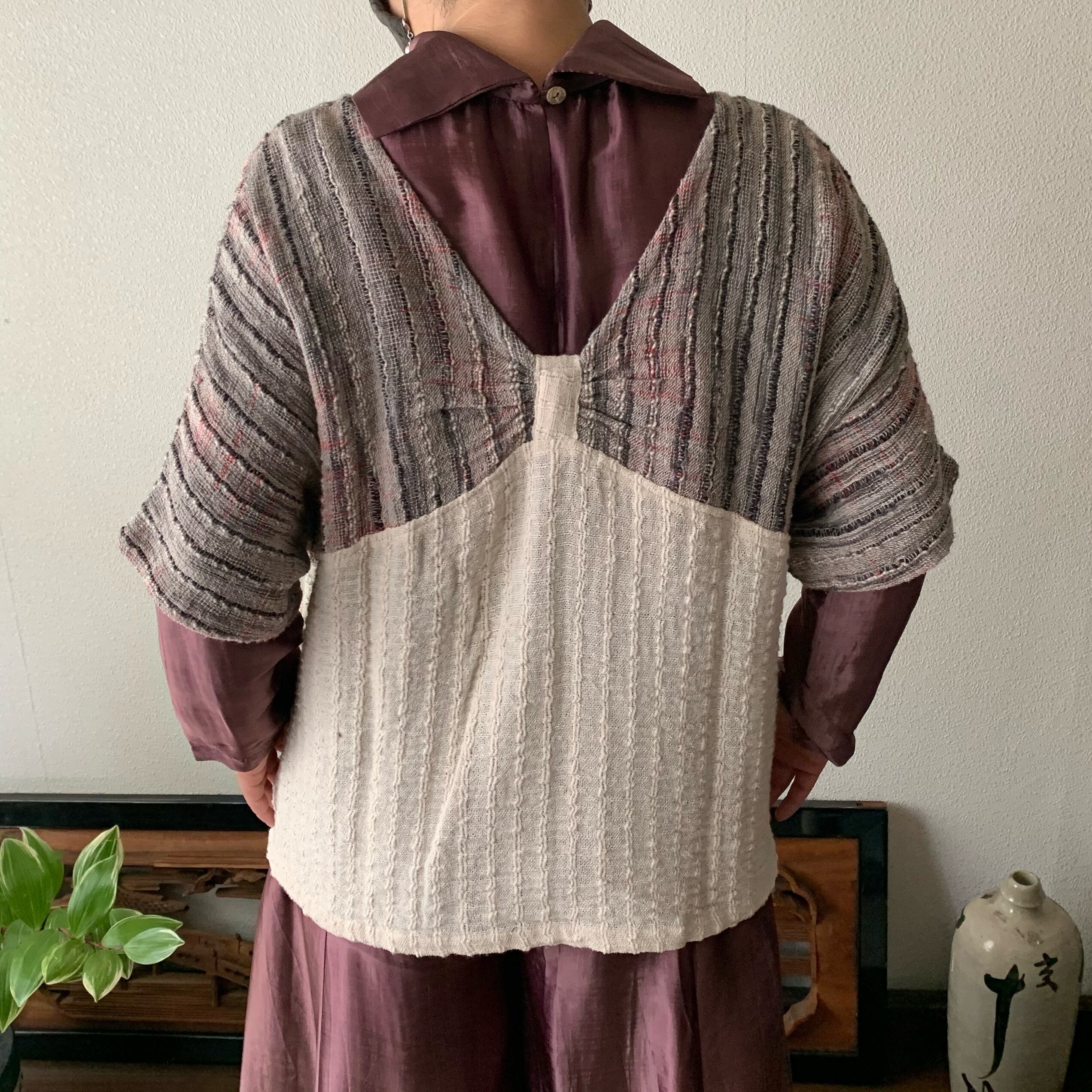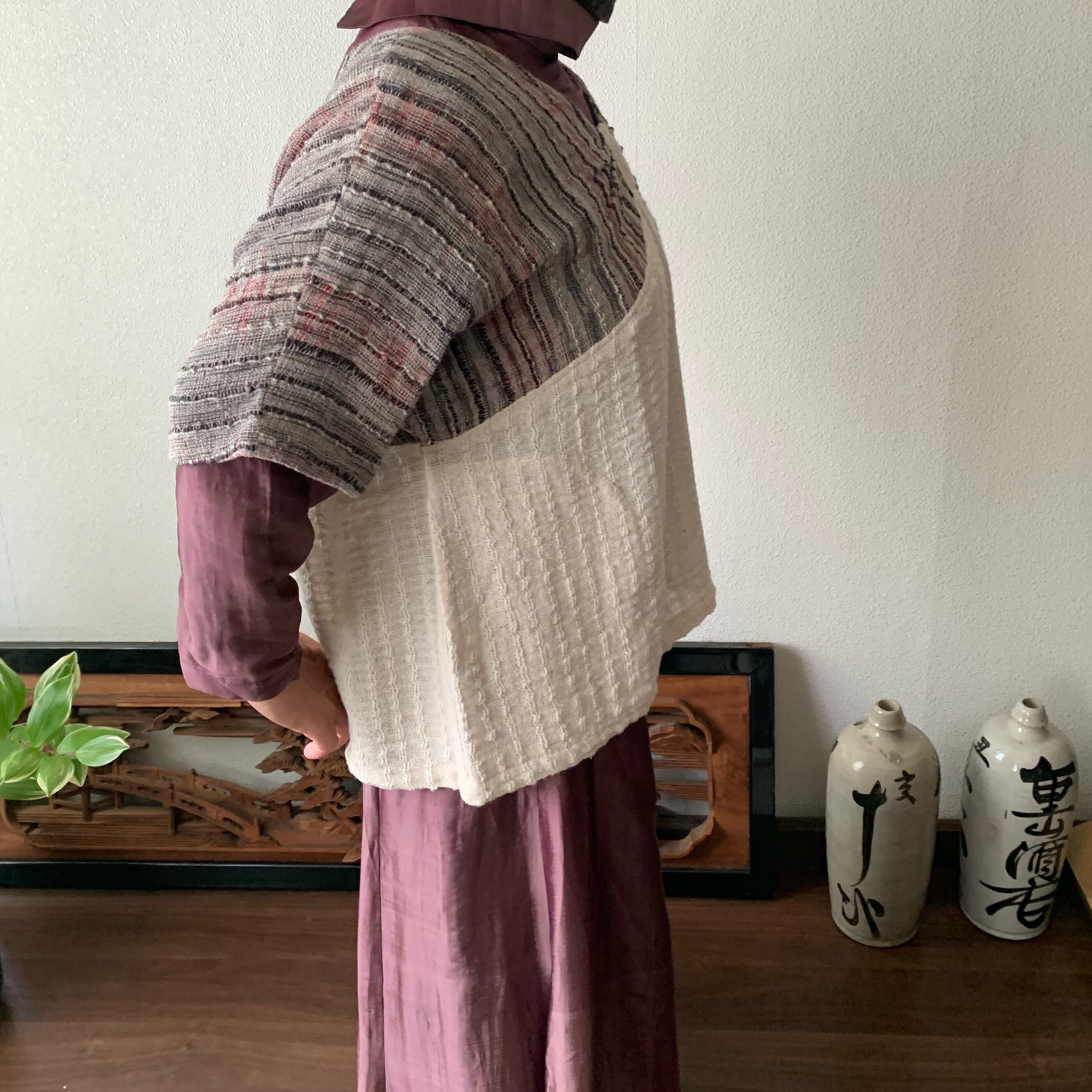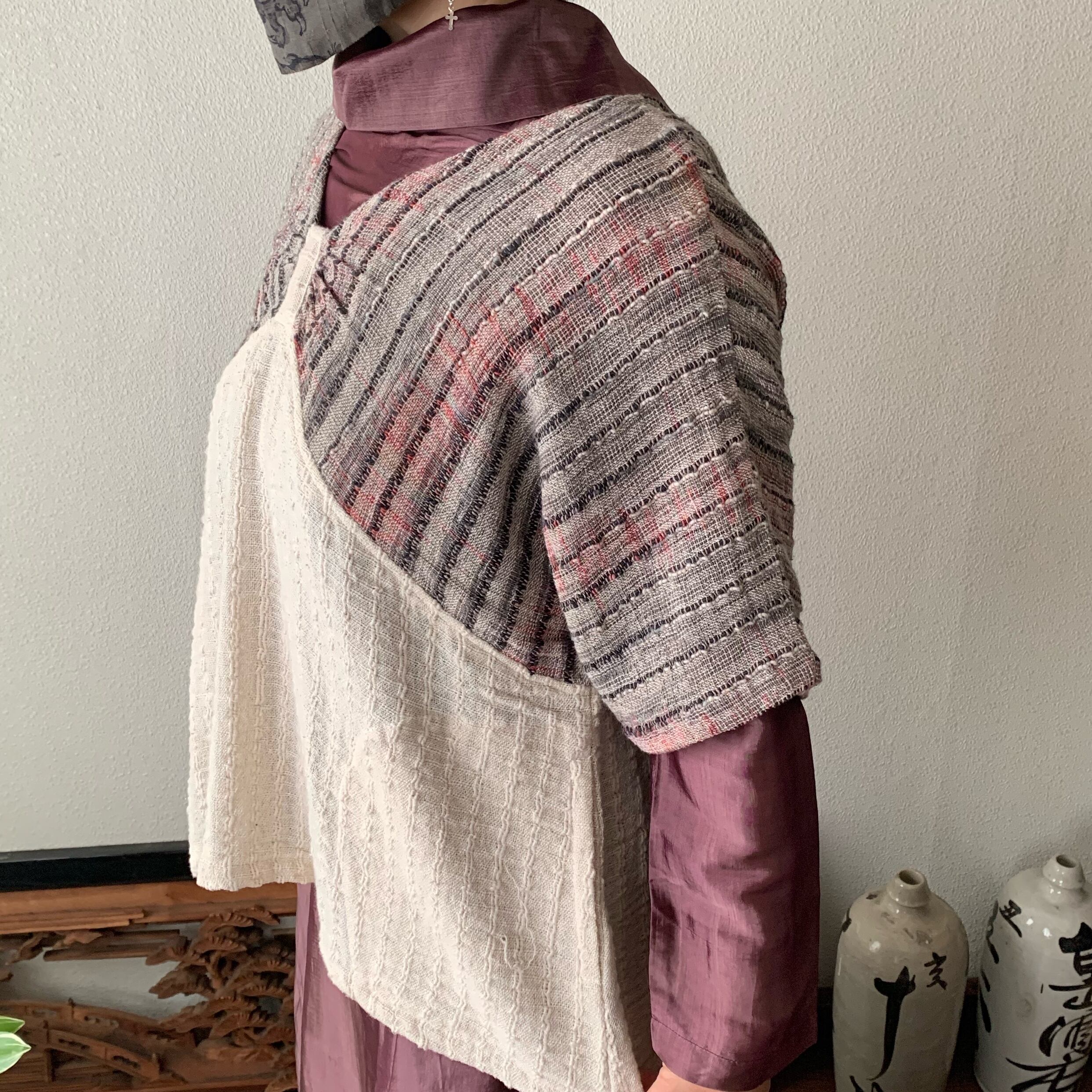 手織り綿の特性上、作品にはシボやネップ等(最後の写真右上部参照)が生地表面に現れる場合がございます。人の手を介して決して同じものが出来上がらない手織り綿の生地に、越天楽のデザインを吹き込んだ作品です。あらかじめご了解の上ご購入ください。なるべくいい状態でお届けいたしますが、気になる場合は細いかぎ針等で裏面から優しく引き抜いていただくと収まるものもあります。素朴で優しい風合いを楽しんでいただければ幸いです。