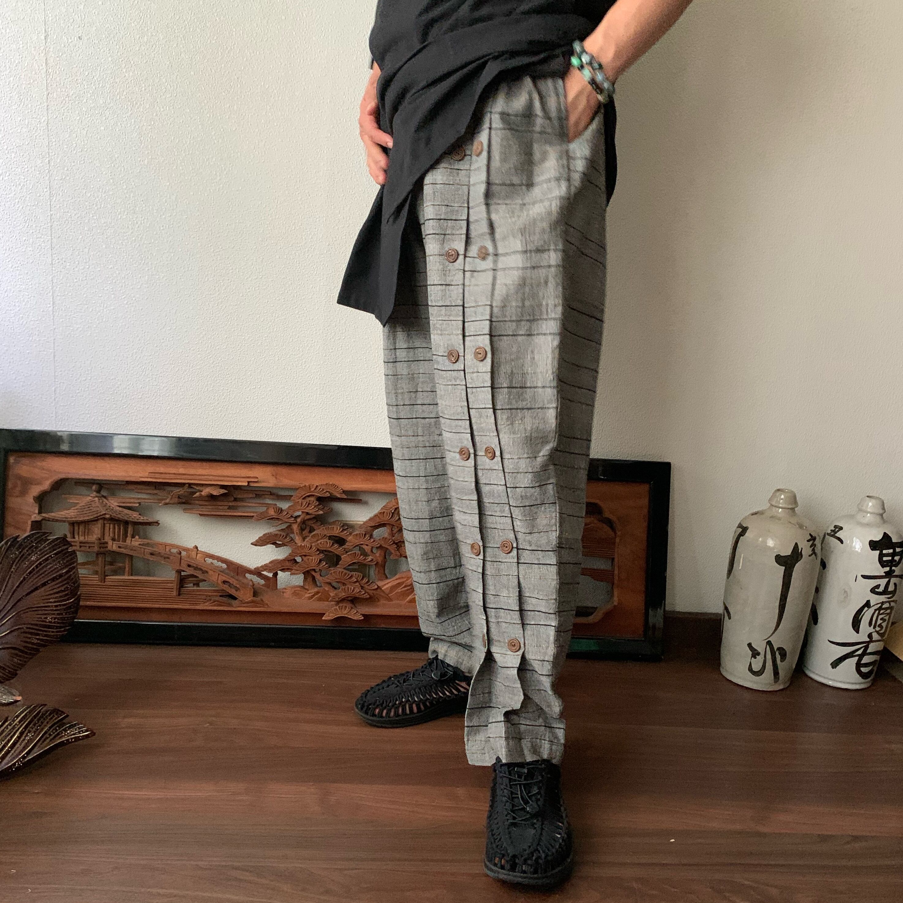 『上下に走るダブルボタンがシャープな印象 アシンメトリー手織り綿メンズパンツ』