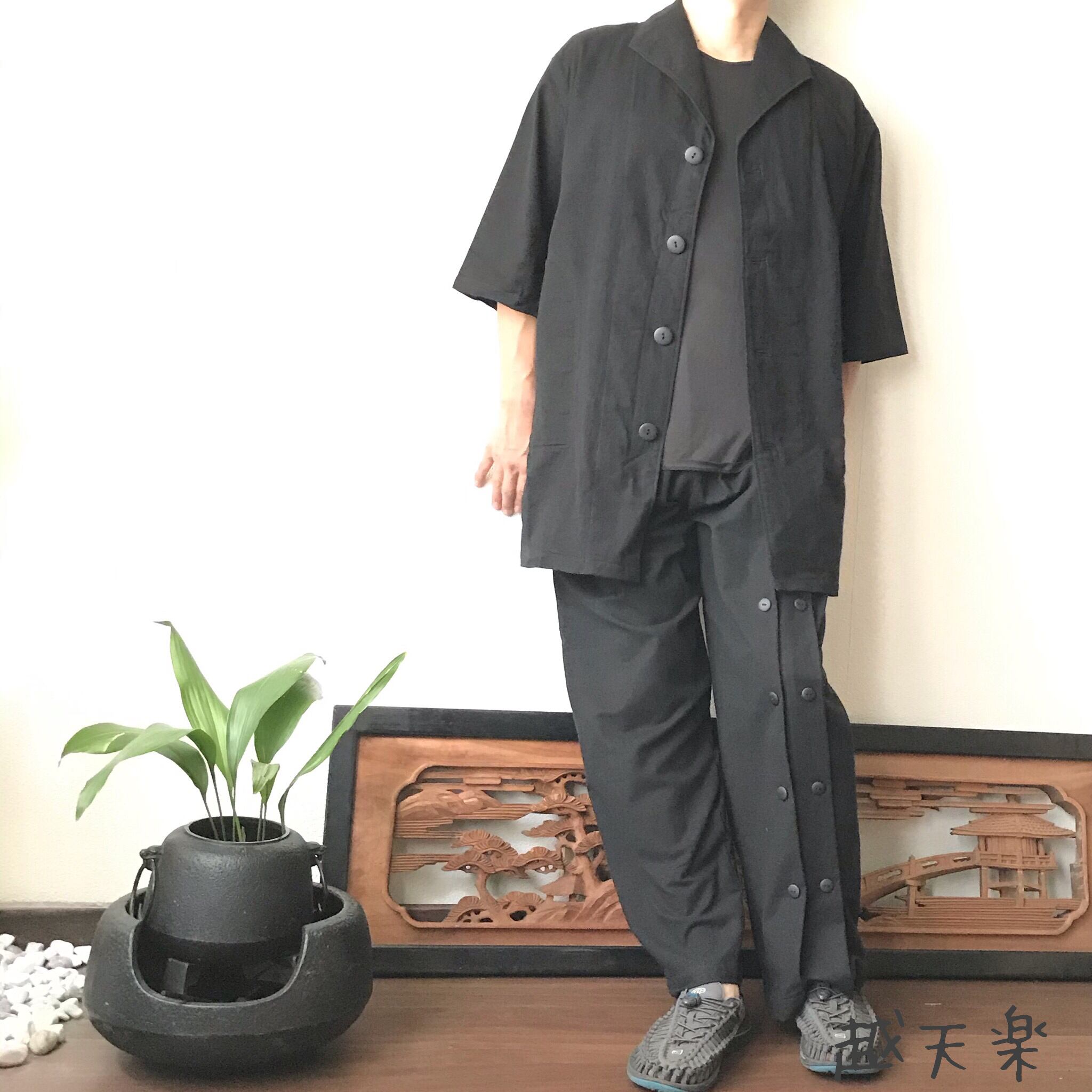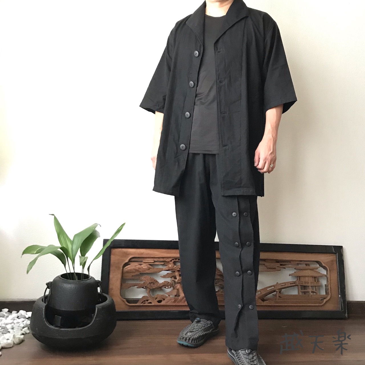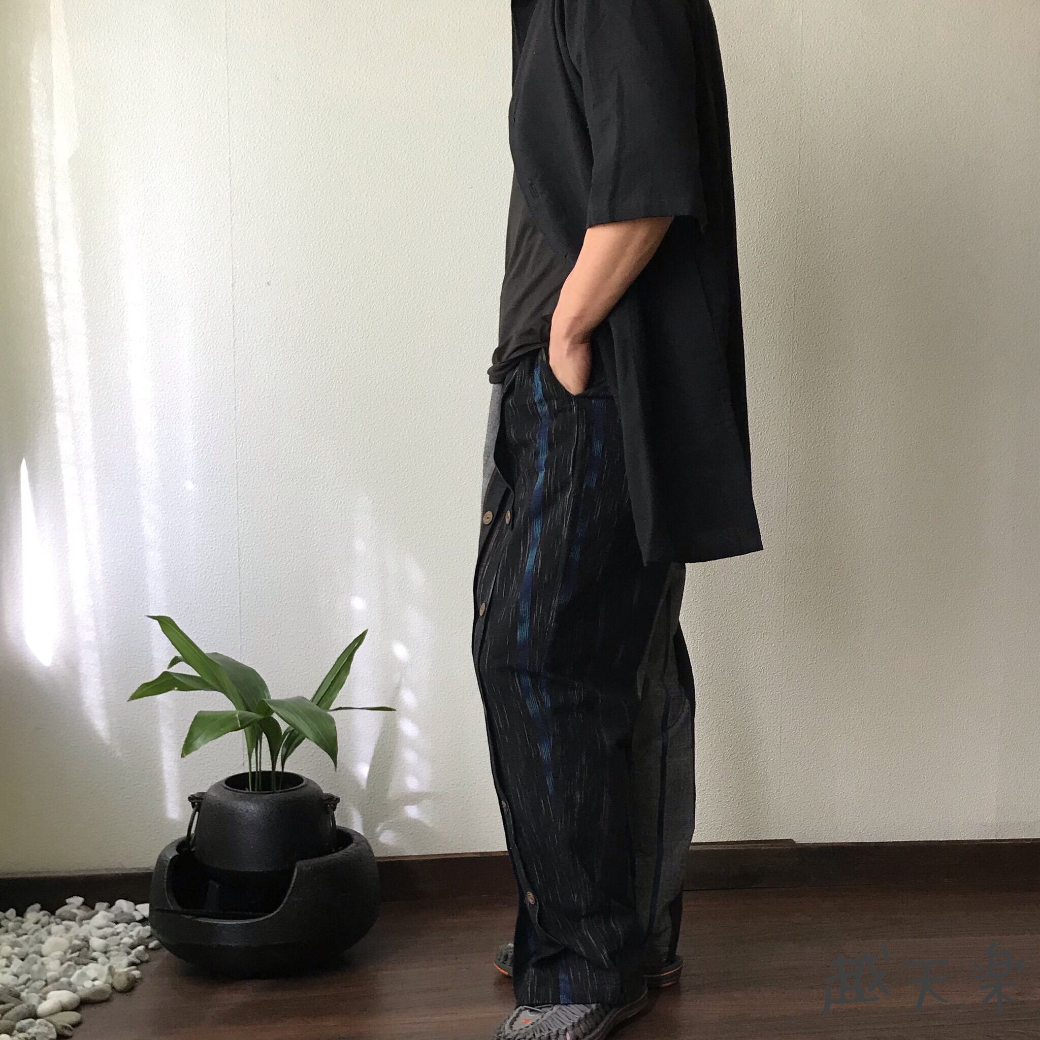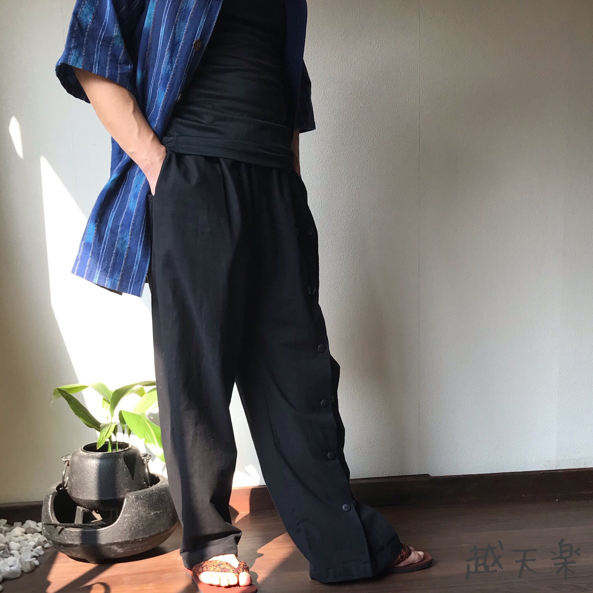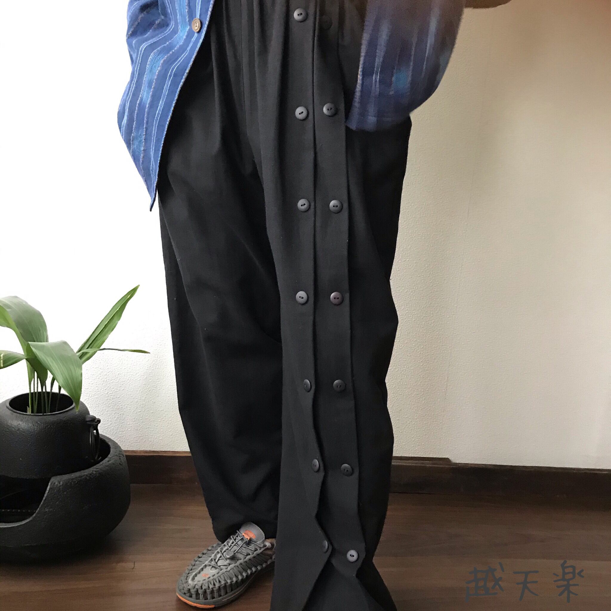 上下に走るダブルボタンがシャープな印象 アシンメトリー手織り綿メンズパンツ 黒無地