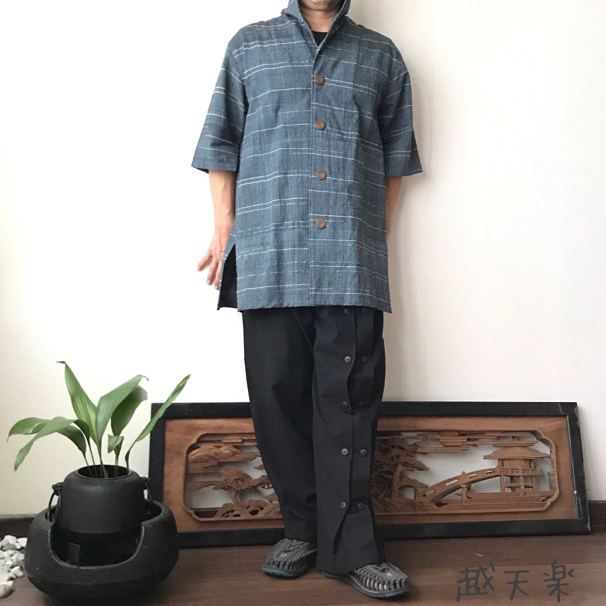 写真セットで着ている手織り綿の後ろベルトボタン半袖メンズブラウスこちら↓
