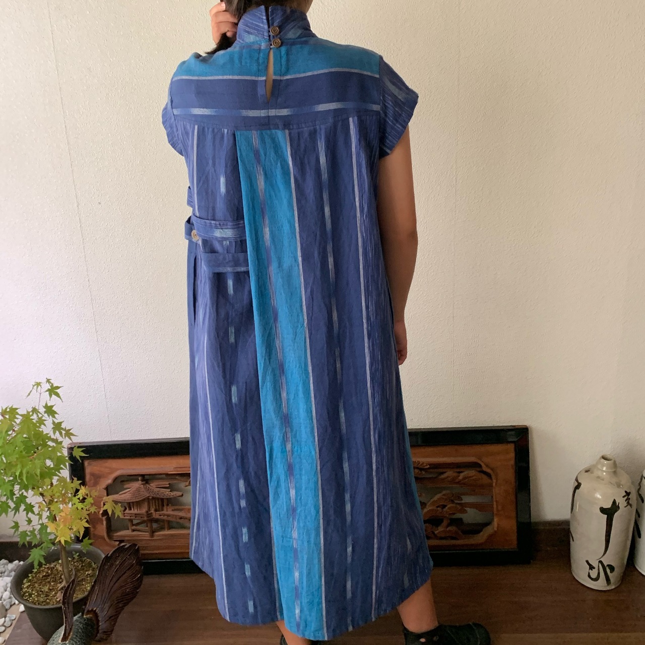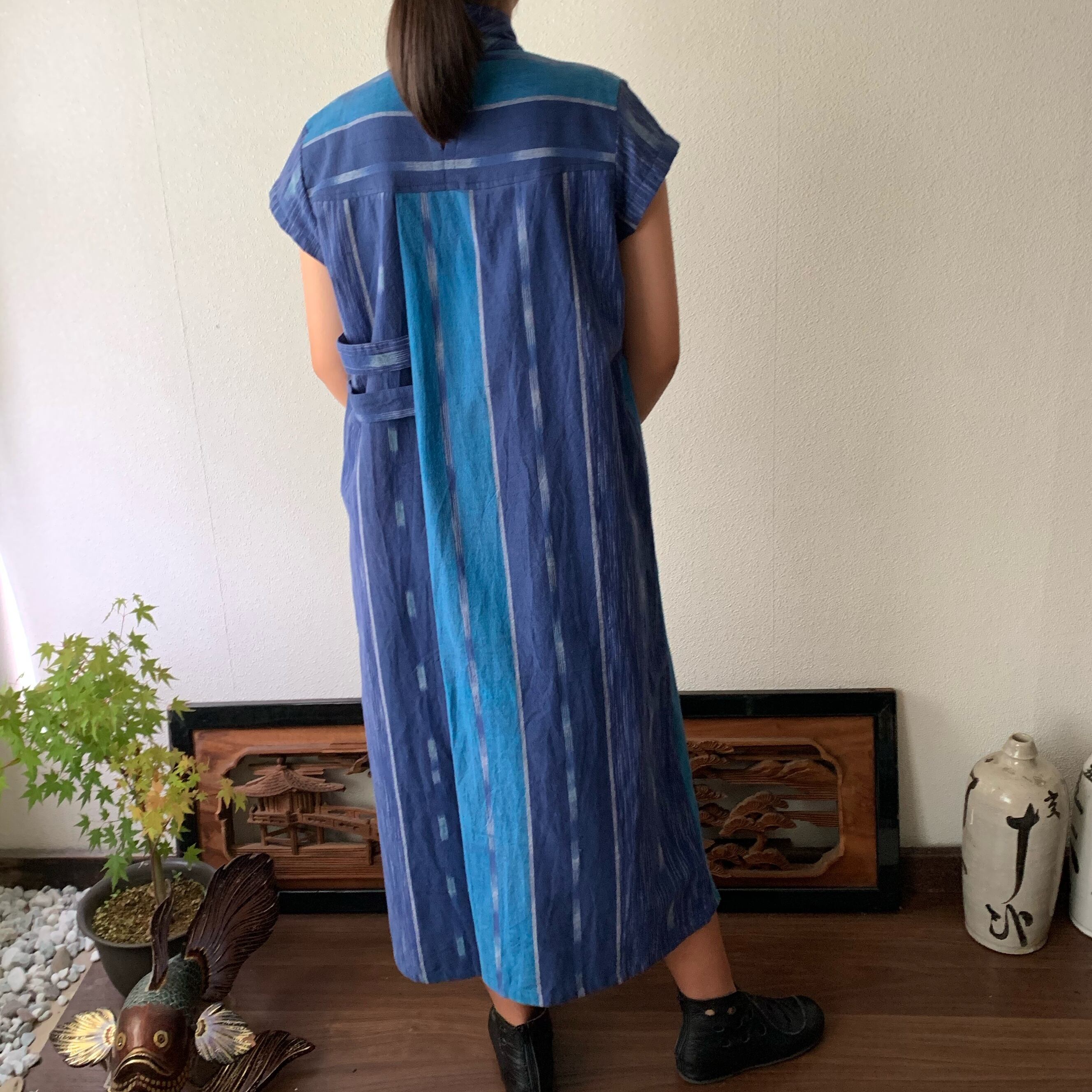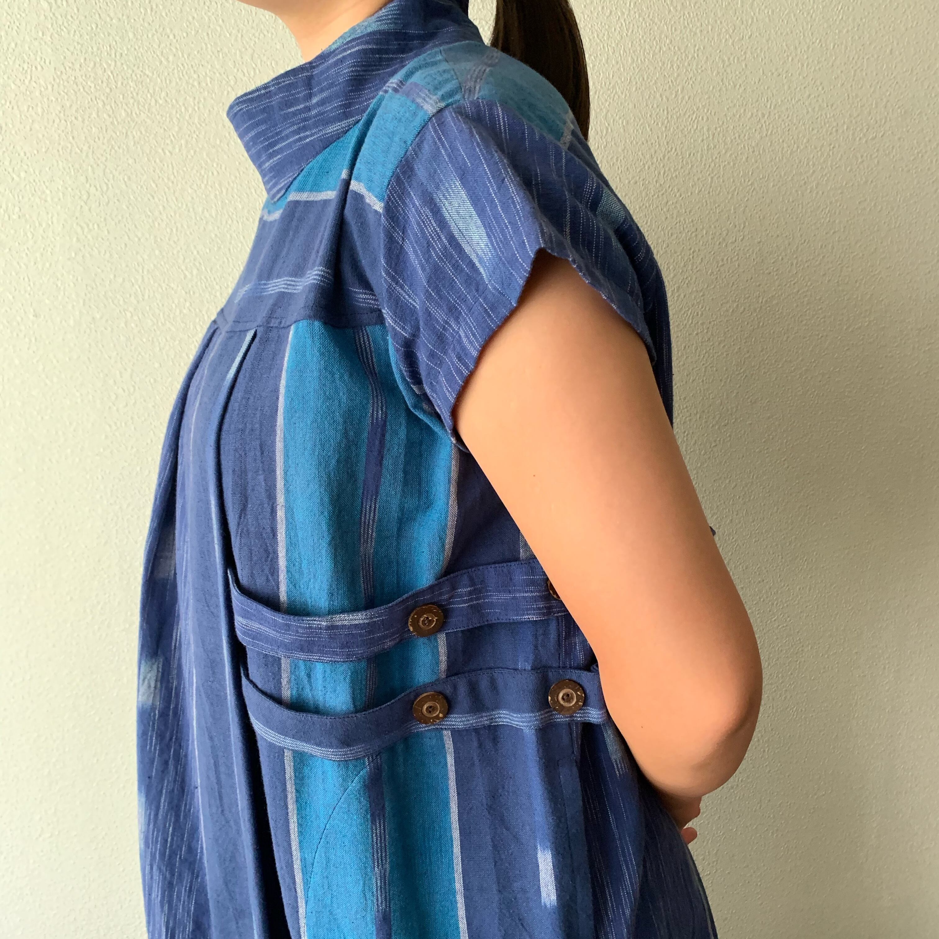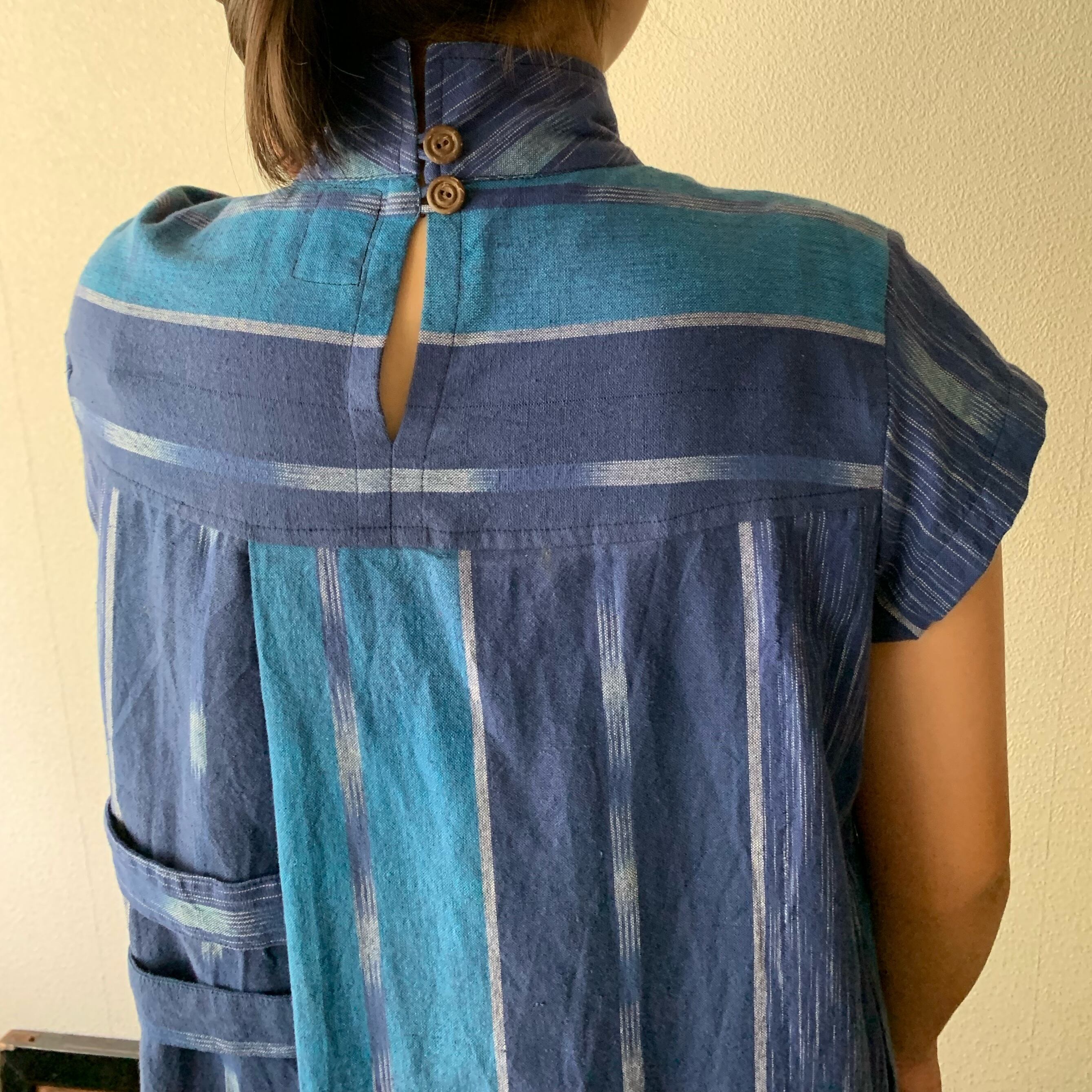 『前後ろの重なりダブルベルトがかっこいいゆったり手織り綿ワンピース さりげないタックですっきり』