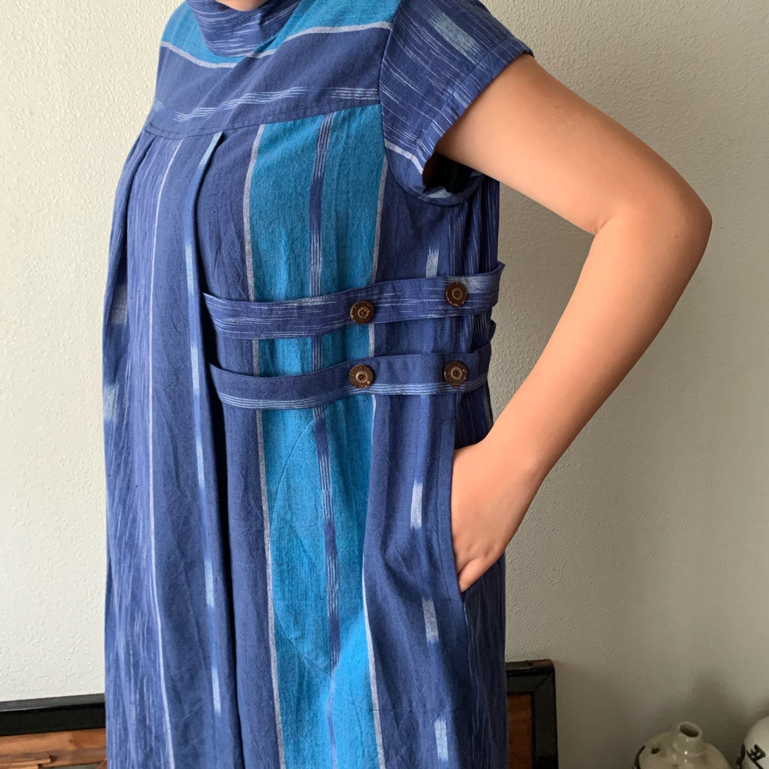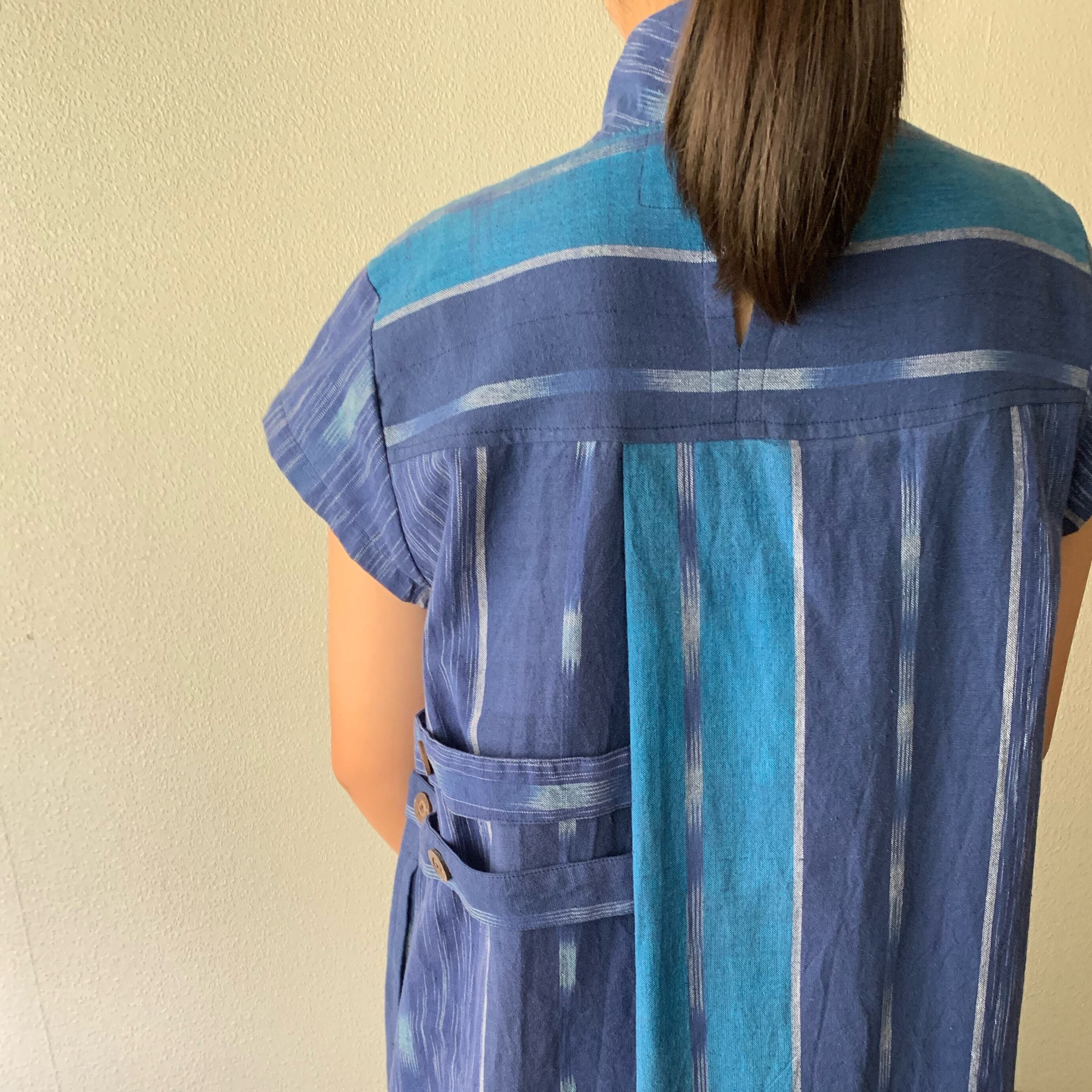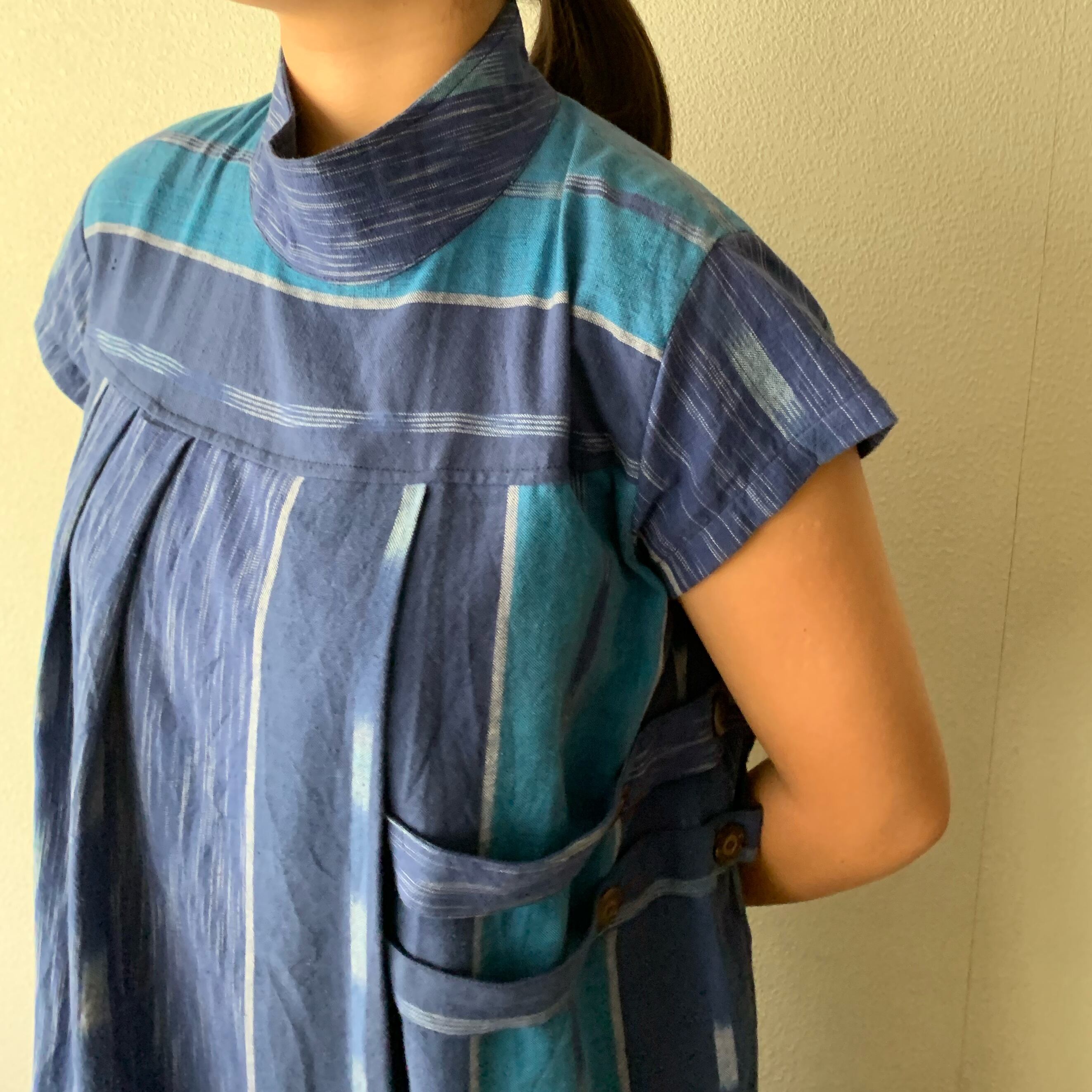 『前後ろの重なりダブルベルトがかっこいいゆったり手織り綿ワンピース さりげないタックですっきり』