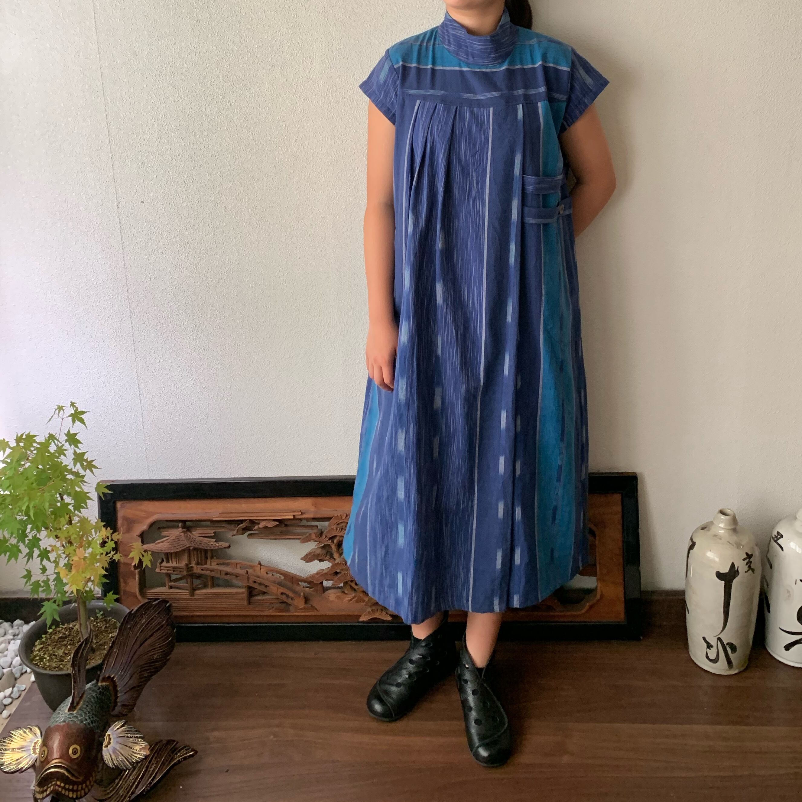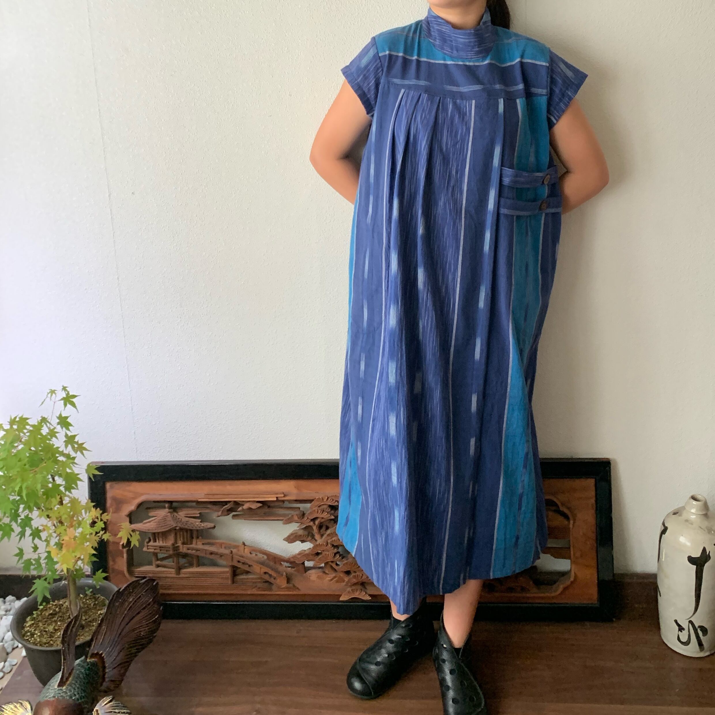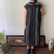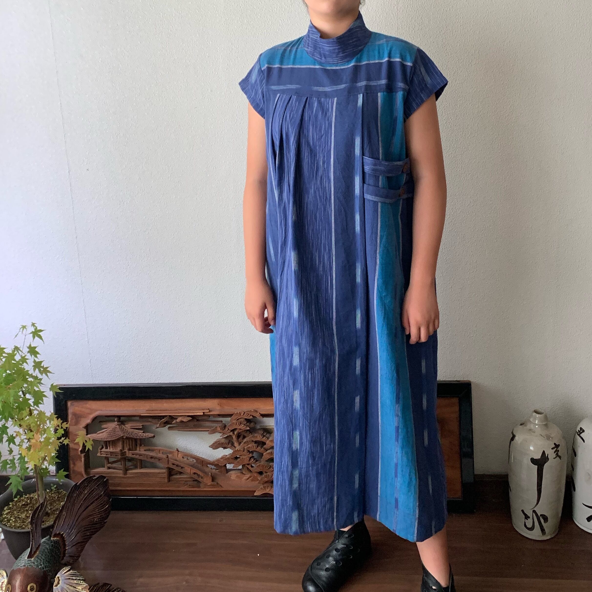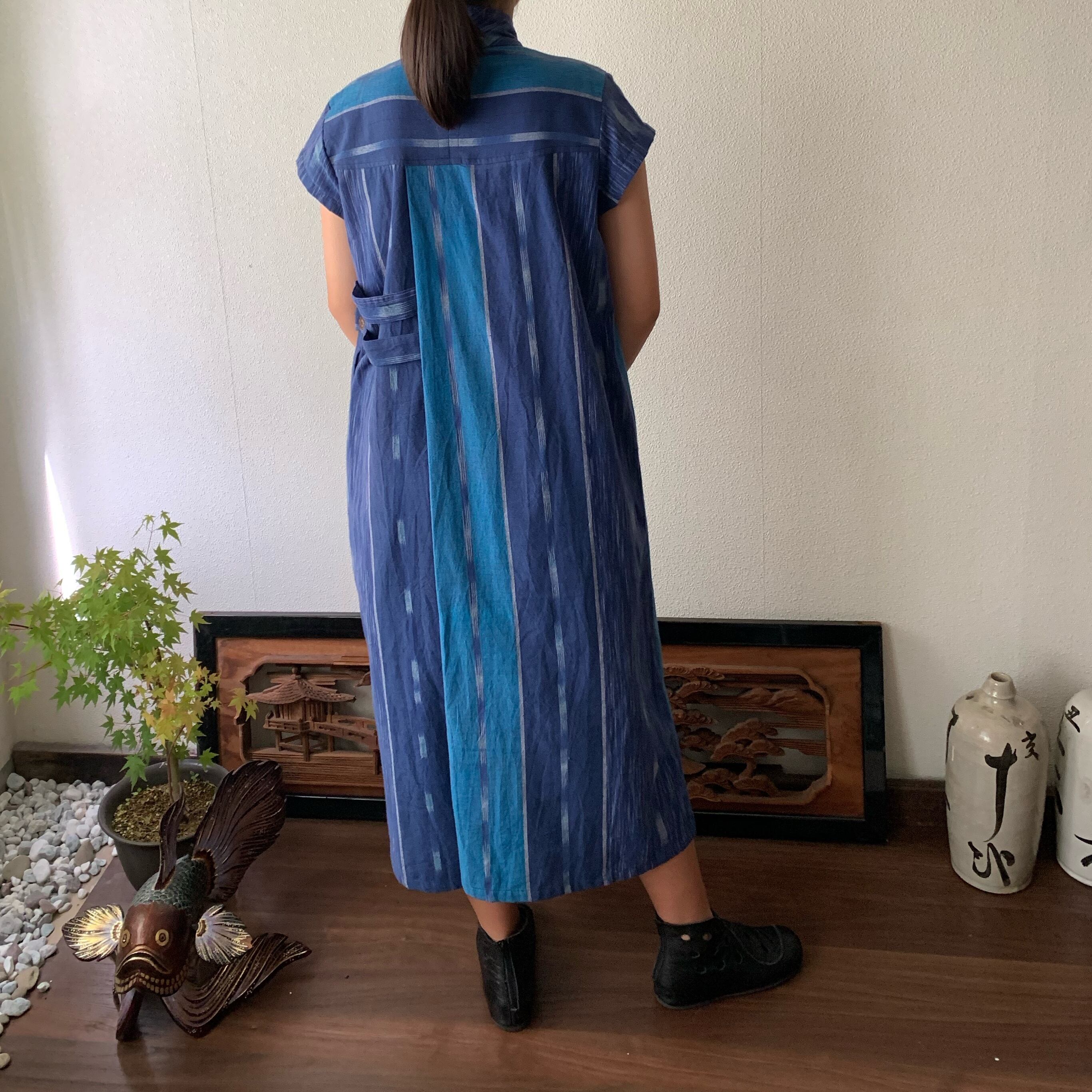 『前後ろの重なりダブルベルトがかっこいいゆったり手織り綿ワンピース さりげないタックですっきり』