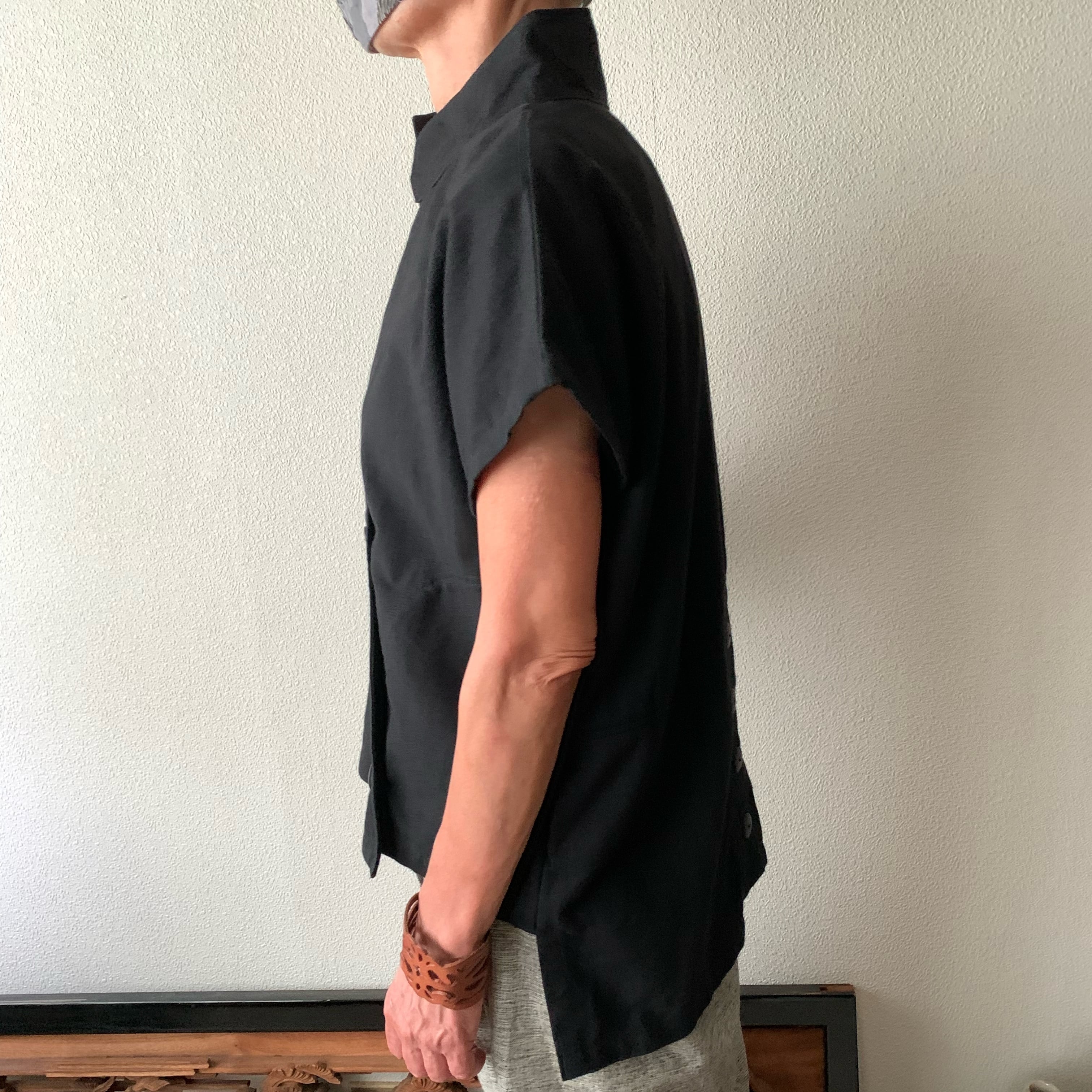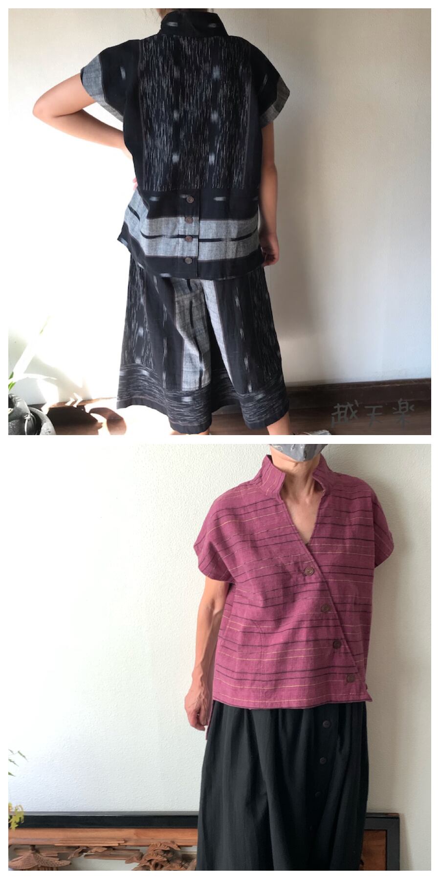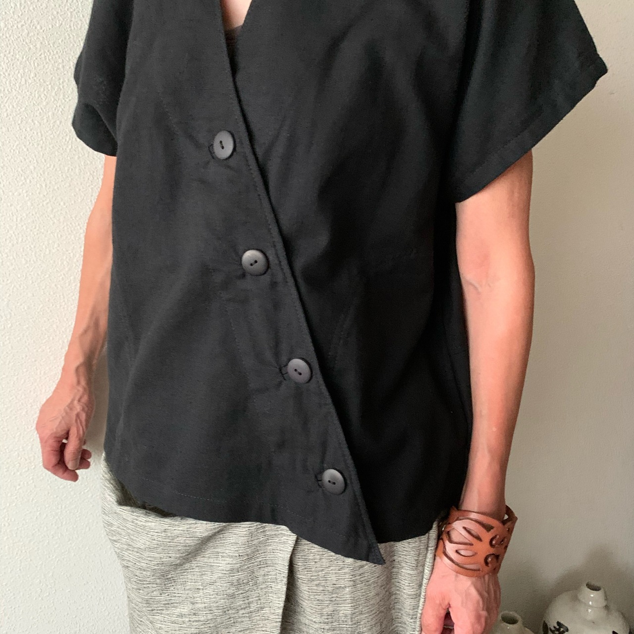 『前開きでシンプルに着こなせるけどディテール凝ってる手織り綿フレンチスリーブブラウスベスト』
