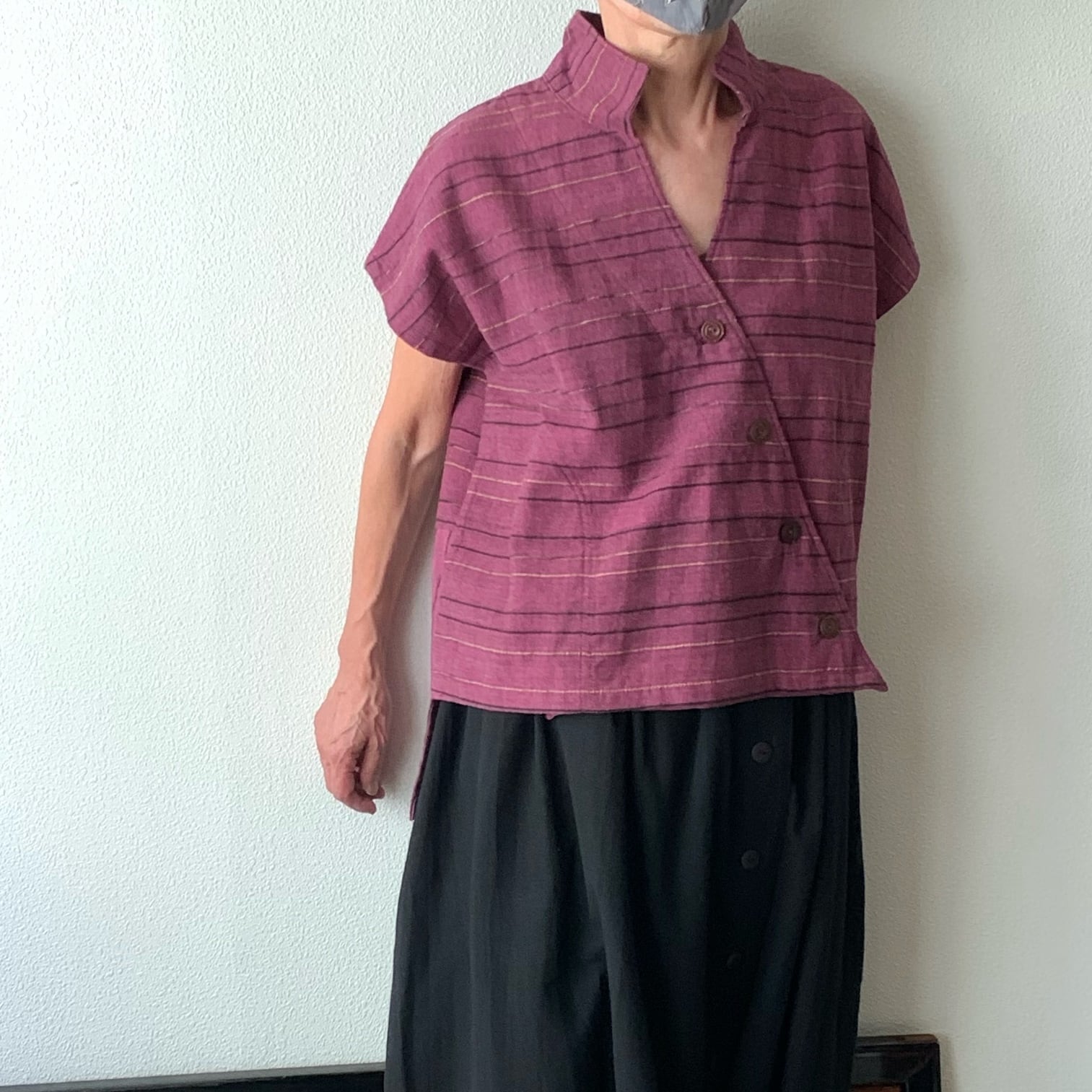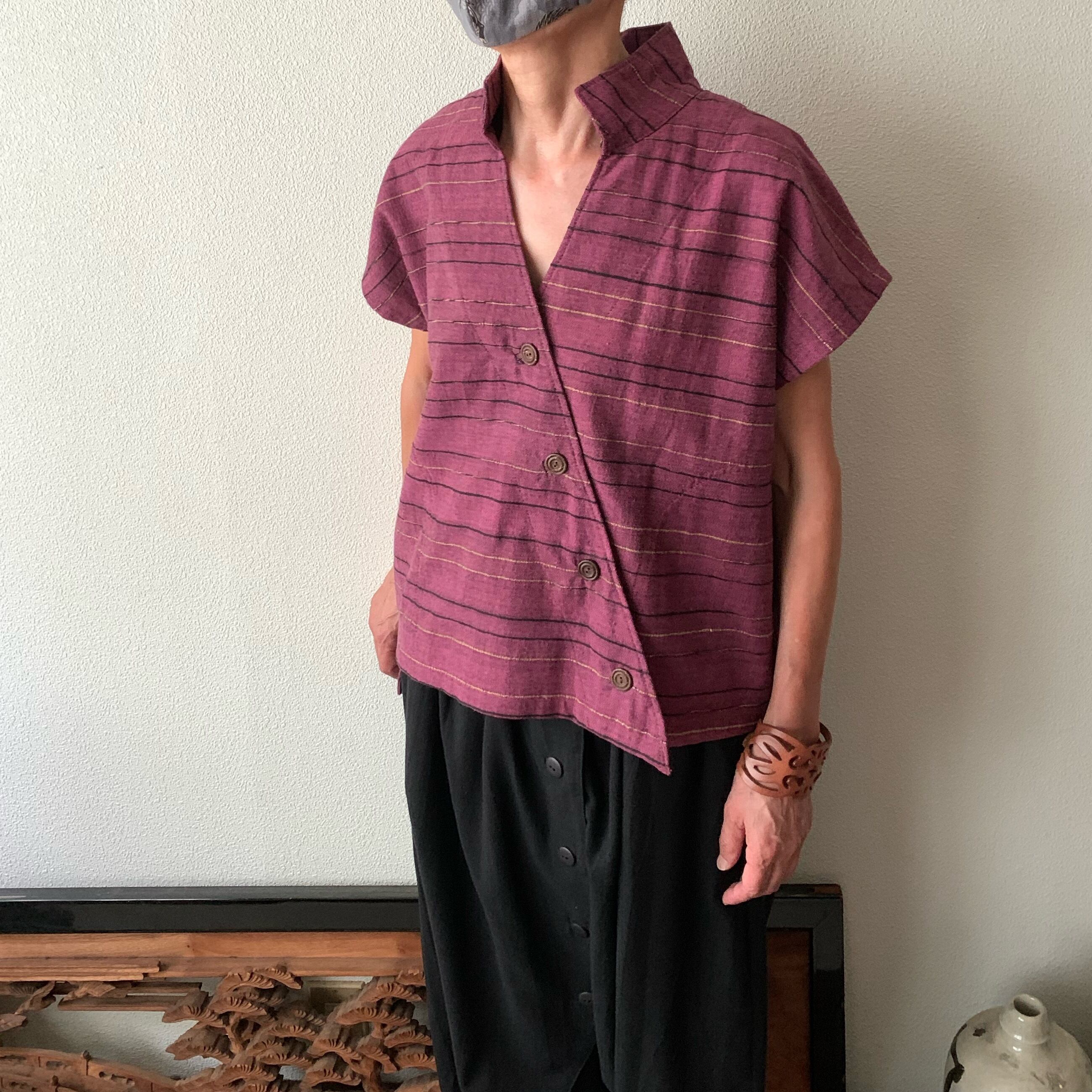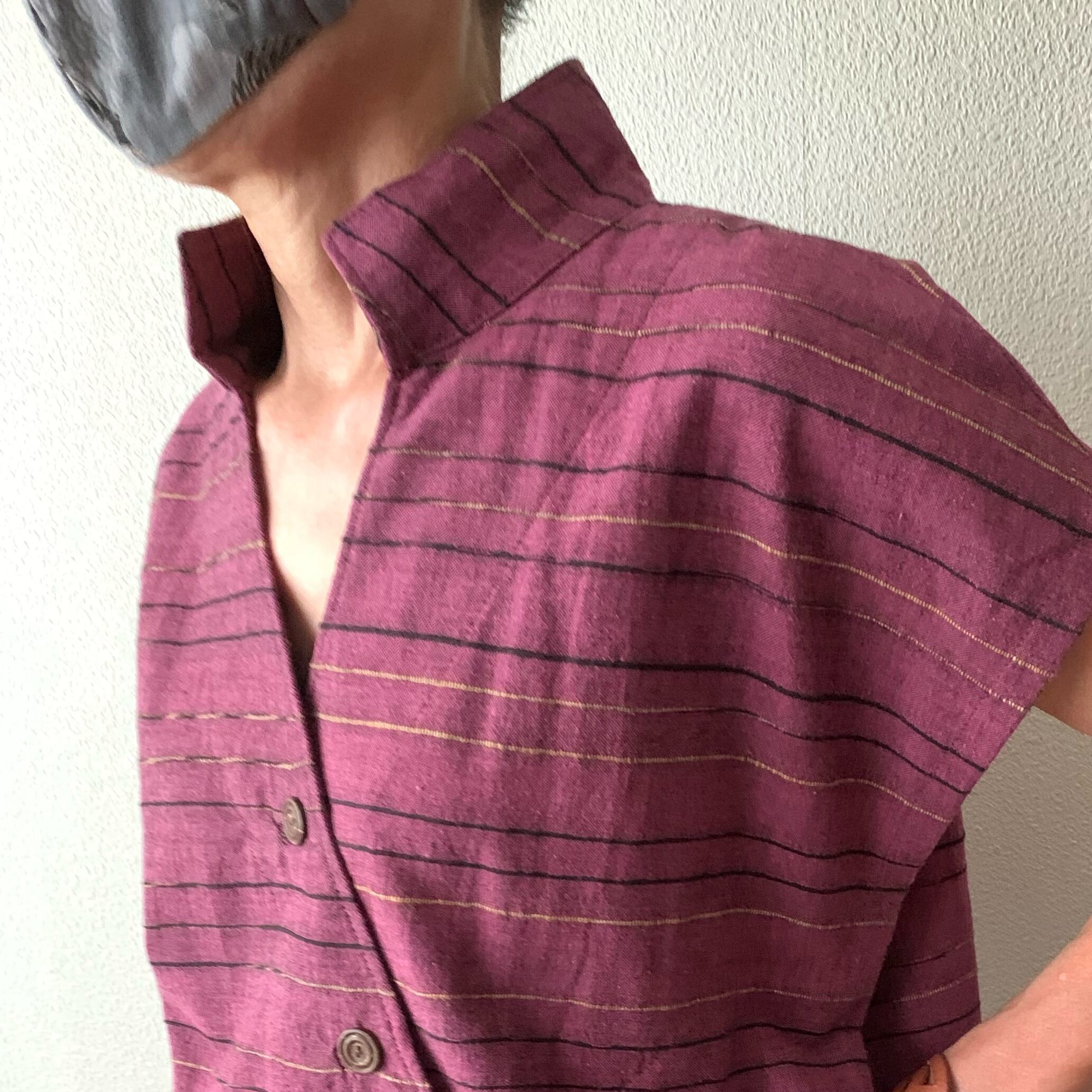 『小柄な方向け 前開きでシンプルに着こなせるけどディテール凝ってる手織り綿フレンチスリーブブラウスベスト』