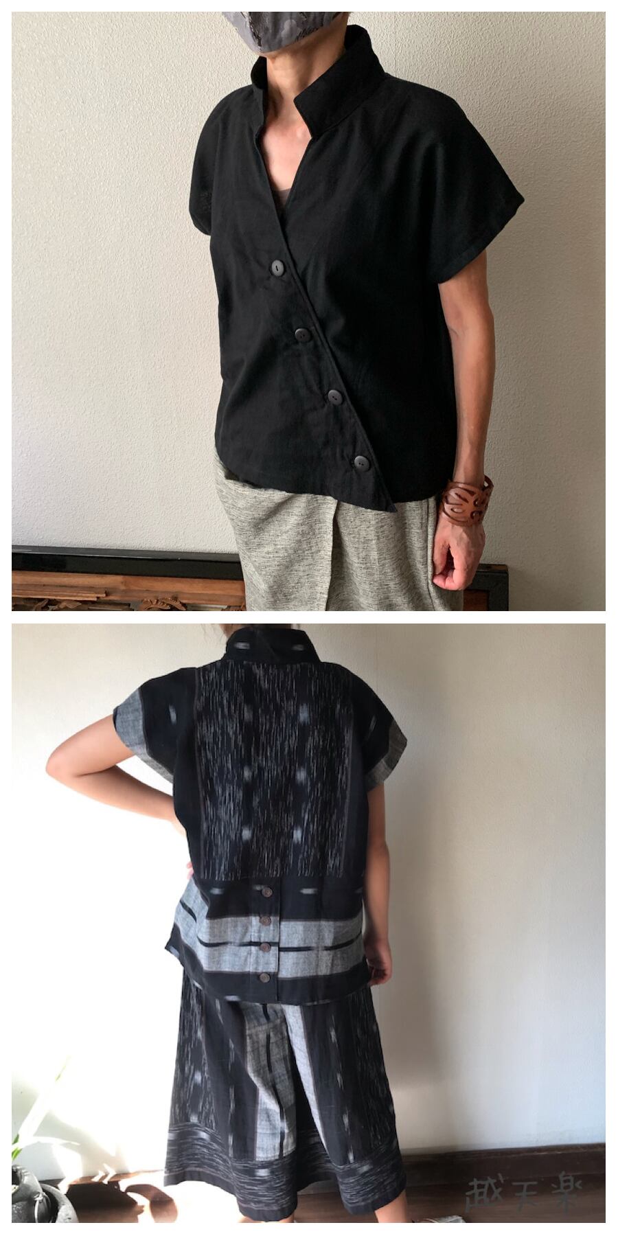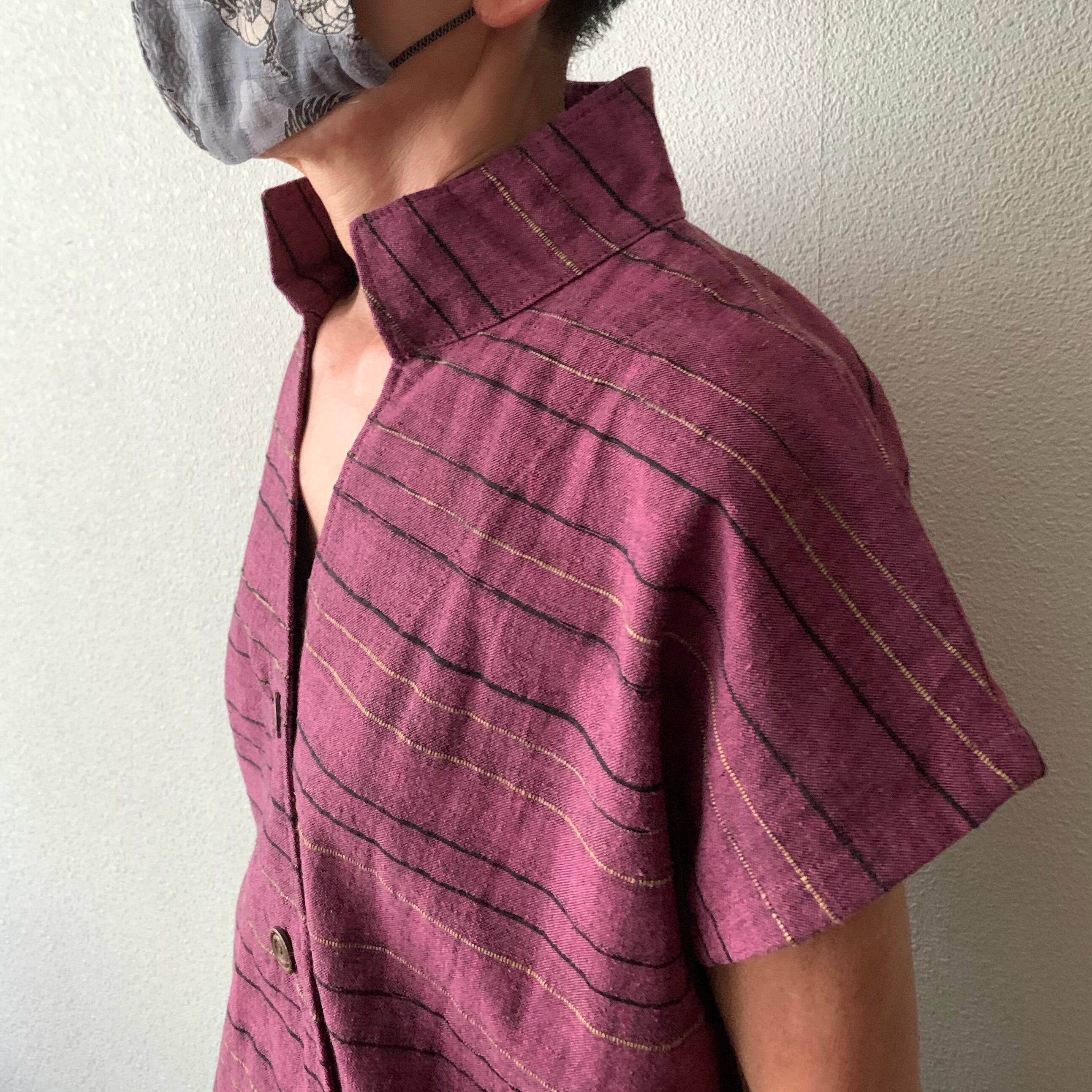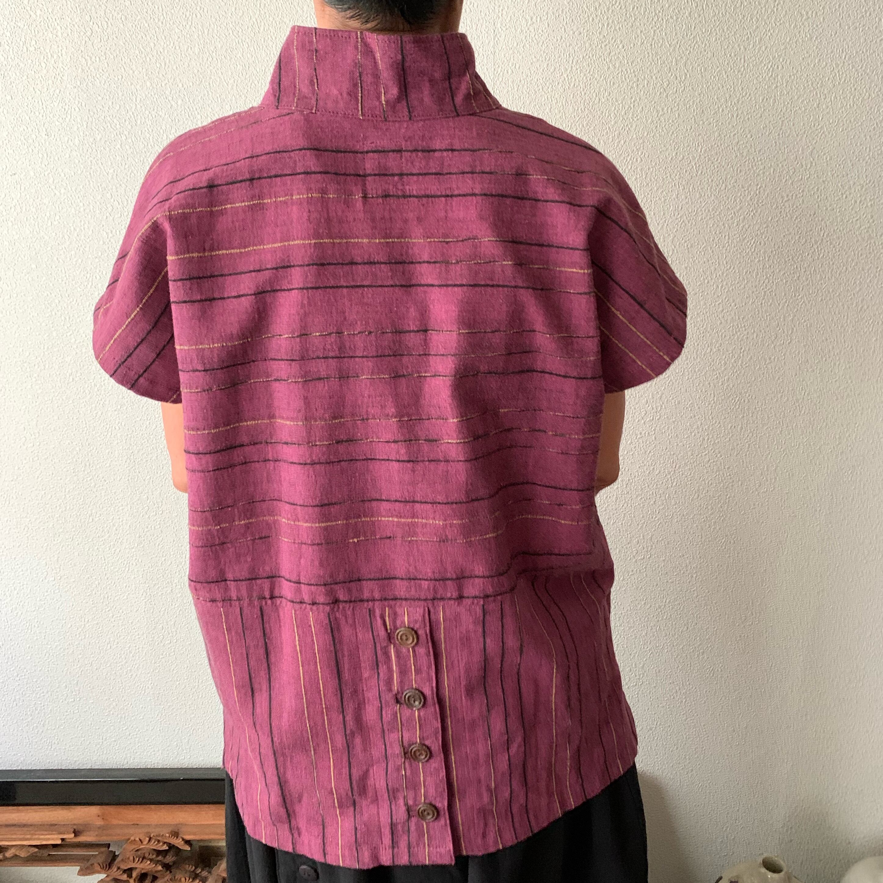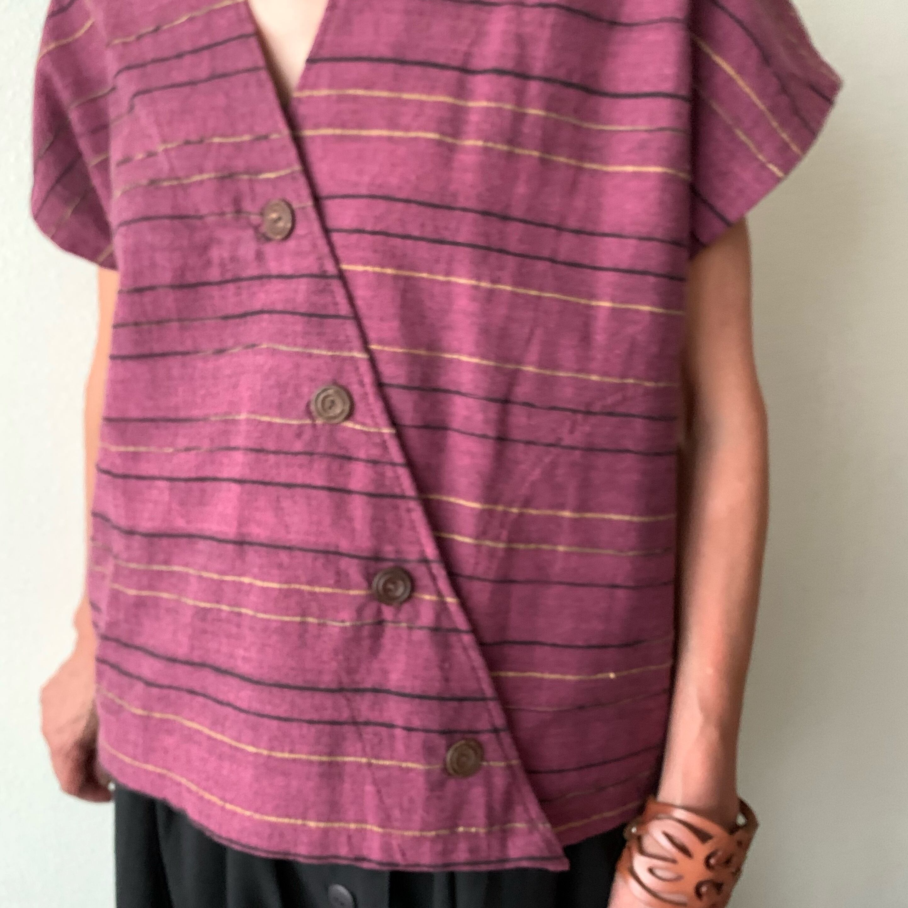 『小柄な方向け 前開きでシンプルに着こなせるけどディテール凝ってる手織り綿フレンチスリーブブラウスベスト』