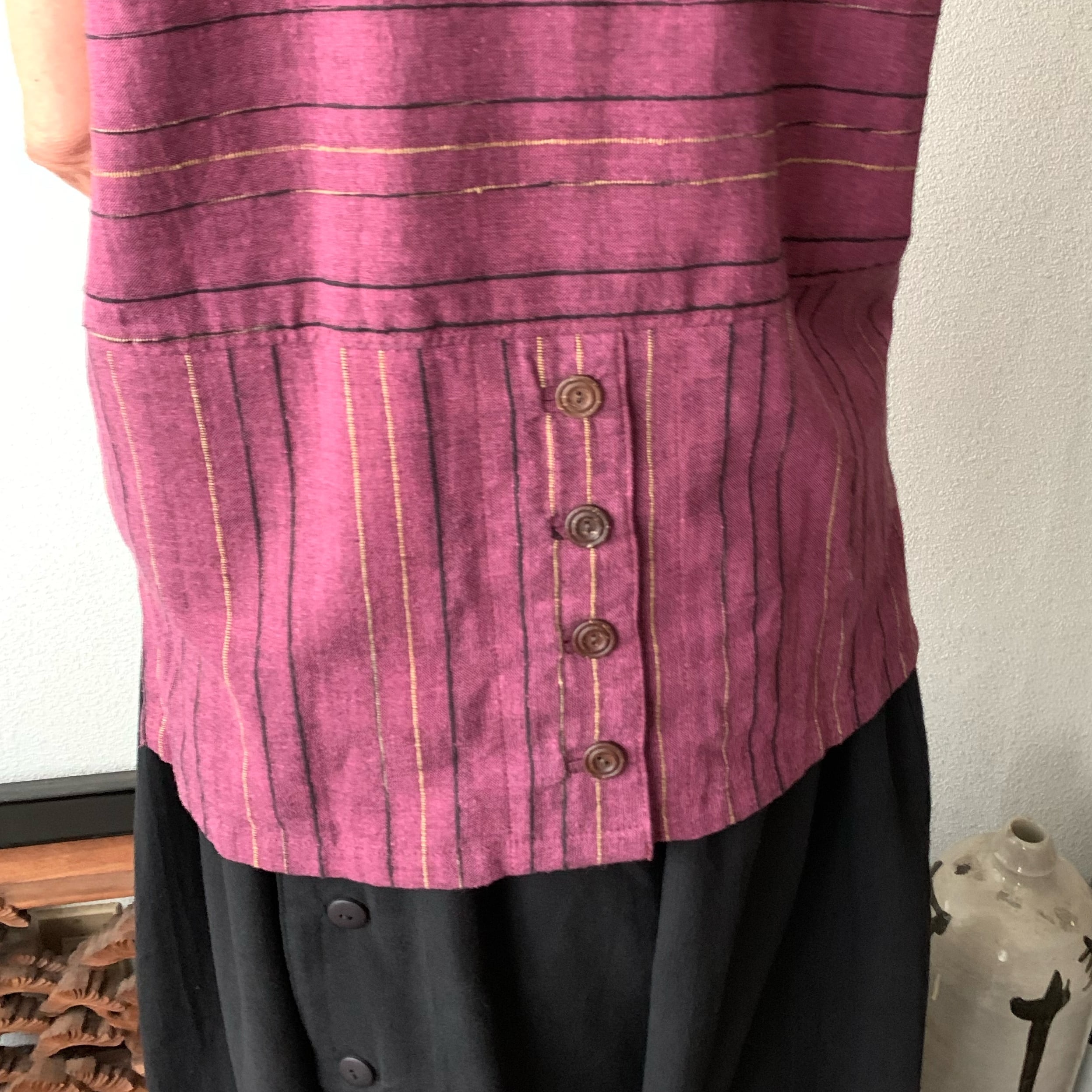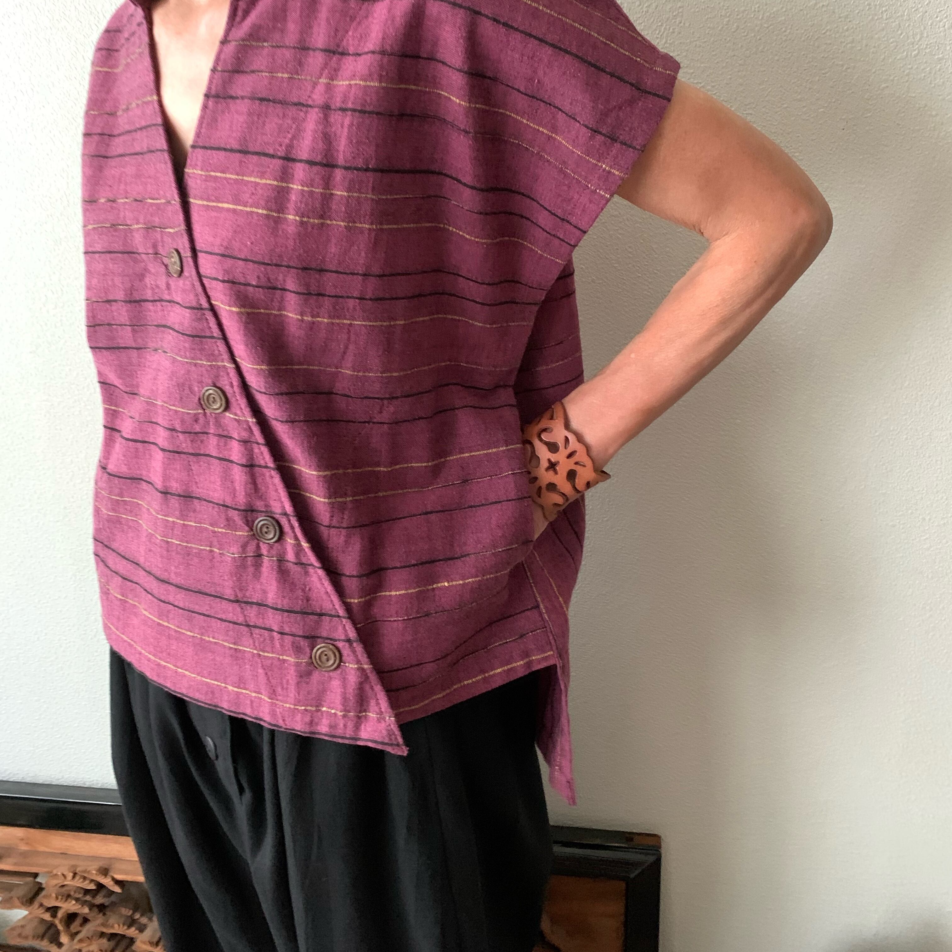シンプルにどんなものにでも合わせやすい手織り綿ブラウスベストですが、よくよく見るといつものようにディテールに凝っています。