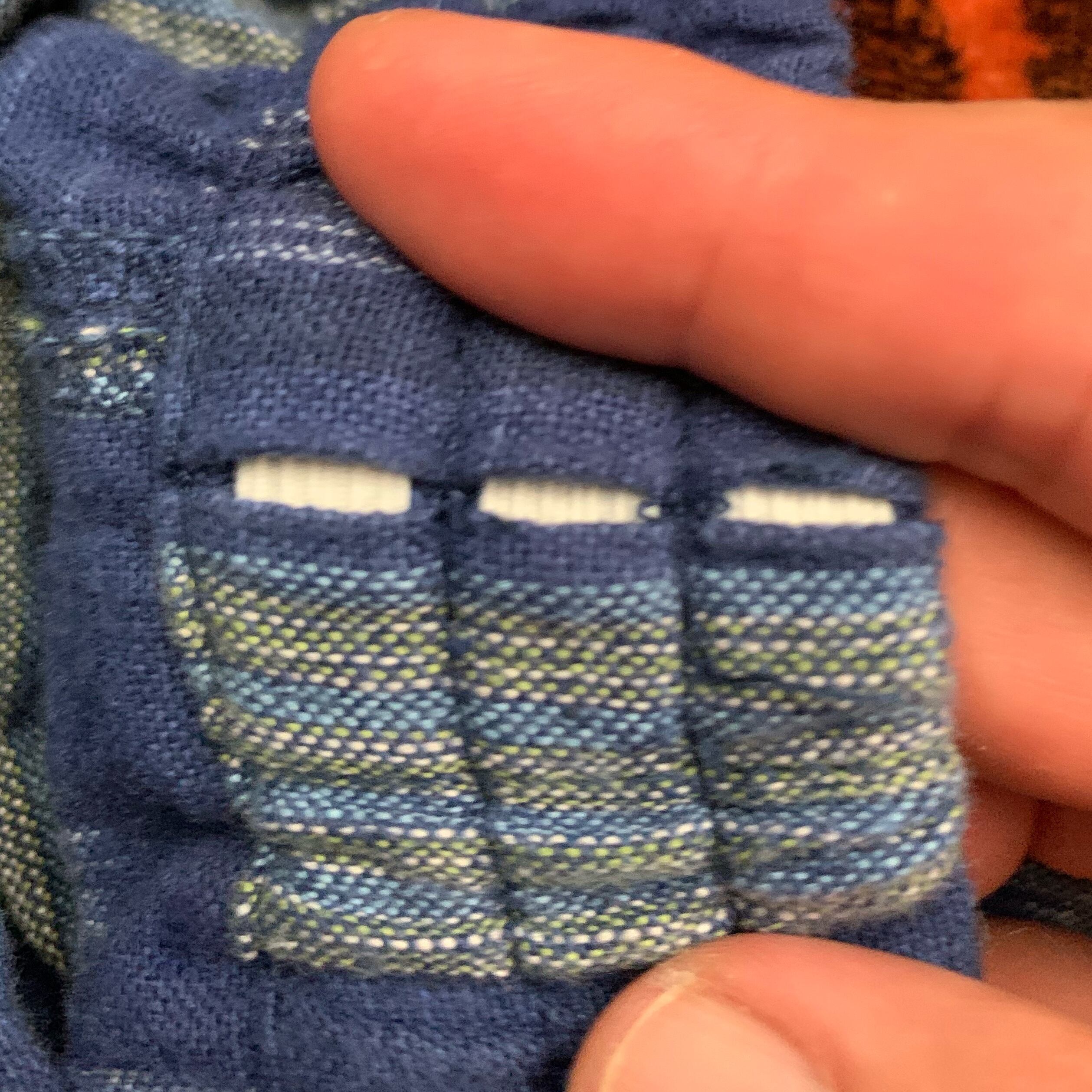 手織り綿の特性上、作品にはシボやネップ等(最後の写真右上部参照)が生地表面に現れる場合がございます。人の手を介して決して同じものが出来上がらない手織り綿の生地に、越天楽のデザインを吹き込んだ作品です。あらかじめご了解の上ご購入ください。なるべくいい状態でお届けいたしますが、気になる場合は細いかぎ針等で裏面から優しく引き抜いていただくと収まるものもあります。素朴で優しい風合いを楽しんでいただければ幸いです。
