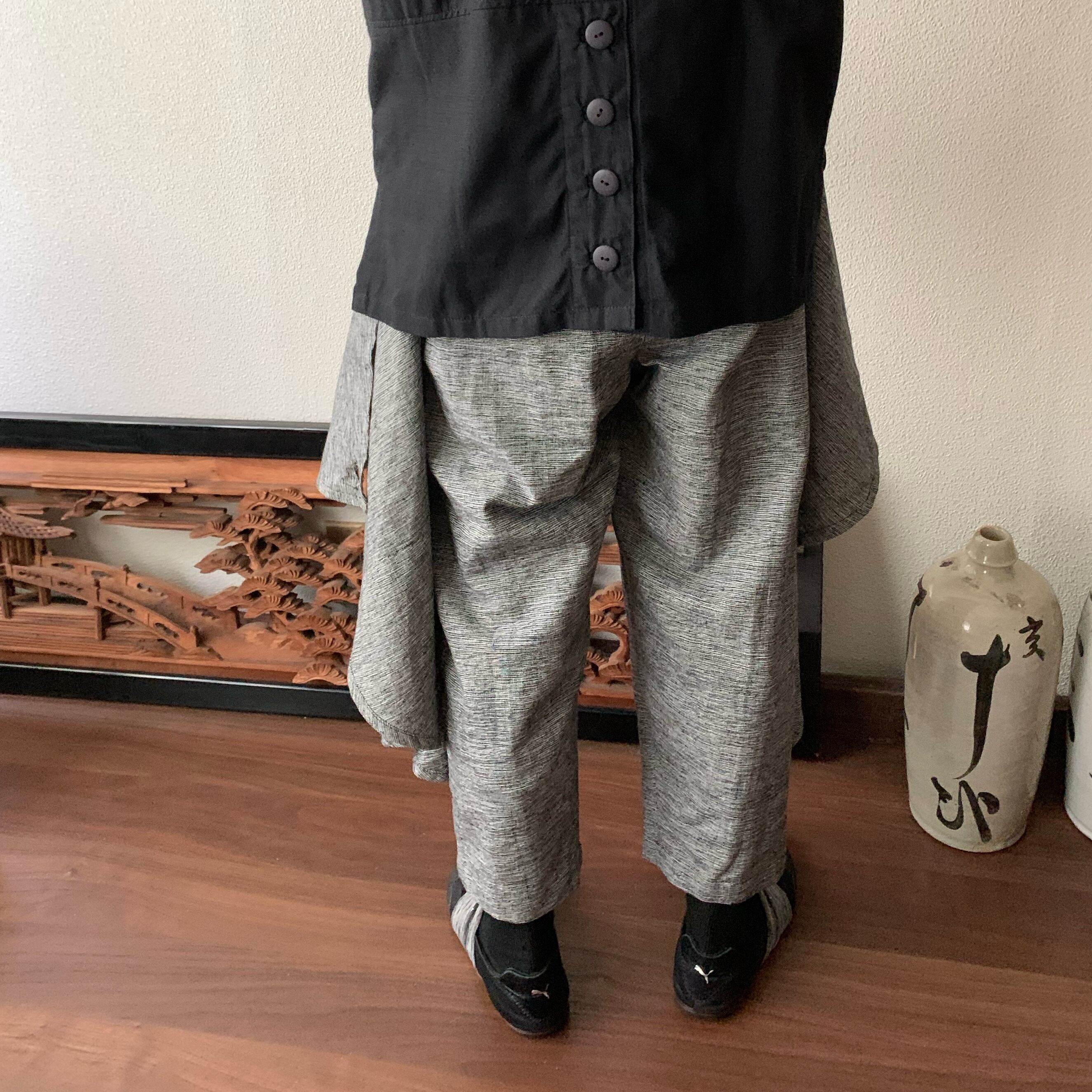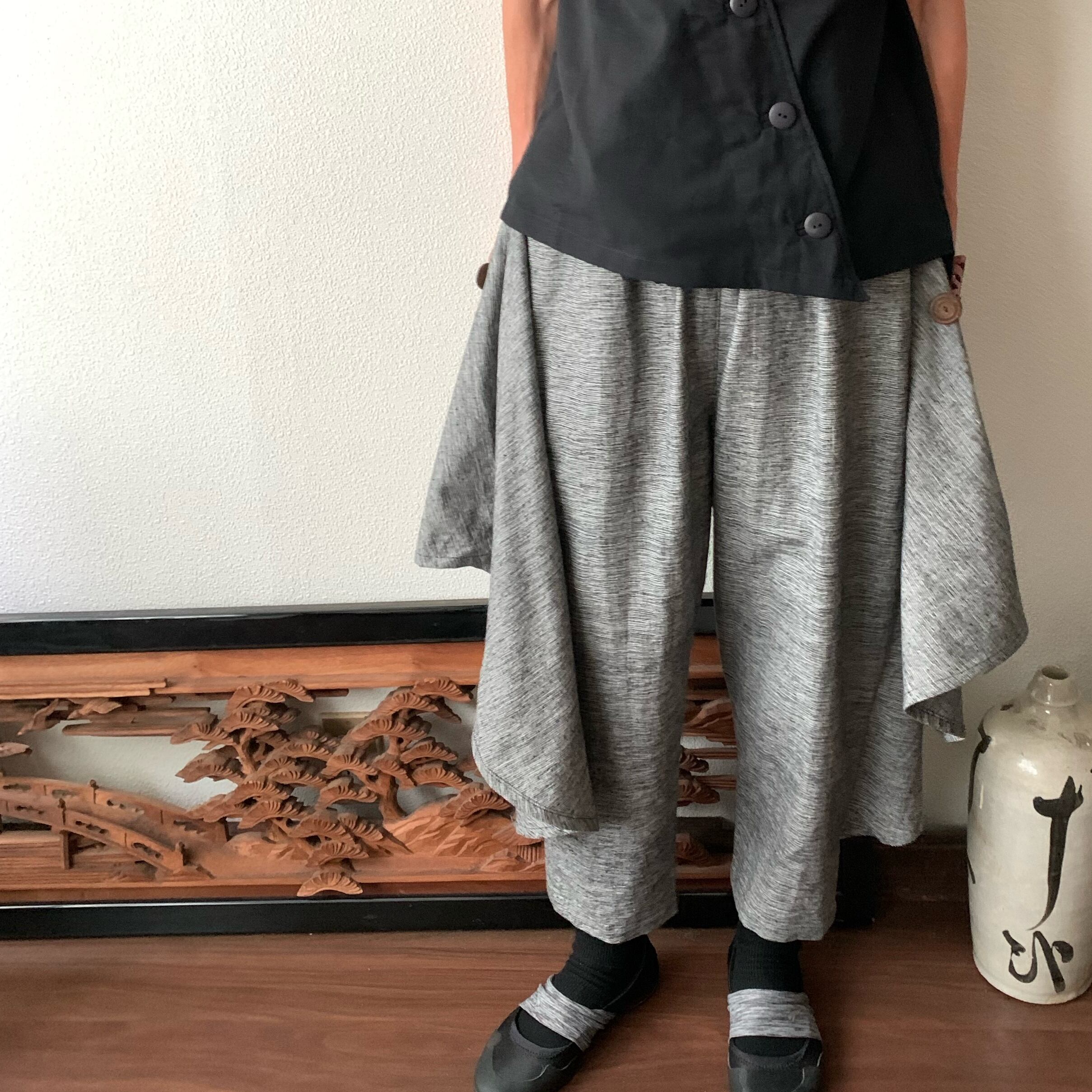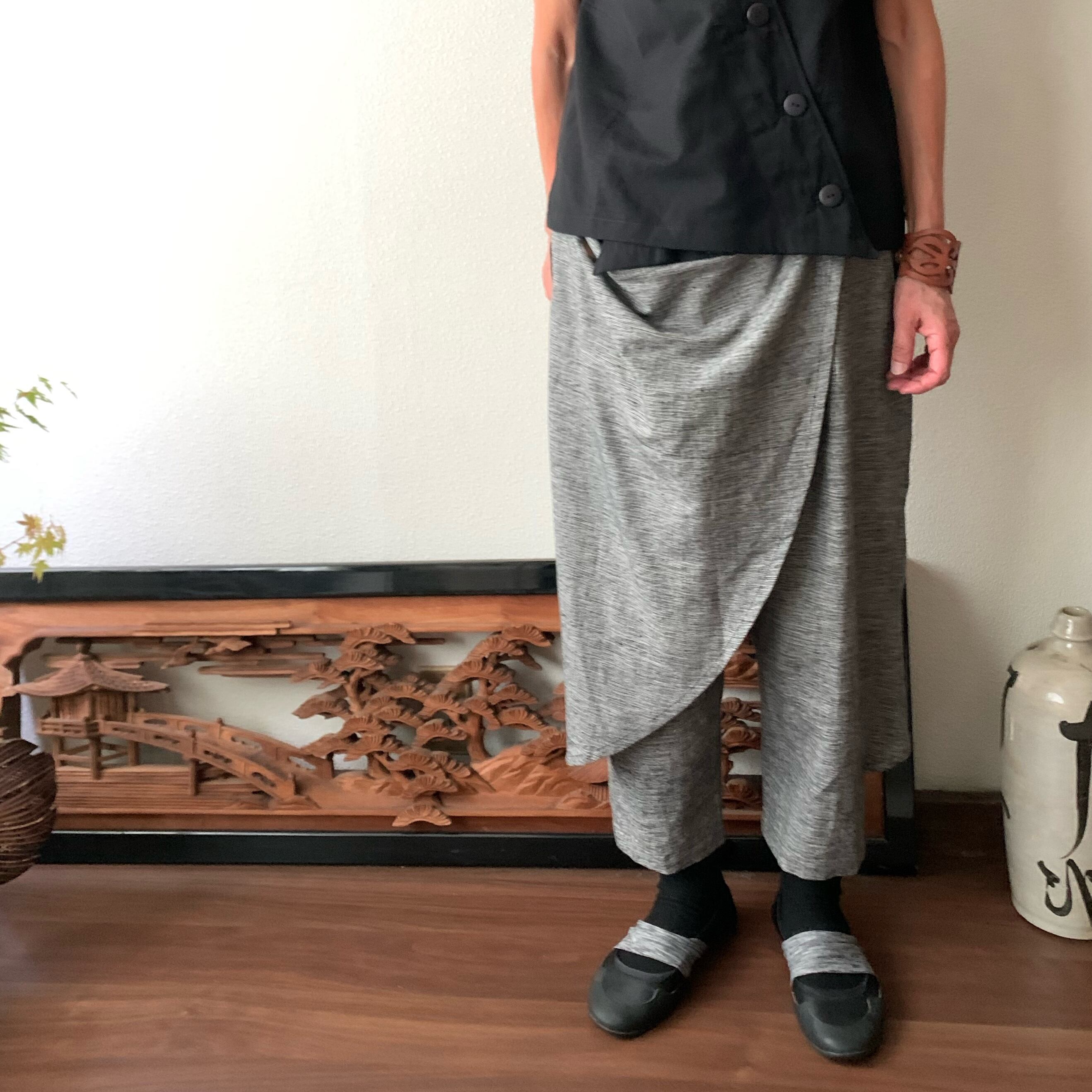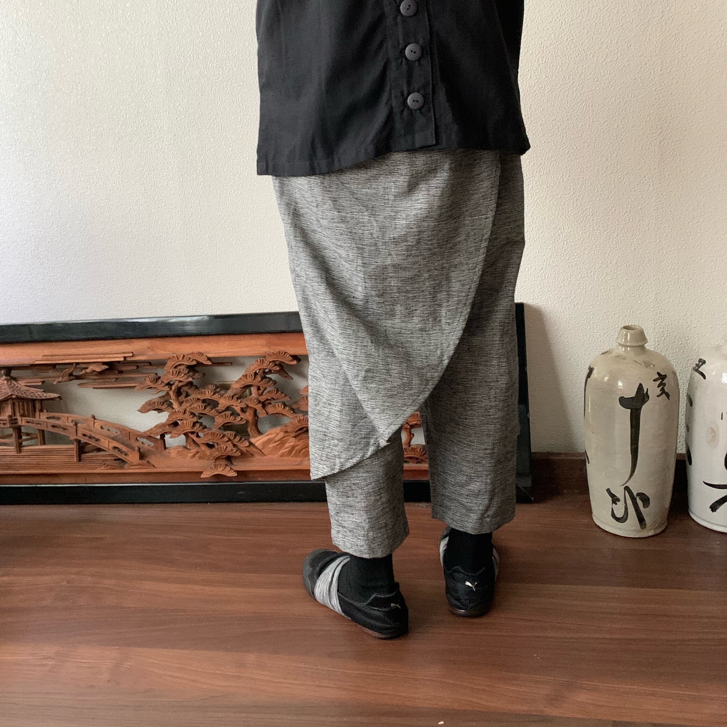 前後布スカート風手織り綿クロップドパンツ 前布の後ろ布の動きが楽しくガウチョ丈ですっきりパンツ グレイ絣