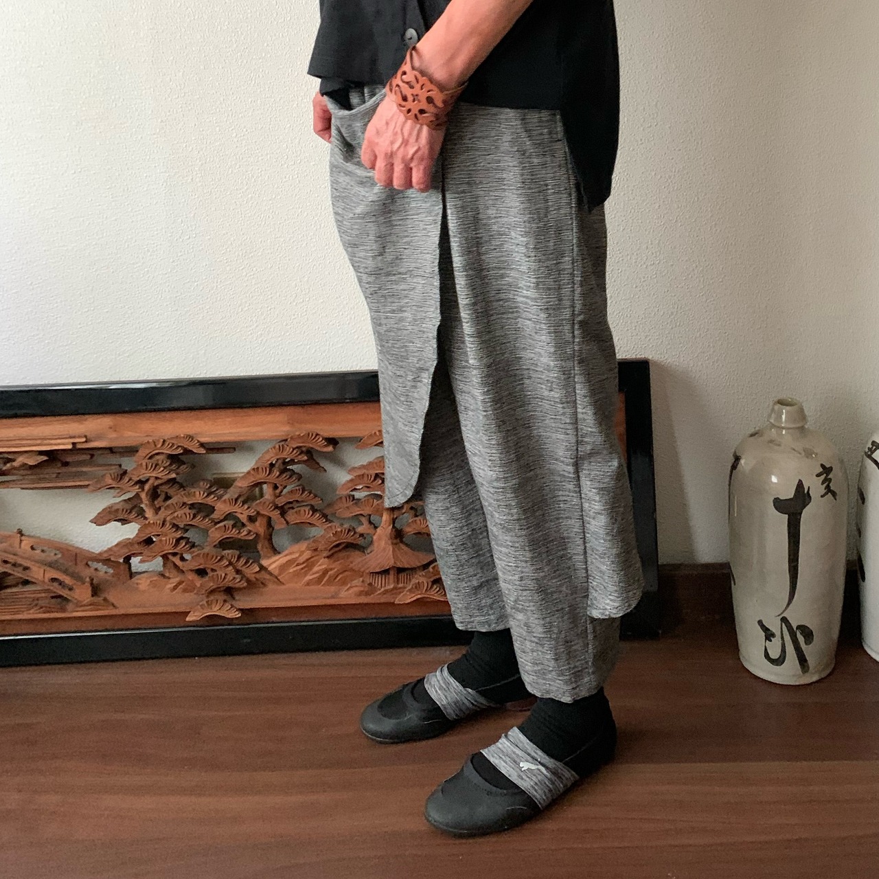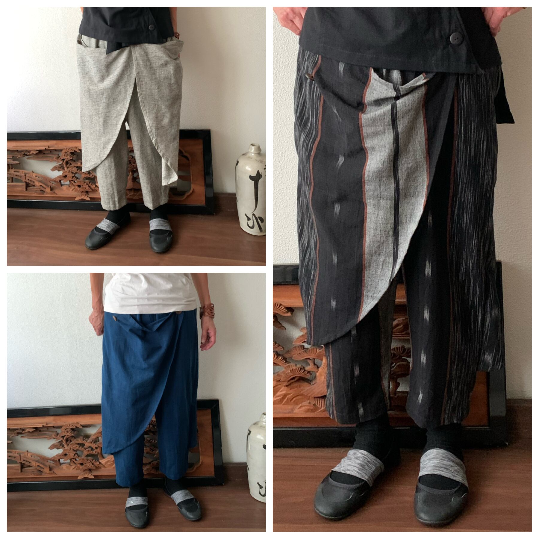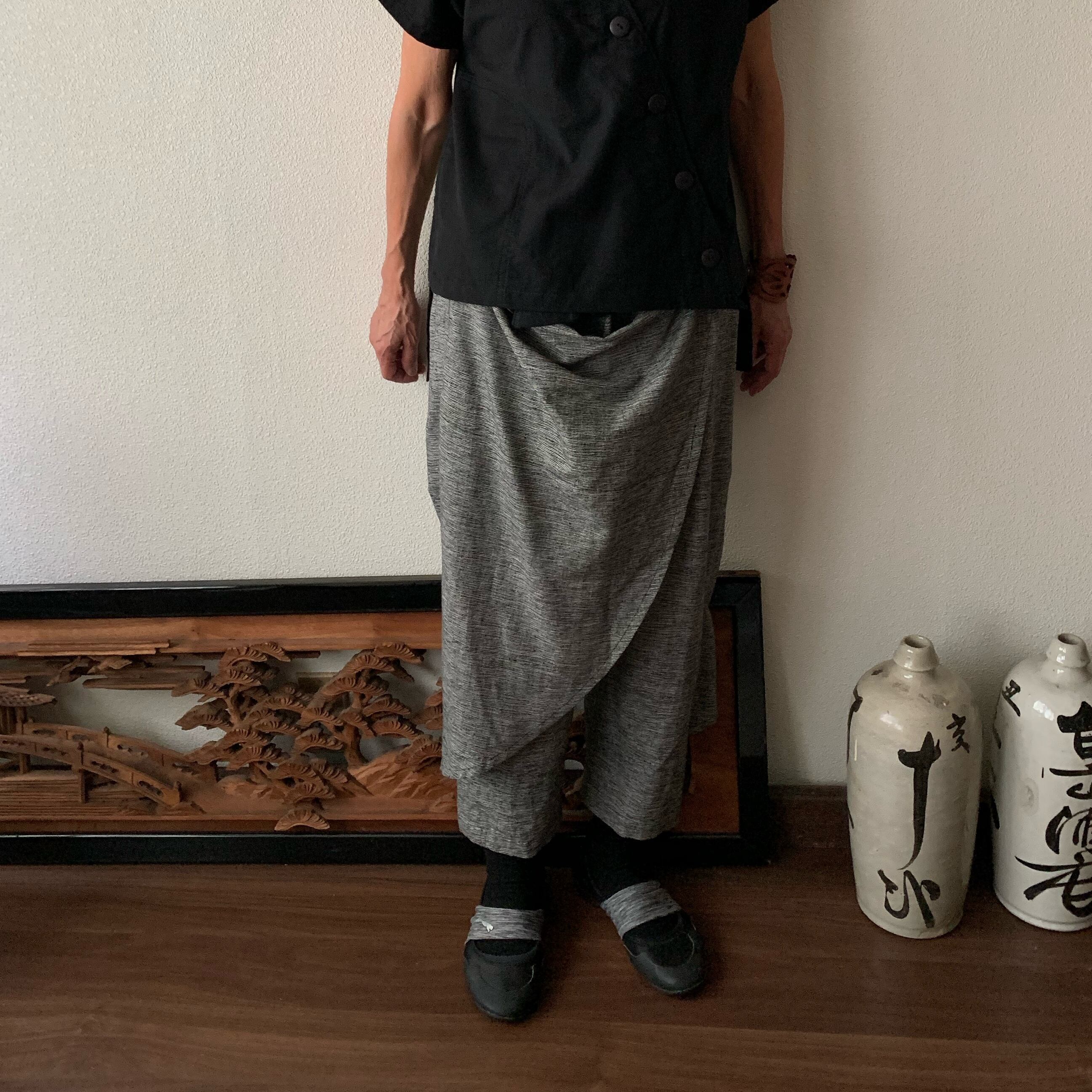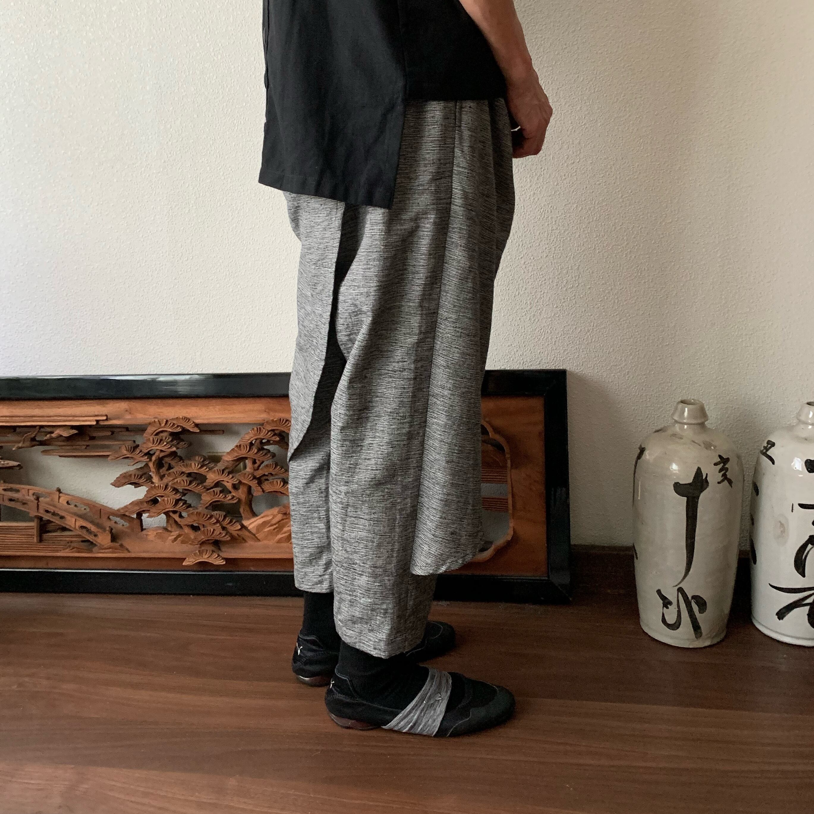 前後布スカート風手織り綿クロップドパンツ 前布の後ろ布の動きが楽しくガウチョ丈ですっきりパンツ グレイ絣