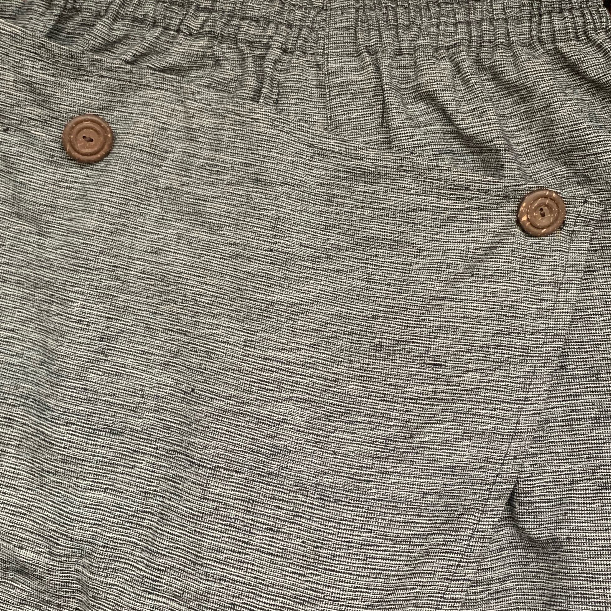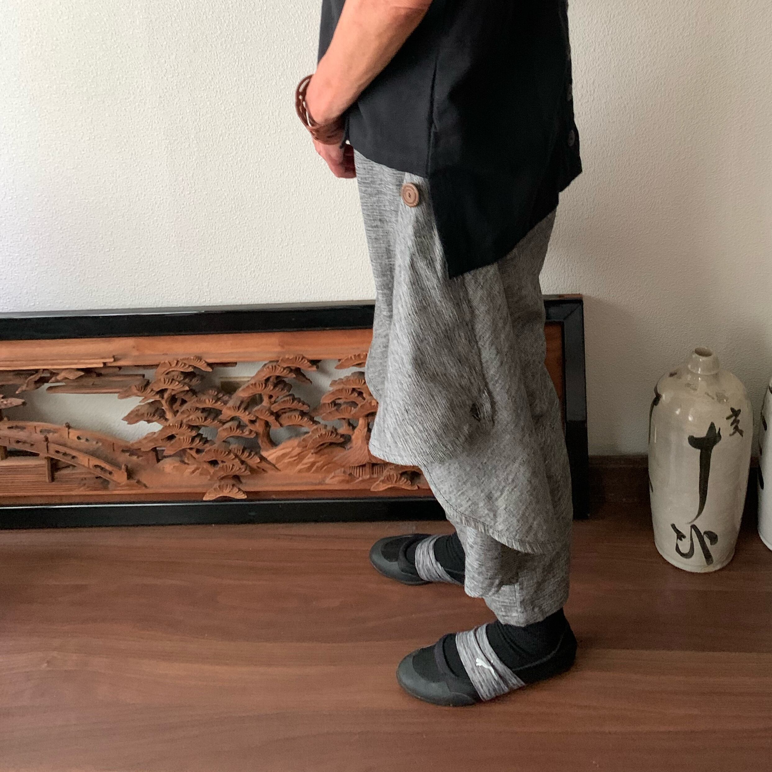 少し短めの丈で前と後ろにつけた布とボタンで、様々な動きが楽しめるクロップドパンツです。