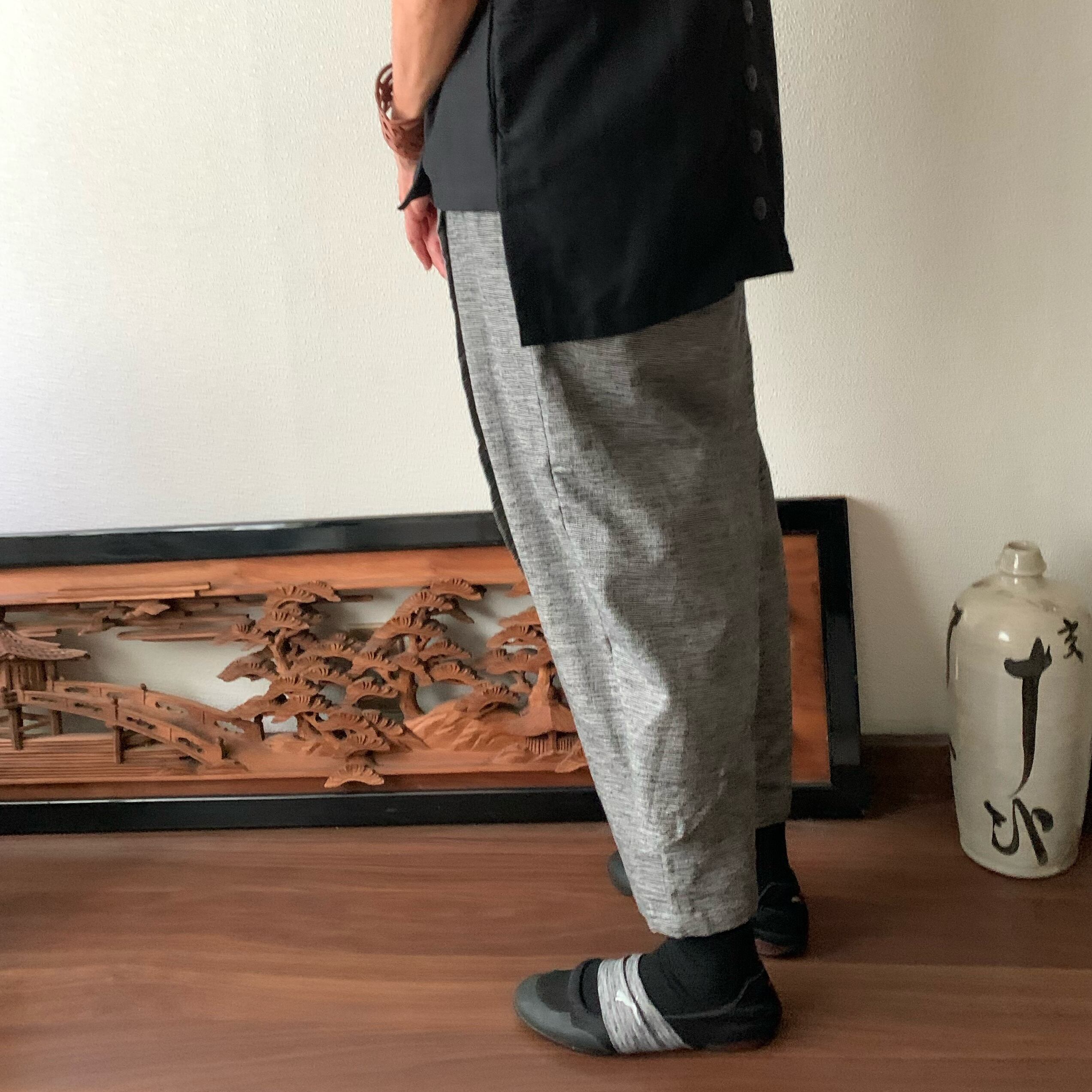 手織り綿なので、夏にサンダルと合わせても良し、秋冬にレギンスの上にはきブーツを合わせてもかっこいいです。