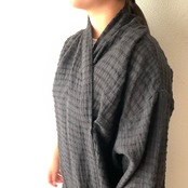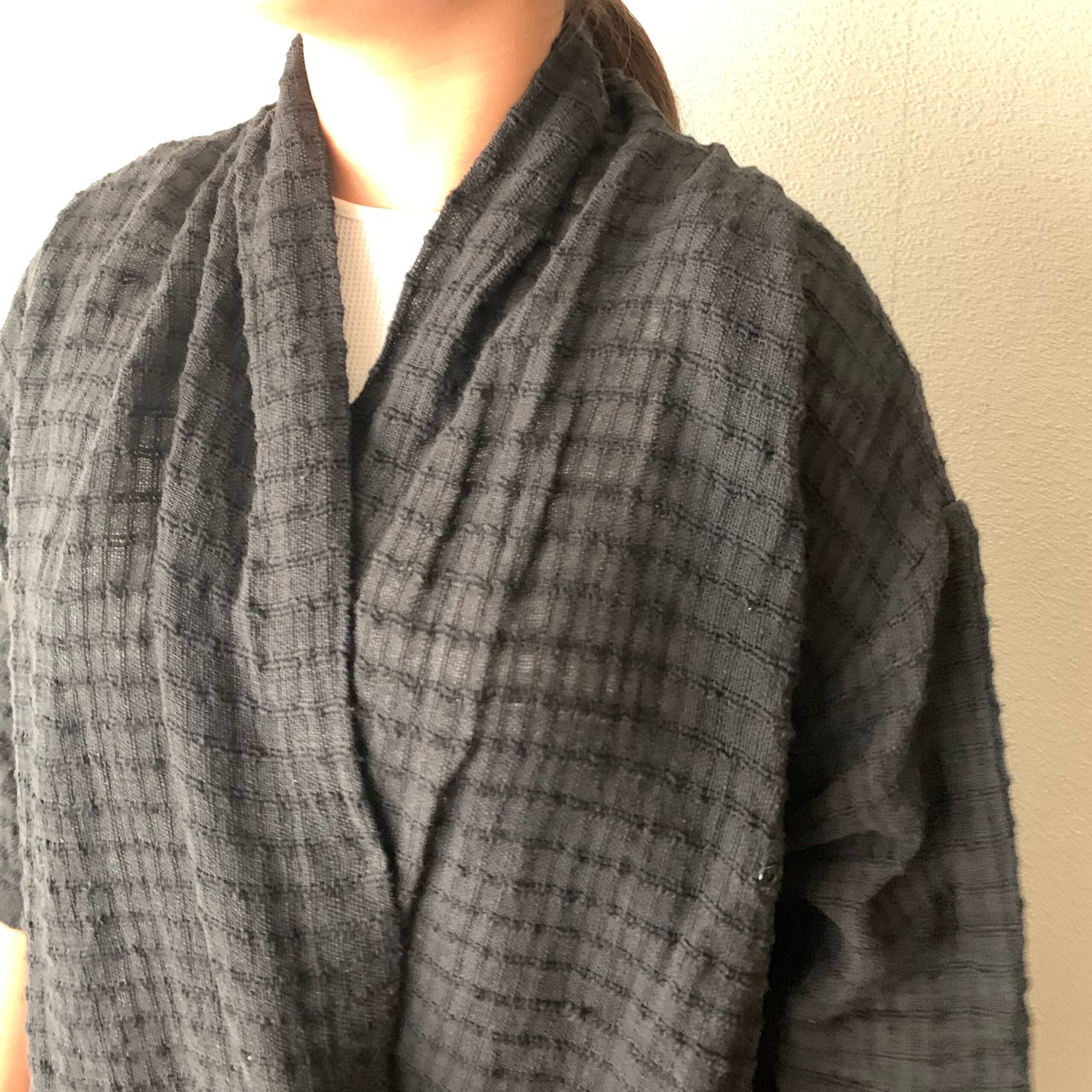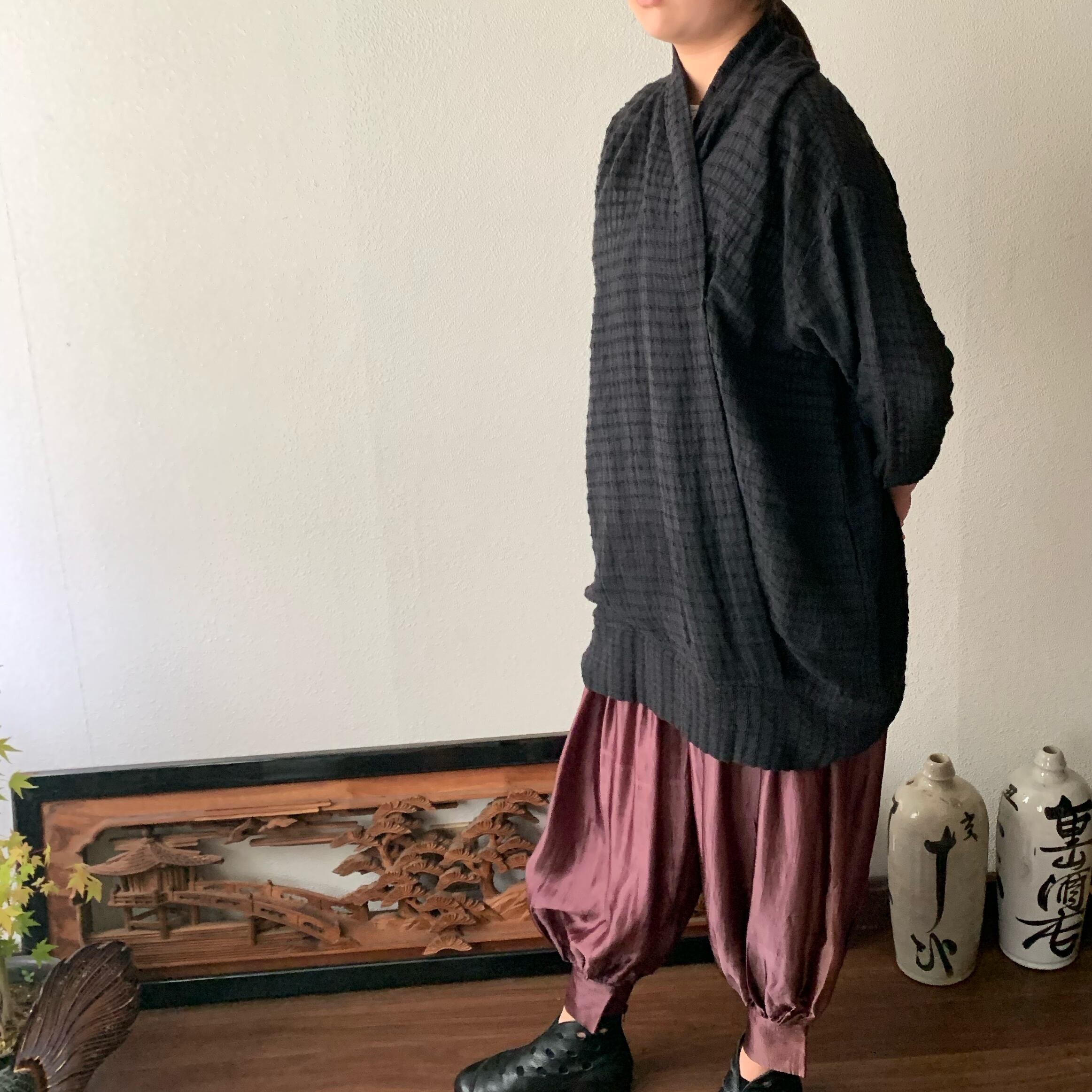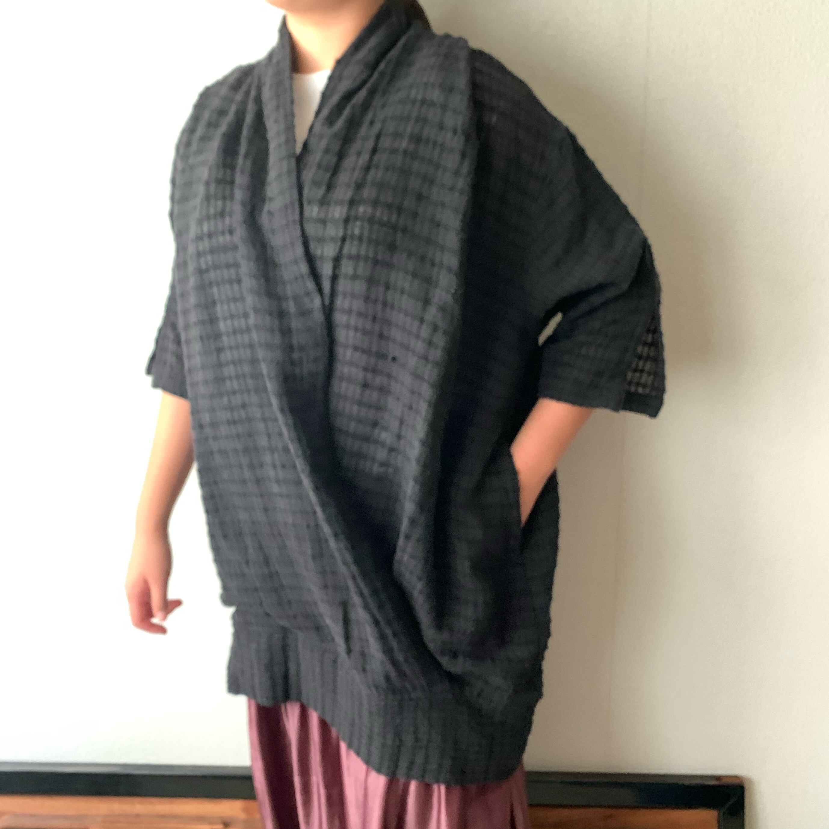 着物風のあわせのデザインでザクザクとした手織り綿の生地と相まってきれいなドレープラインになっています。