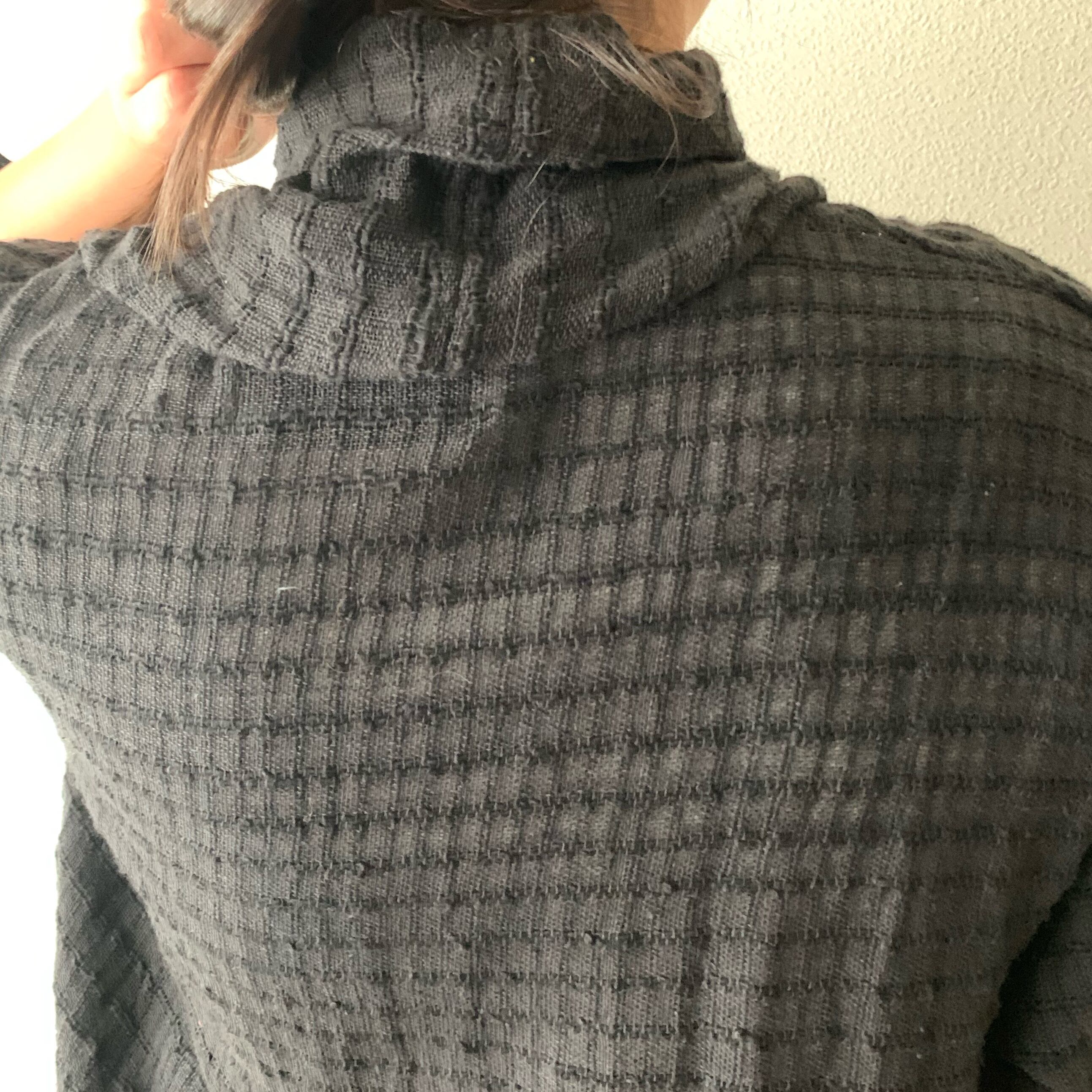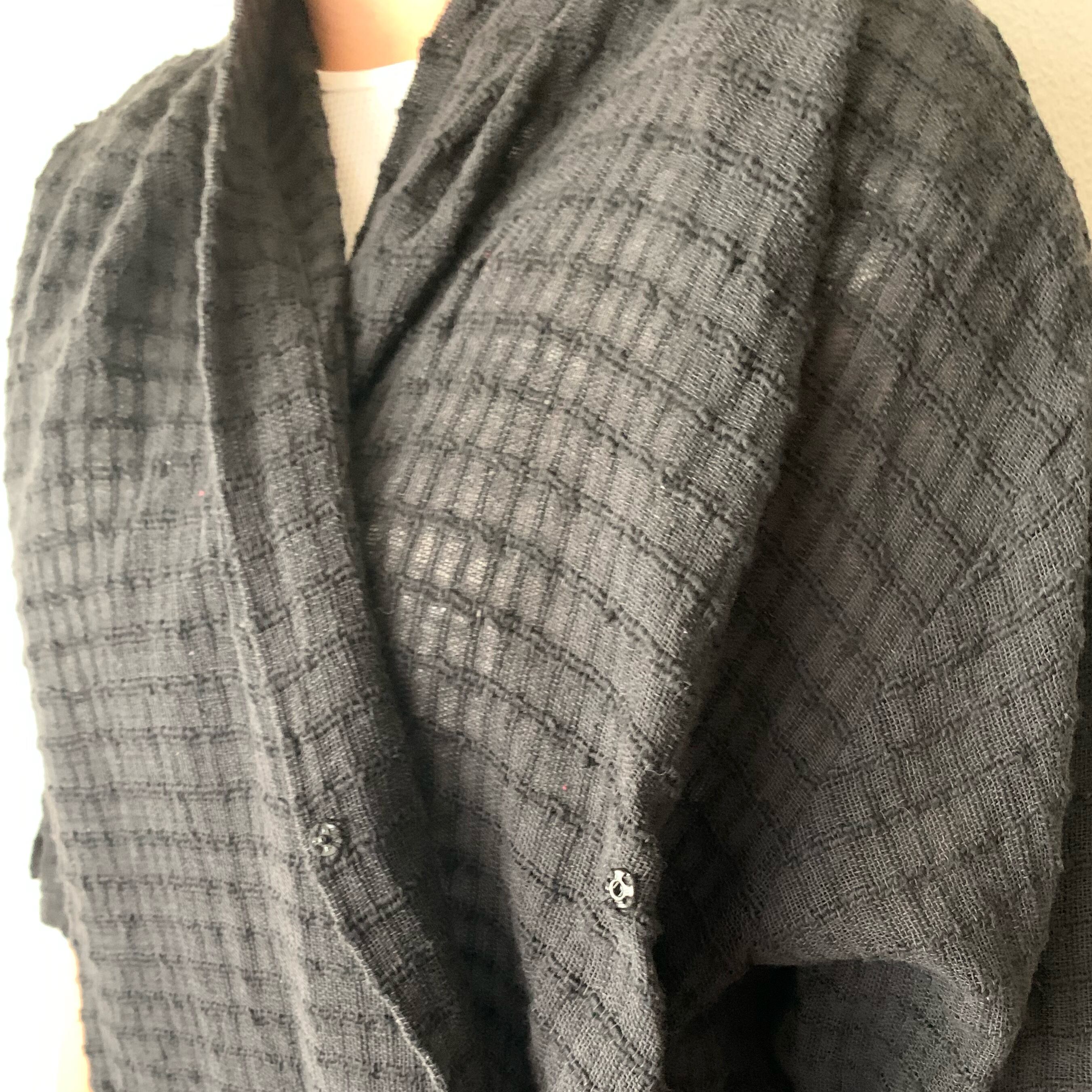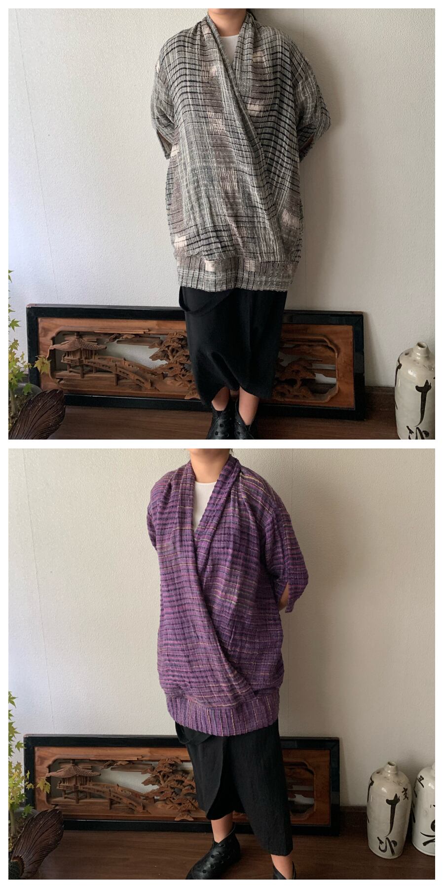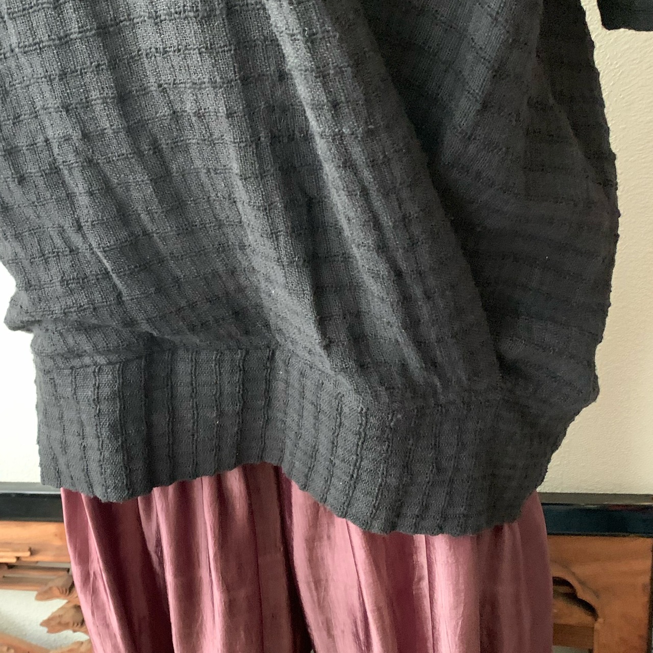 着物風のあわせのデザインでザクザクとした手織り綿の生地と相まってきれいなドレープラインになっています。