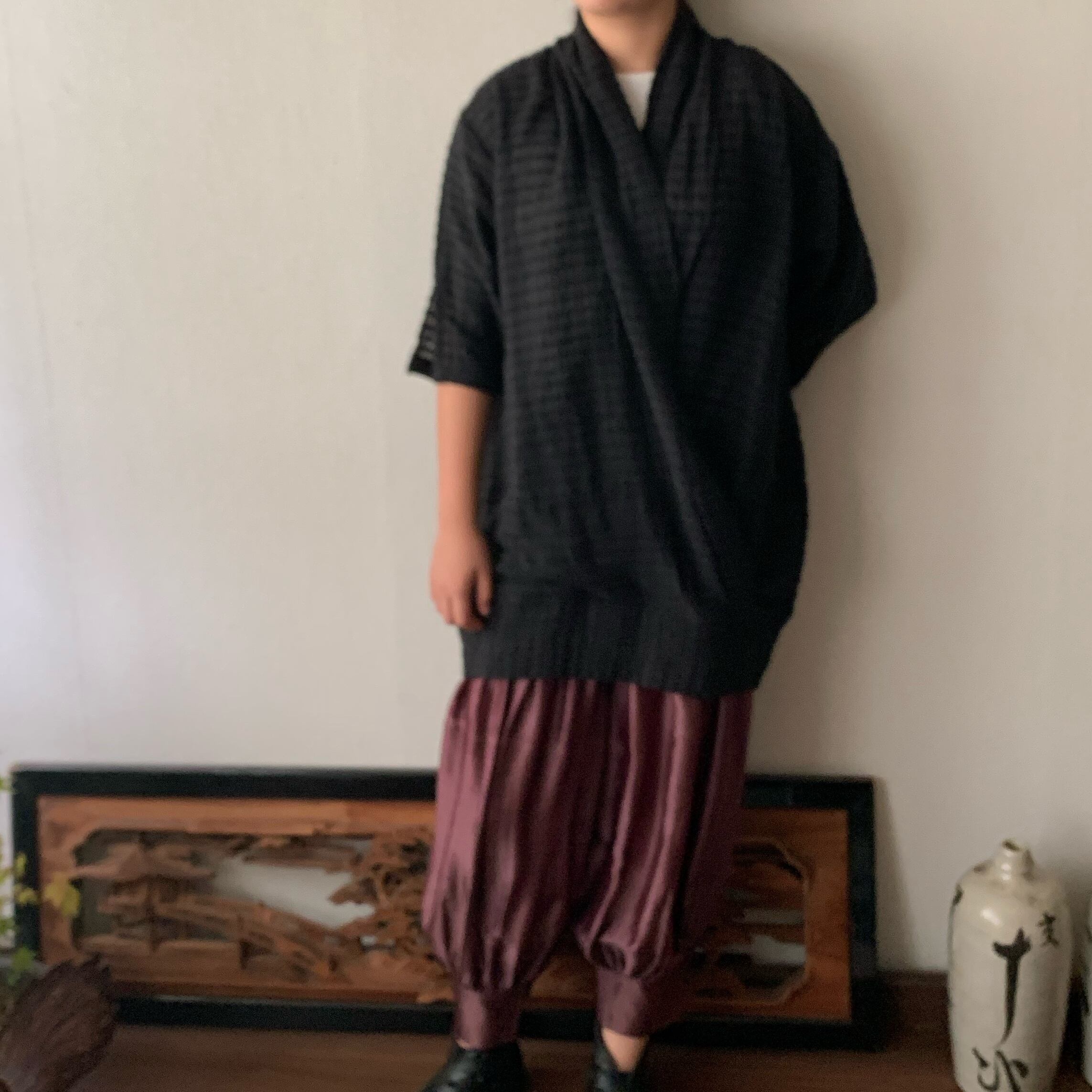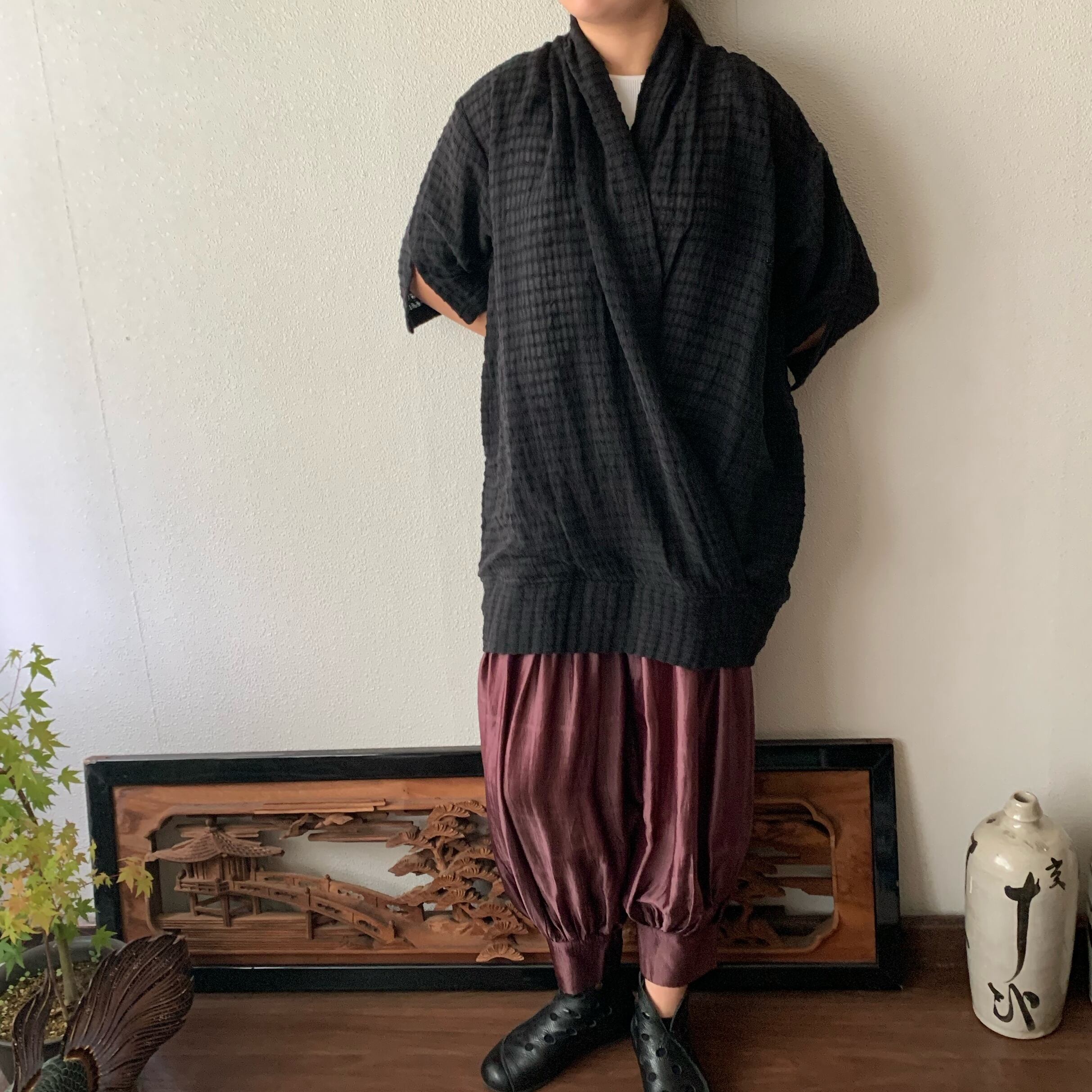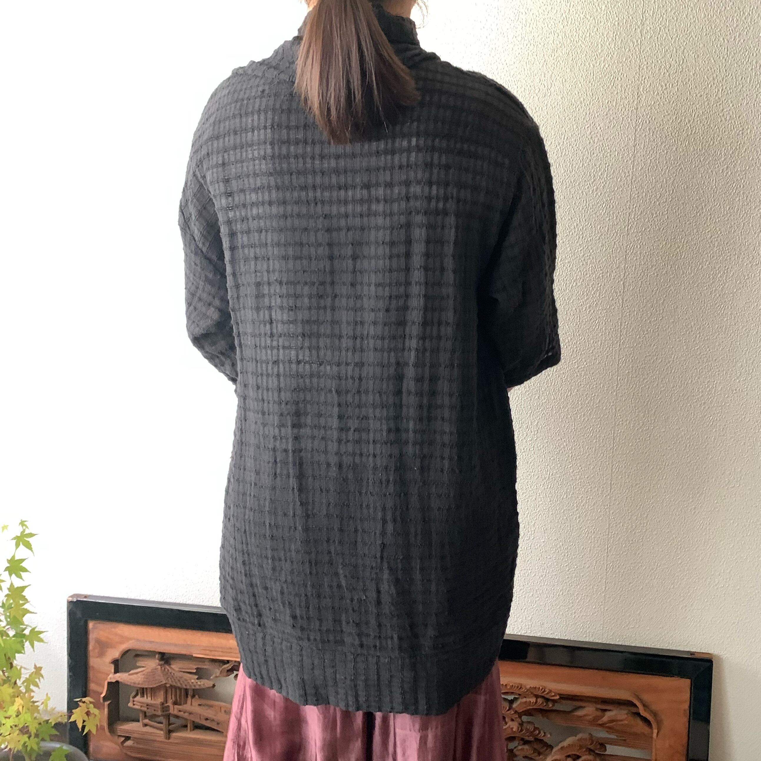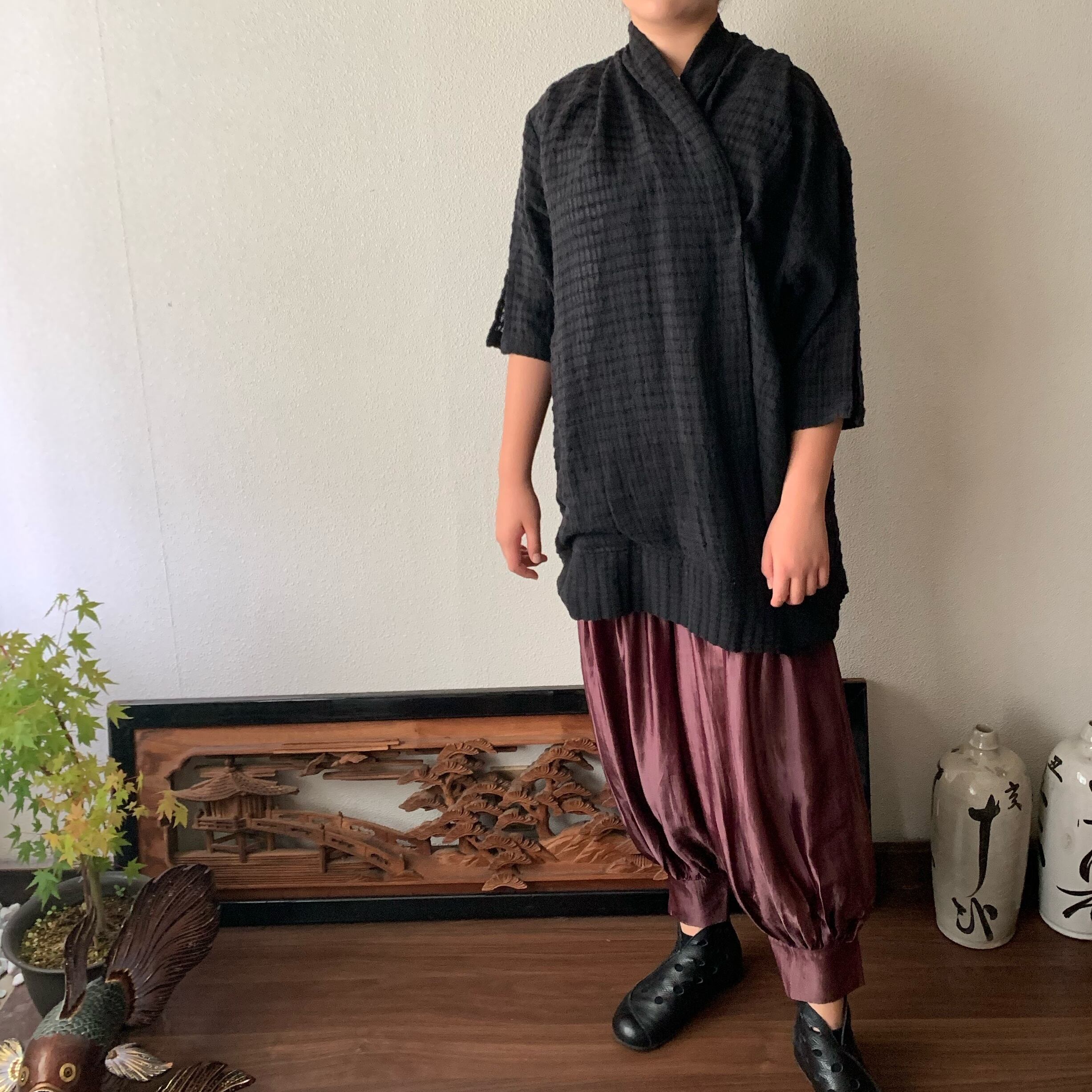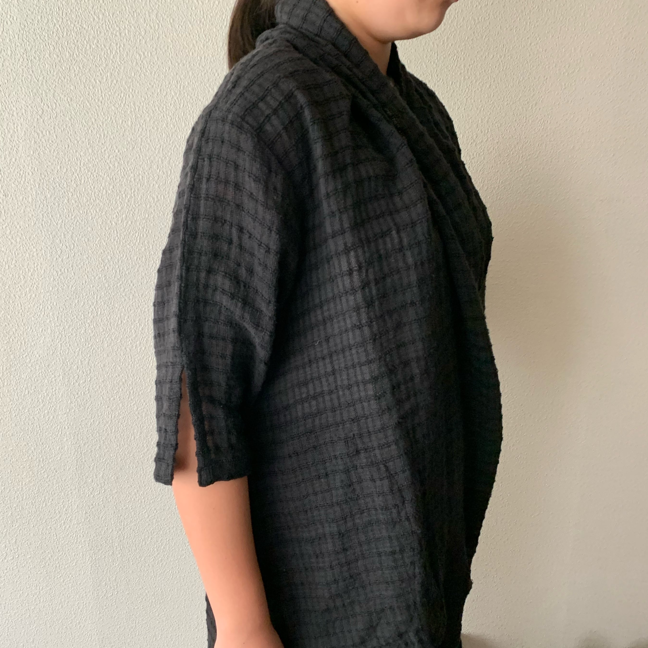 着物風あわせの手織り綿7分袖チュニックブラウス しっかり襟生地とドレープンできれいめライン 黒無地