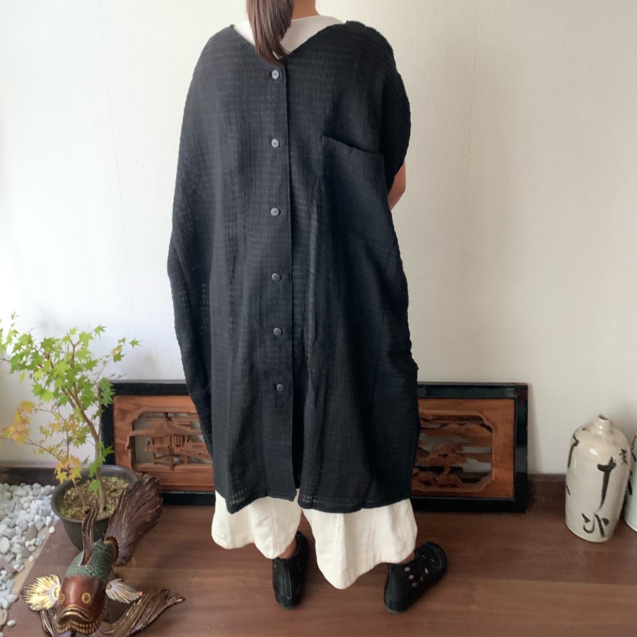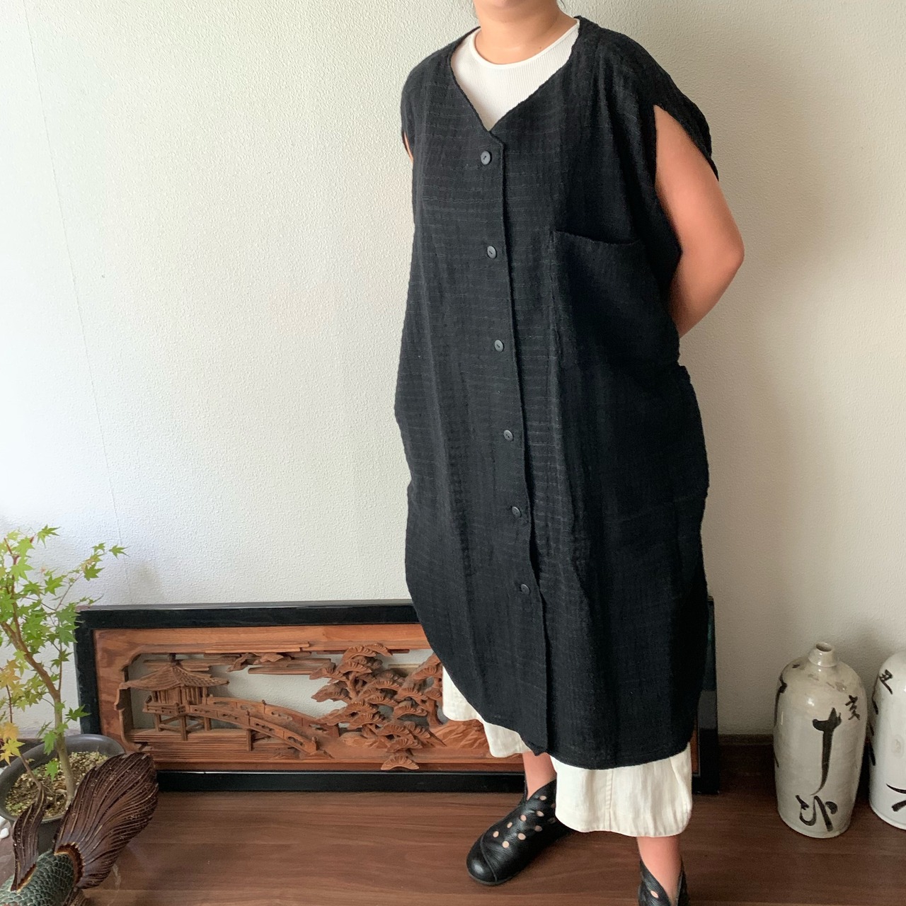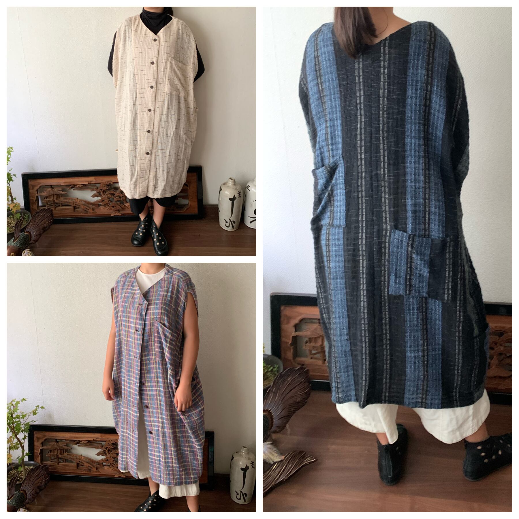 前にも後ろにもボタンをあけても閉じても楽しめる一着で何通りにも着ることのできる手織り綿のワンピースです。