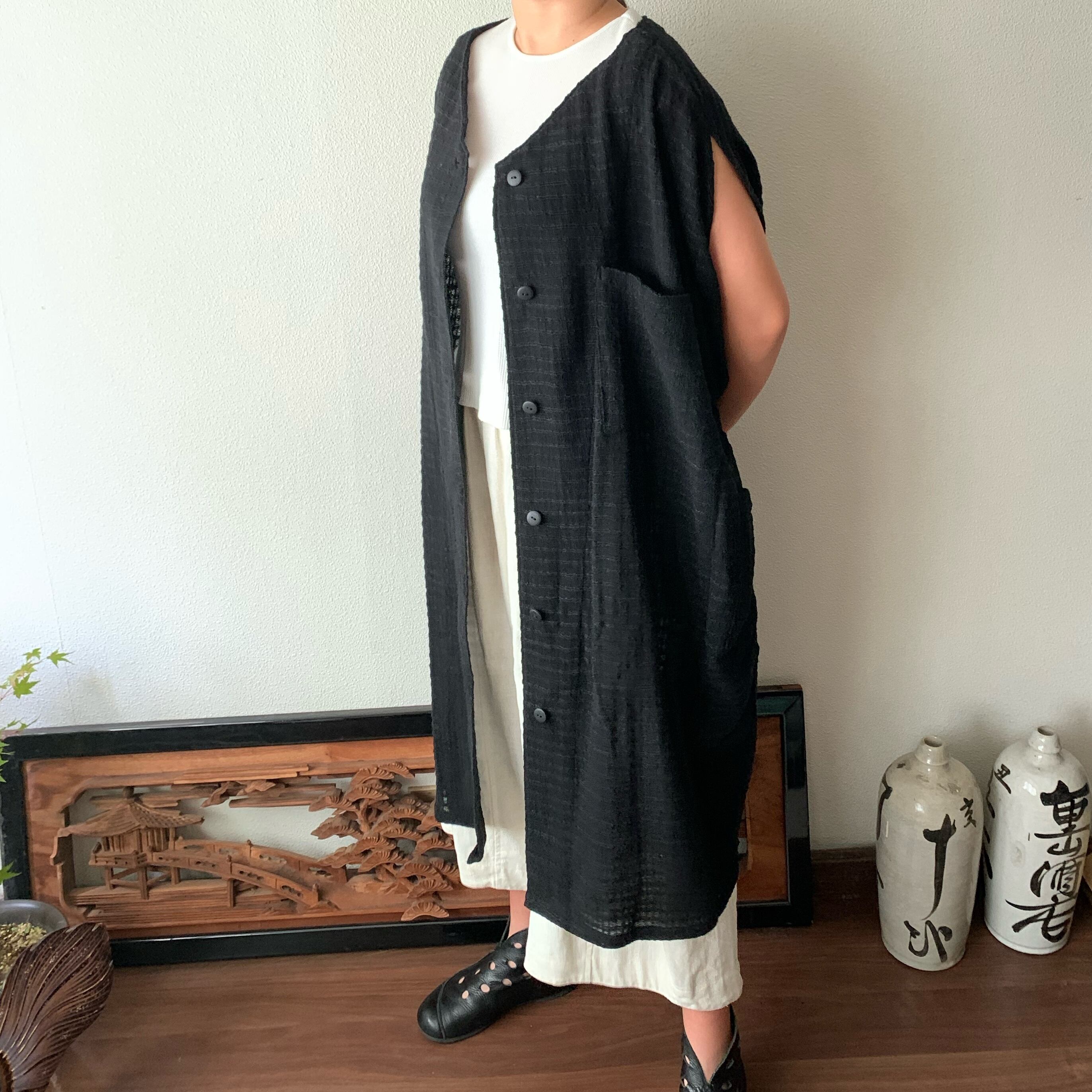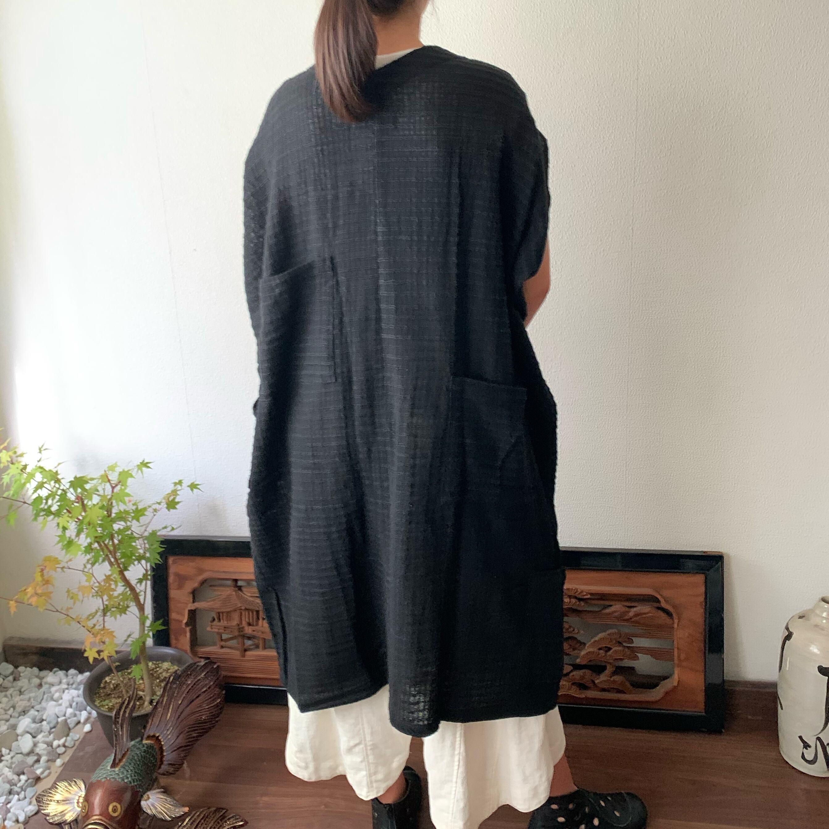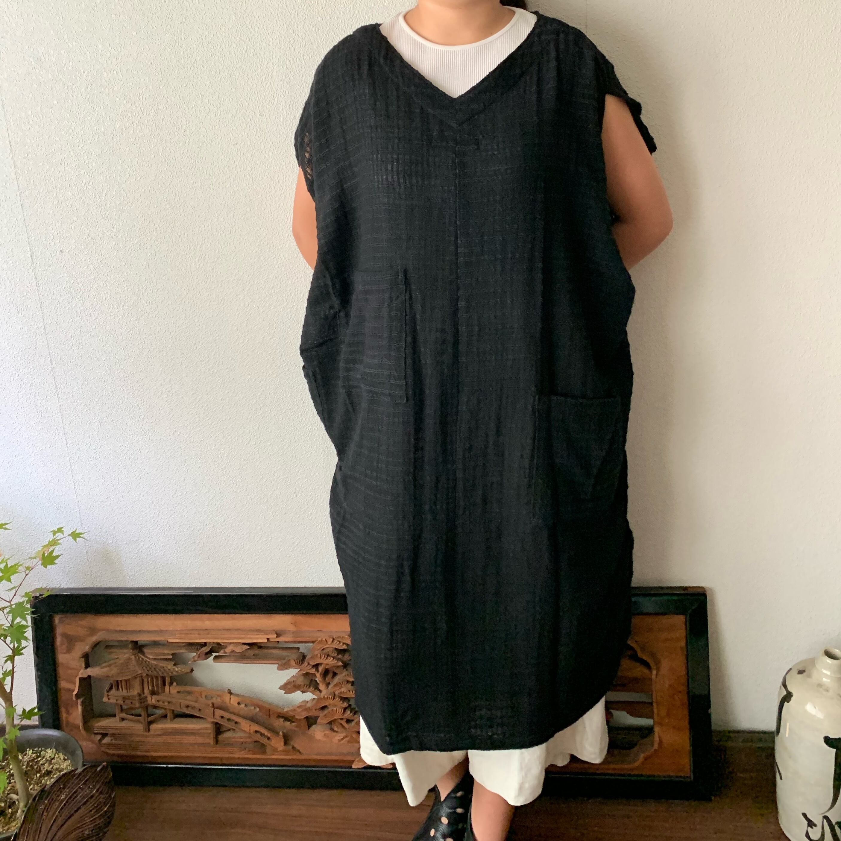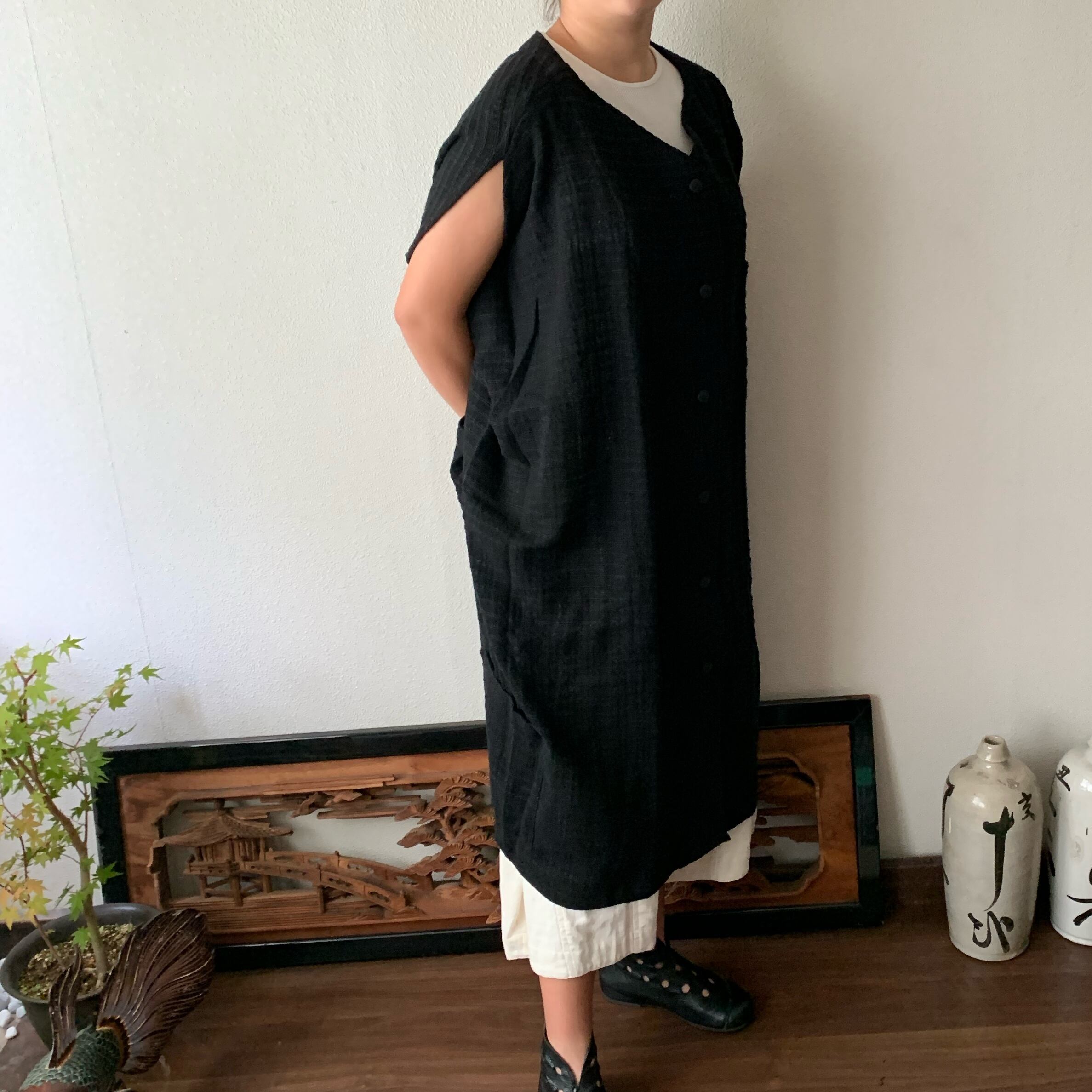 前にも後ろにもボタンをあけても閉じても楽しめる一着で何通りにも着ることのできる手織り綿のワンピースです。