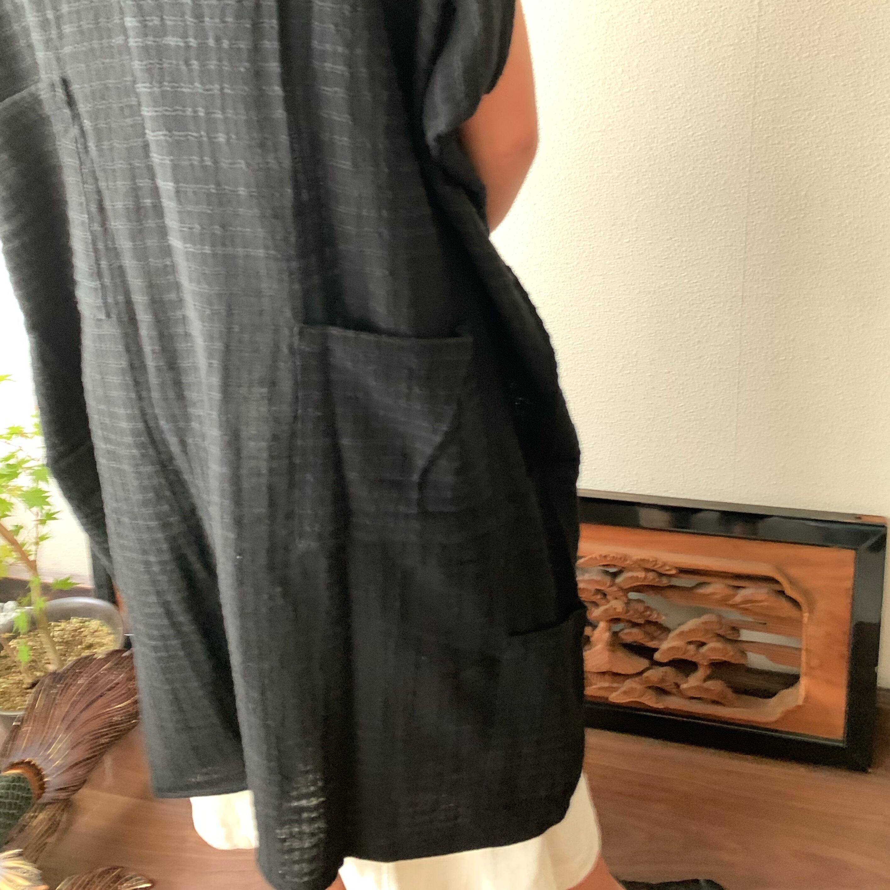 嵐山のお店では普段はボタン前で羽織ってきて、ちょっとしたお出掛けにはボタンを後ろにして前に大きめのネックレス等で着こなされるお客様が多かったように思います。