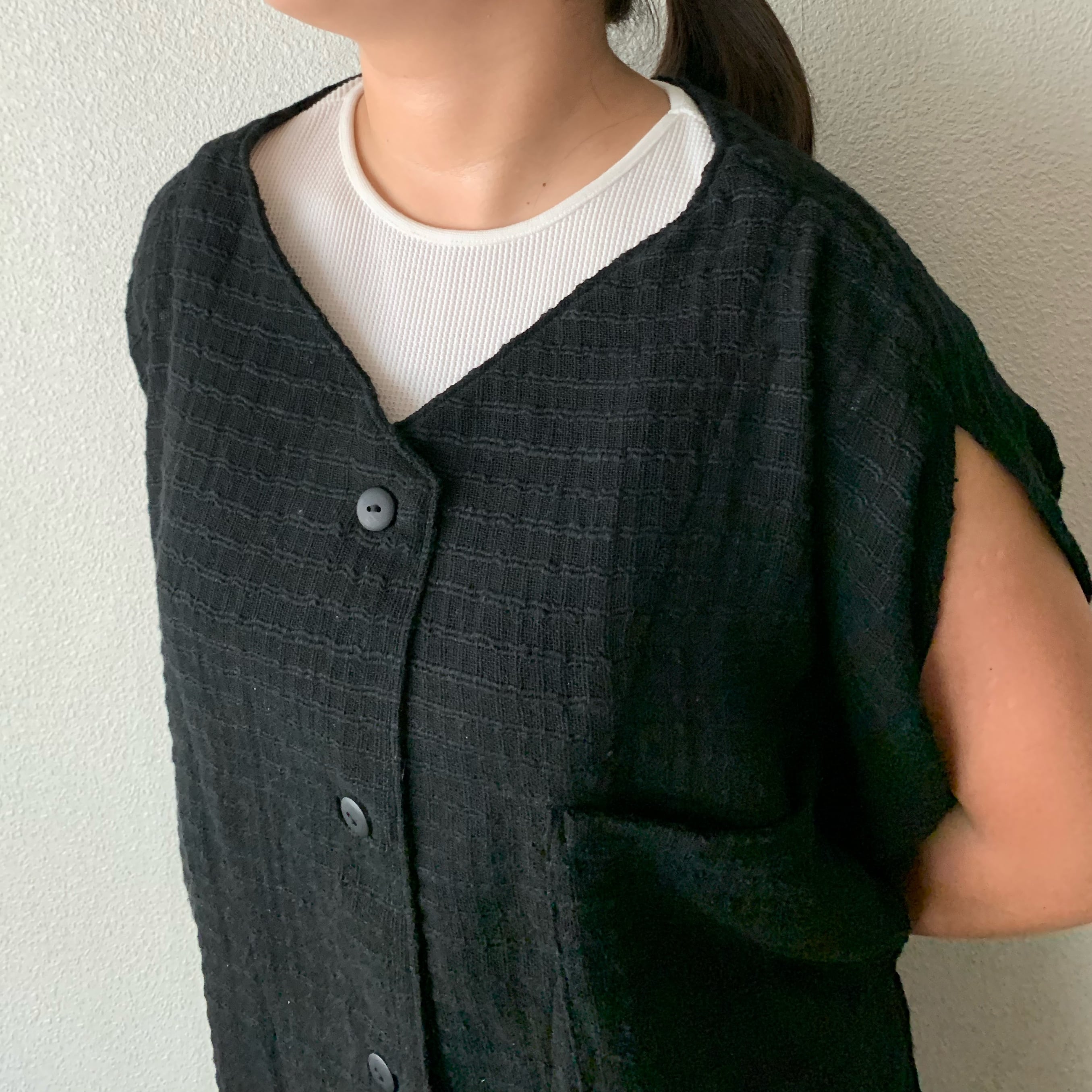 いつもは切れ込みポケットが定番の越天楽のデザインですが、前後に着て楽しめるようにアシンメトリーのパッチポケットを付けています。