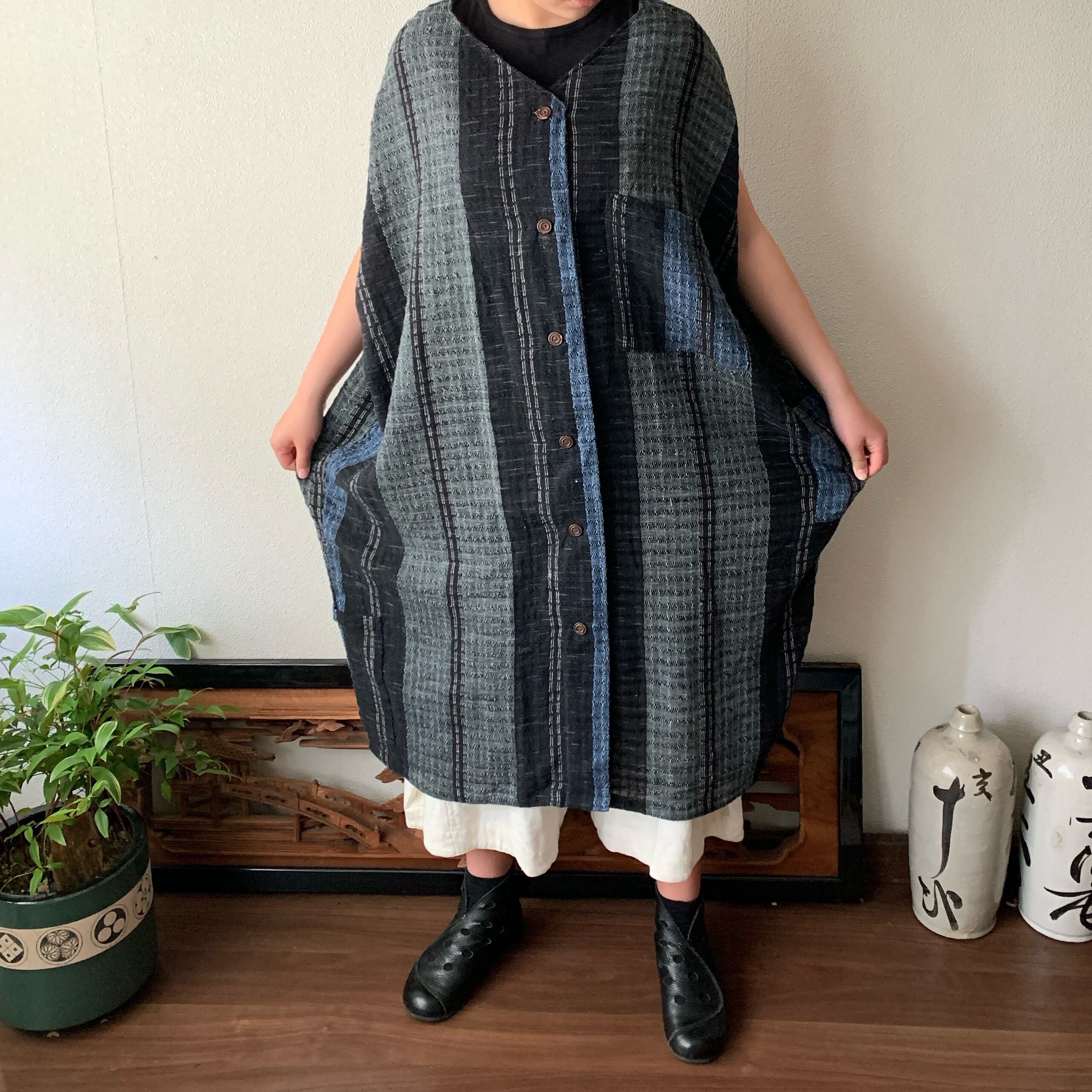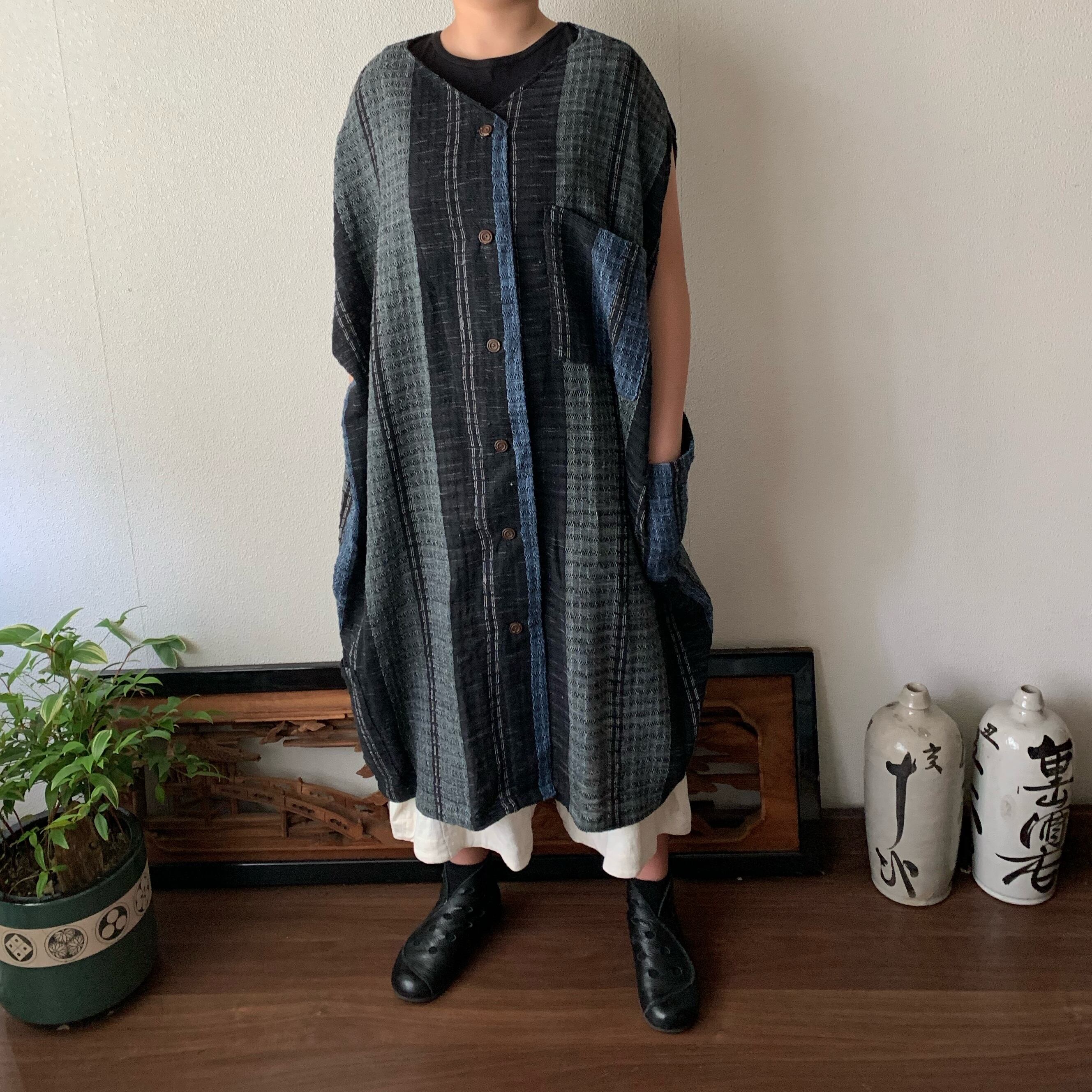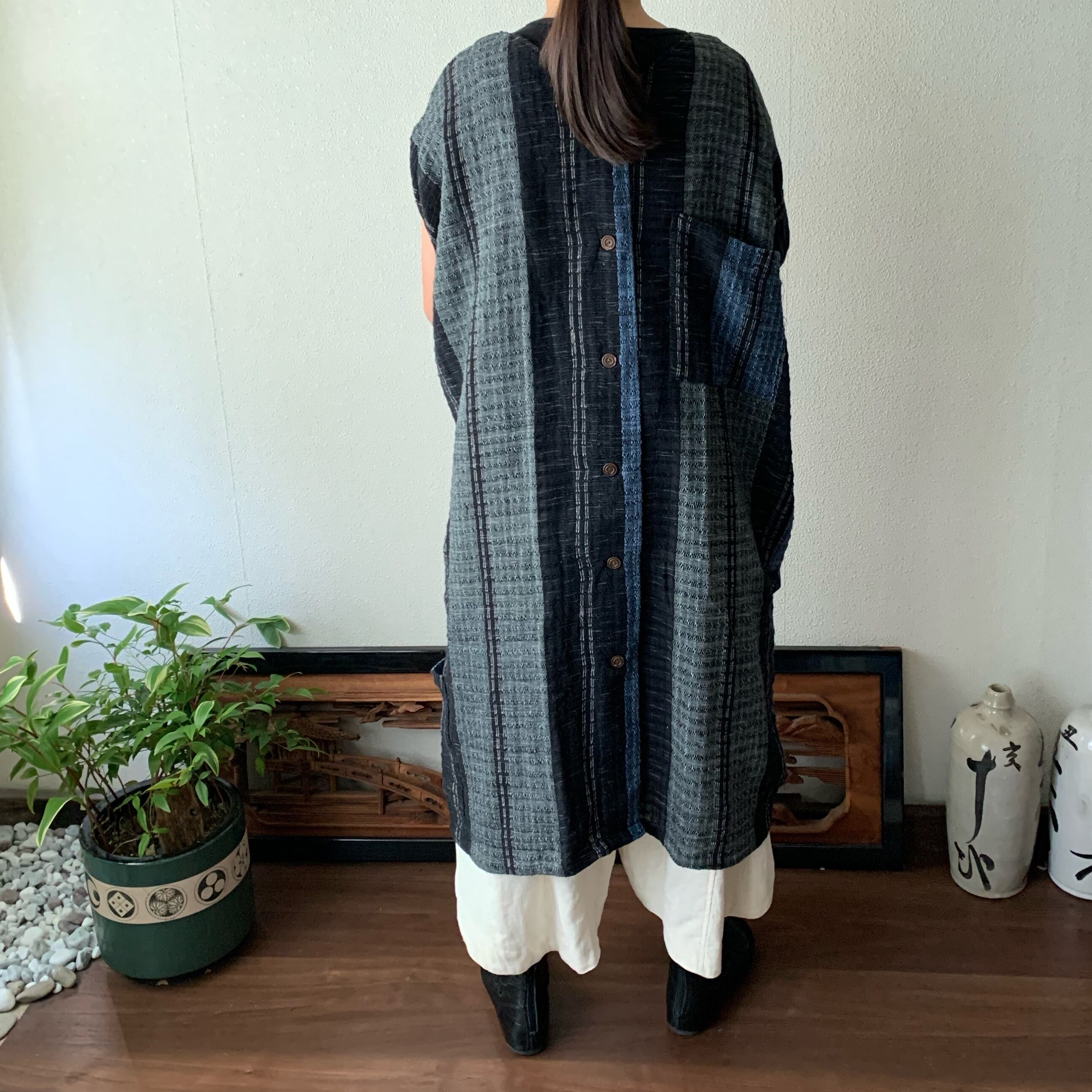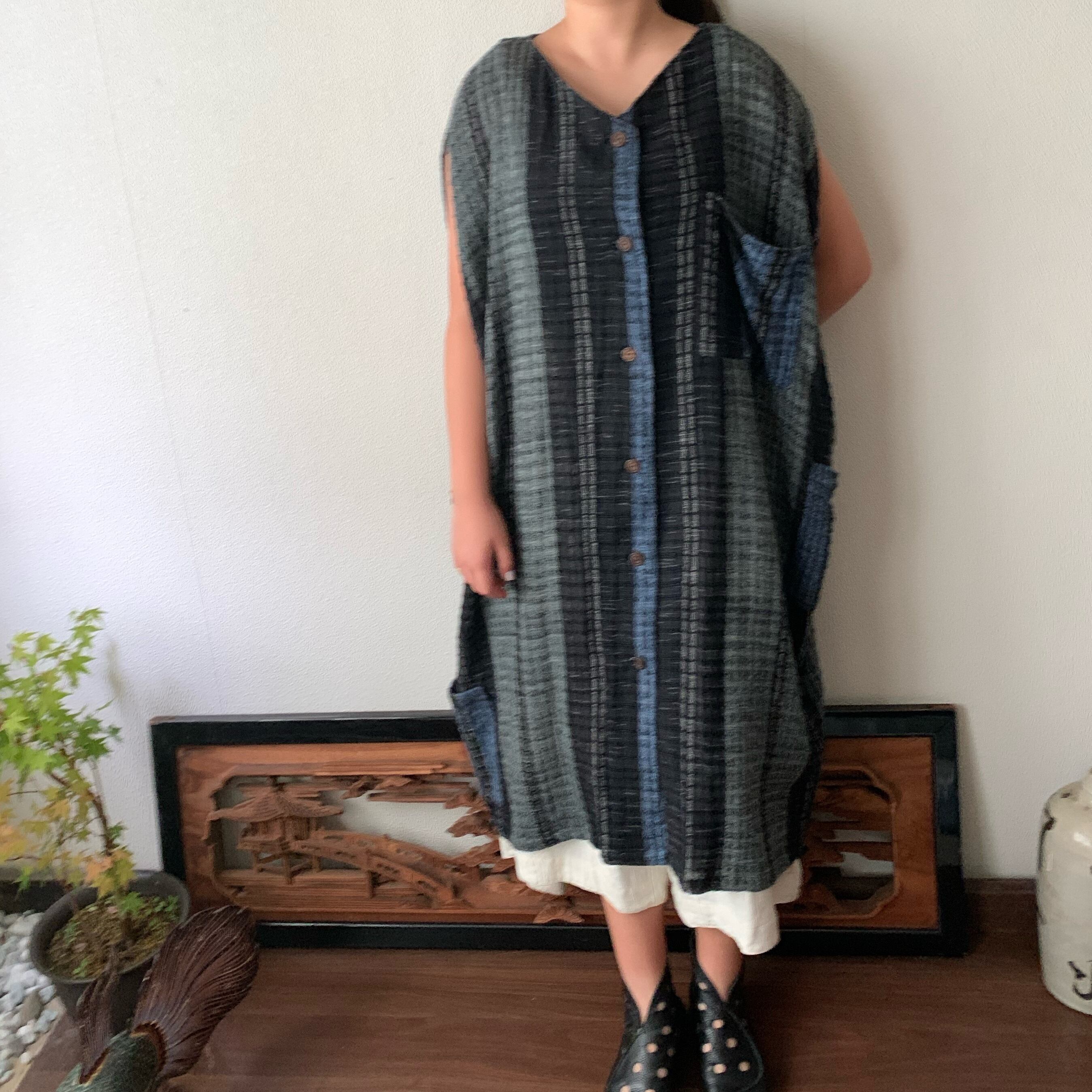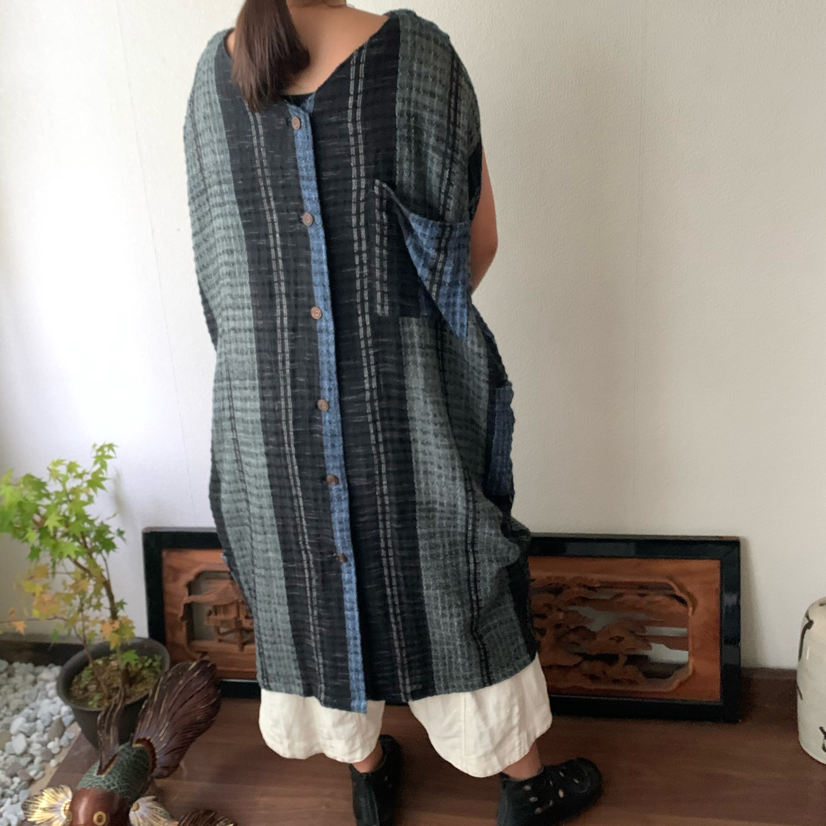 前にも後ろにもボタンをあけても閉じても楽しめる一着で何通りにも着ることのできる手織り綿のワンピースです。