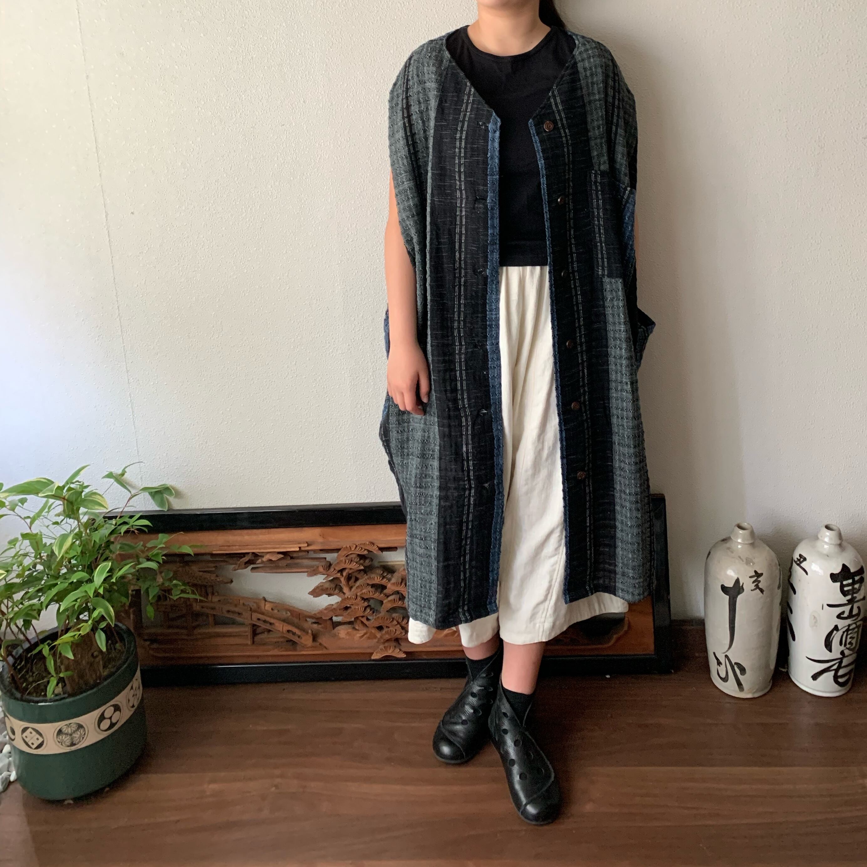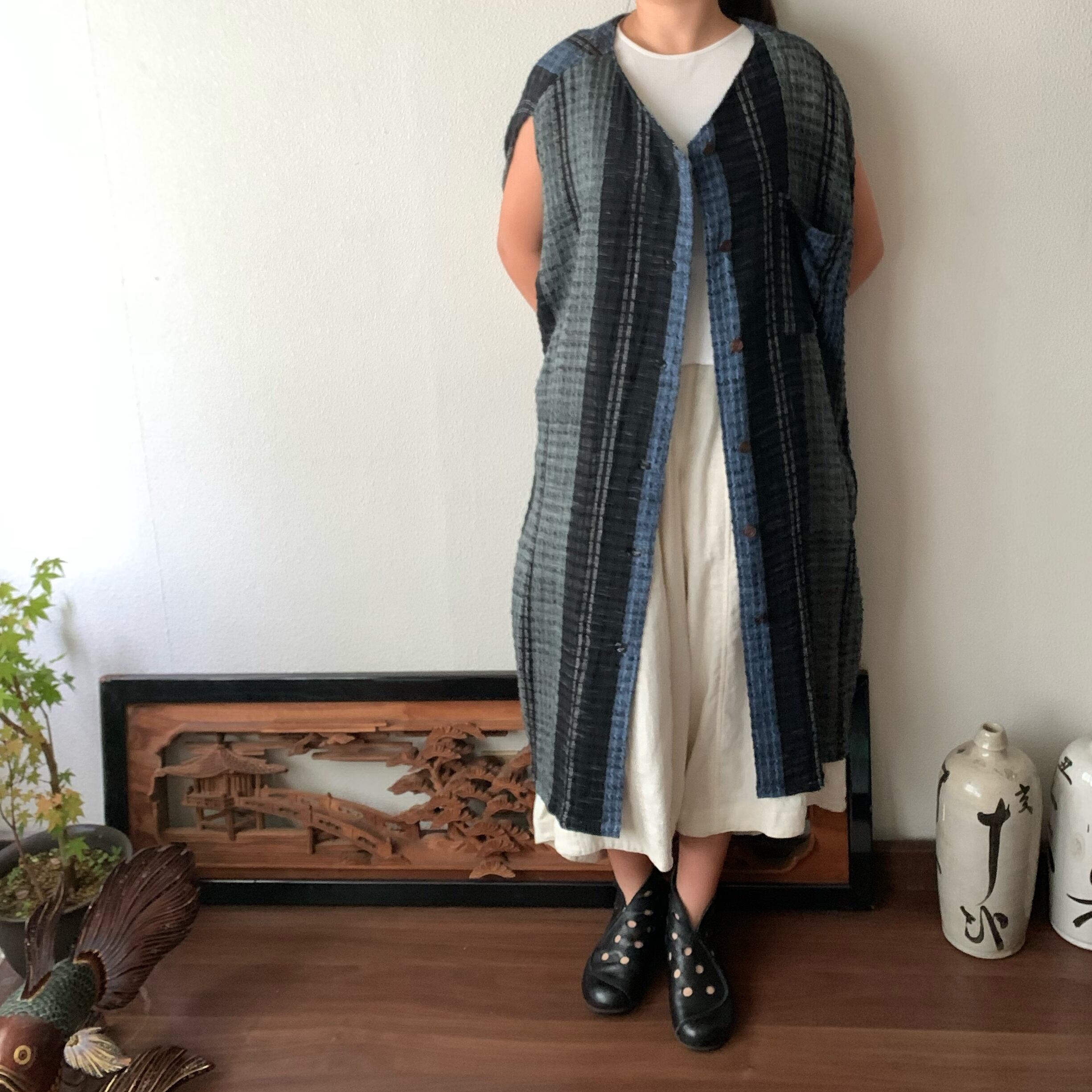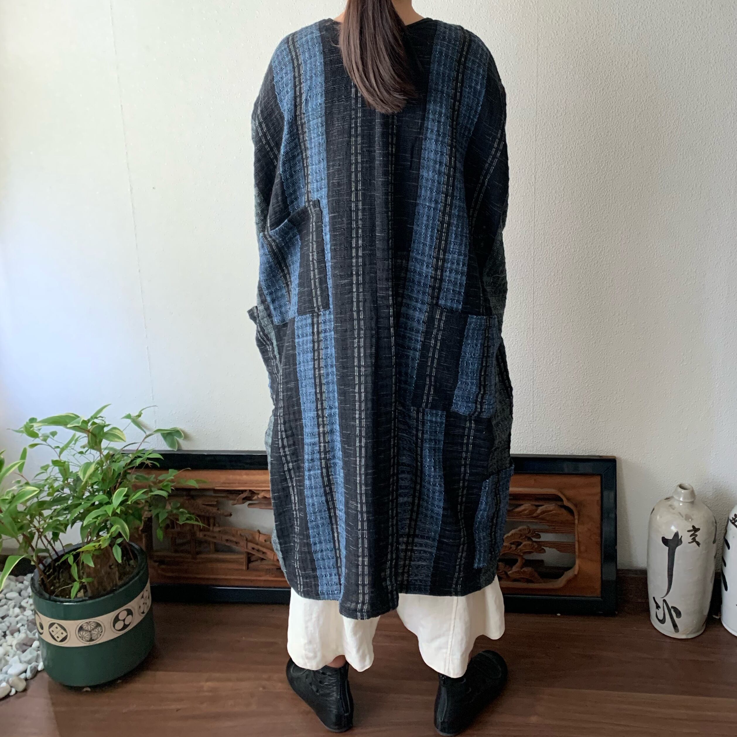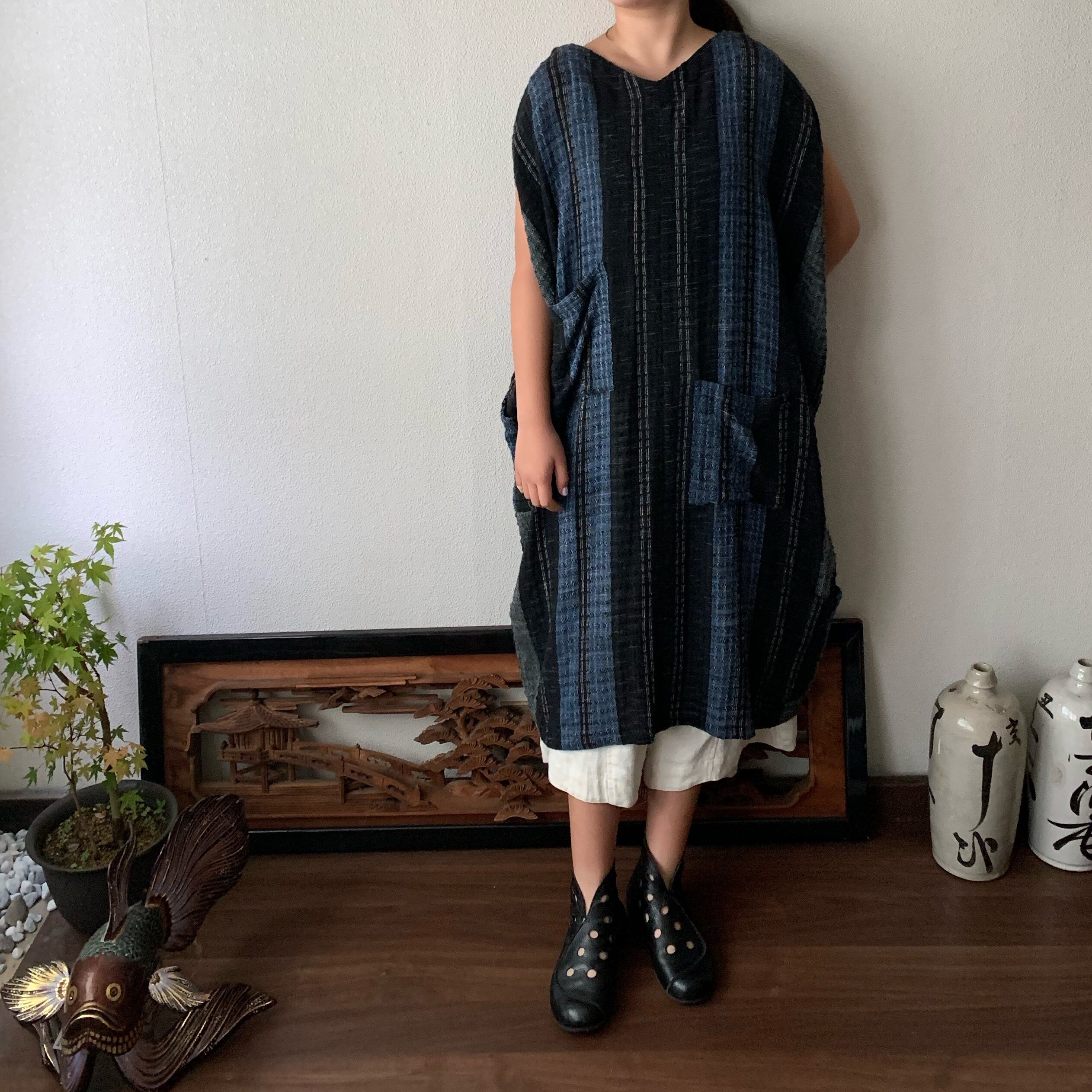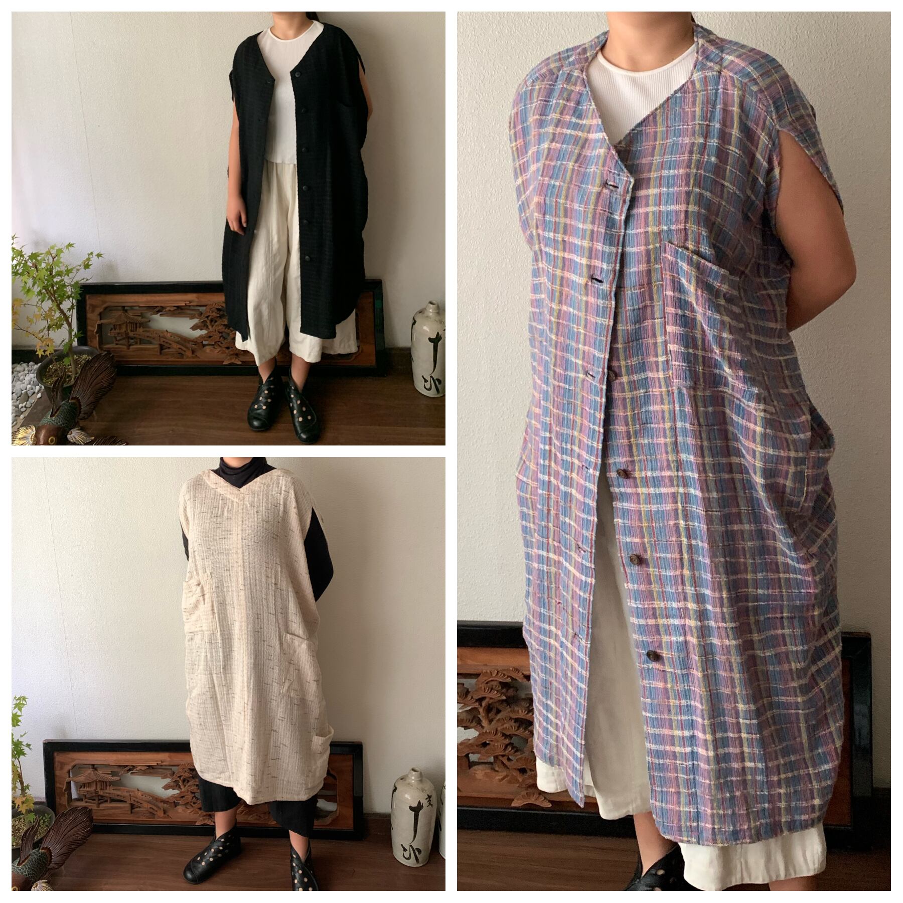 前にも後ろにもボタンをあけても閉じても楽しめる一着で何通りにも着ることのできる手織り綿のワンピースです。