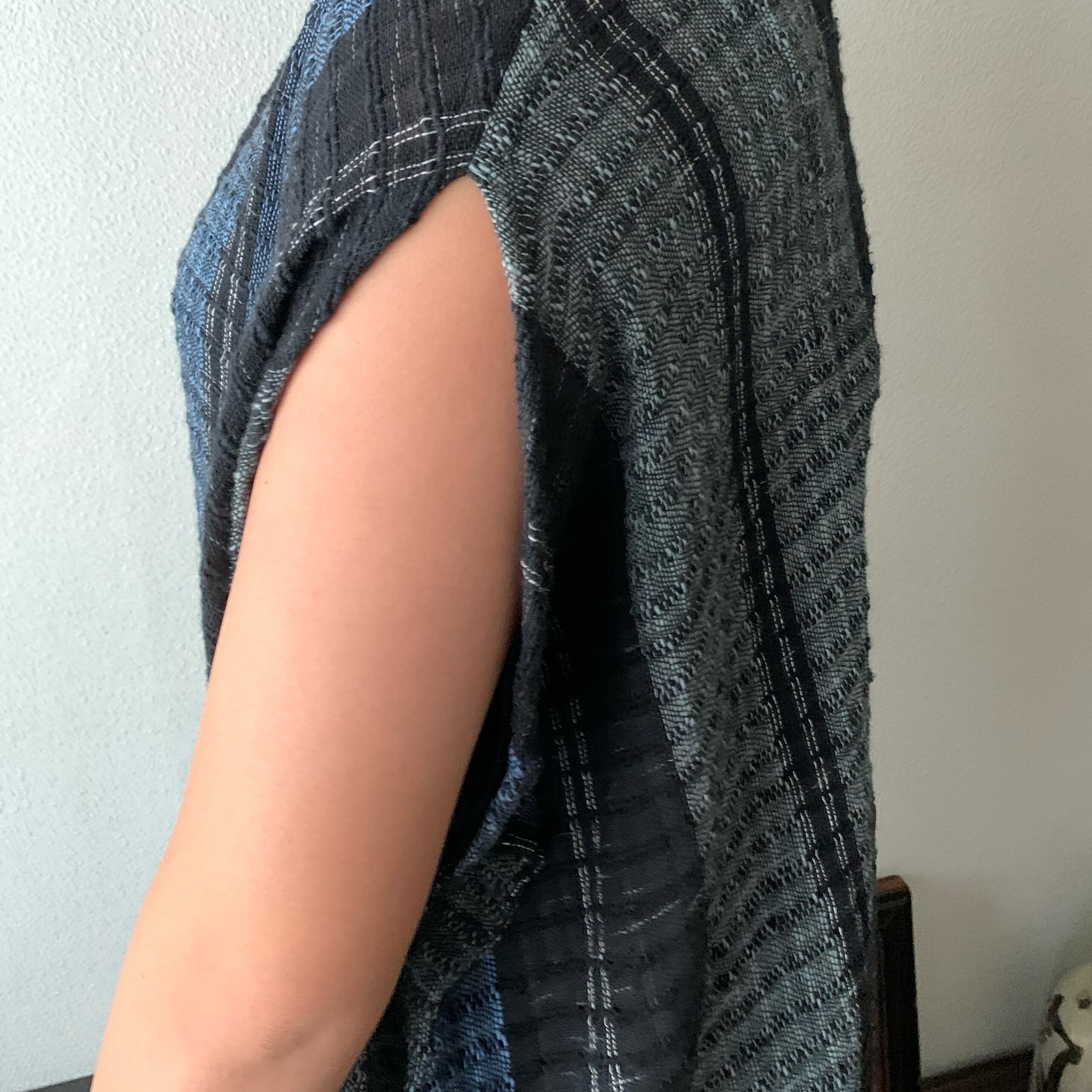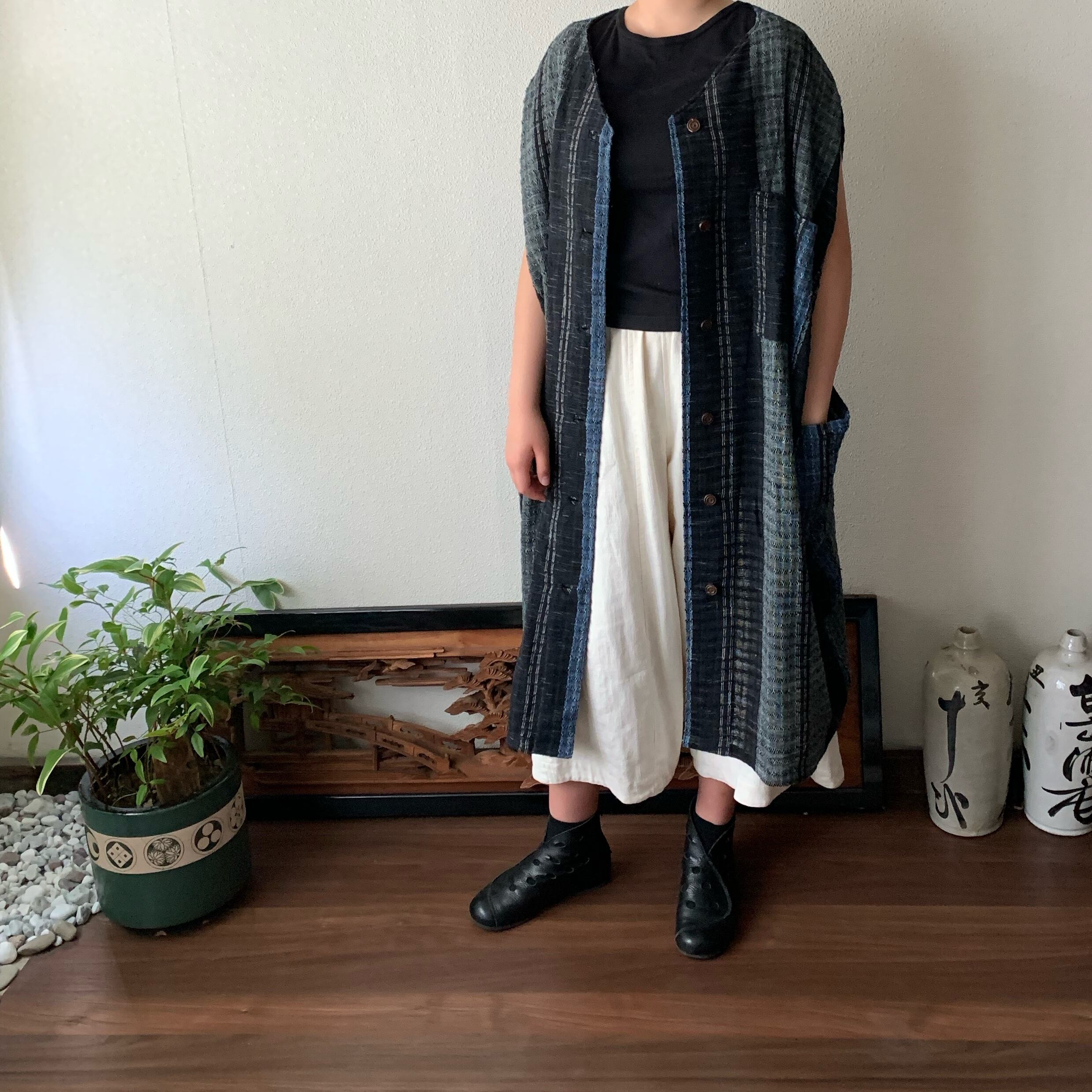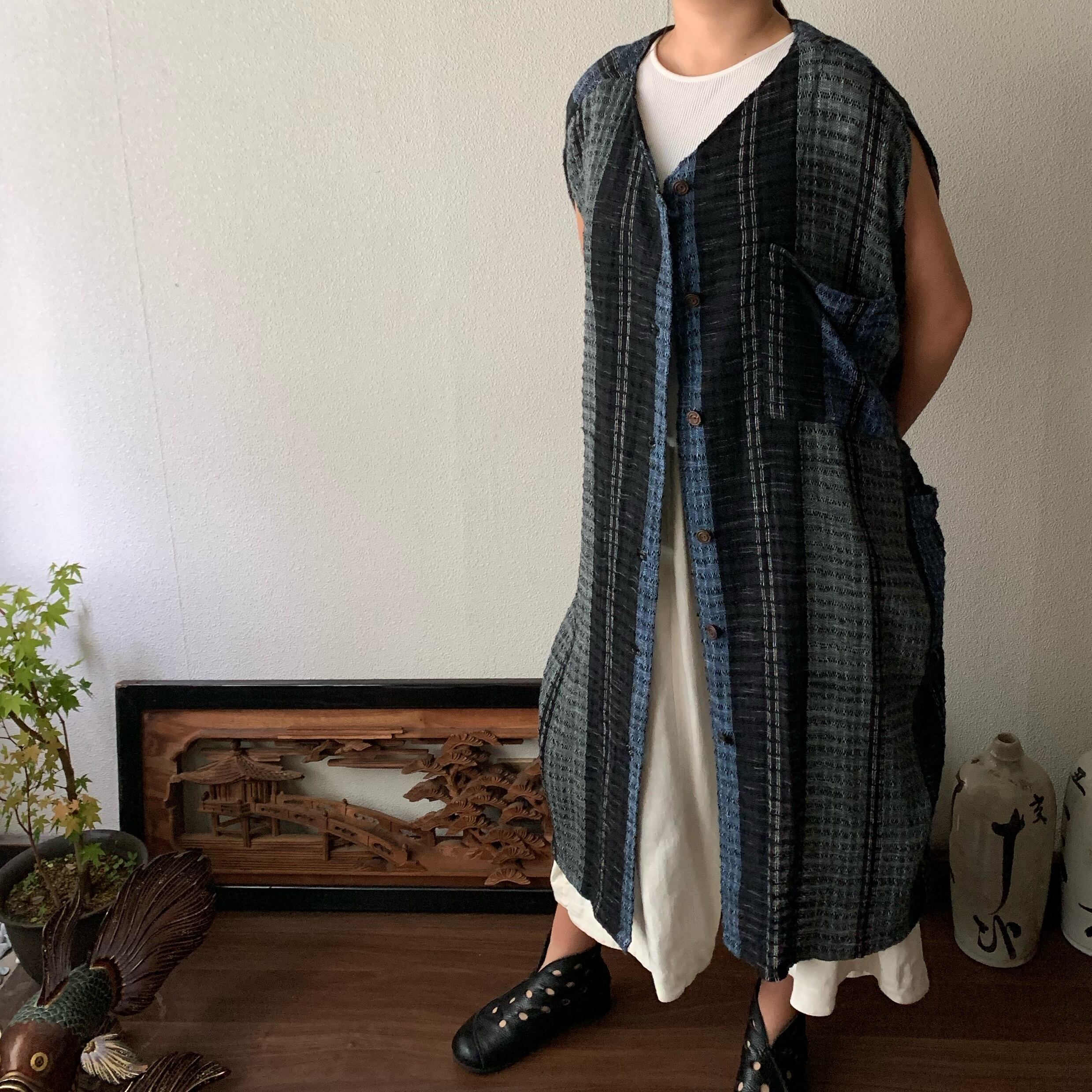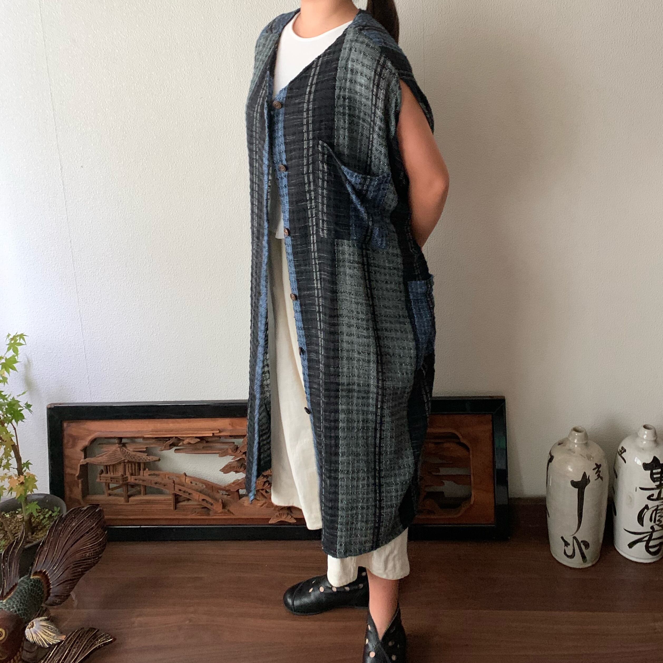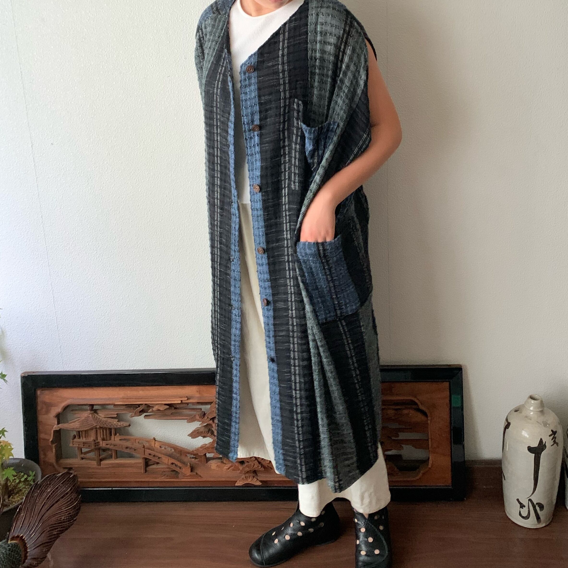 前にも後ろにもボタンをあけても閉じても楽しめる一着で何通りにも着ることのできる手織り綿のワンピースです。