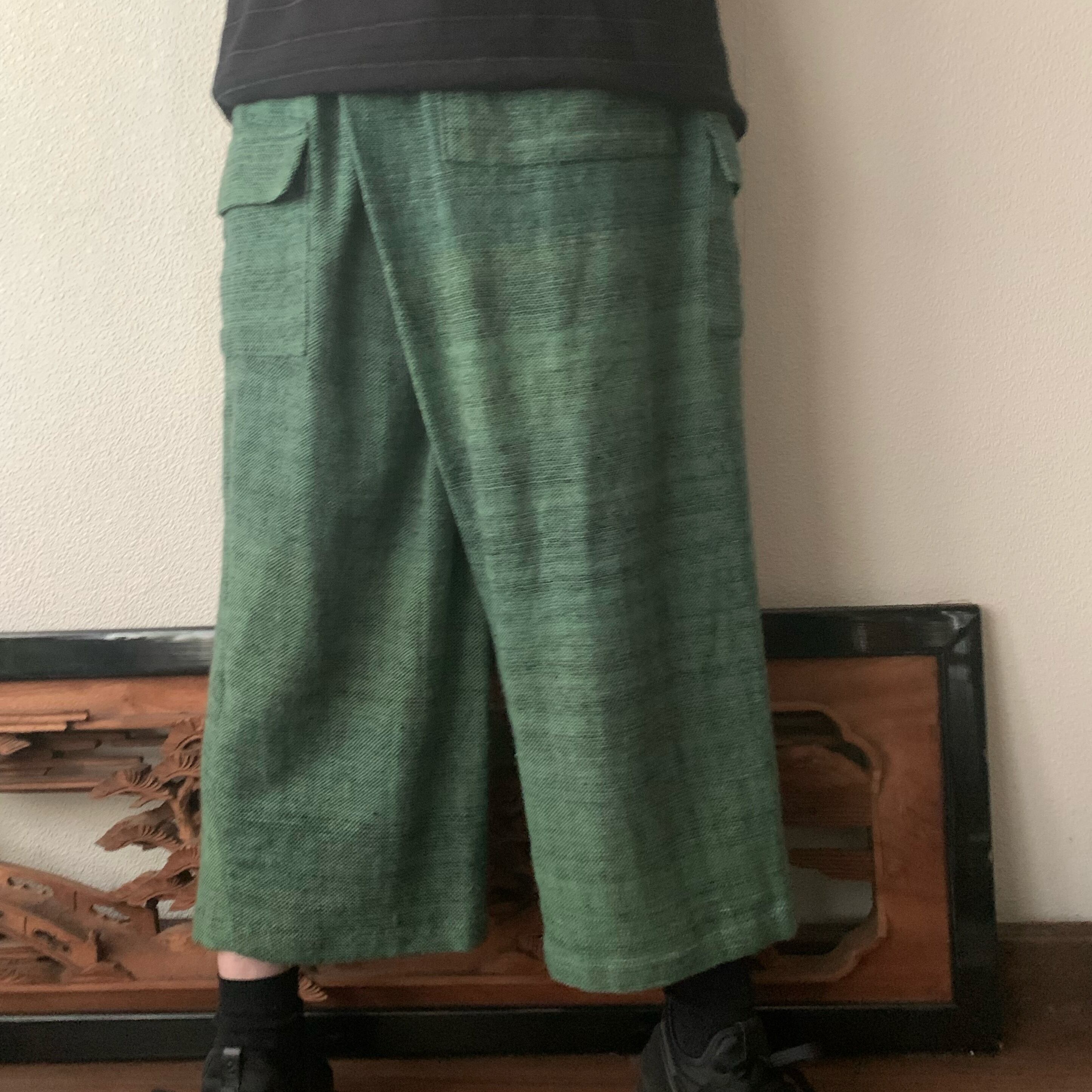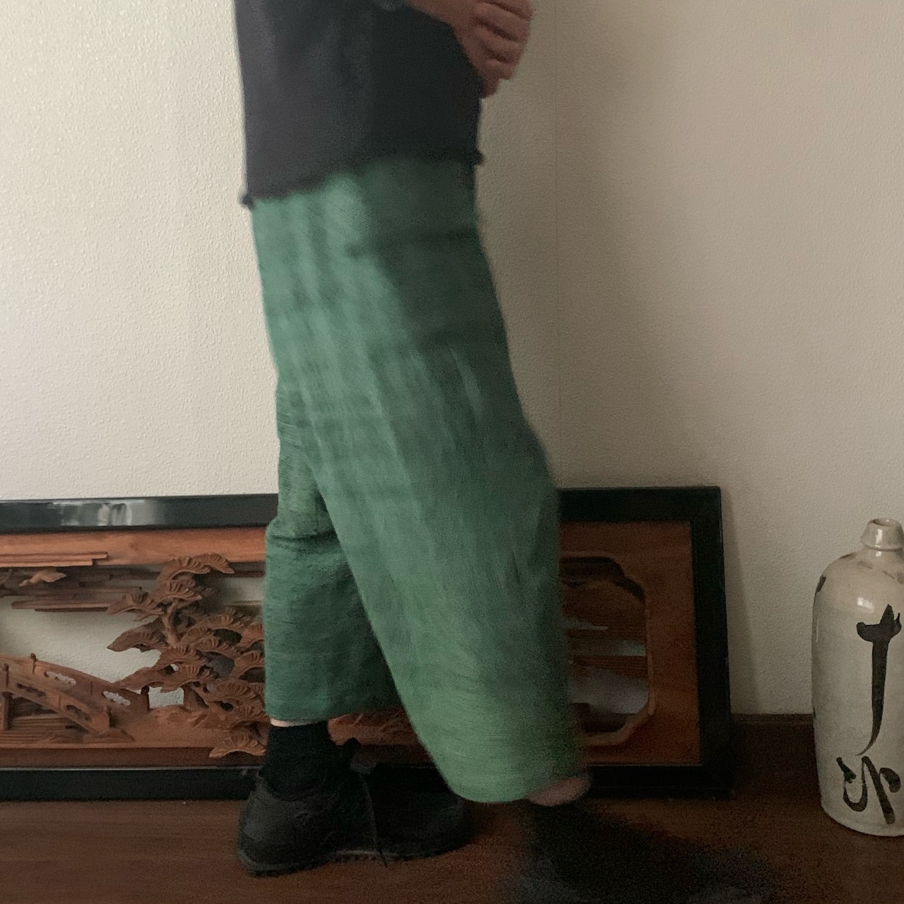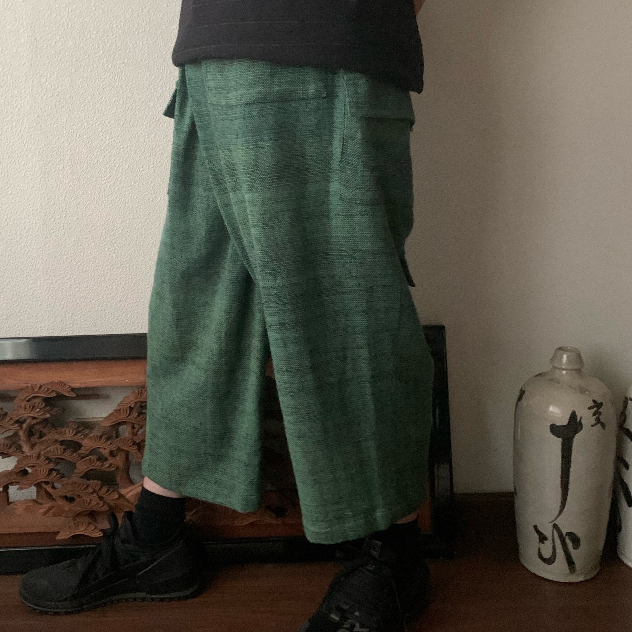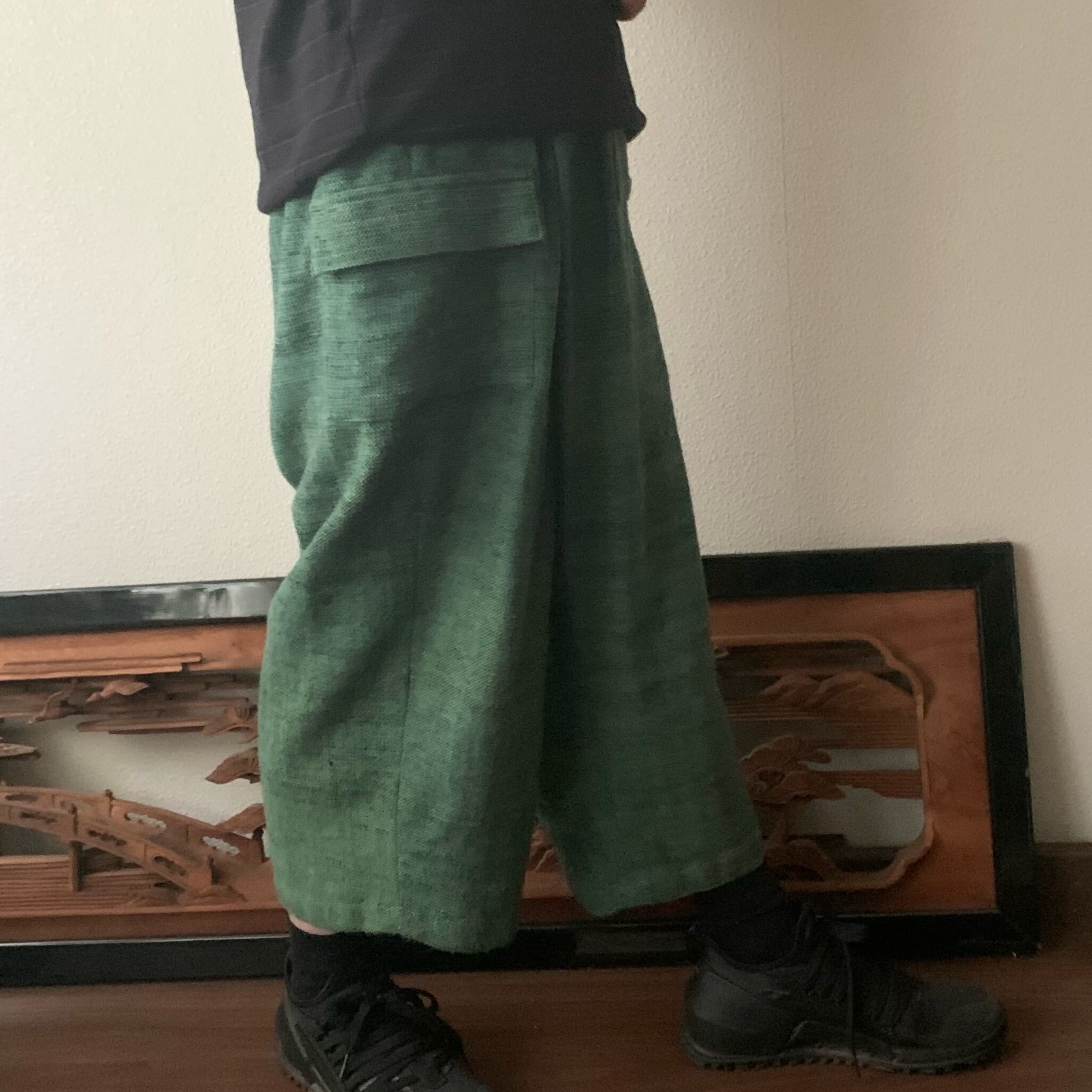 飾らなくてもこなれ感抜群な生地厚め手織り綿サルエルパンツ 前も後ろもアシンメトリーで多面的に楽しめる グリーン絣