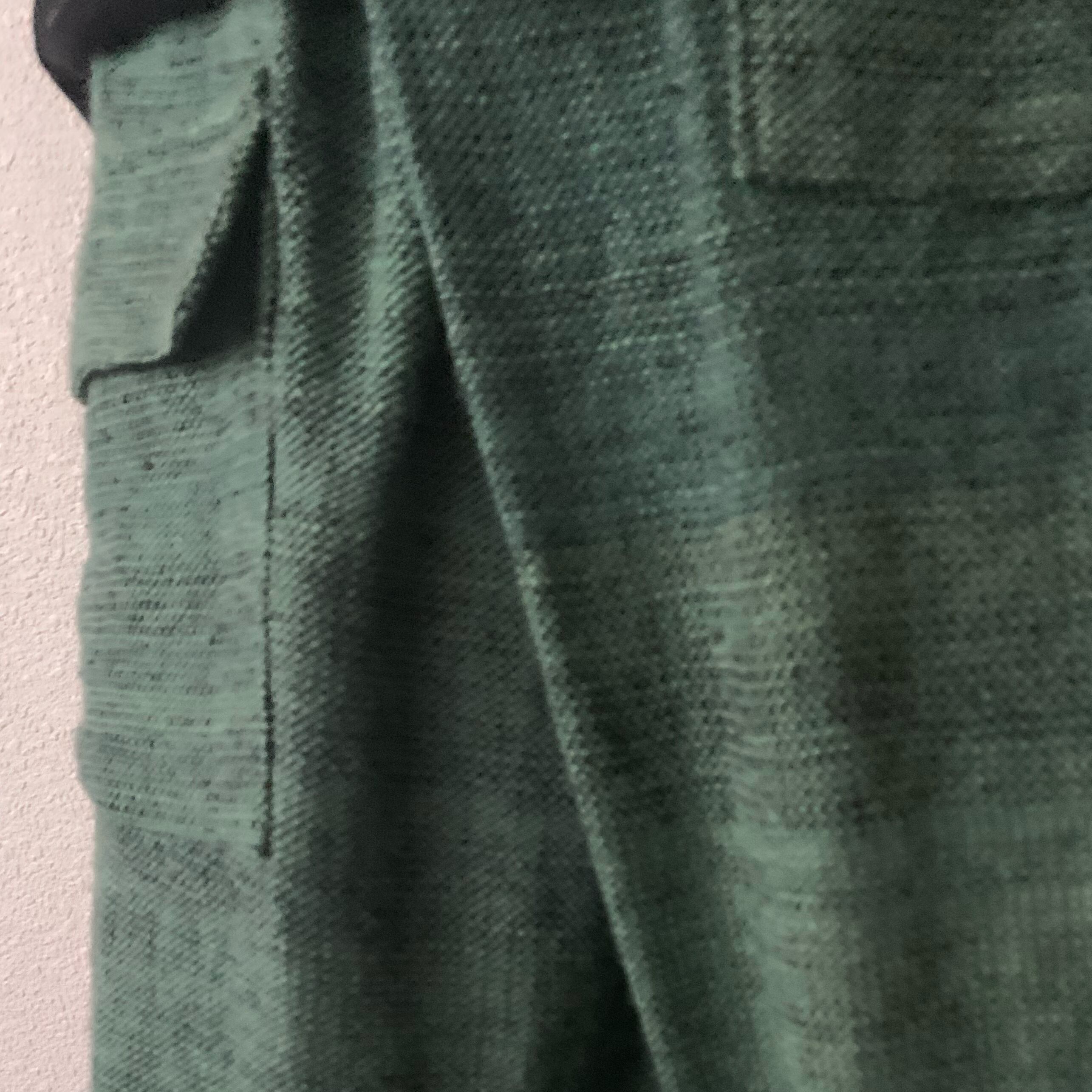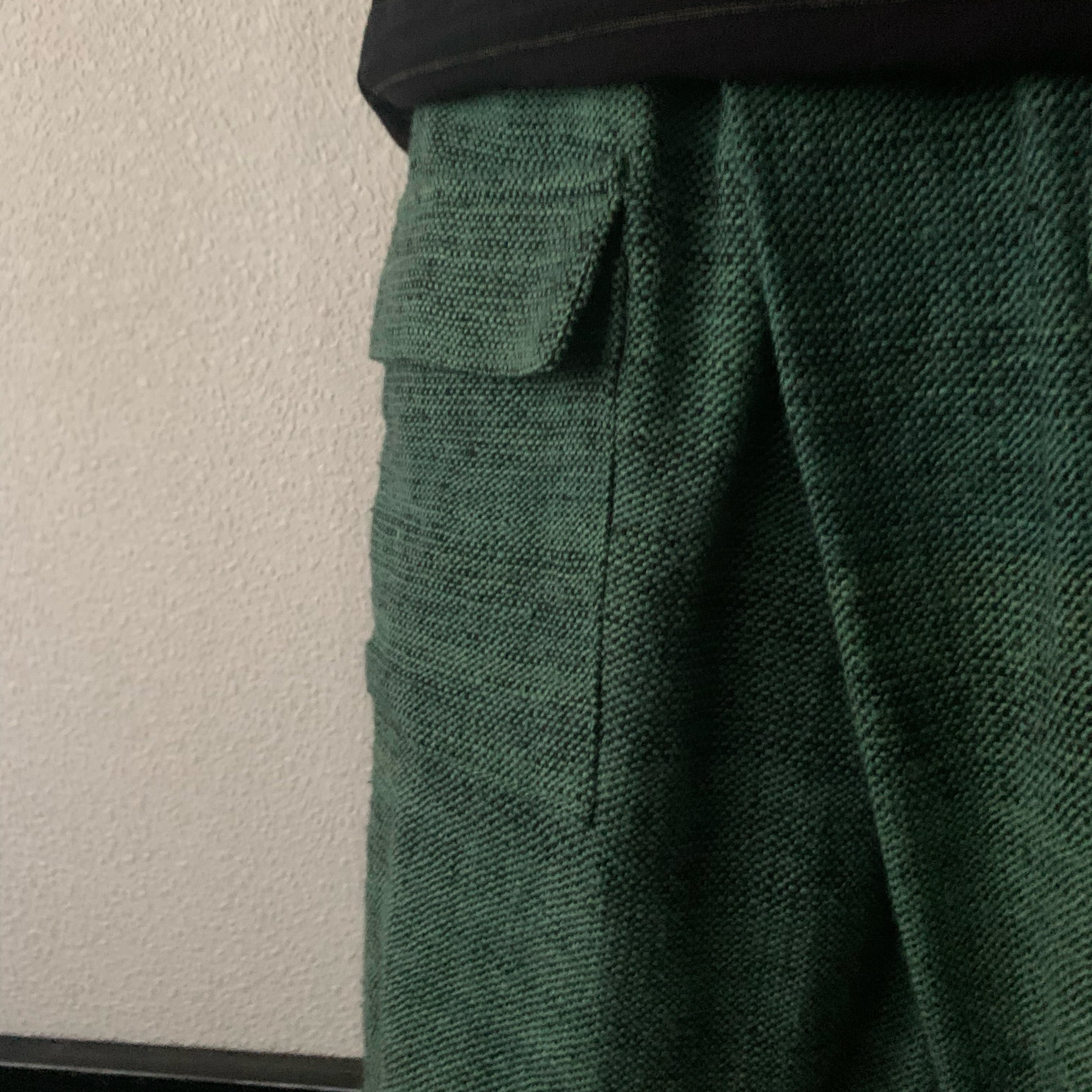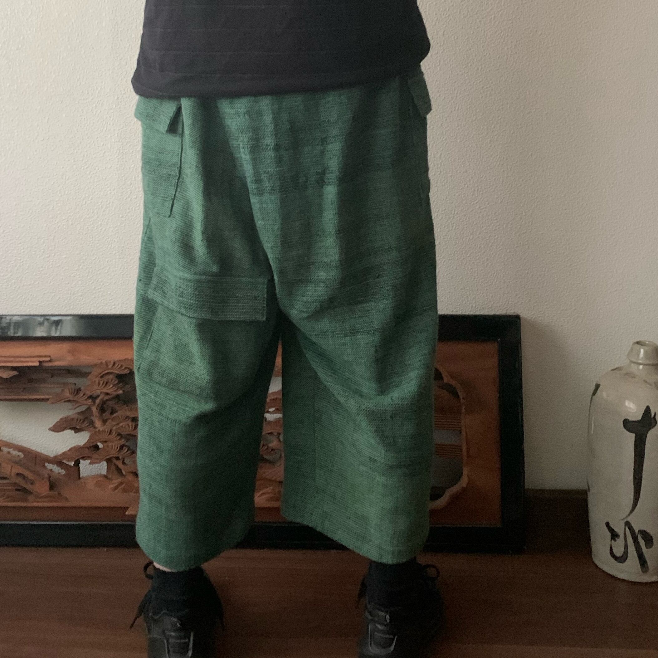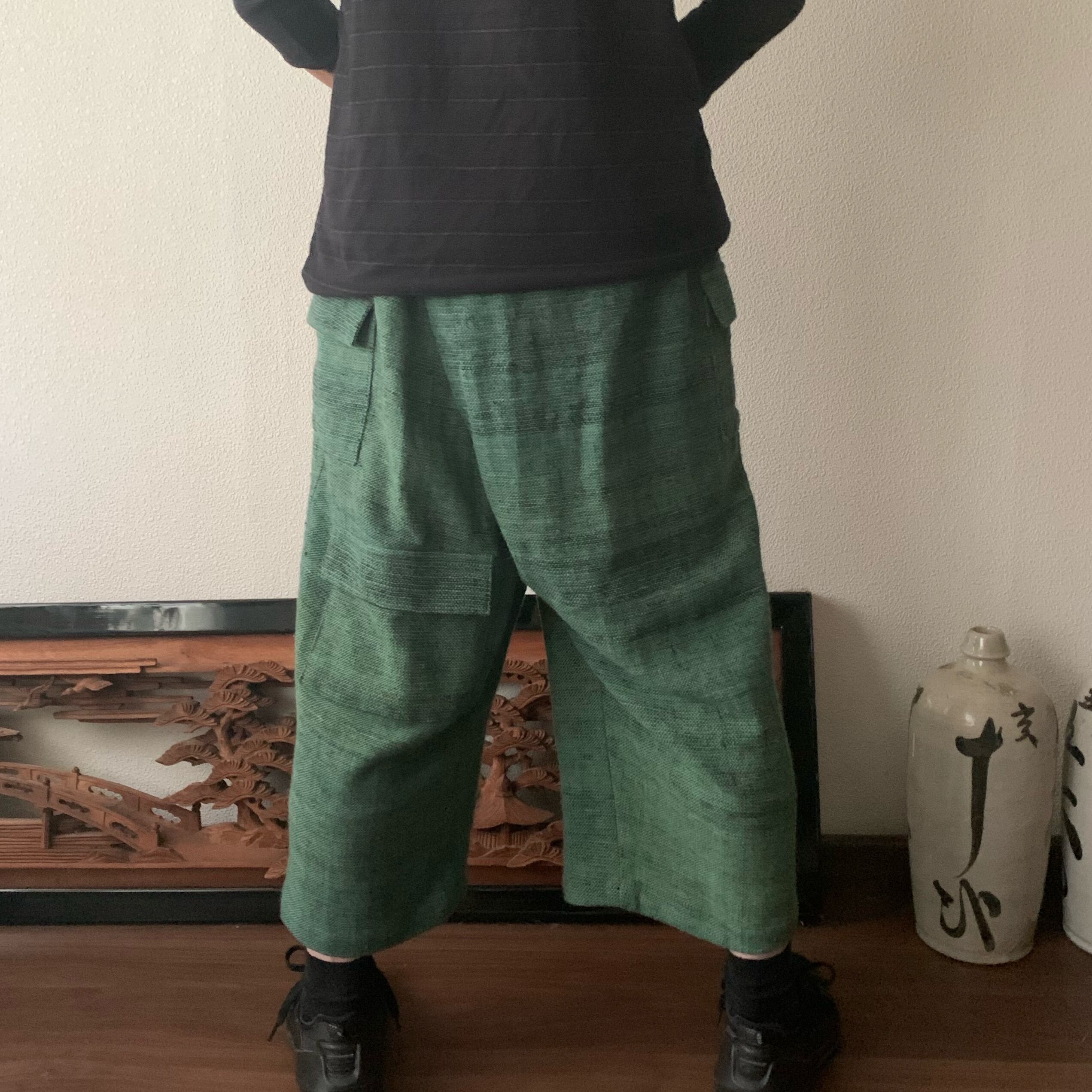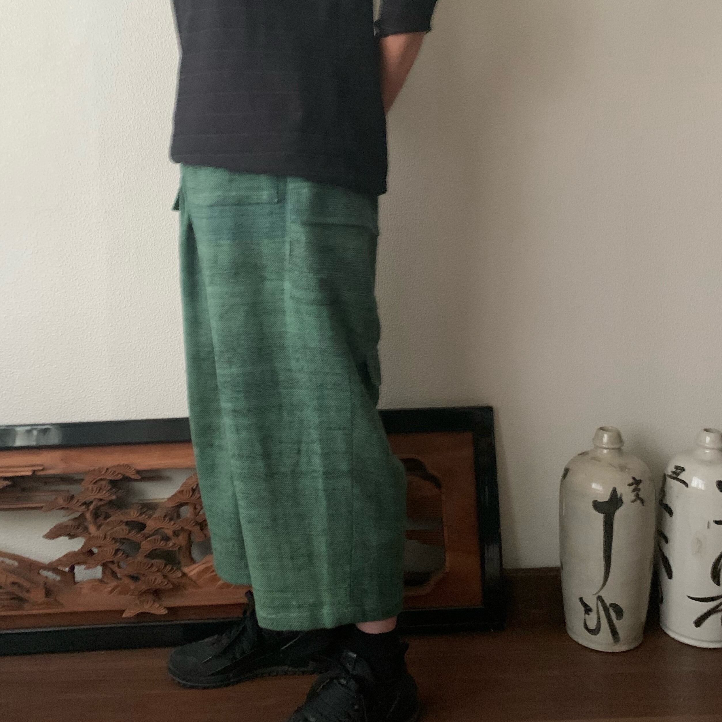 飾らなくてもこなれ感抜群な生地厚め手織り綿サルエルパンツ 前も後ろもアシンメトリーで多面的に楽しめる グリーン絣