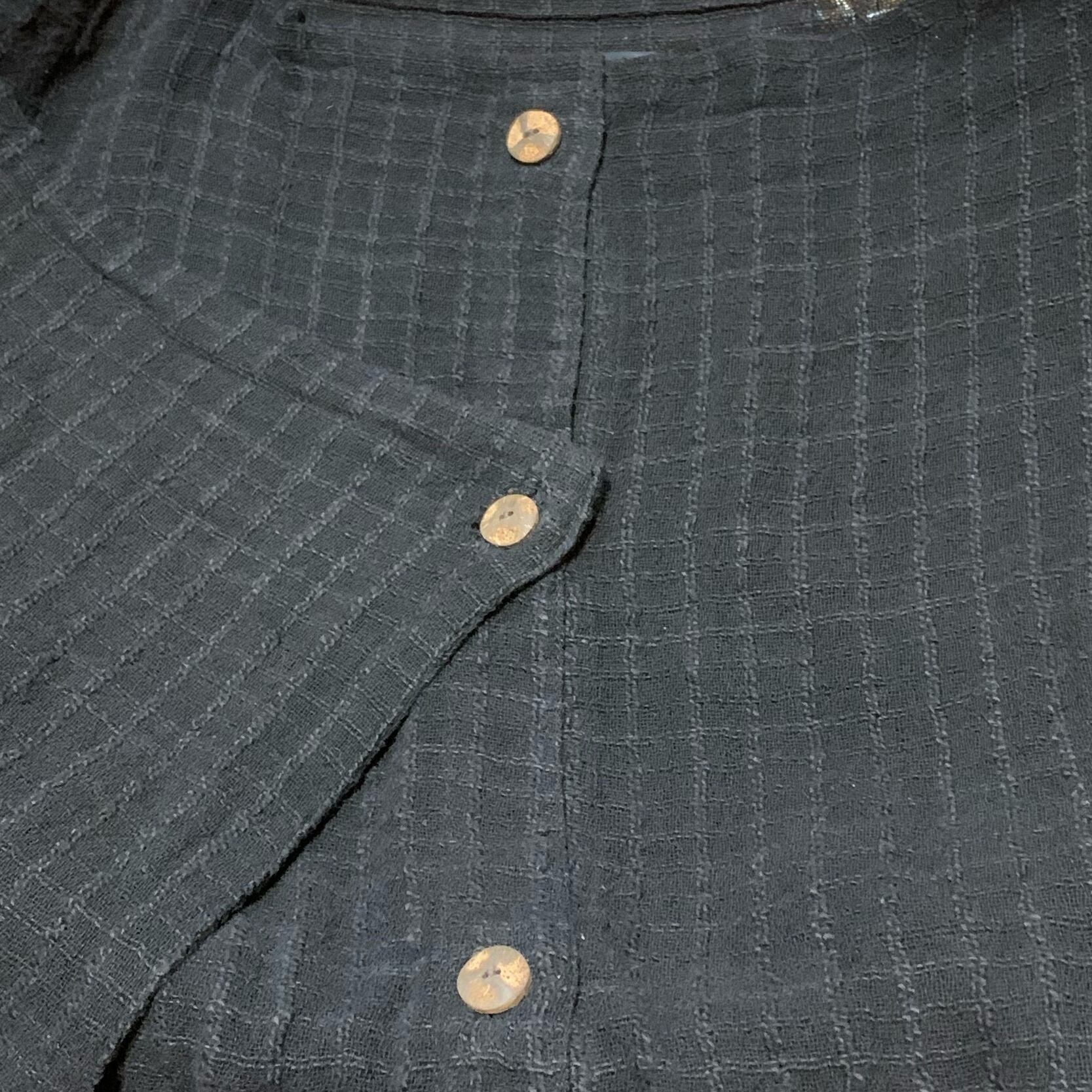 前開きで楽に羽織れますが、片側に生地をつけ、前開き部分のボタン部分に留めることができるようにしています。
