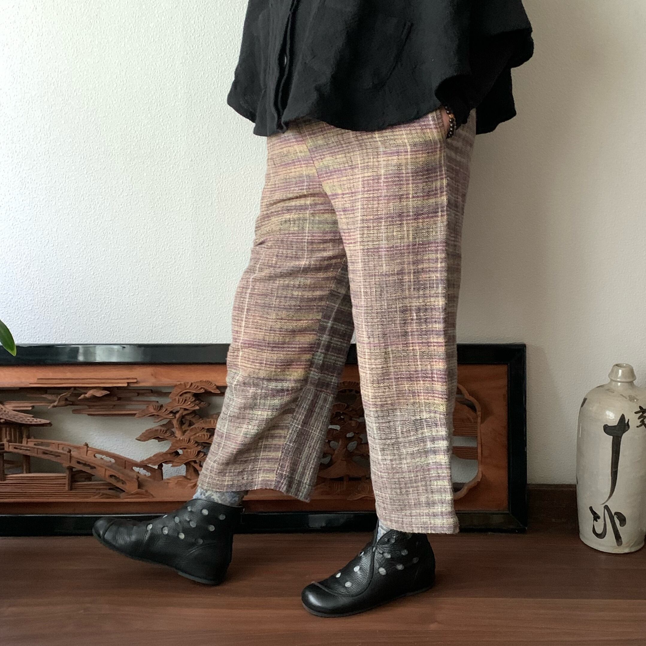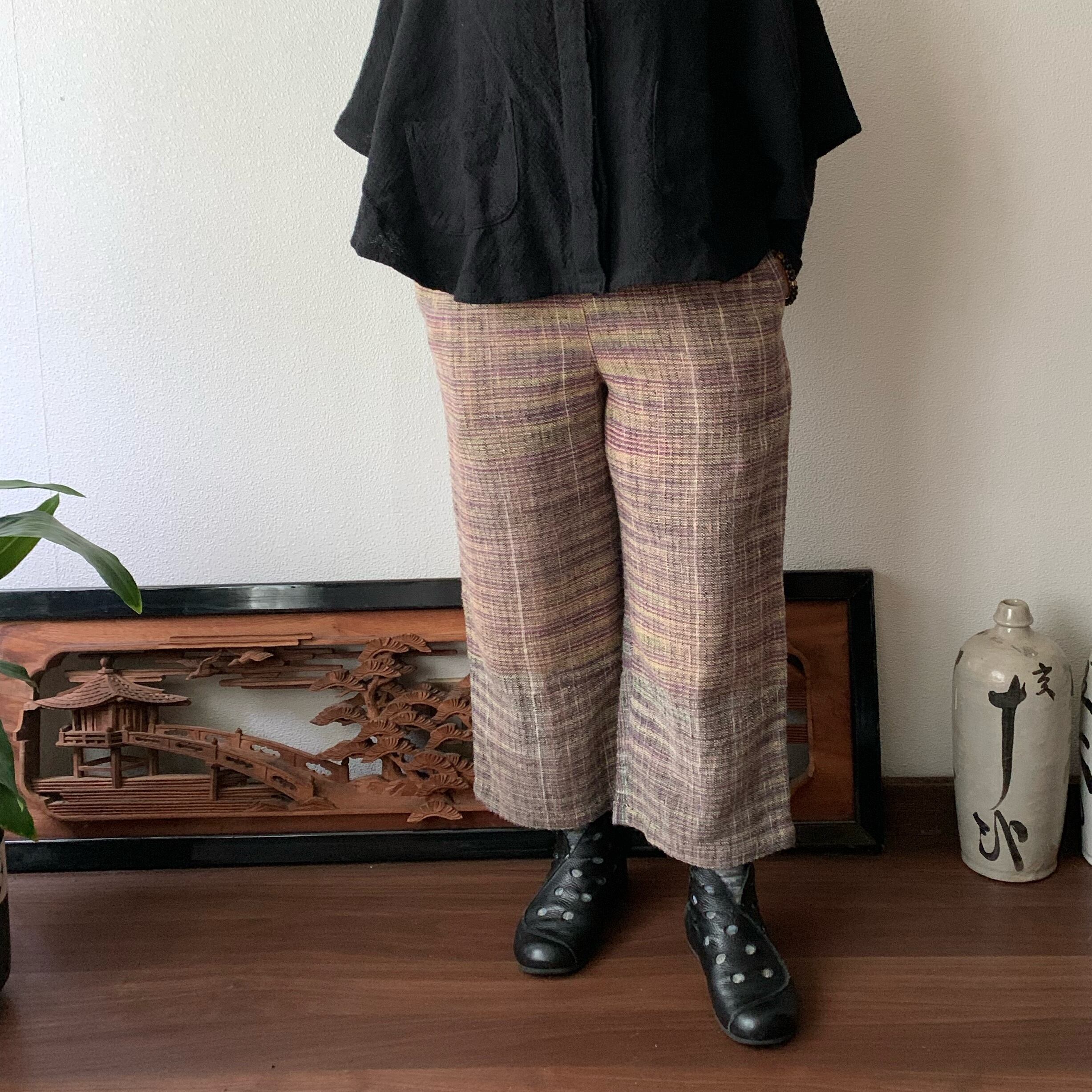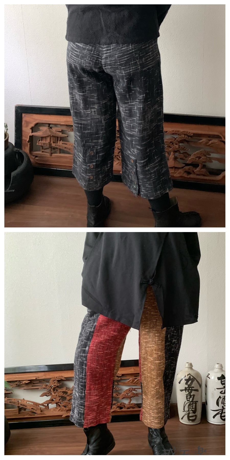 生地厚め手織り綿ガウチョパンツ シンプルにはけるけど裾切り返しと後ろボタンが楽しい 黄紫絣