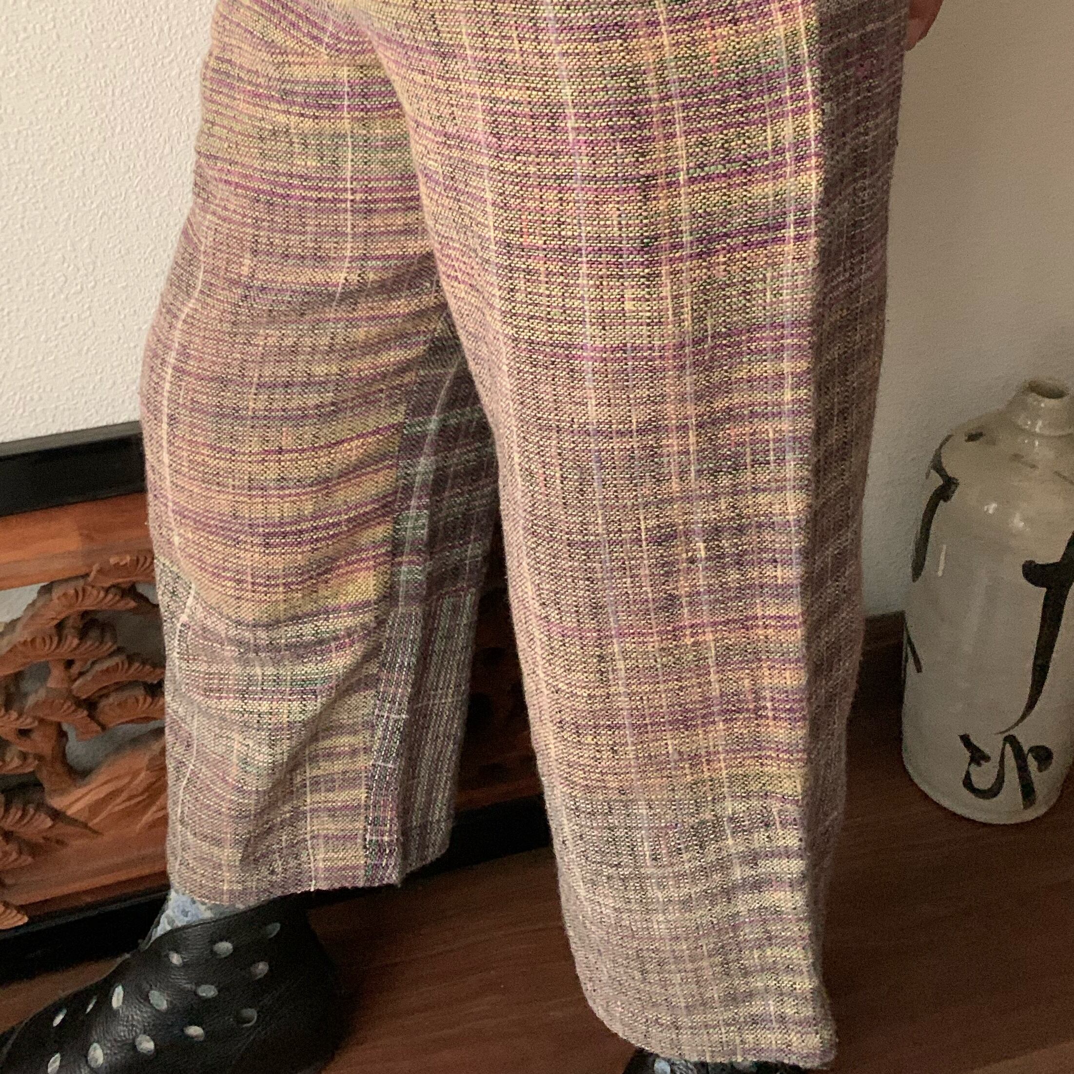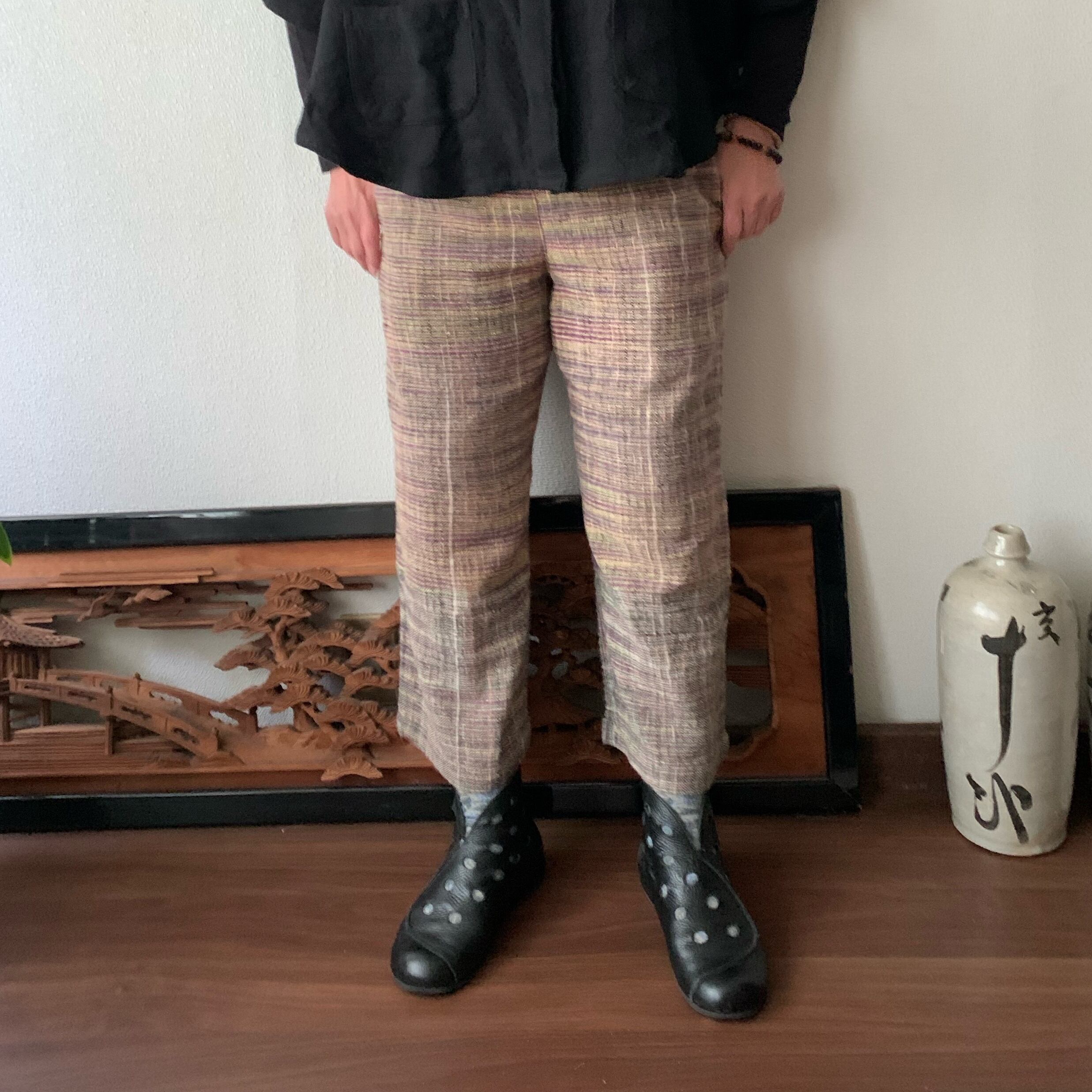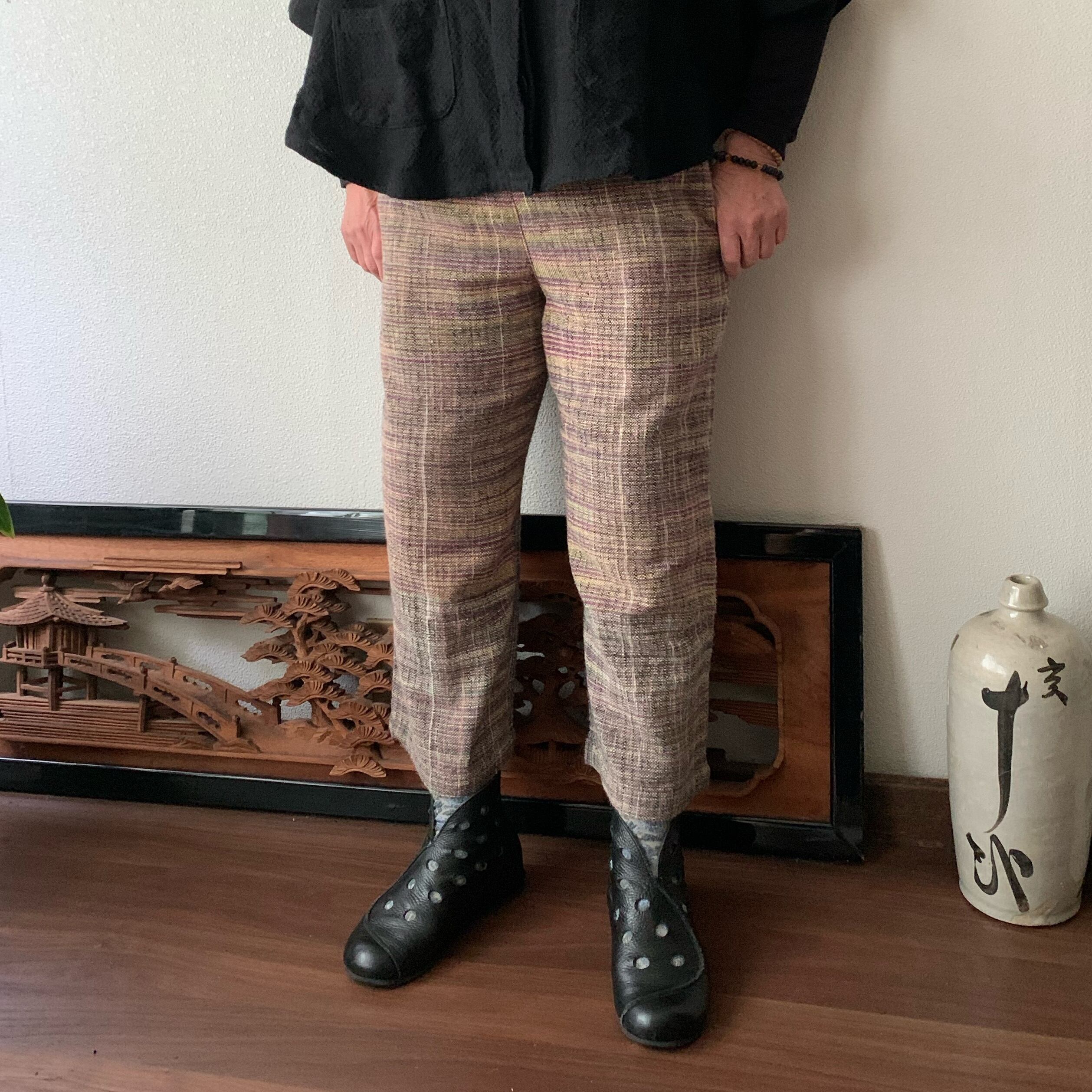 生地厚め手織り綿ガウチョパンツ シンプルにはけるけど裾切り返しと後ろボタンが楽しい 黄紫絣