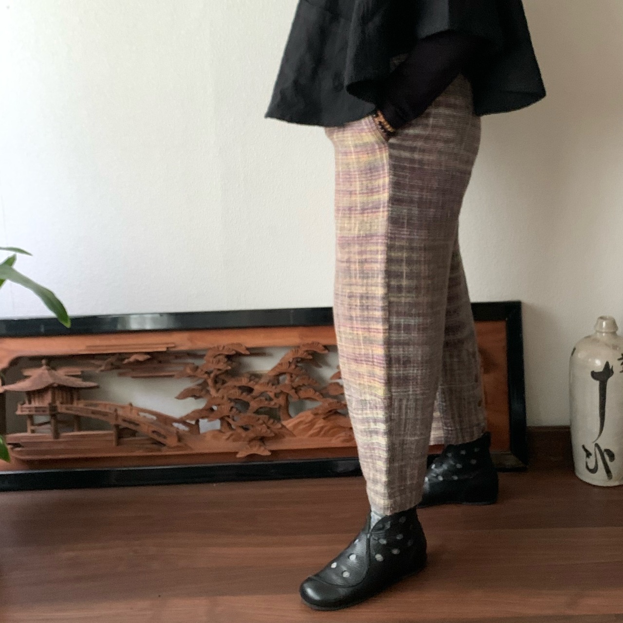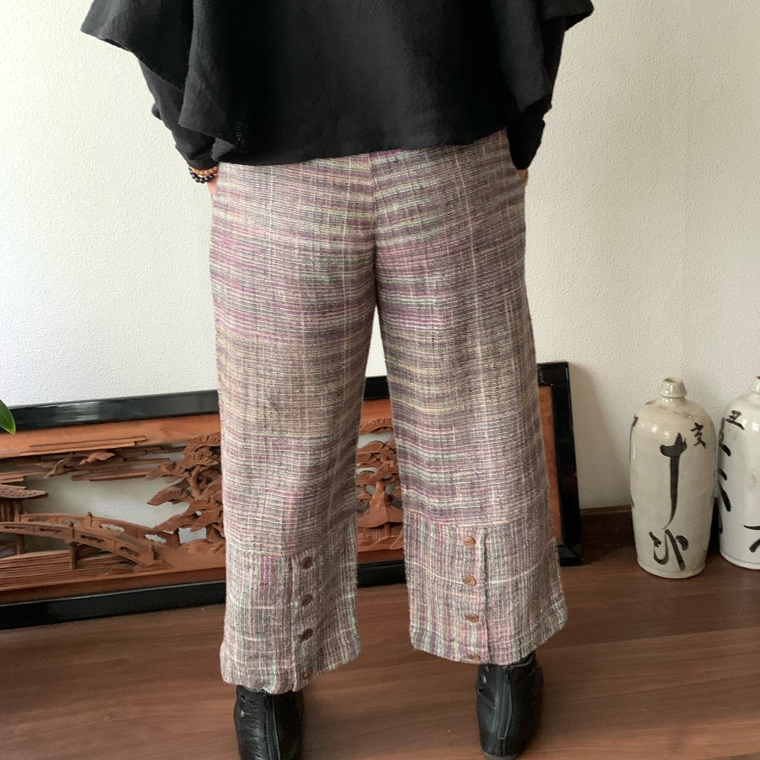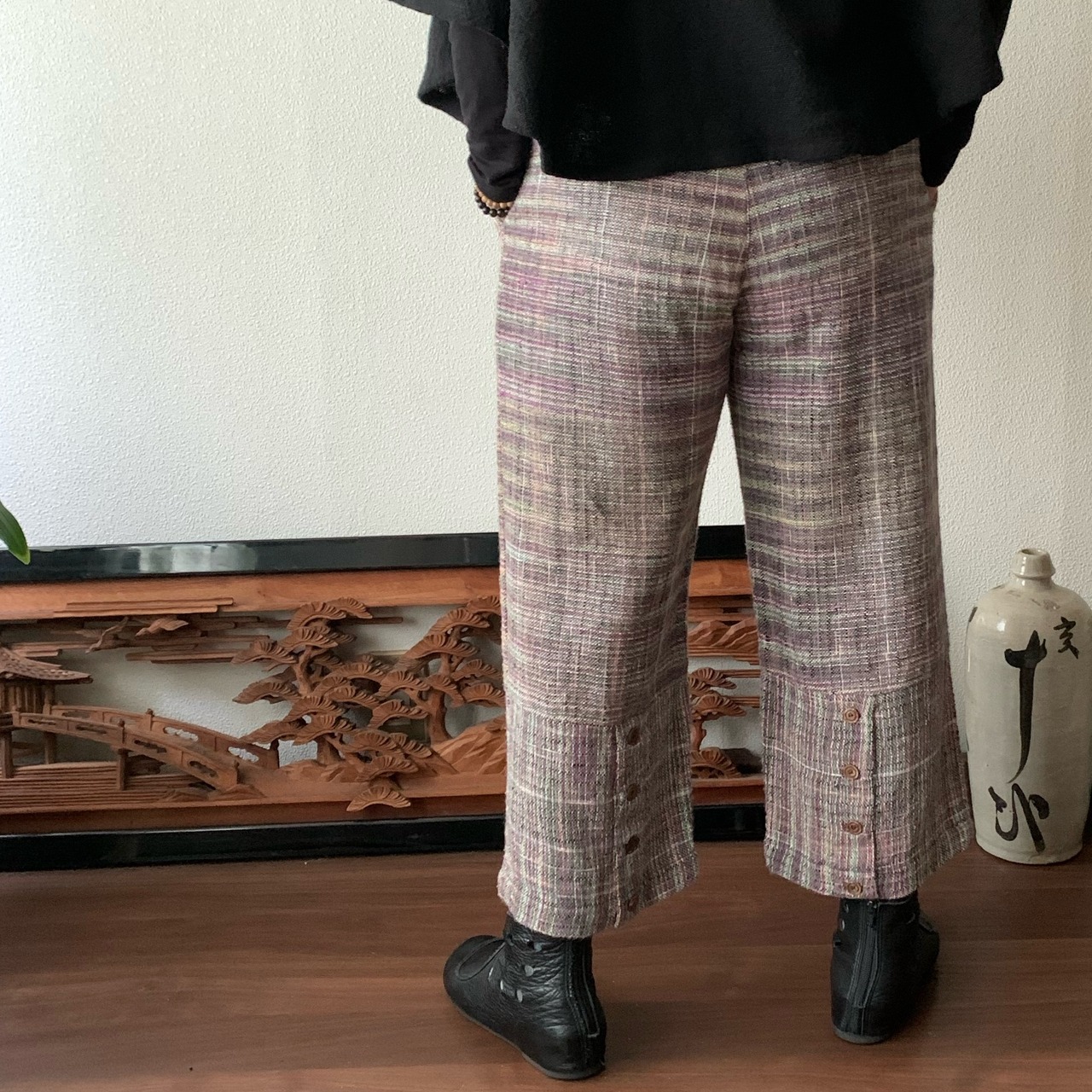 シンプルにはけるけど、裾部分の生地を切り返し、裾後ろボタンをつけて、動きがあって遊び心満載の手織り綿ガウチョパンツになりました。