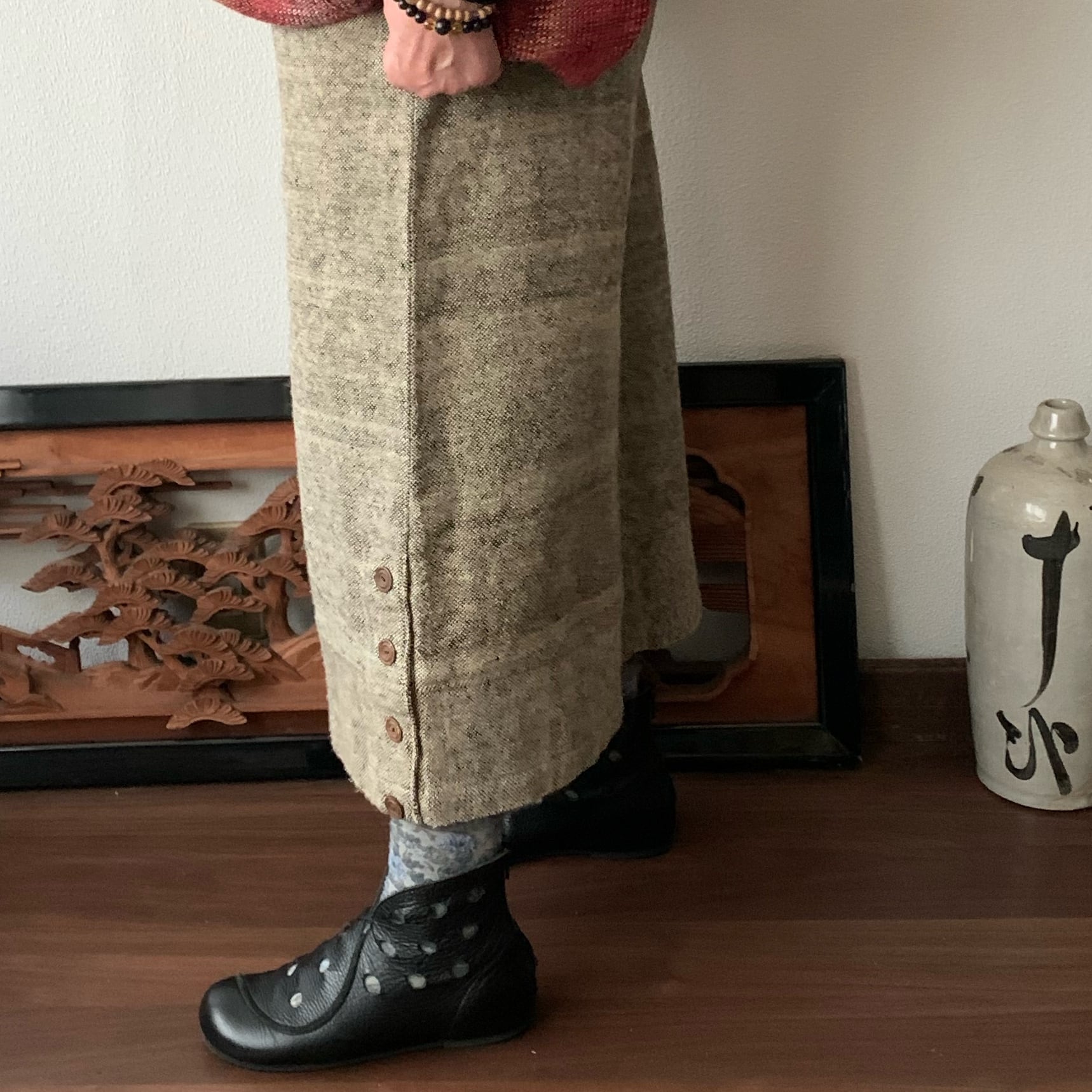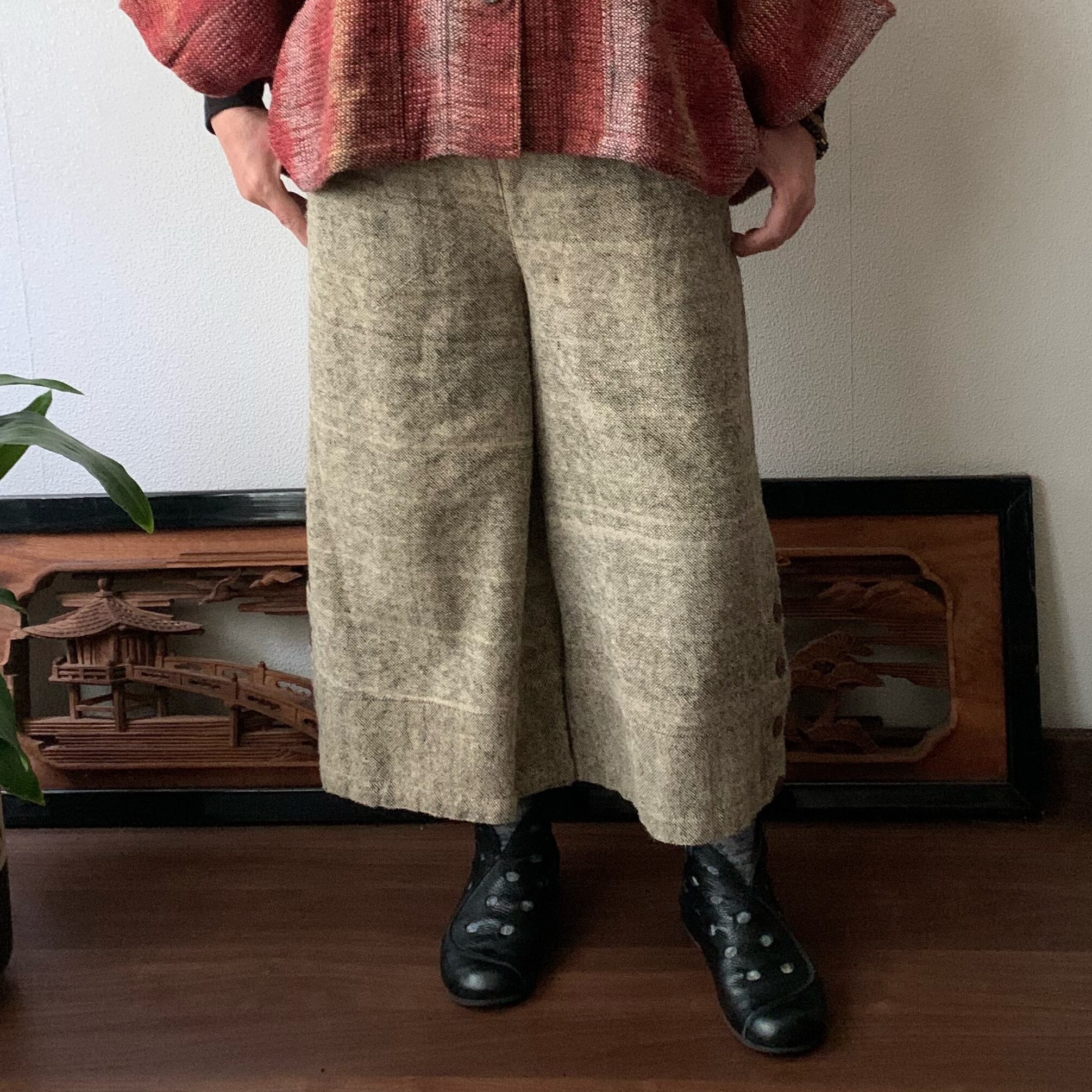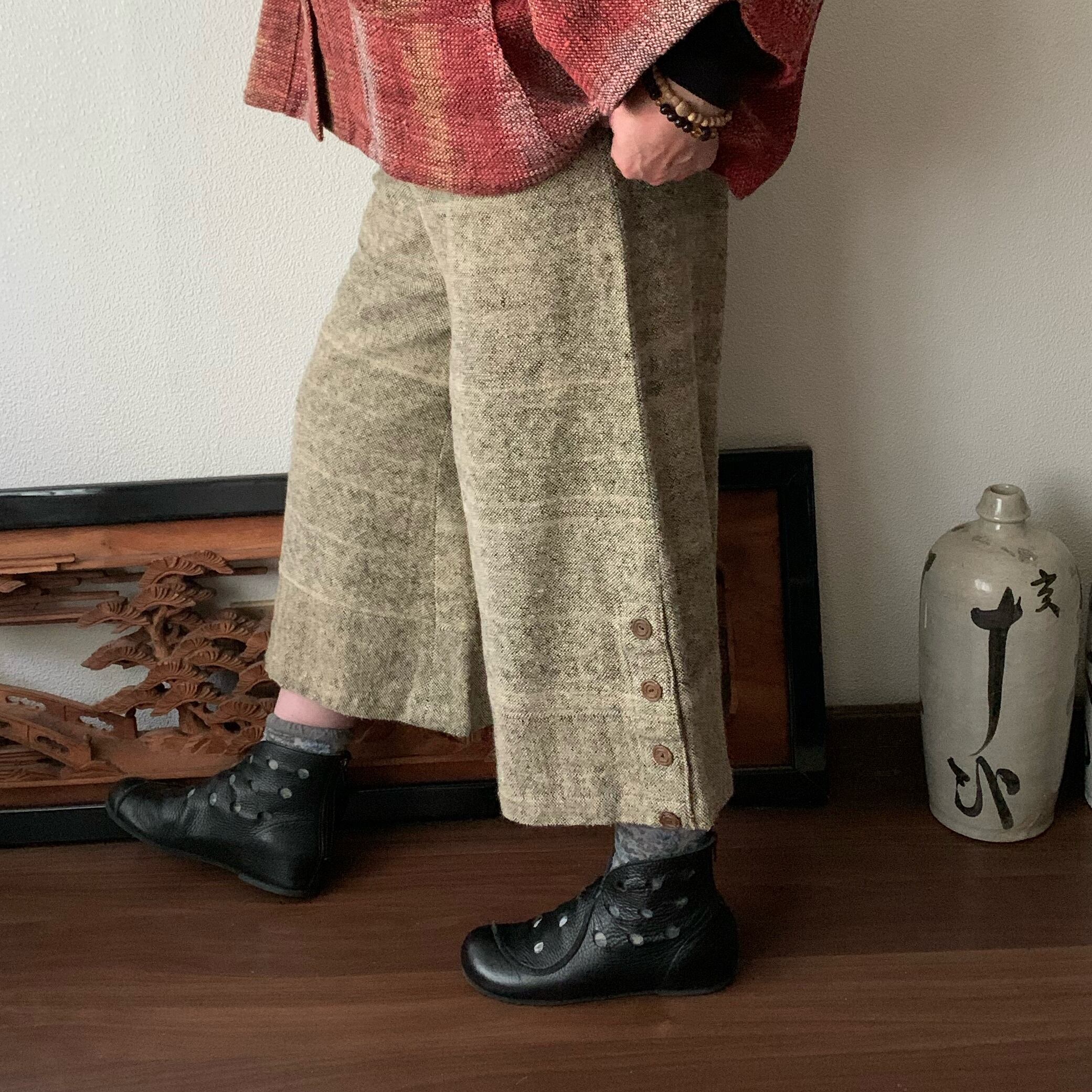 『生地厚め手織り綿裾ワイドのガウチョパンツ すとんと落ちるシンプルラインでどんな体型もすっきり、でも裾横ボタンで遊んでます もちろんロングセラー』