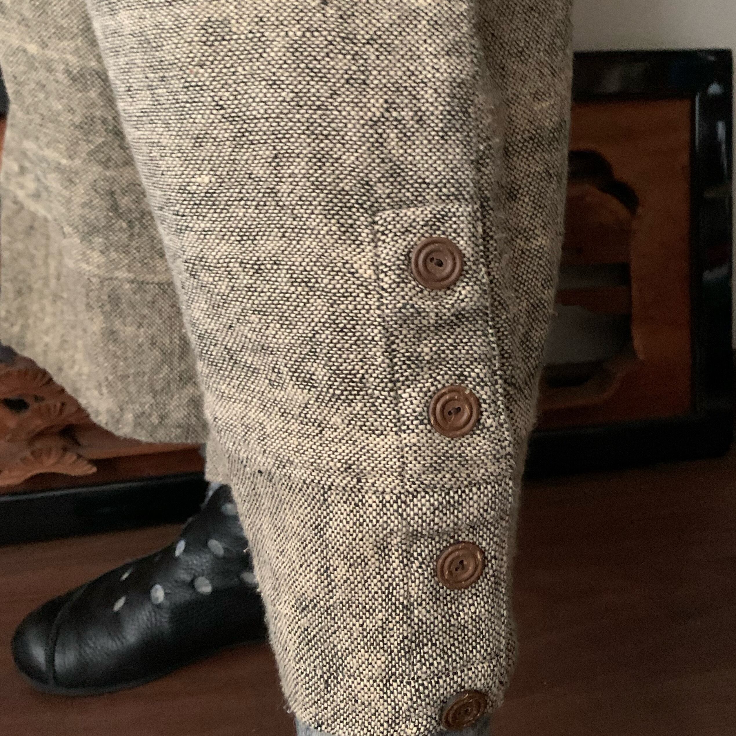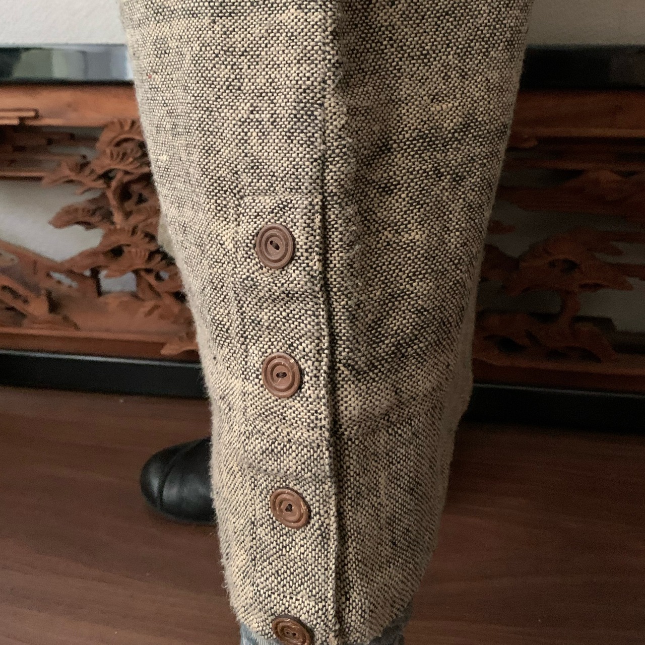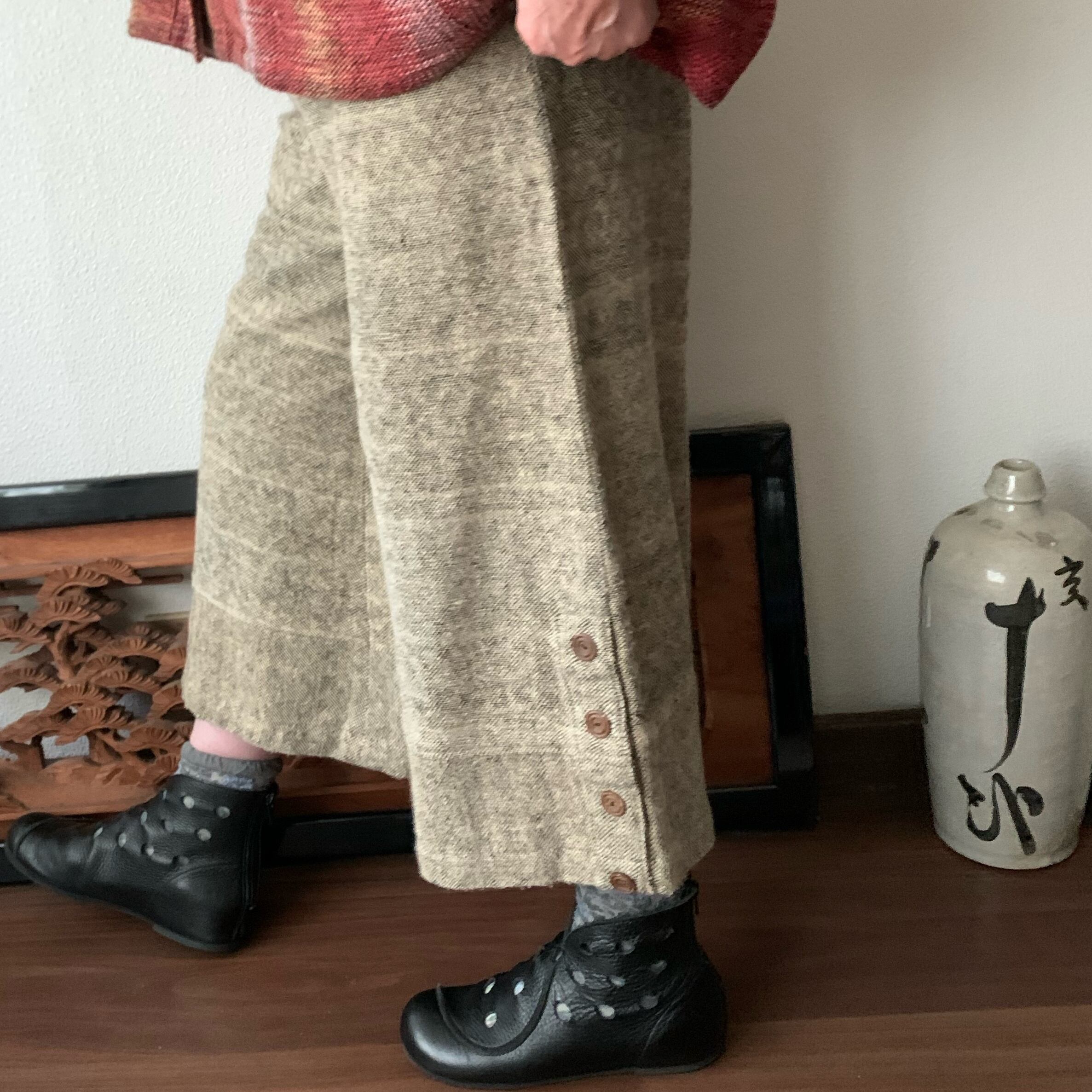 『生地厚め手織り綿裾ワイドのガウチョパンツ すとんと落ちるシンプルラインでどんな体型もすっきり、でも裾横ボタンで遊んでます もちろんロングセラー』