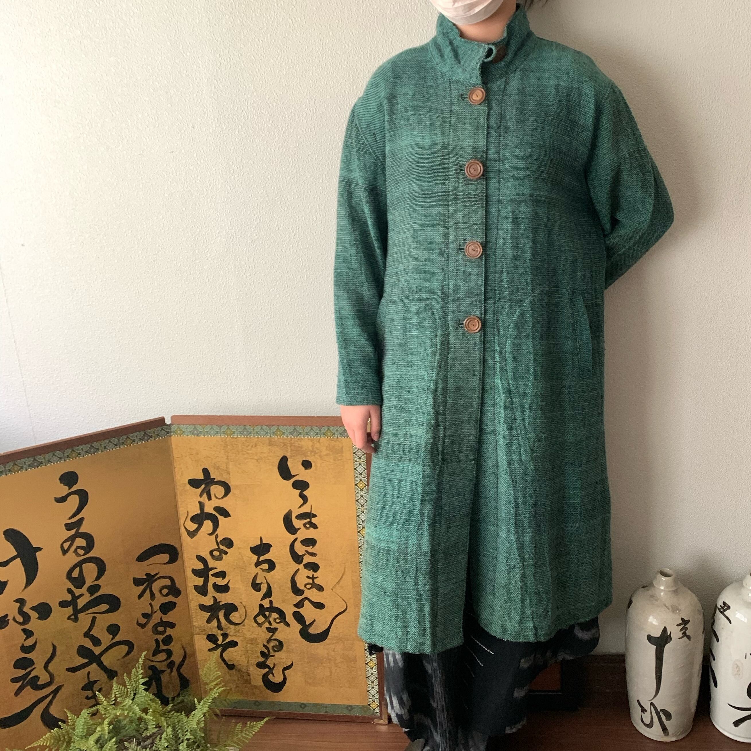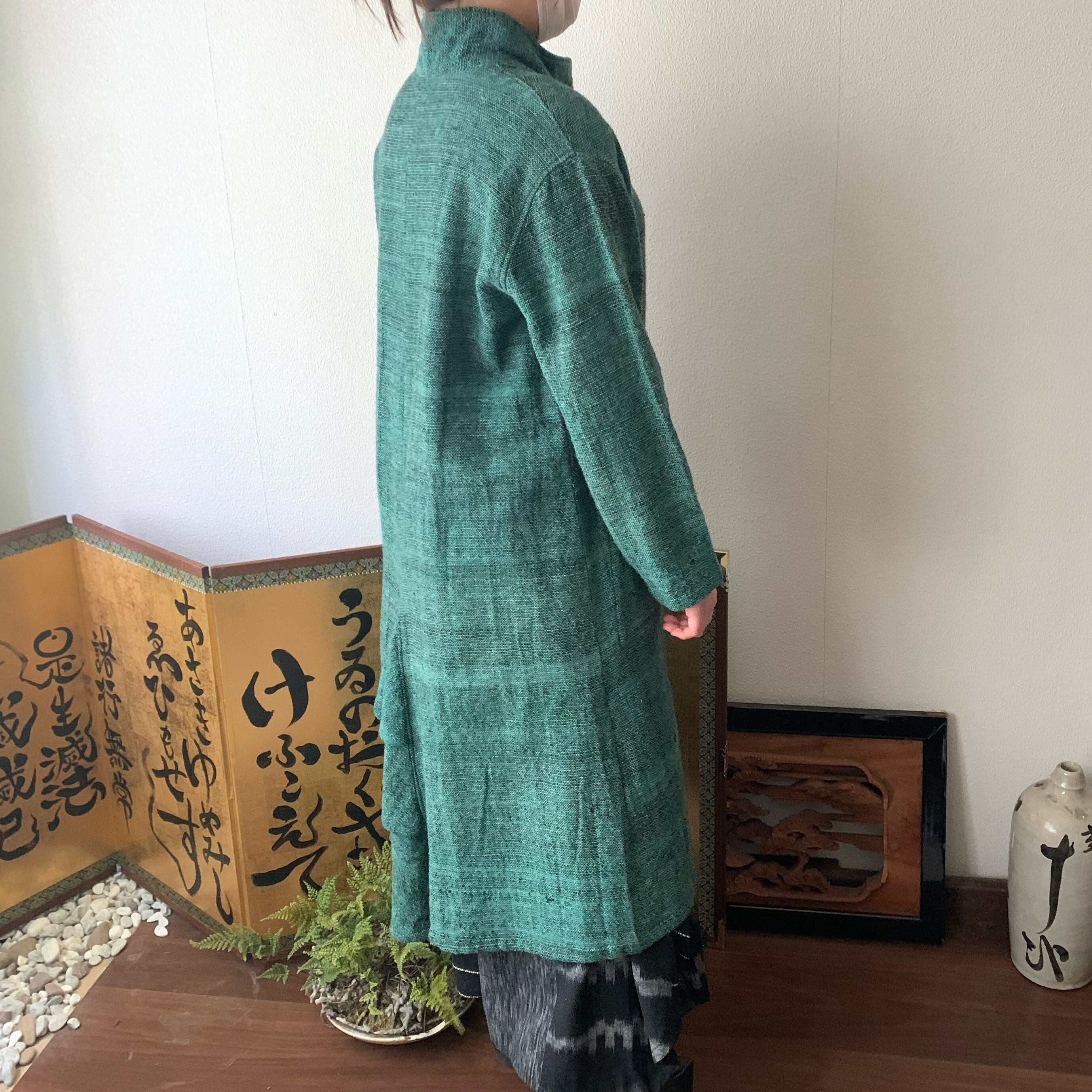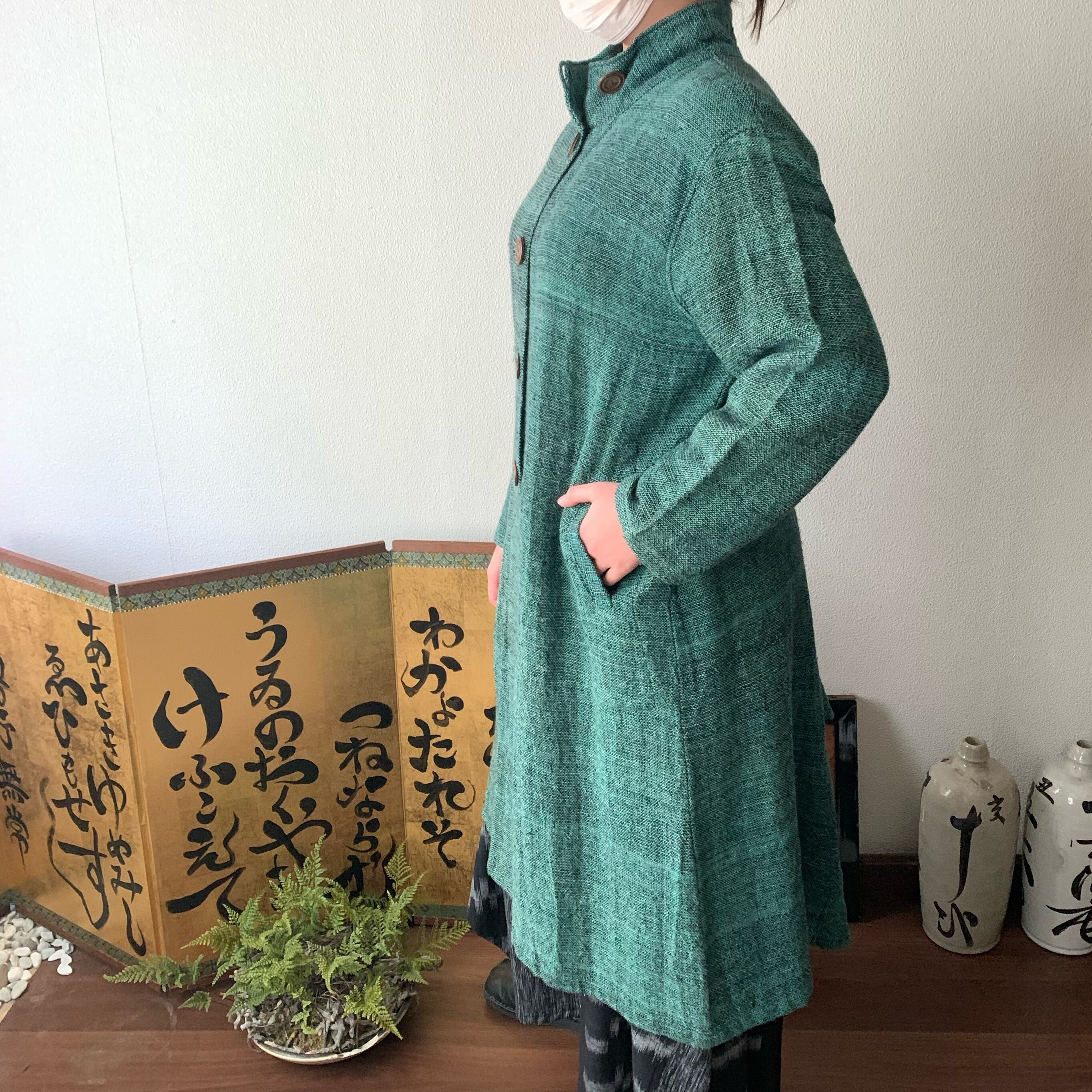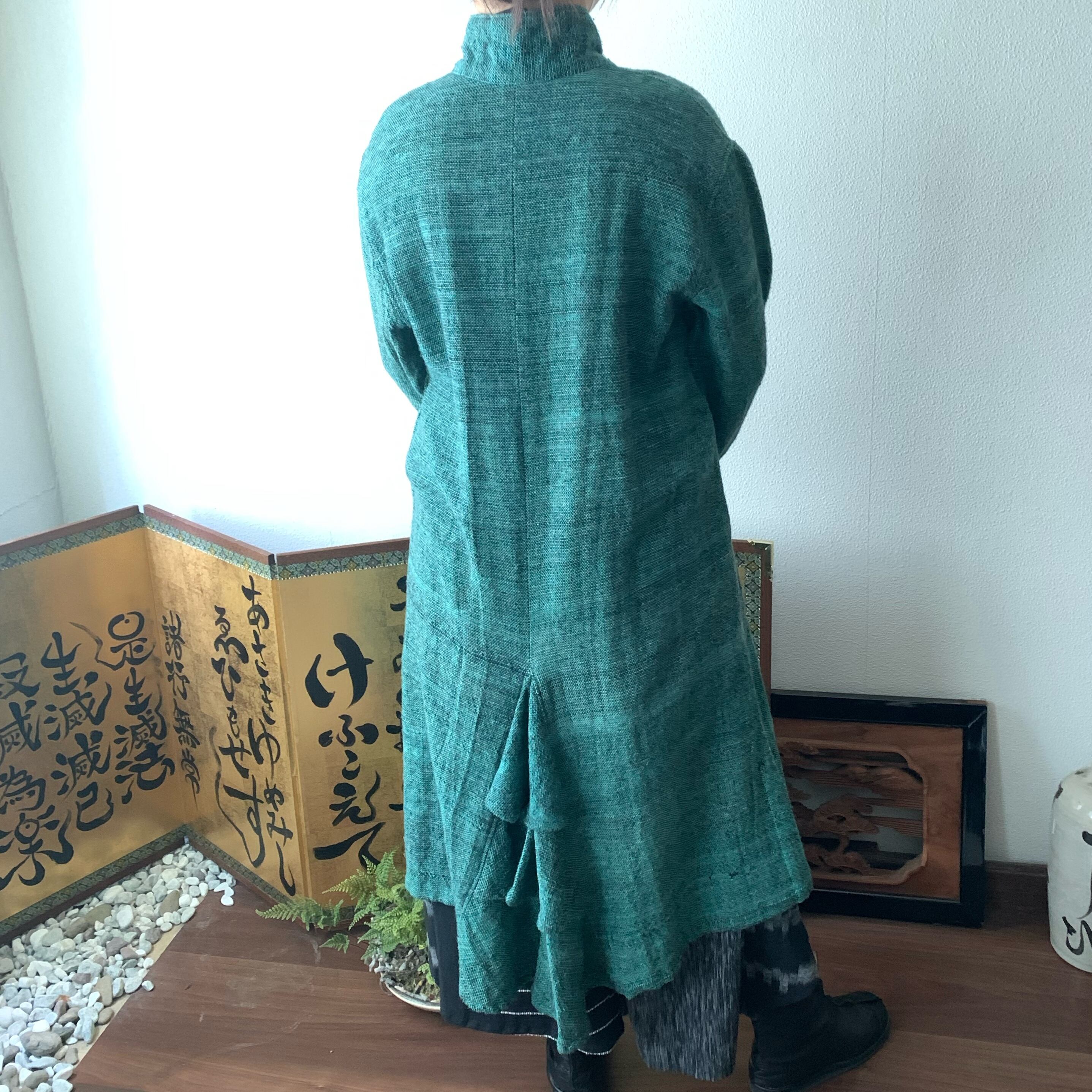 恐竜のしっぽ? 後ろ裾にアクセントのハイカラー手織綿コート 前から見るとシンプルライン 緑絣