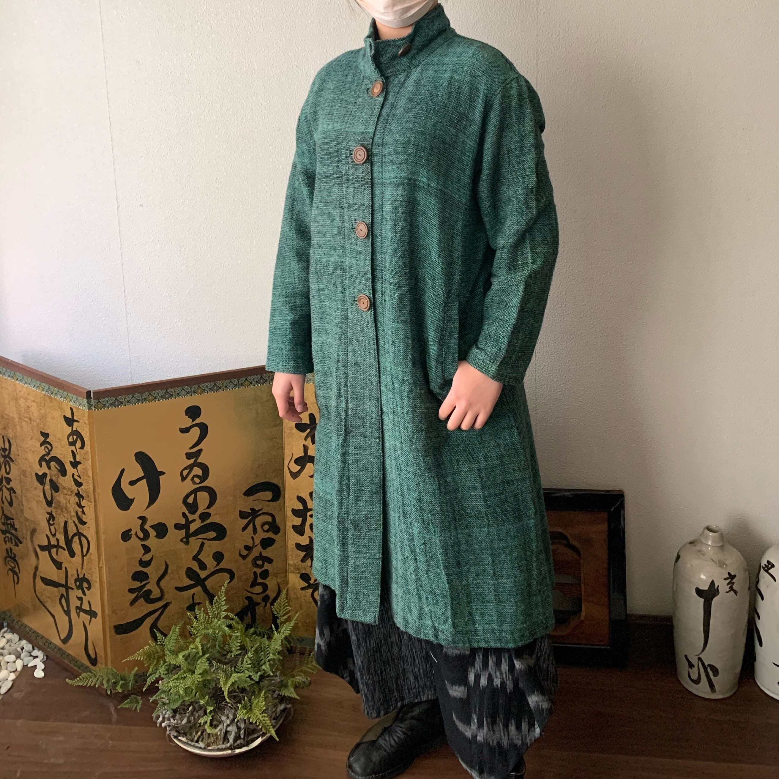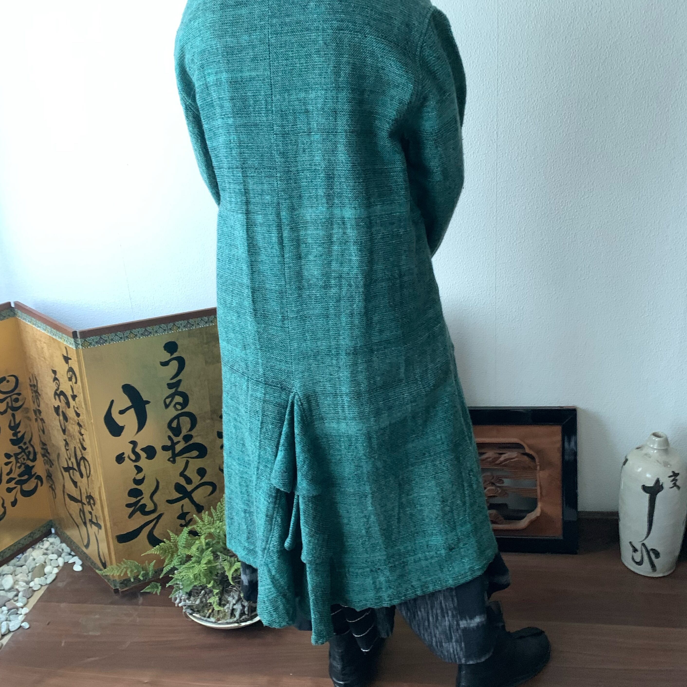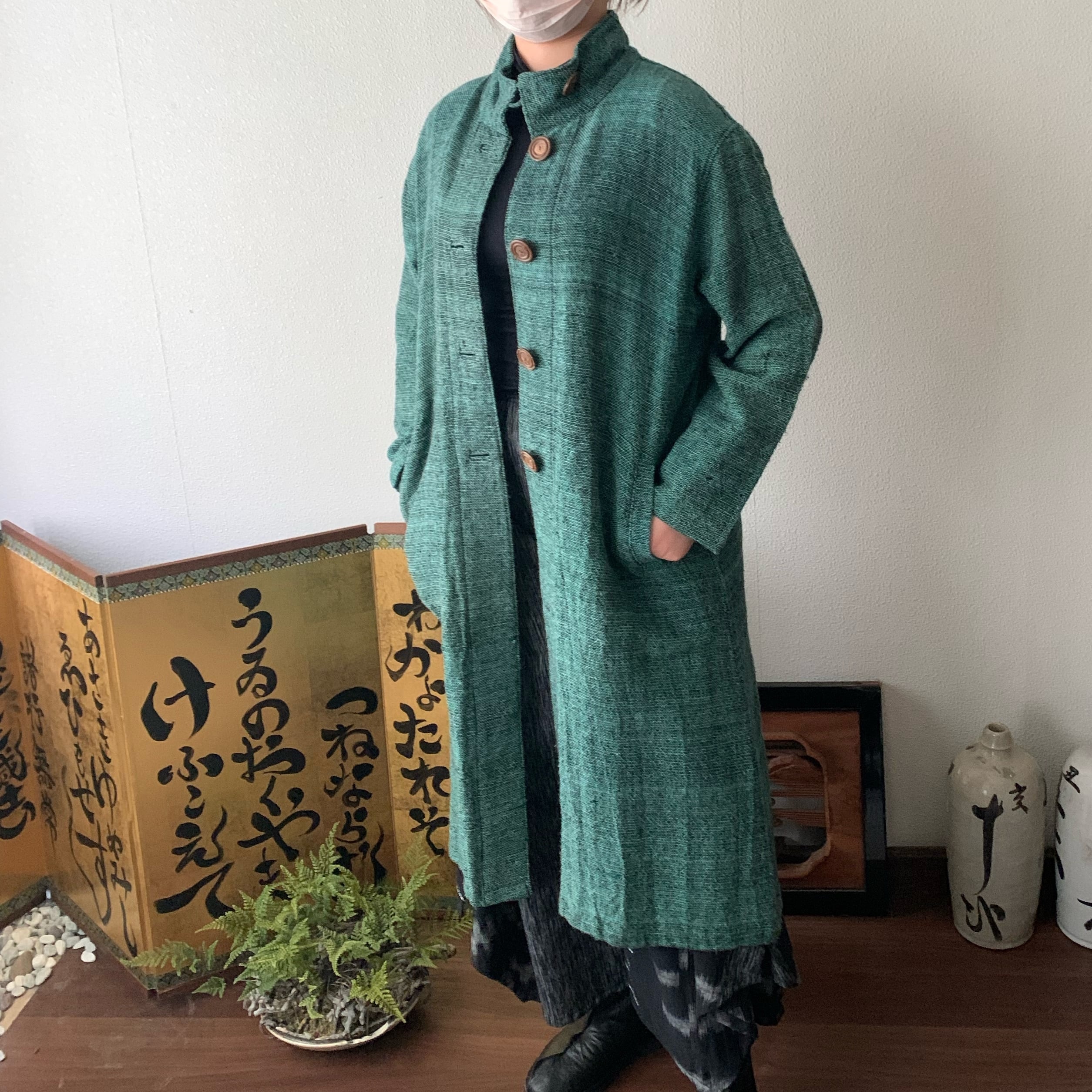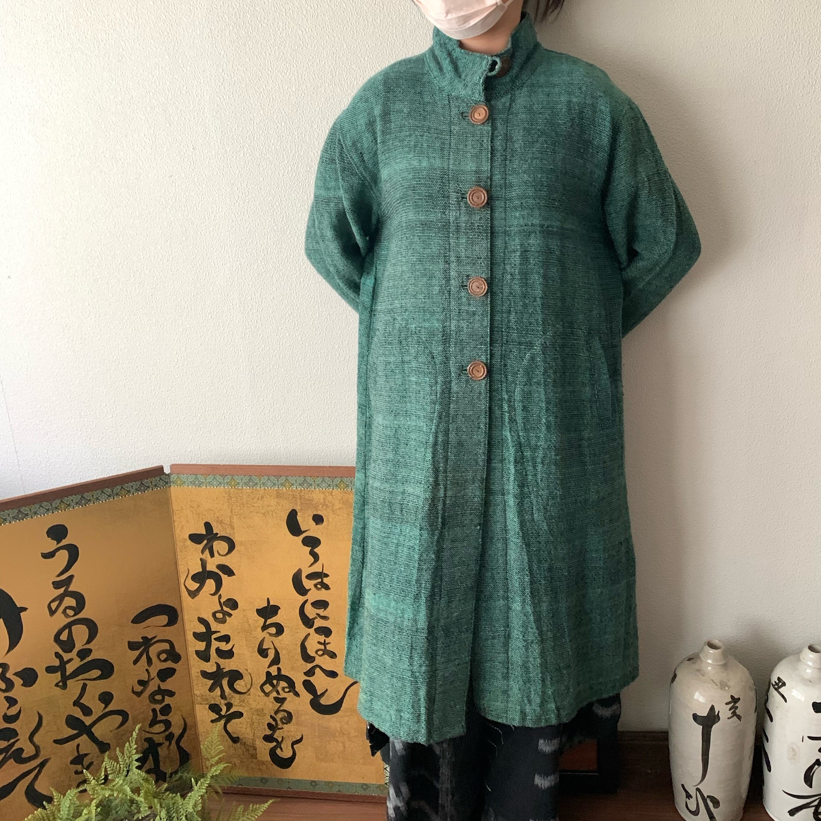恐竜のしっぽ? 後ろ裾にアクセントのハイカラー手織綿コート 前から見るとシンプルライン 緑絣