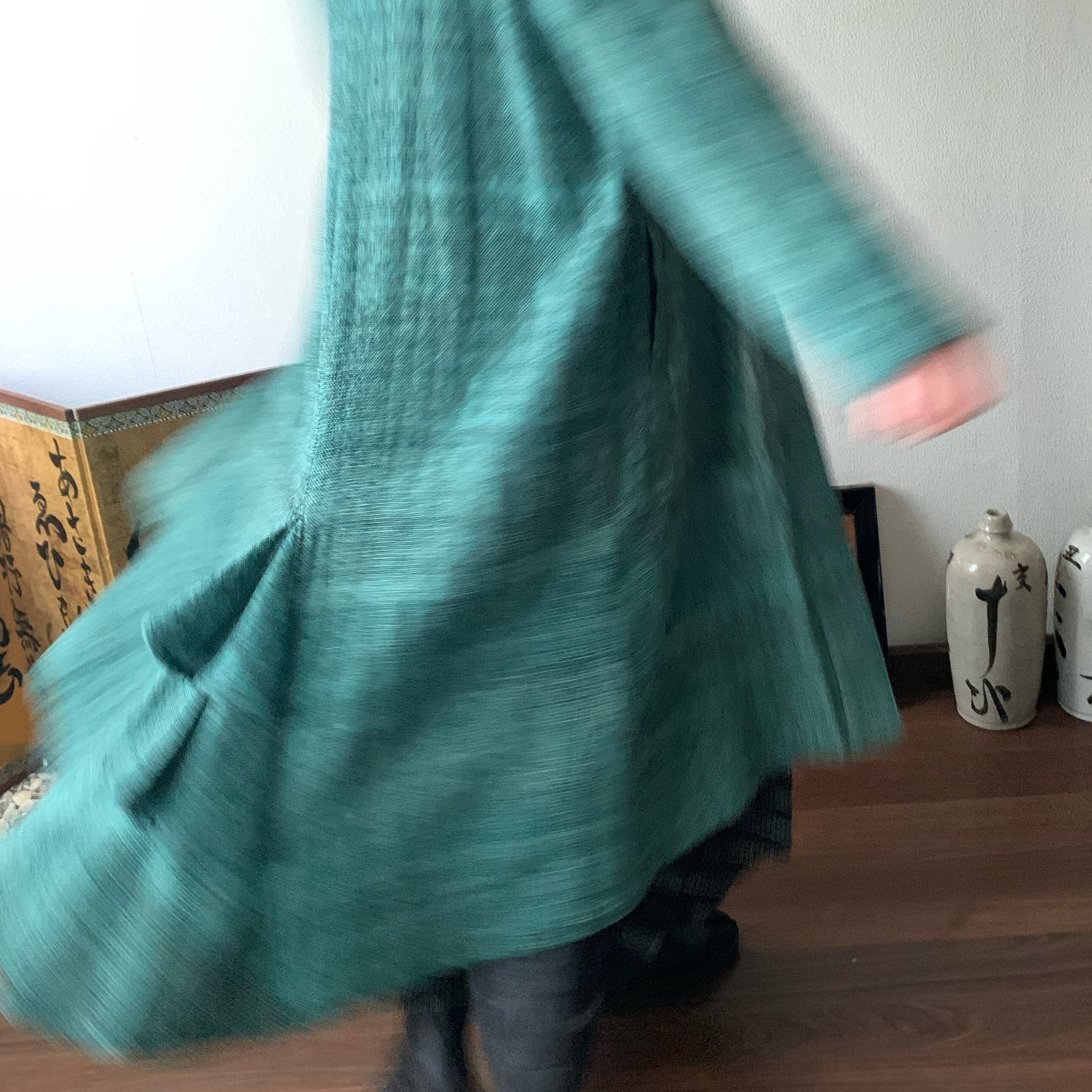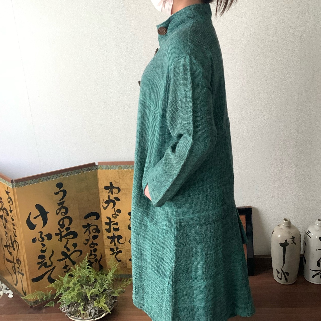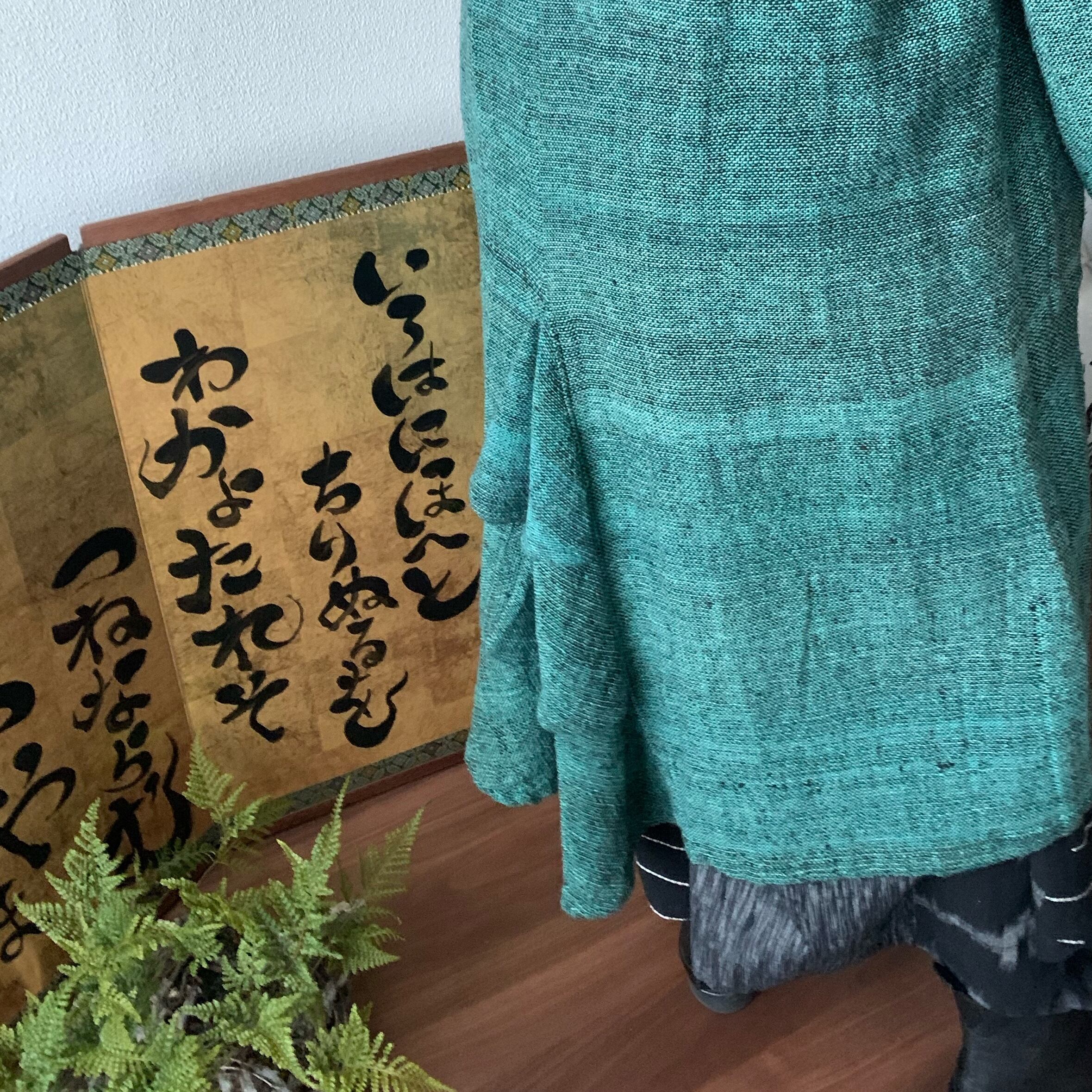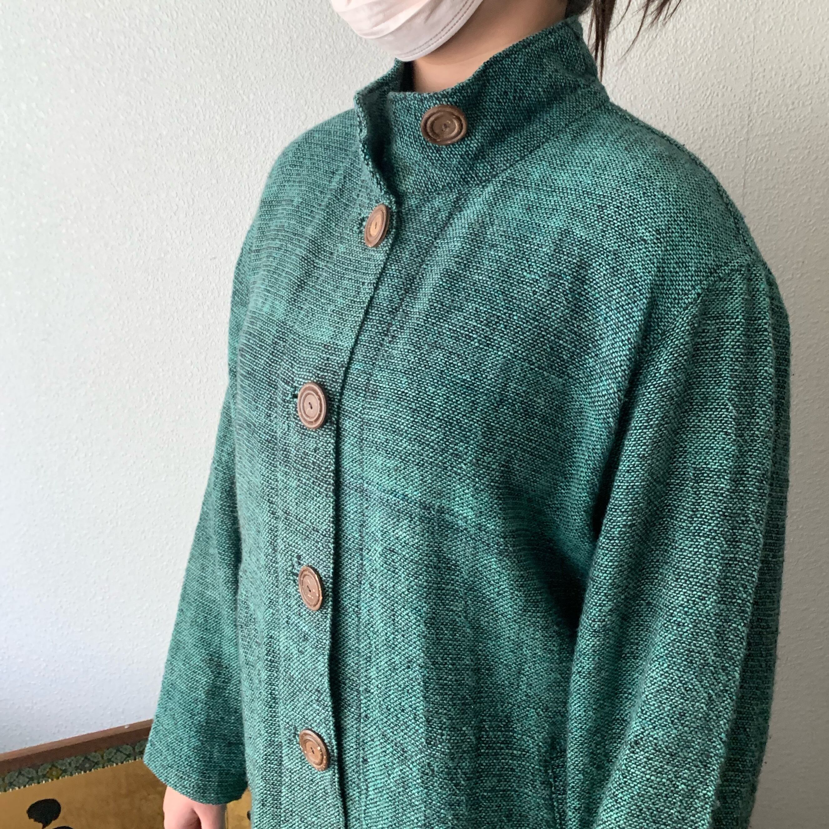 恐竜のしっぽ? 後ろ裾にアクセントのハイカラー手織綿コート 前から見るとシンプルライン 緑絣