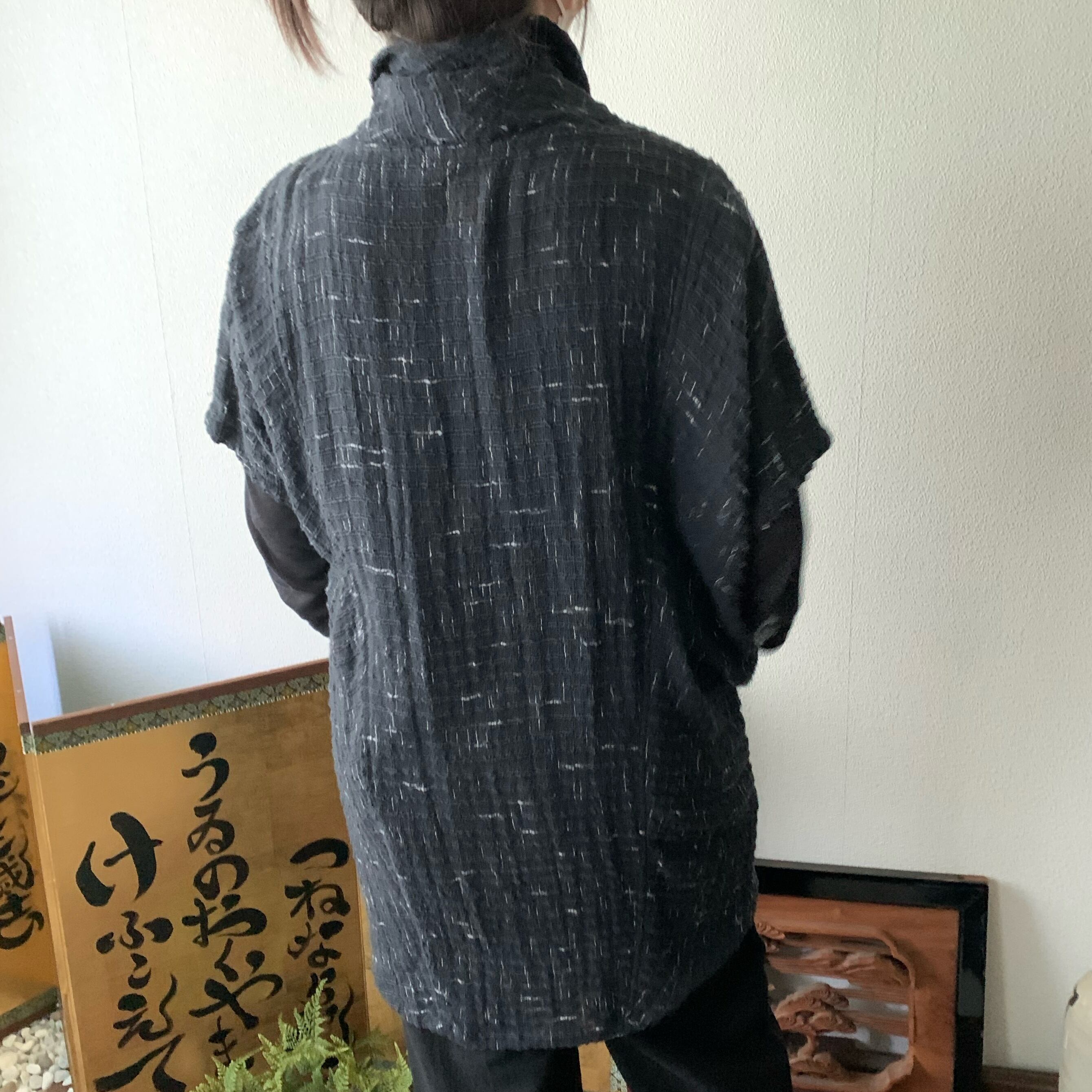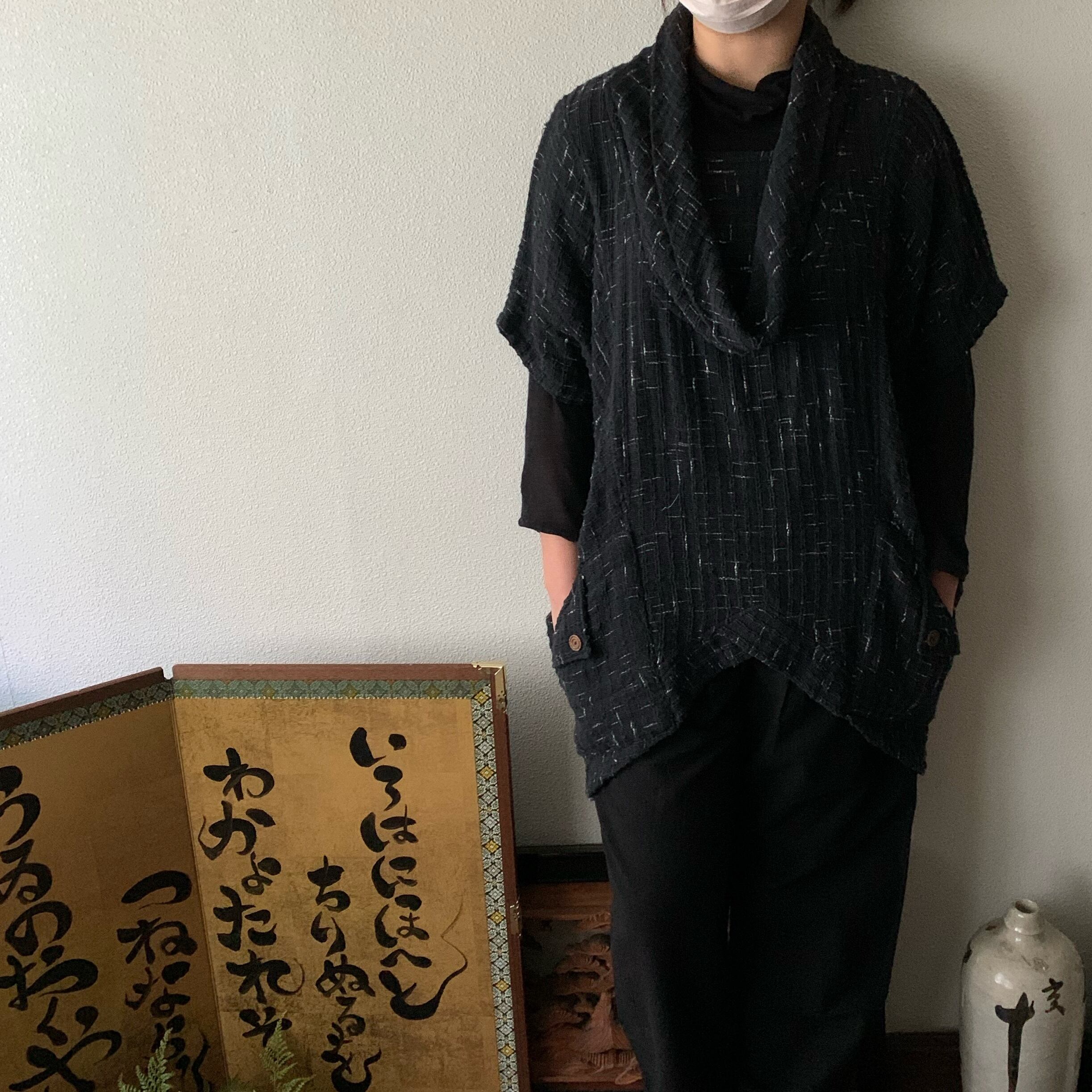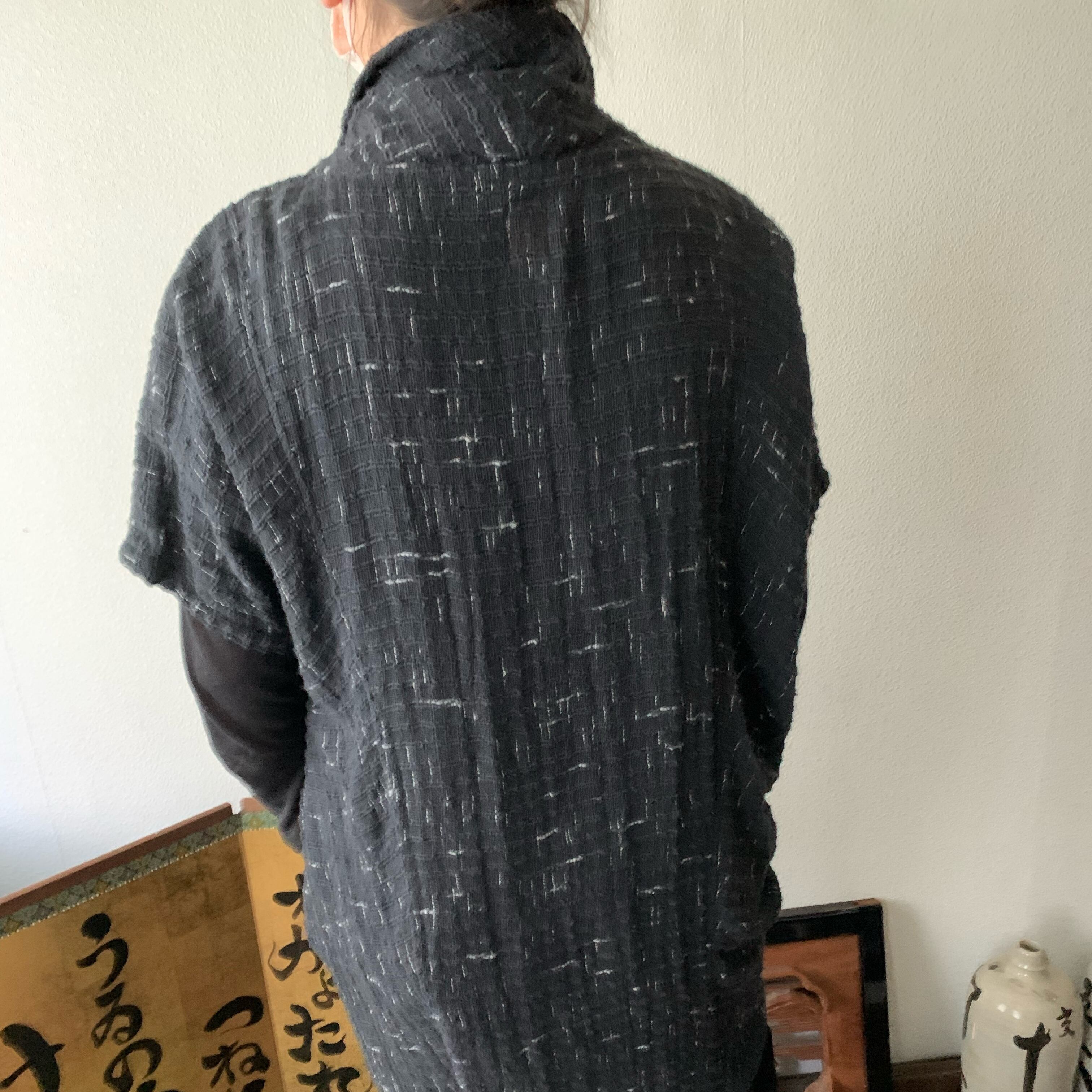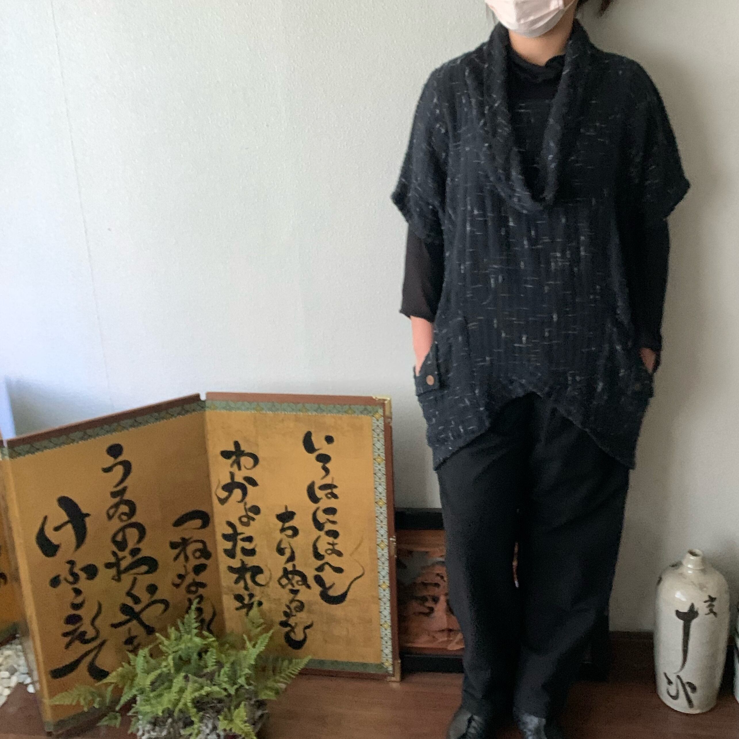 贅沢に織り向きを切替えたコクーンシルエットの手織綿チュニックブラウス 細身な方からふくよかな方まで 黒絣